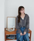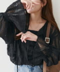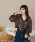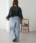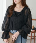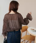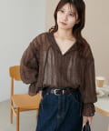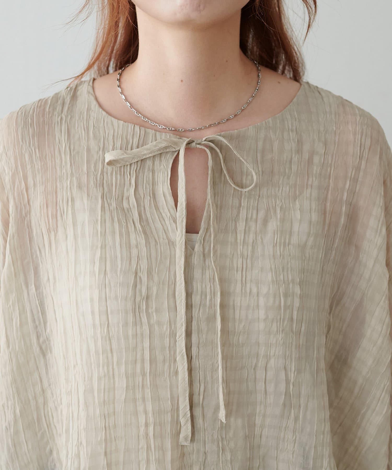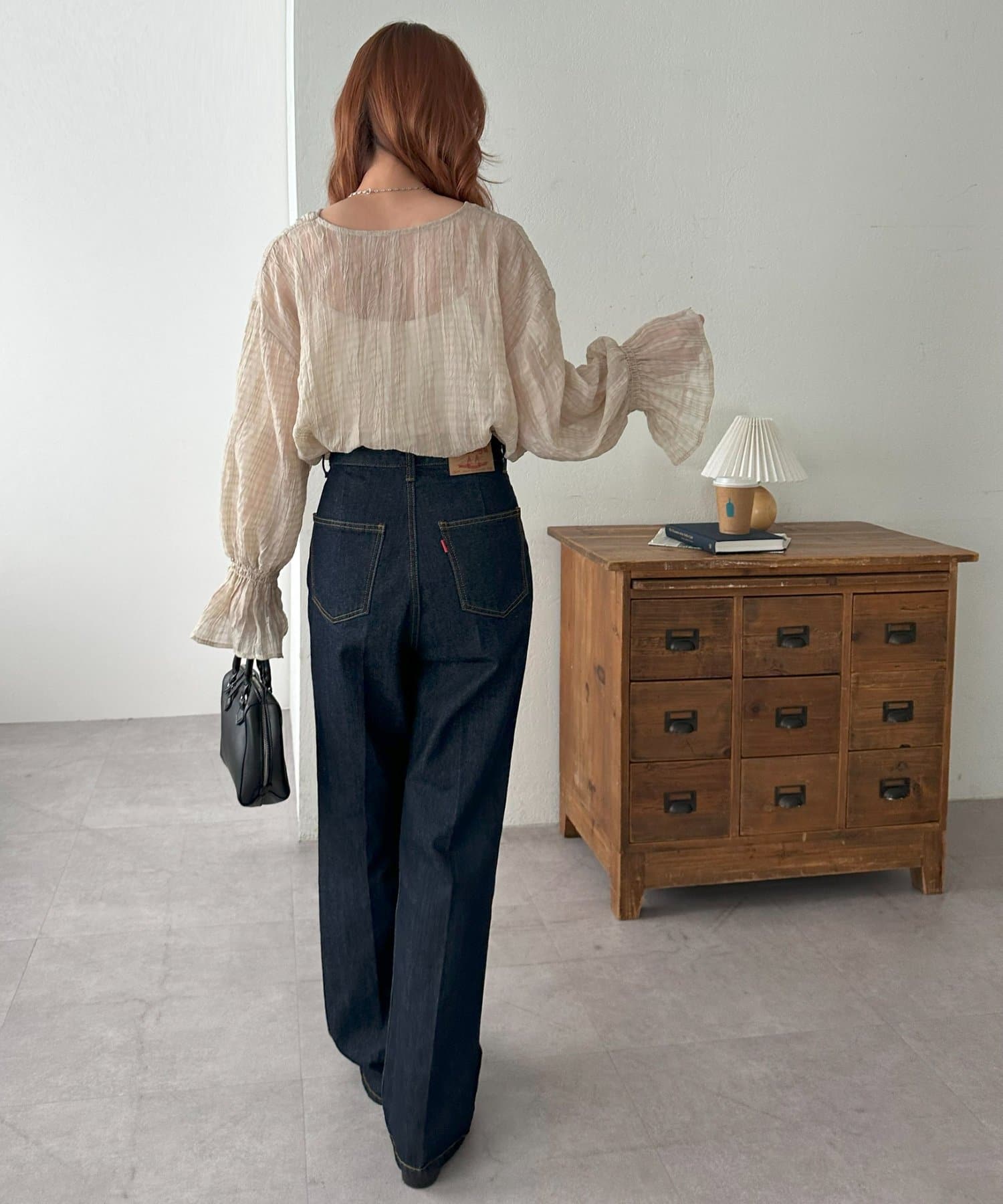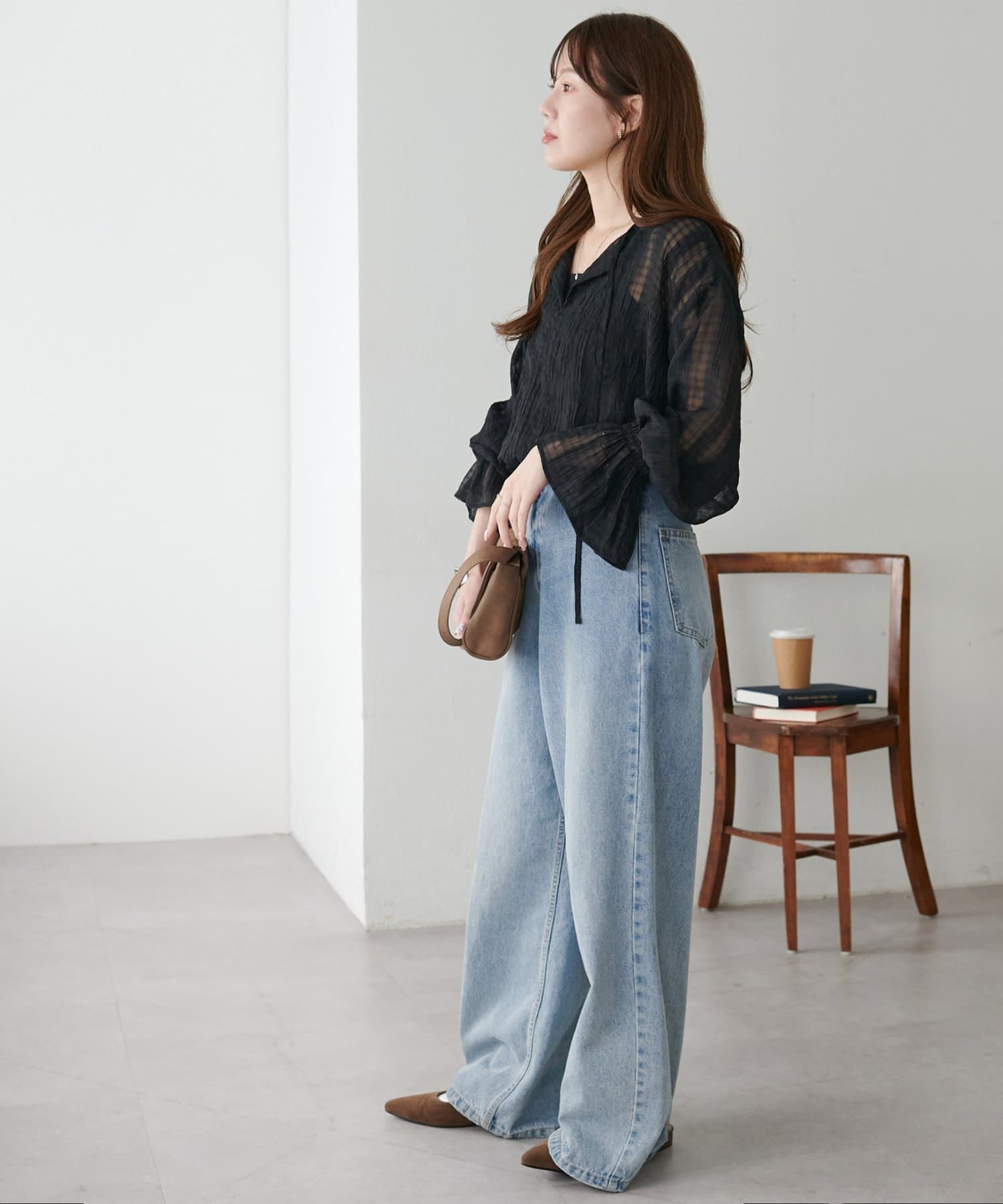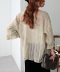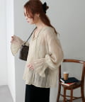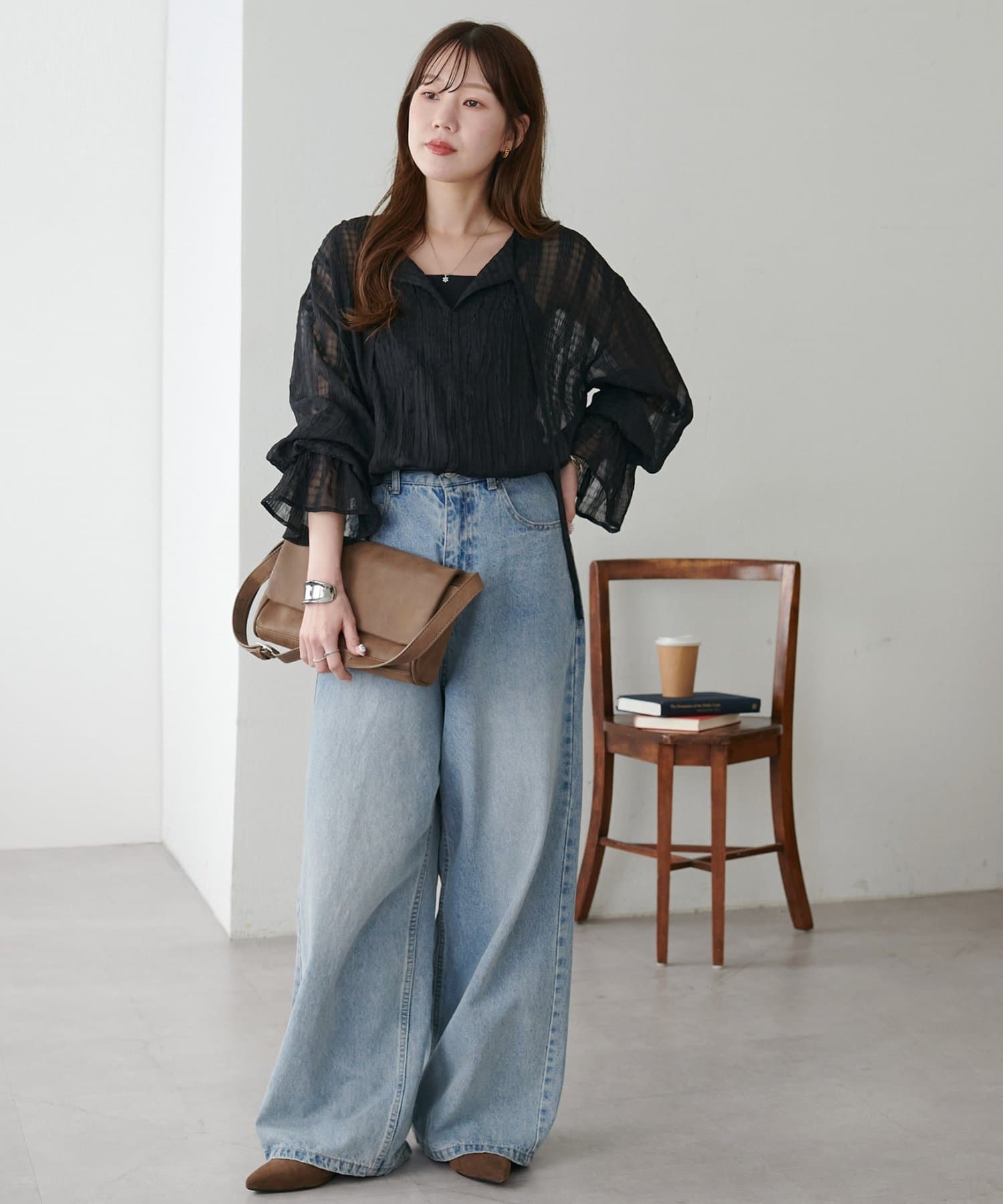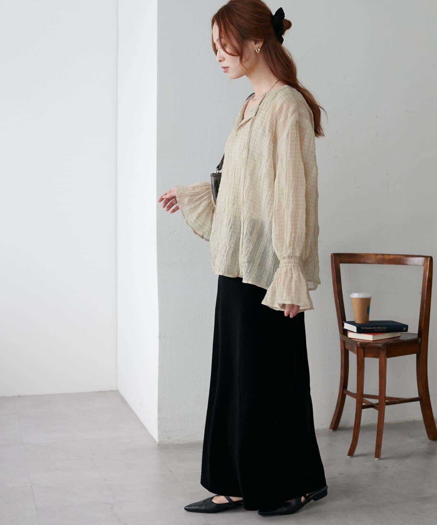 160cmスタッフ:袖口のシャーリングで袖をたくし上げやすく、こなれ感のある抜け感も簡単に演出できます。透け感が上品で、大人カジュアルにちょうどいい一枚です!