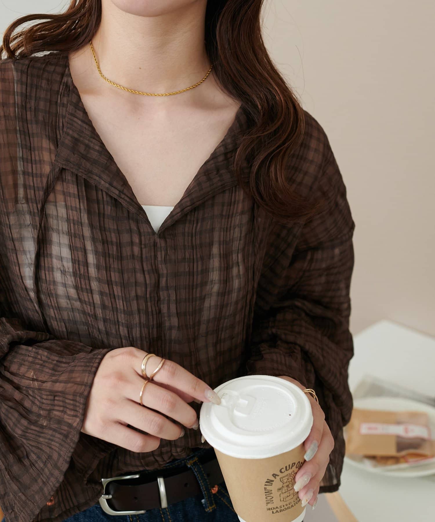 程よい透け感が女性らしさを引き立てる、チェック柄のスキッパーブラウス。