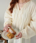 胸元からウエストにかけて細やかなギャザーを寄せることで、立体感のあるシルエットに。