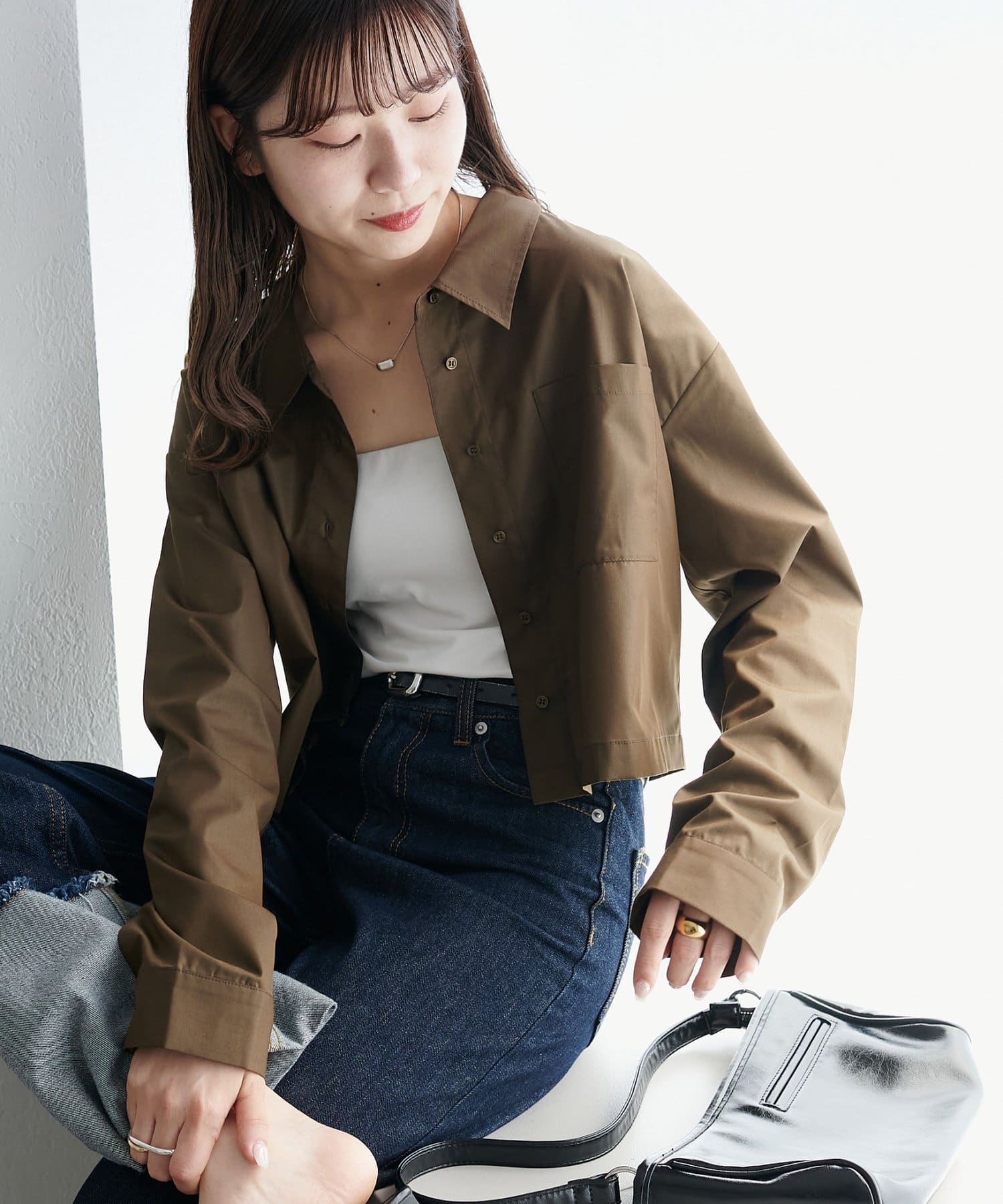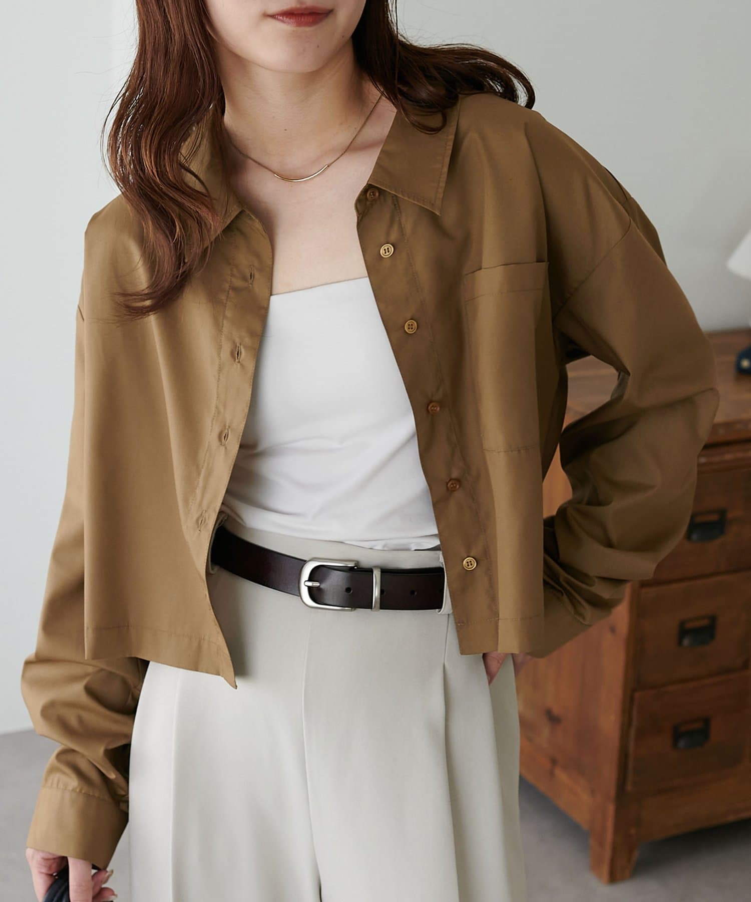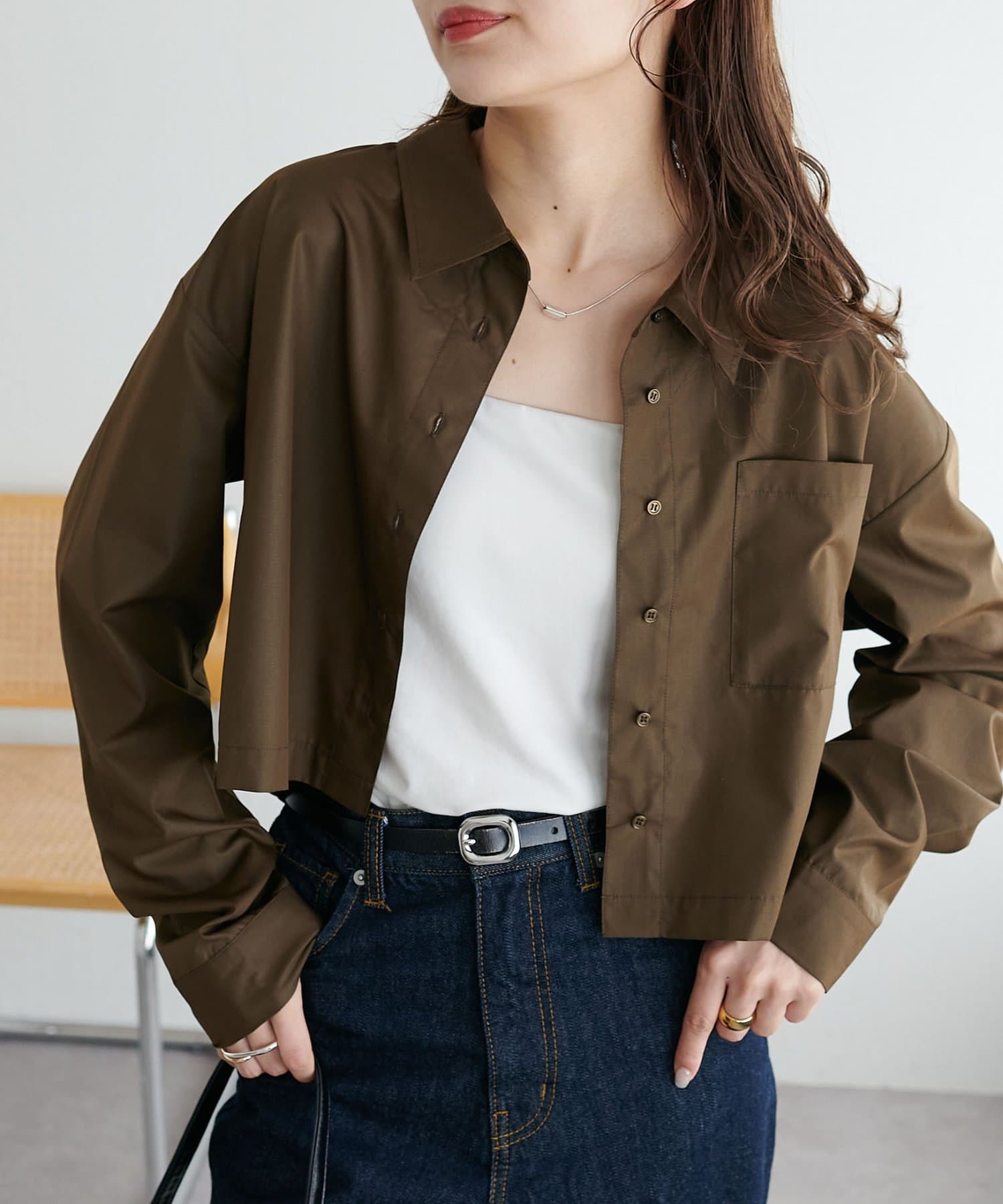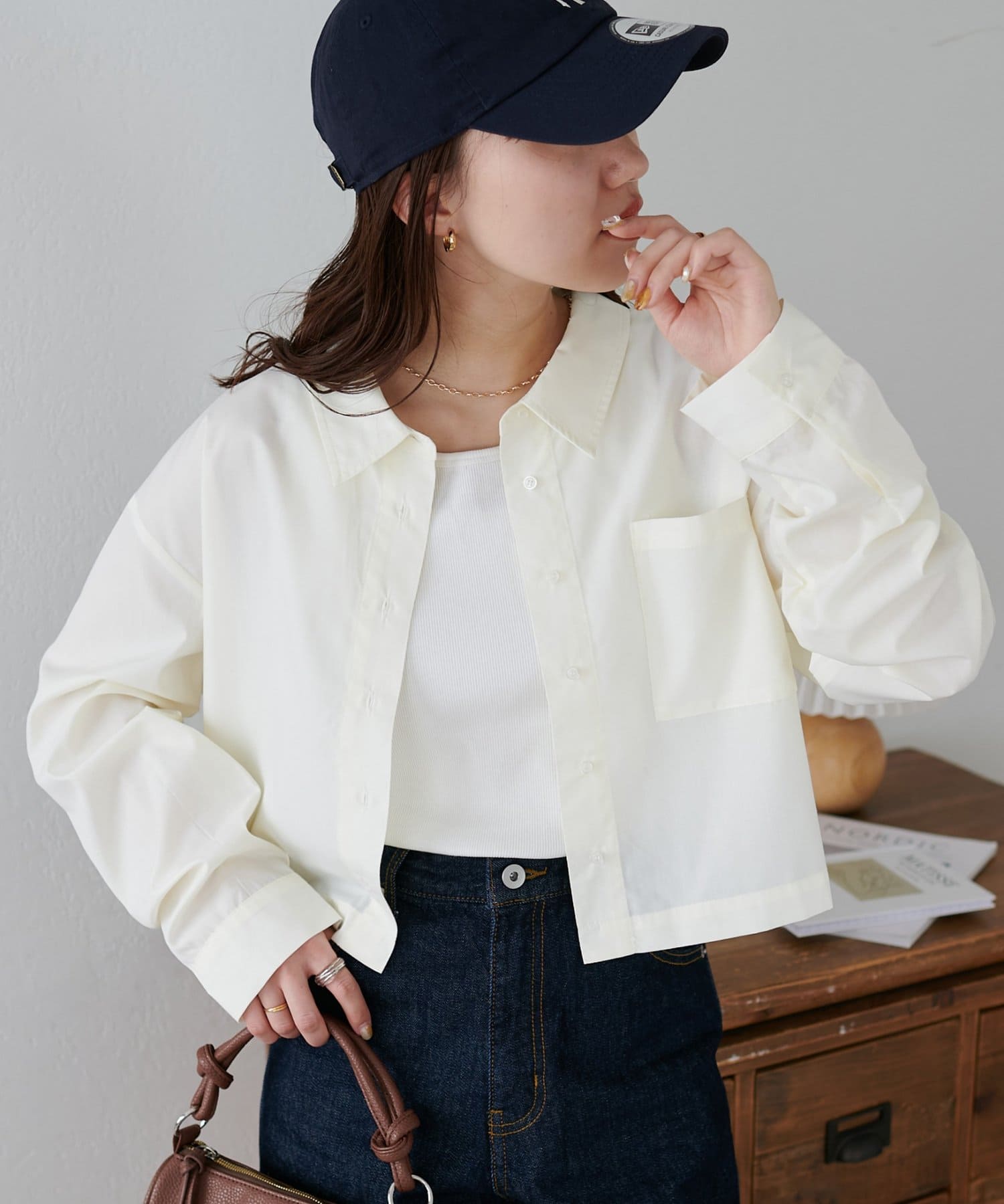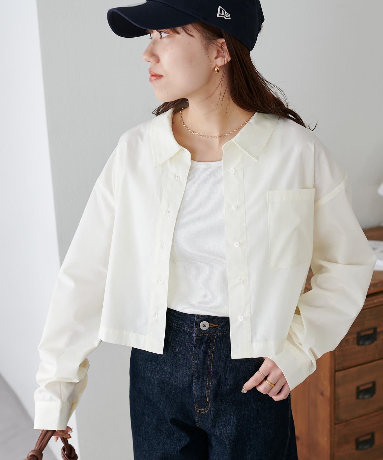 ・通年で着られるクロップド丈シャツ、程よくハリ感のある素材使用