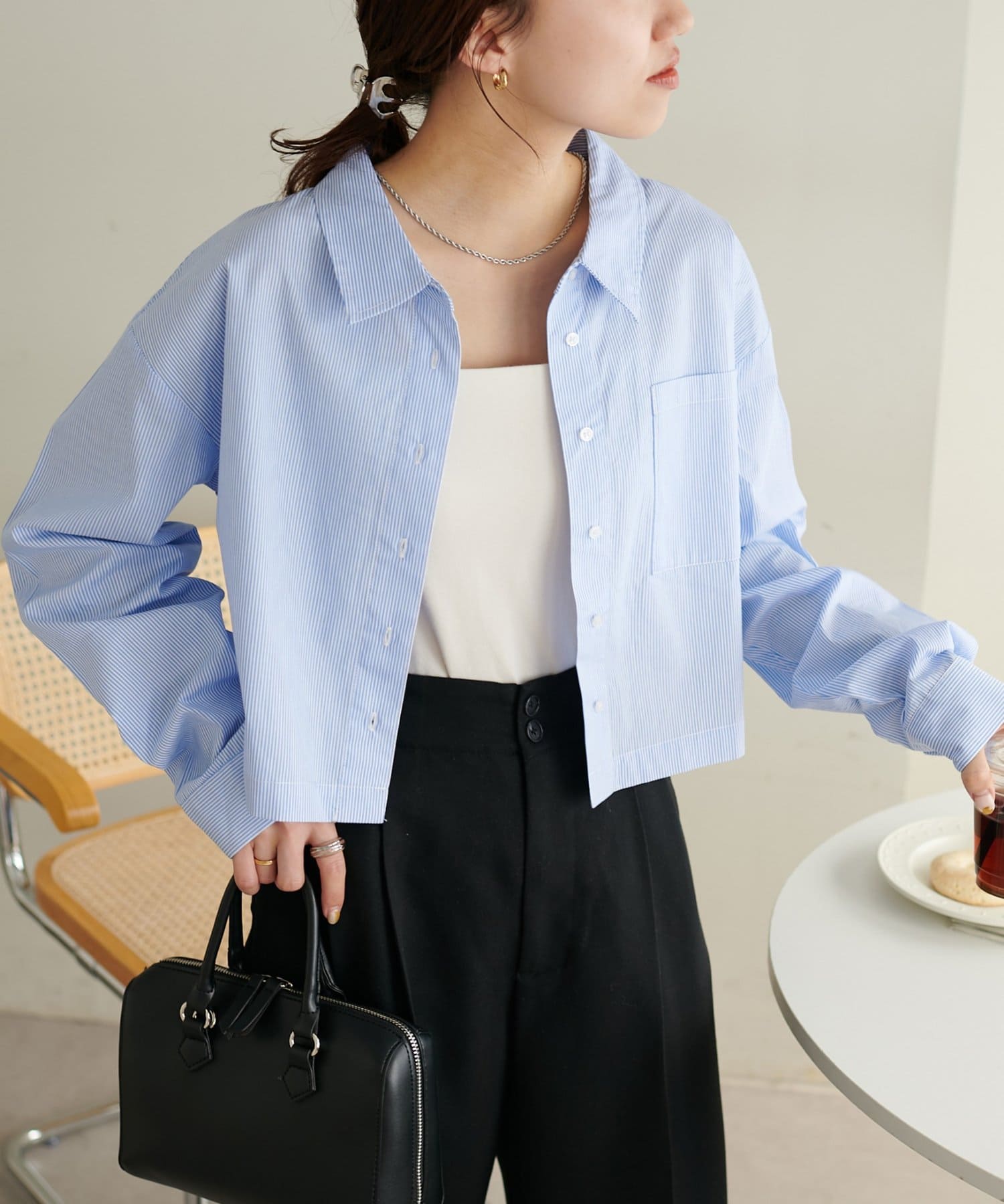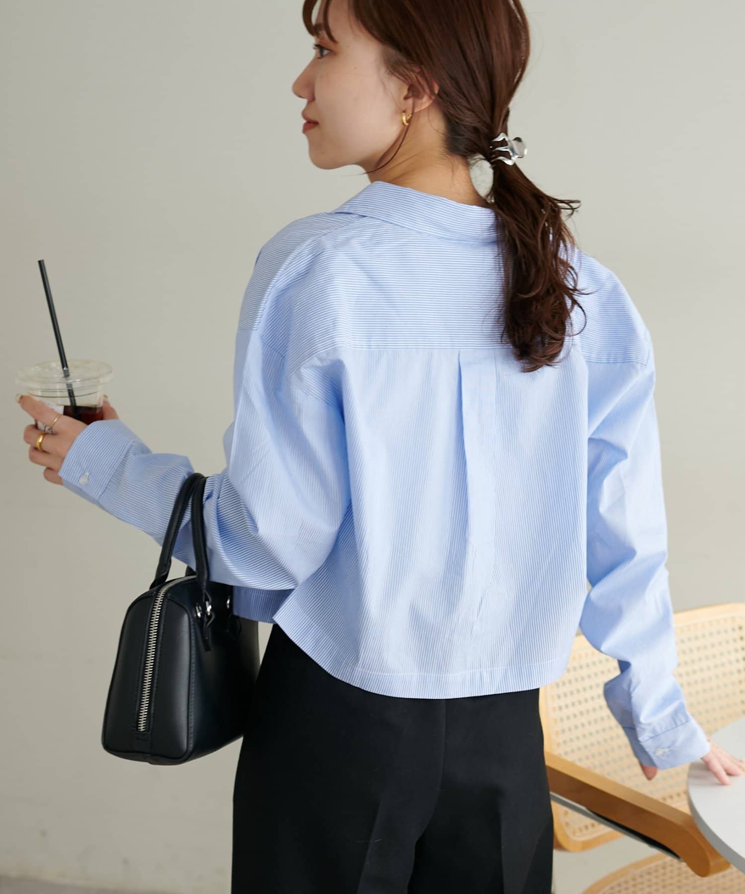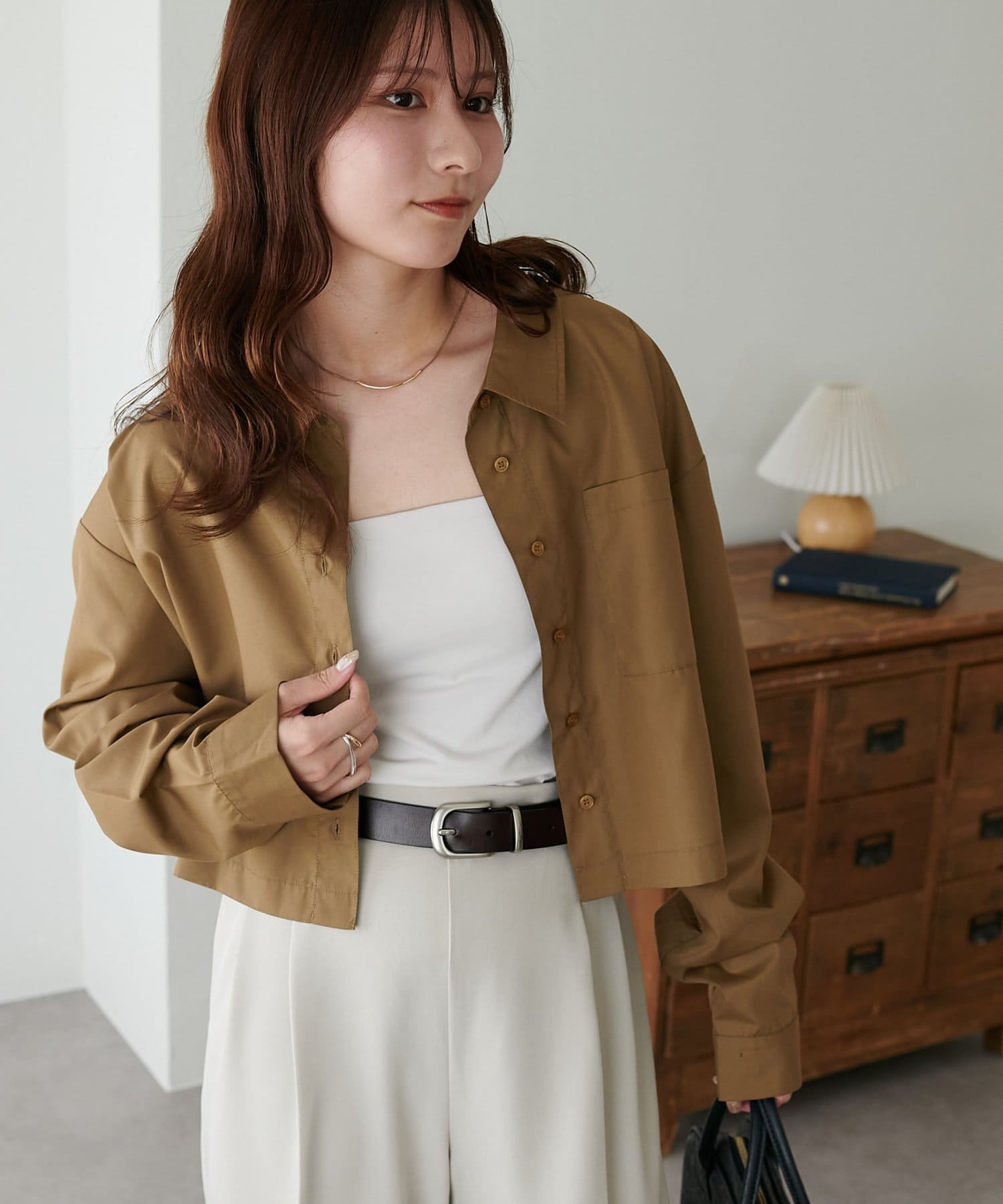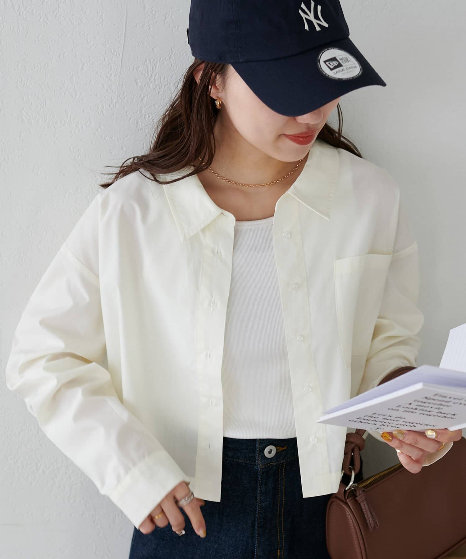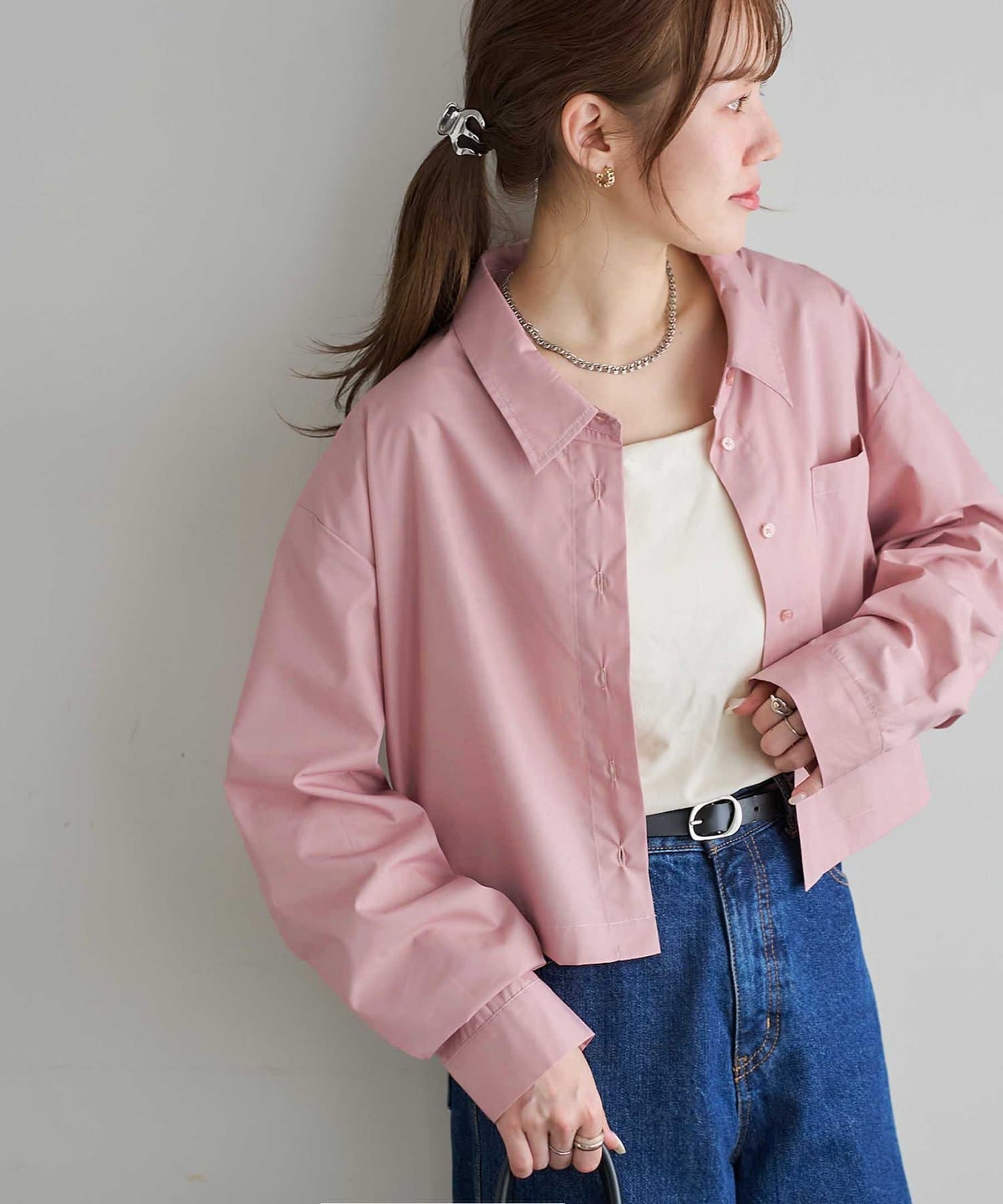 ・通年で着られるクロップド丈シャツ、程よくハリ感のある素材使用