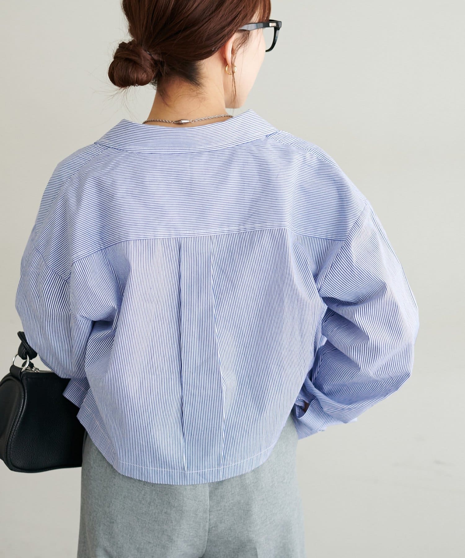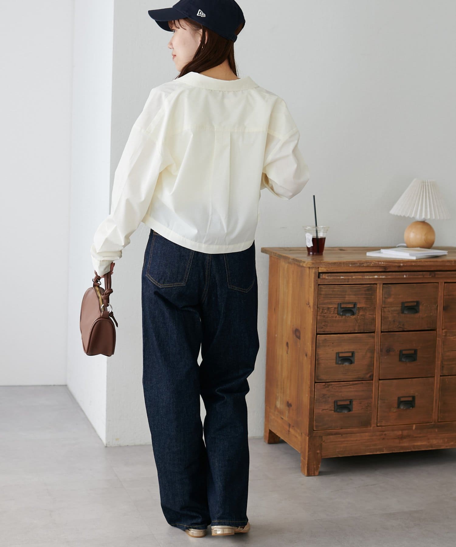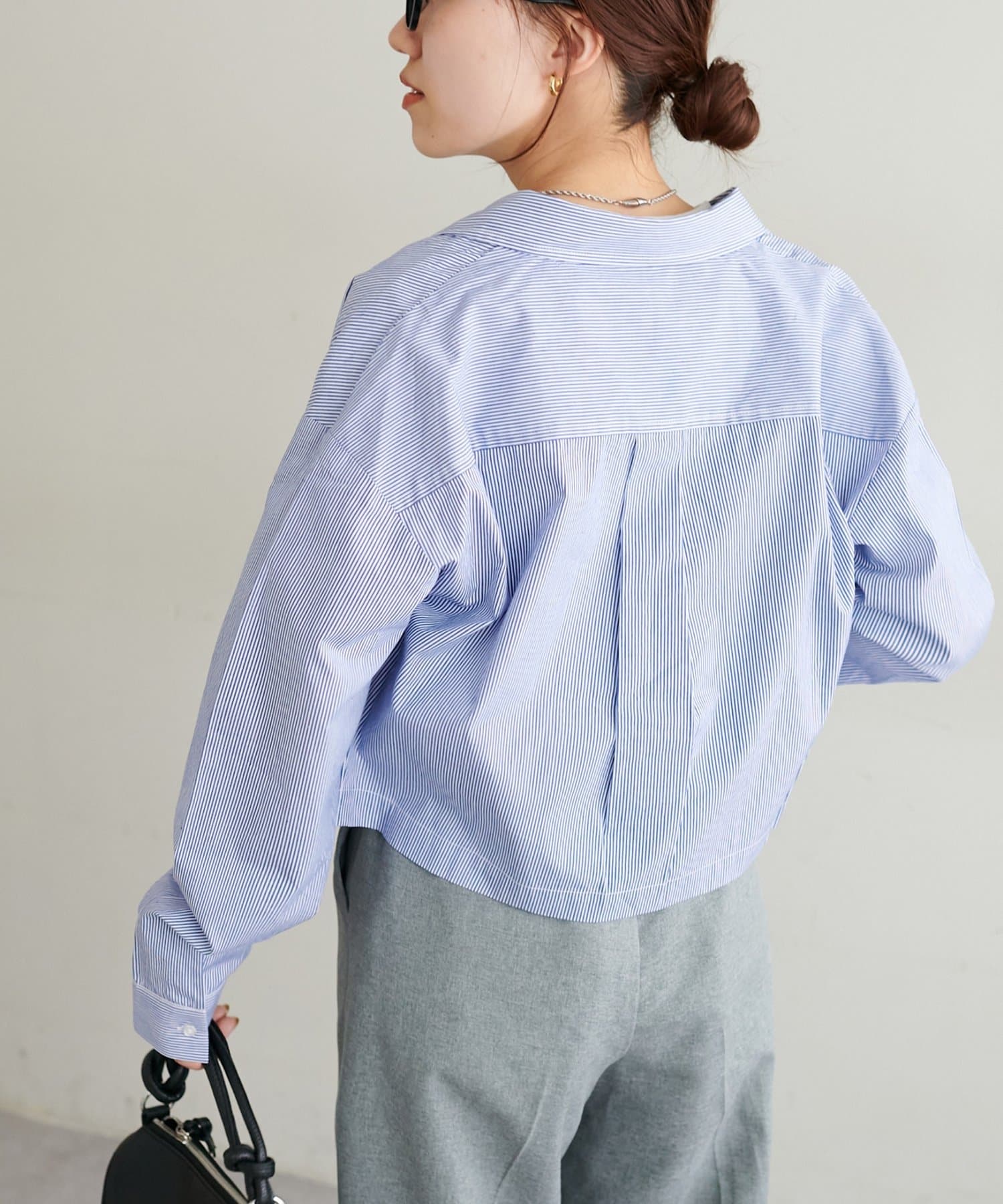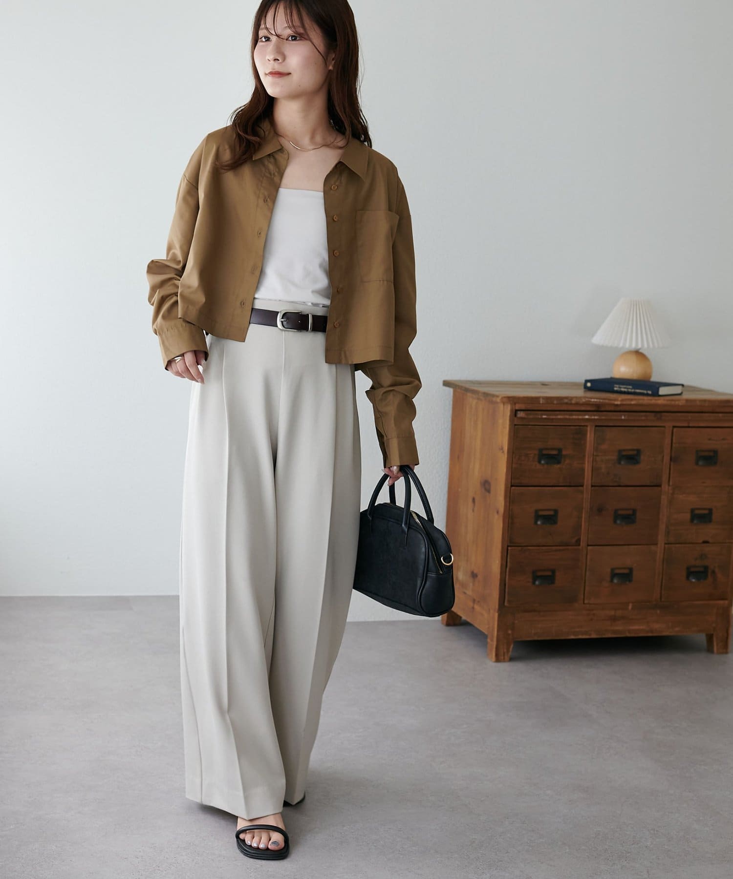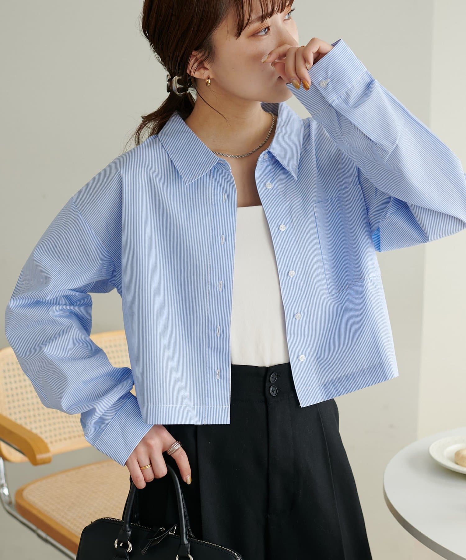 ・通年で着られるクロップド丈シャツ、程よくハリ感のある素材使用