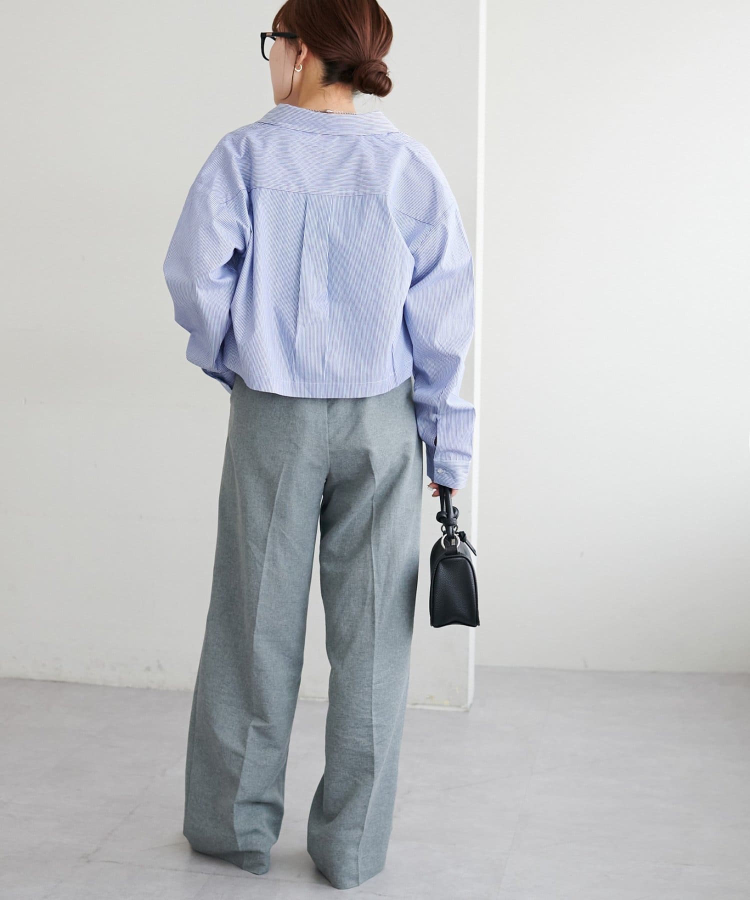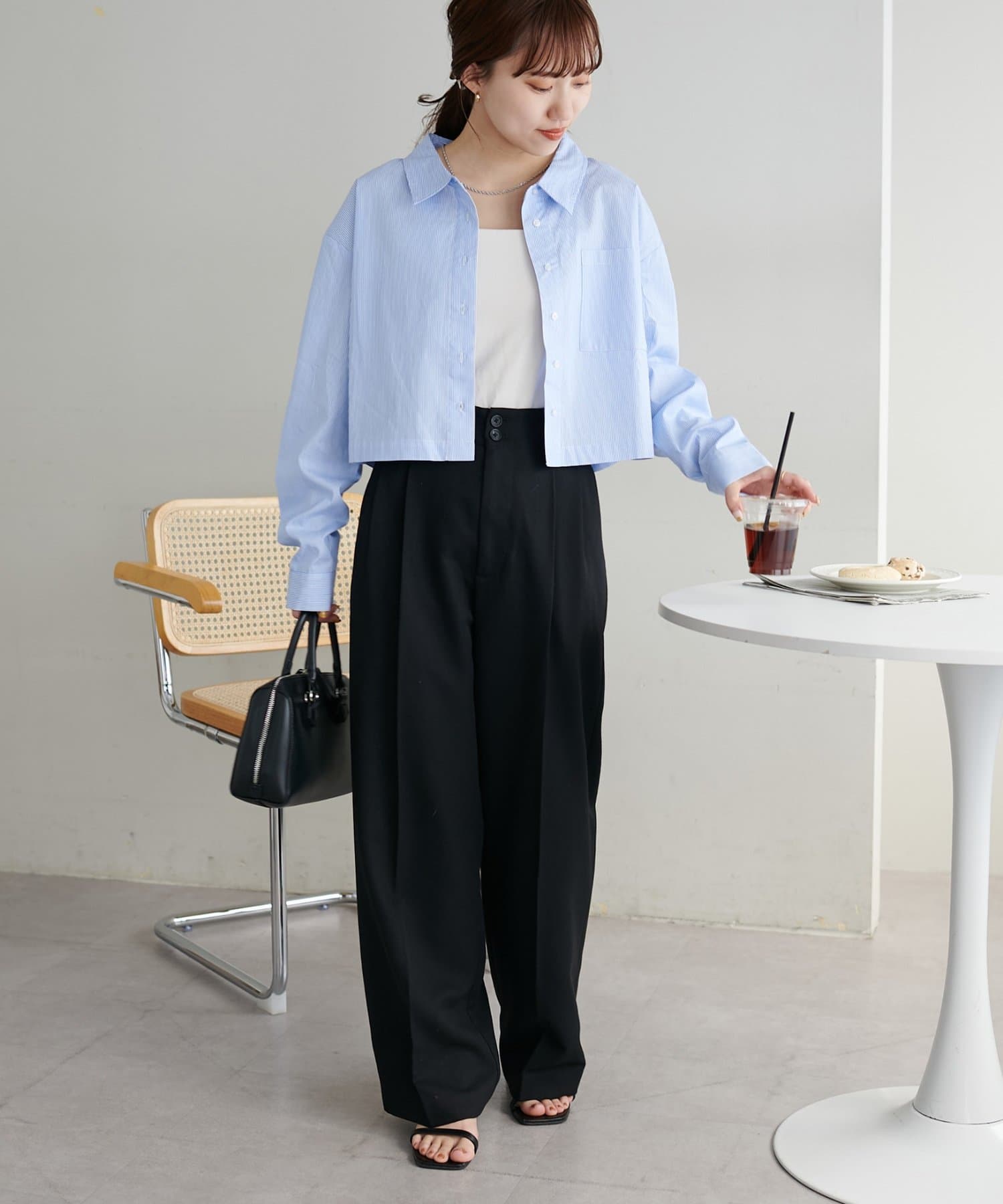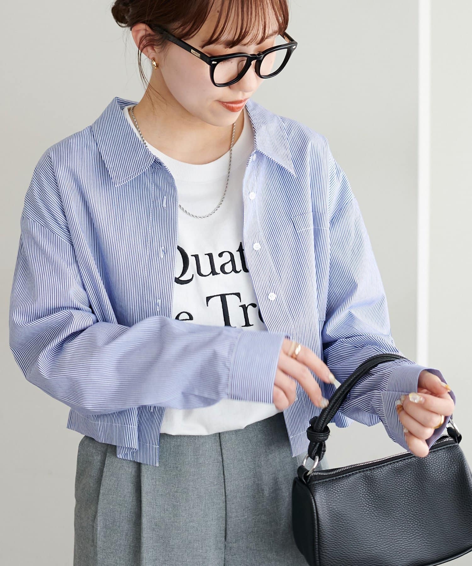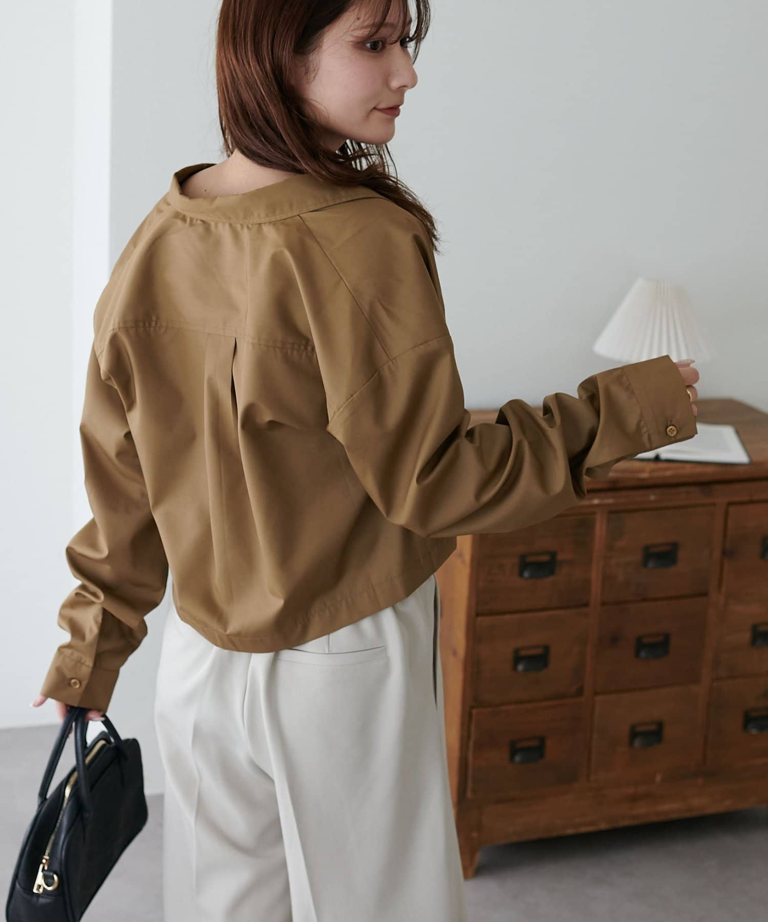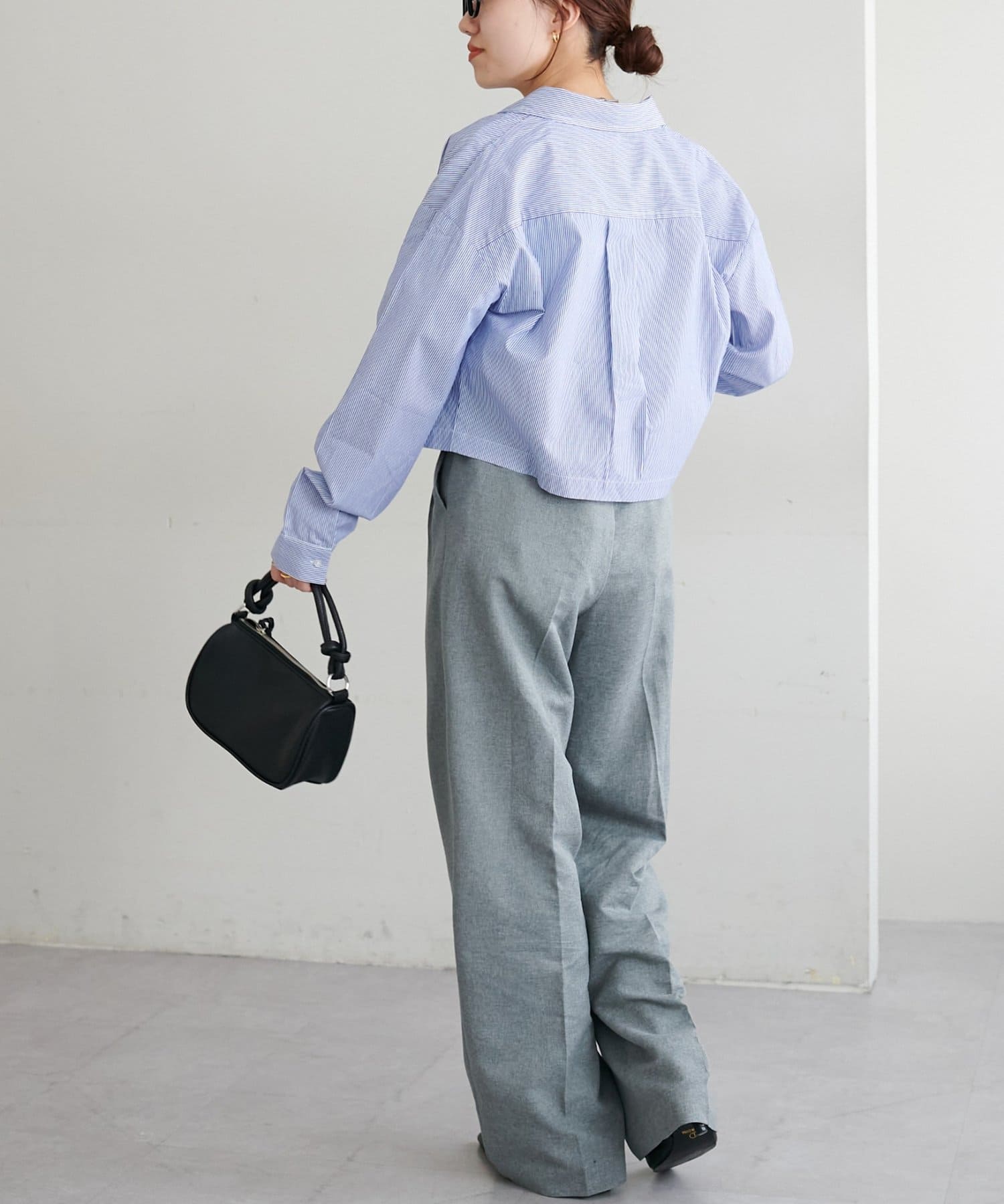 ・通年で着られるクロップド丈シャツ、程よくハリ感のある素材使用
