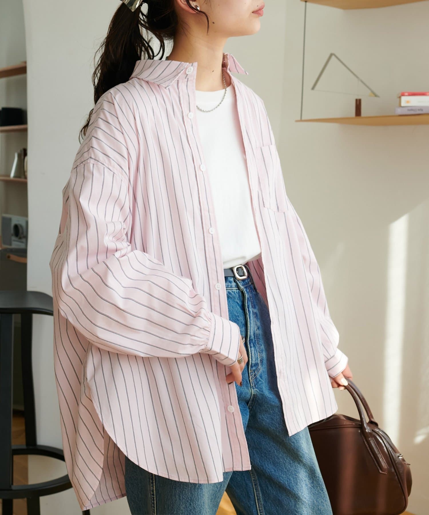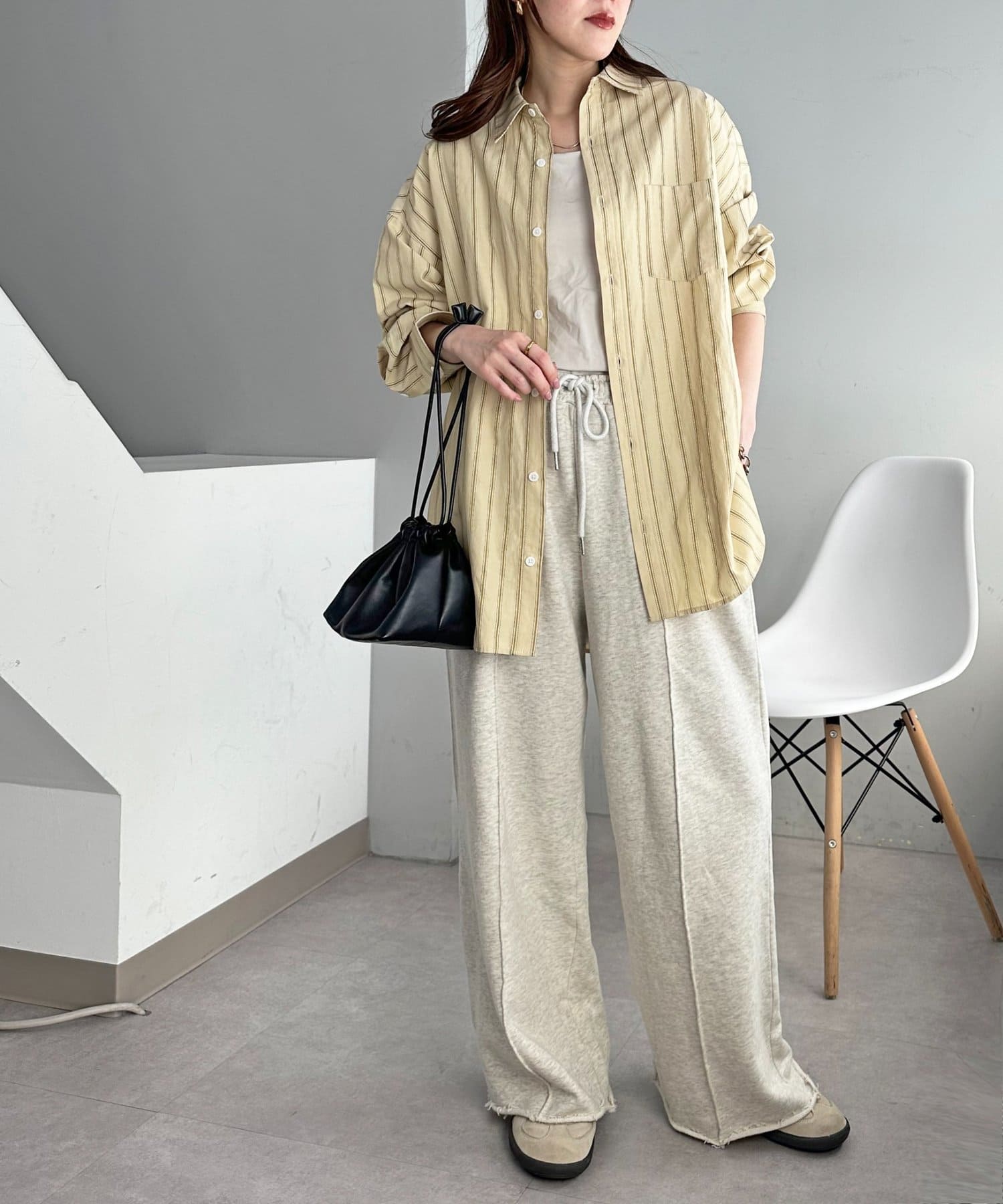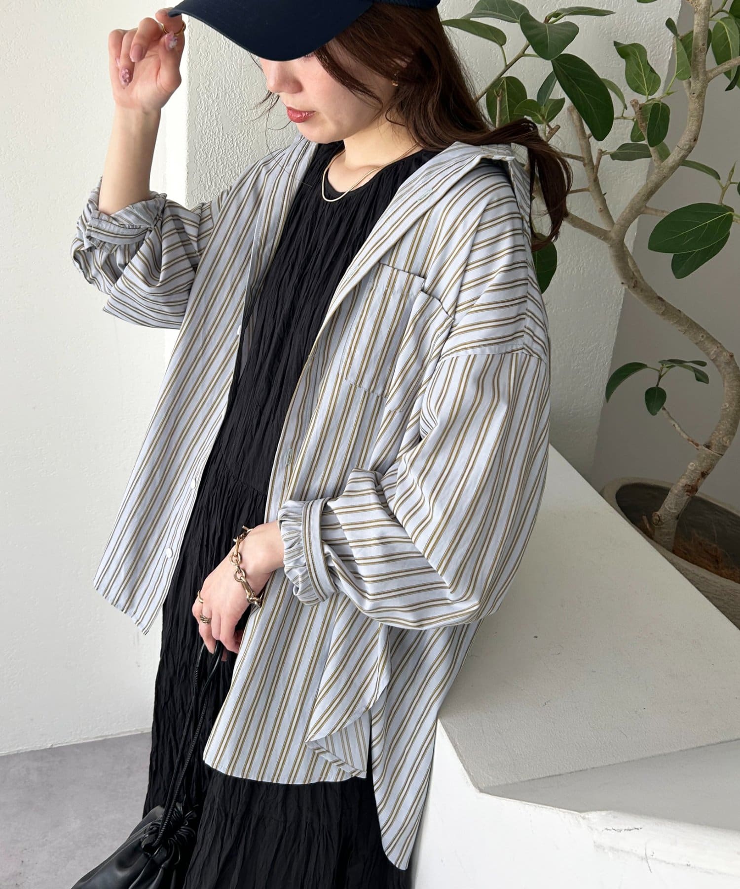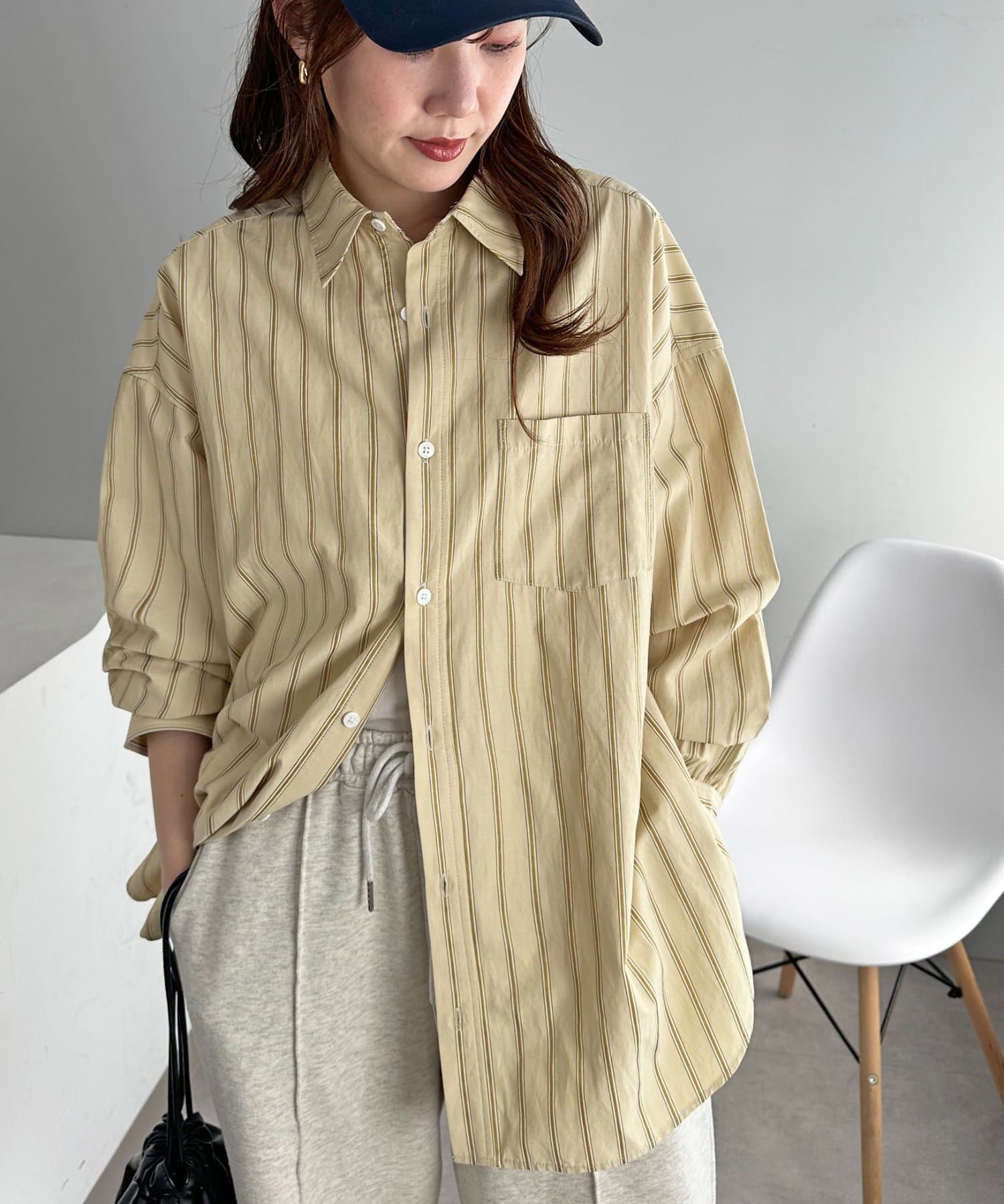 ストライプ柄が細身なので、オーバーシルエットですがどこかスッキリとした印象も与えてくれます。