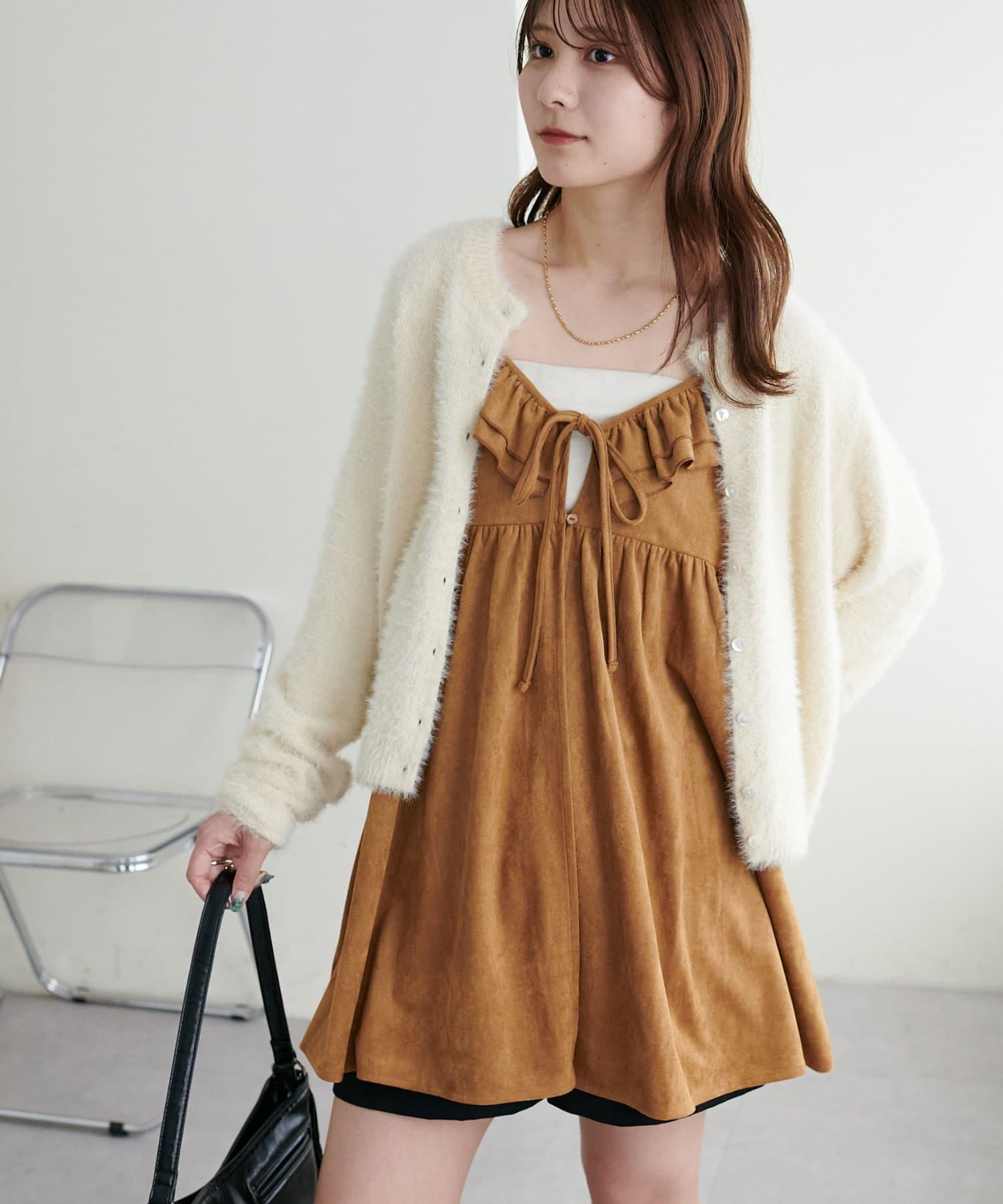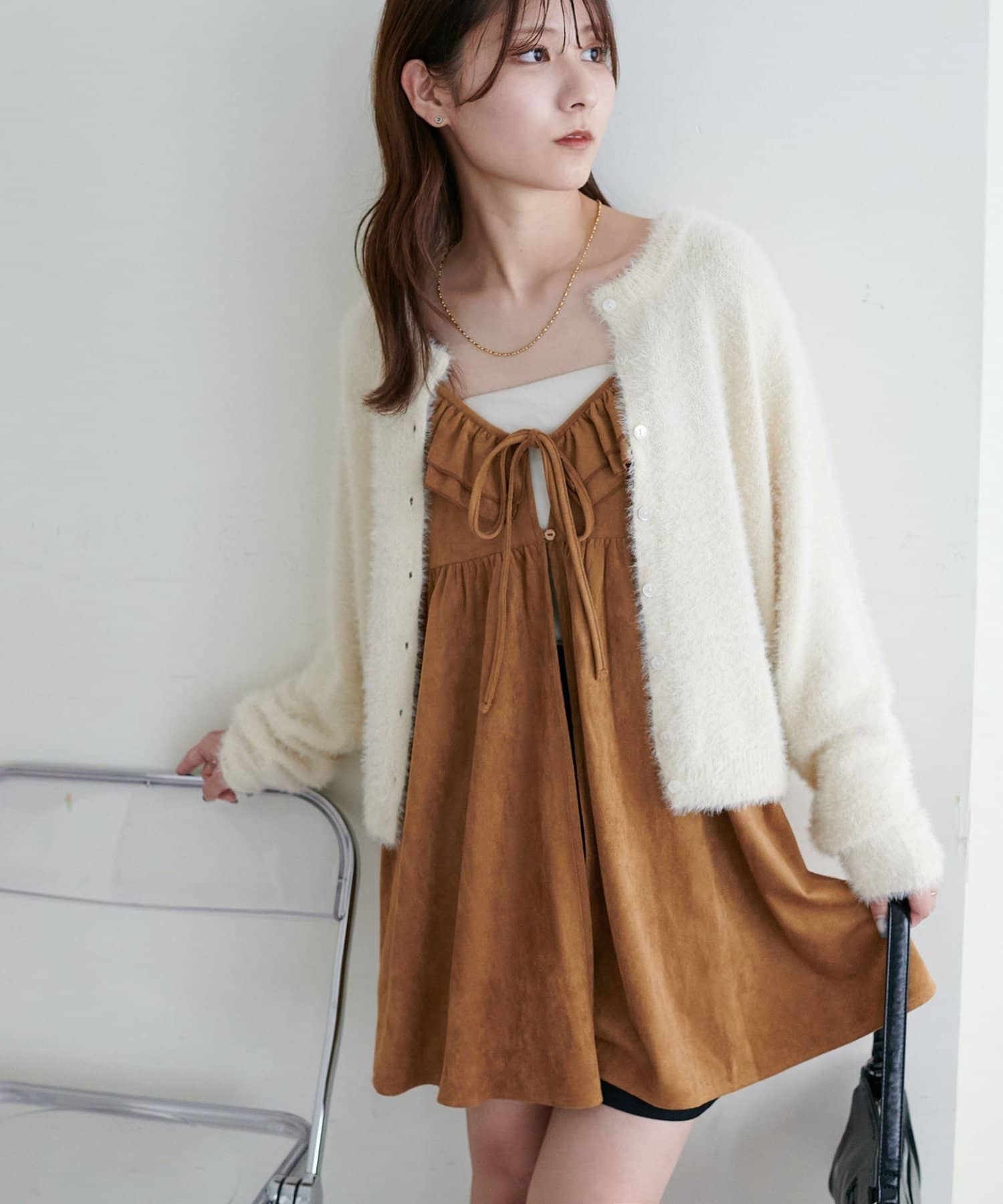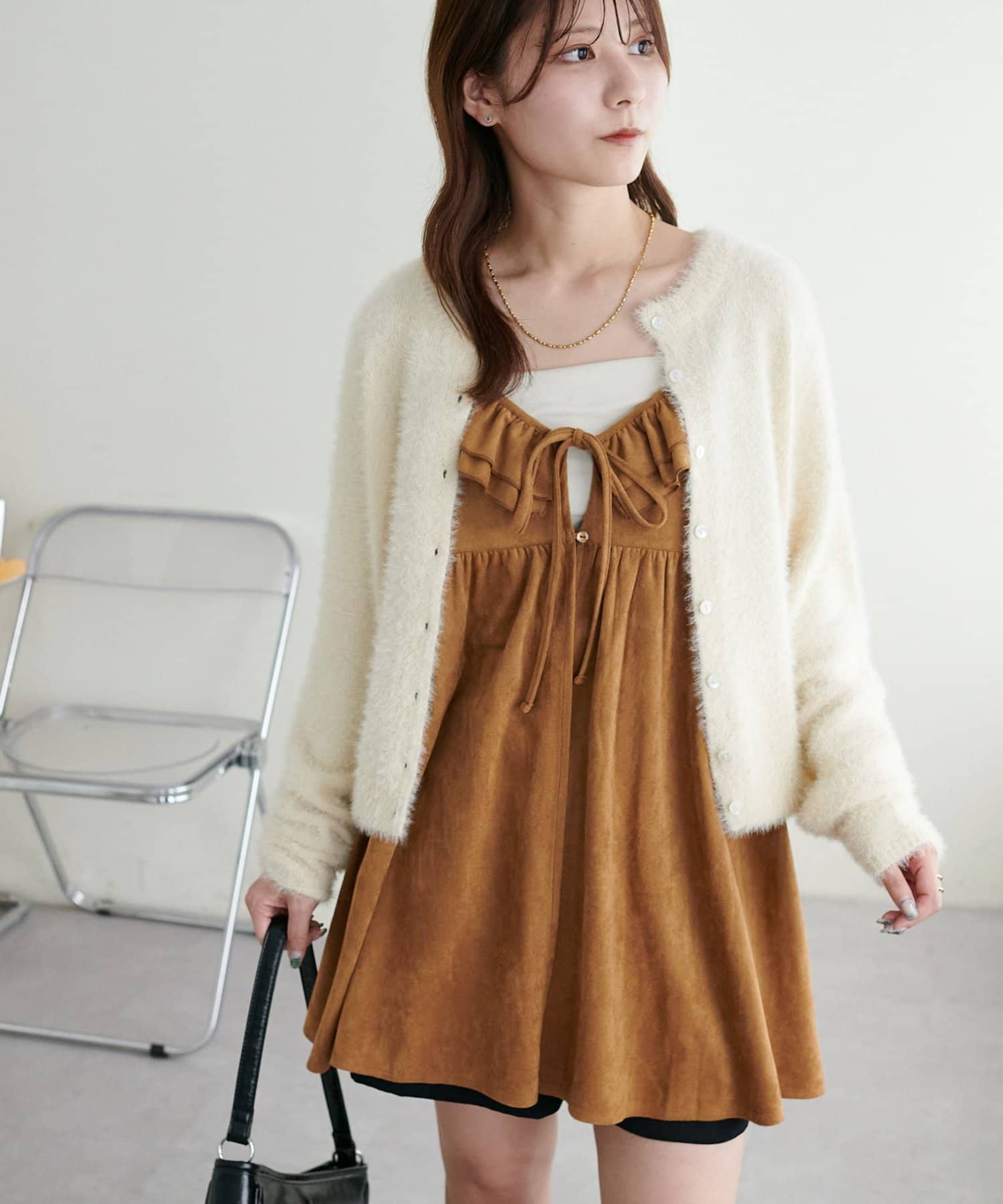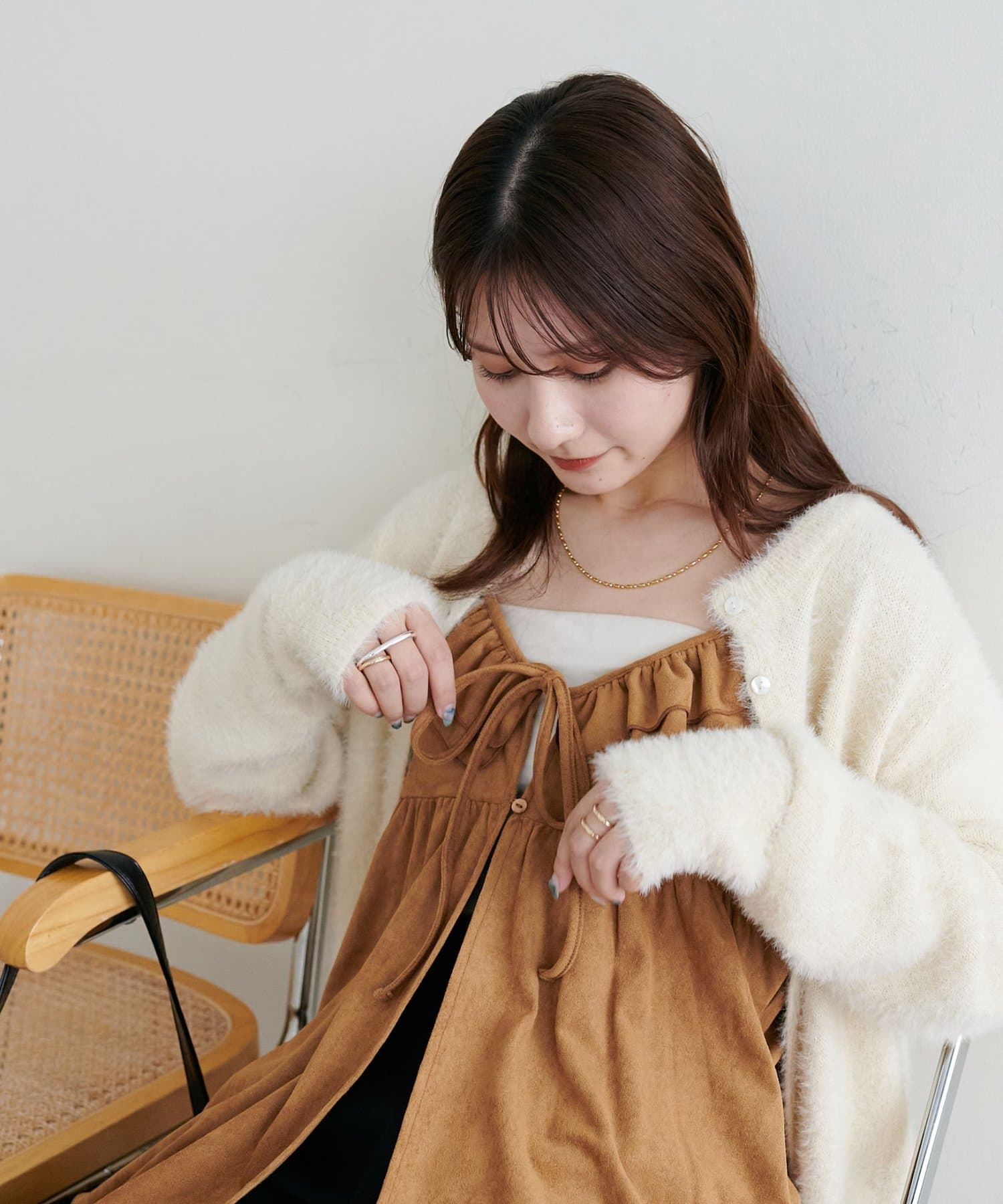 胸元にはフリルとリボンをあしらい、甘さを程よくプラスしました。前後2WAY仕様なので、気分に合わせて雰囲気を変えて楽しめるのも嬉しいポイント◎インナー次第でロングシーズン着回せる万能アイテムです。