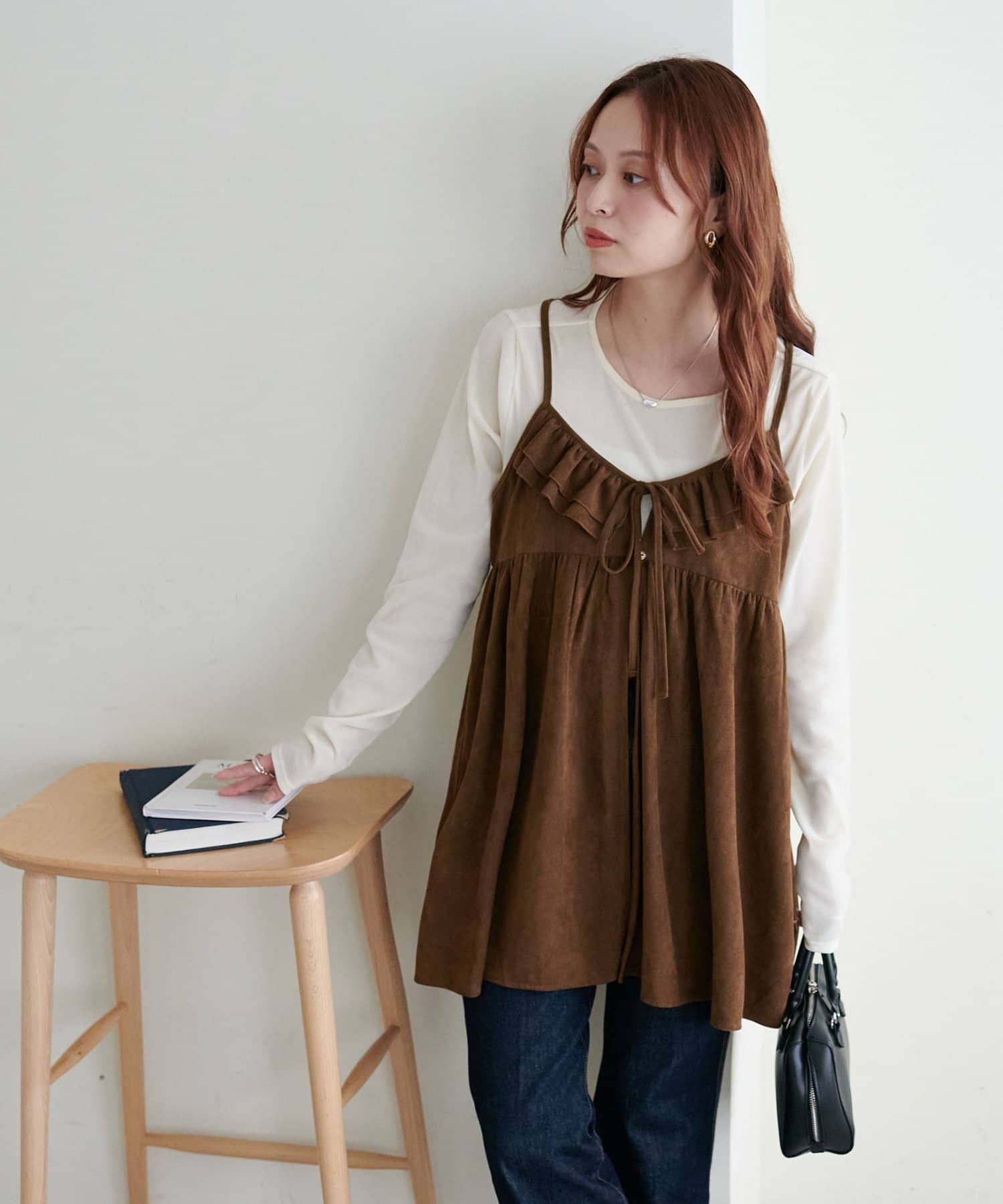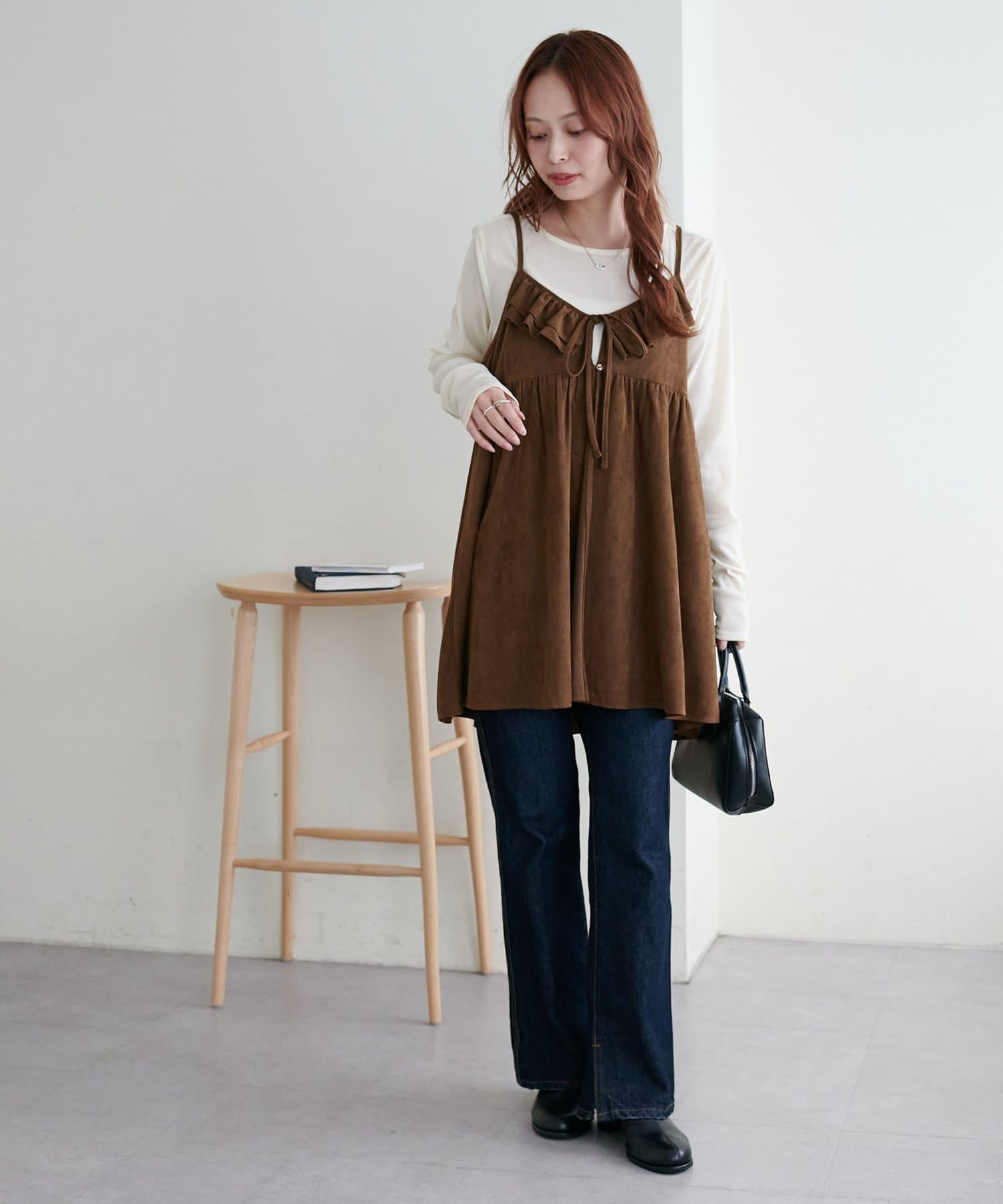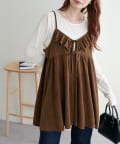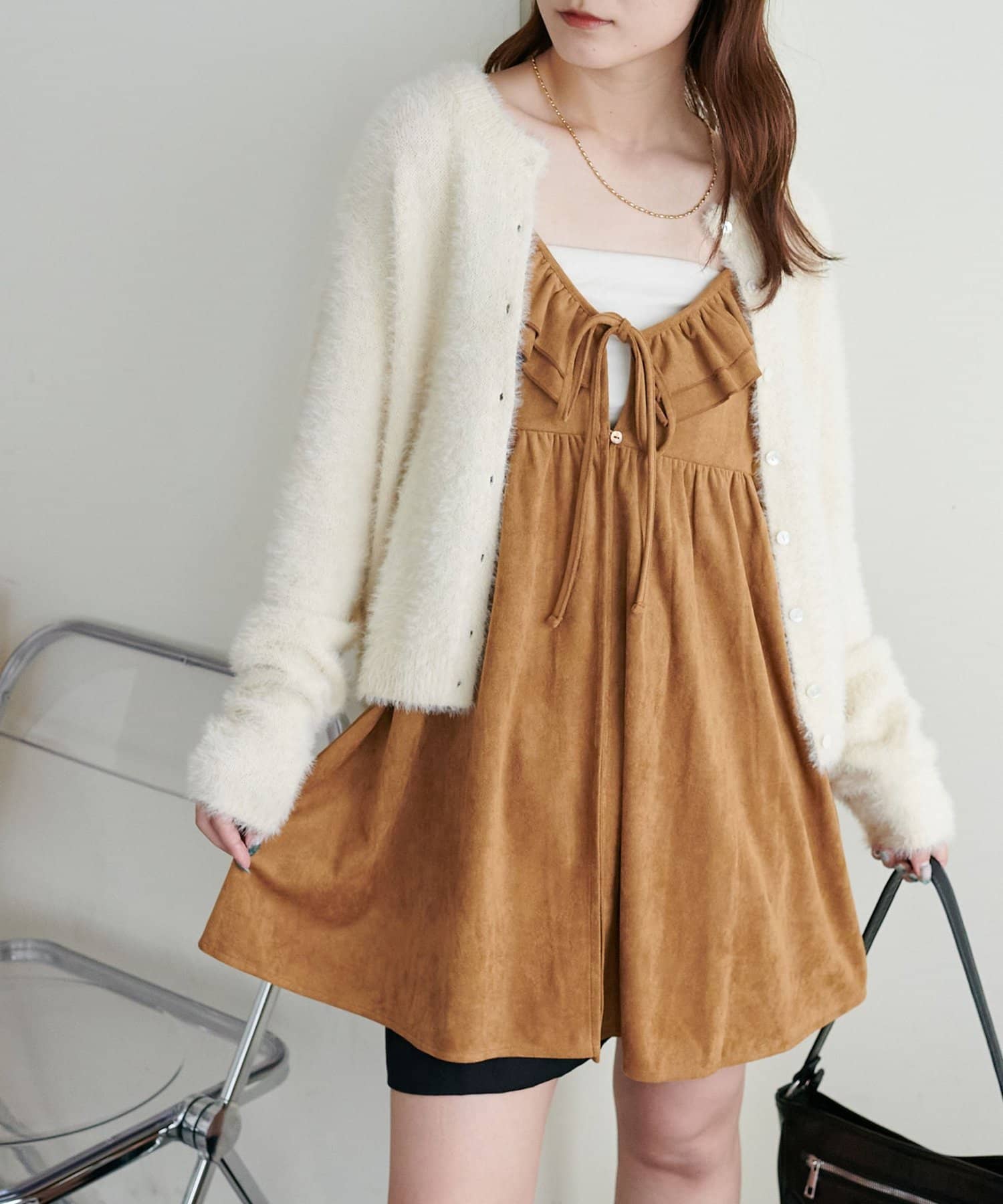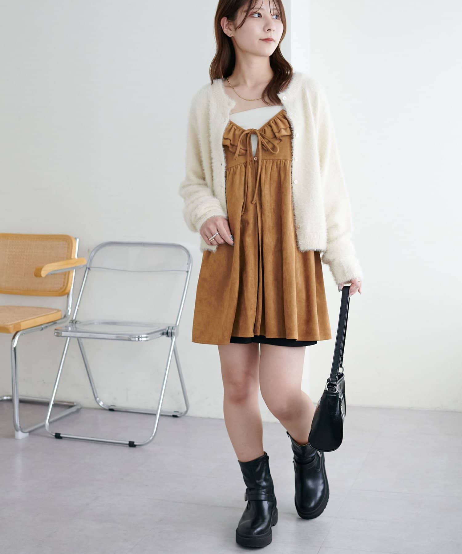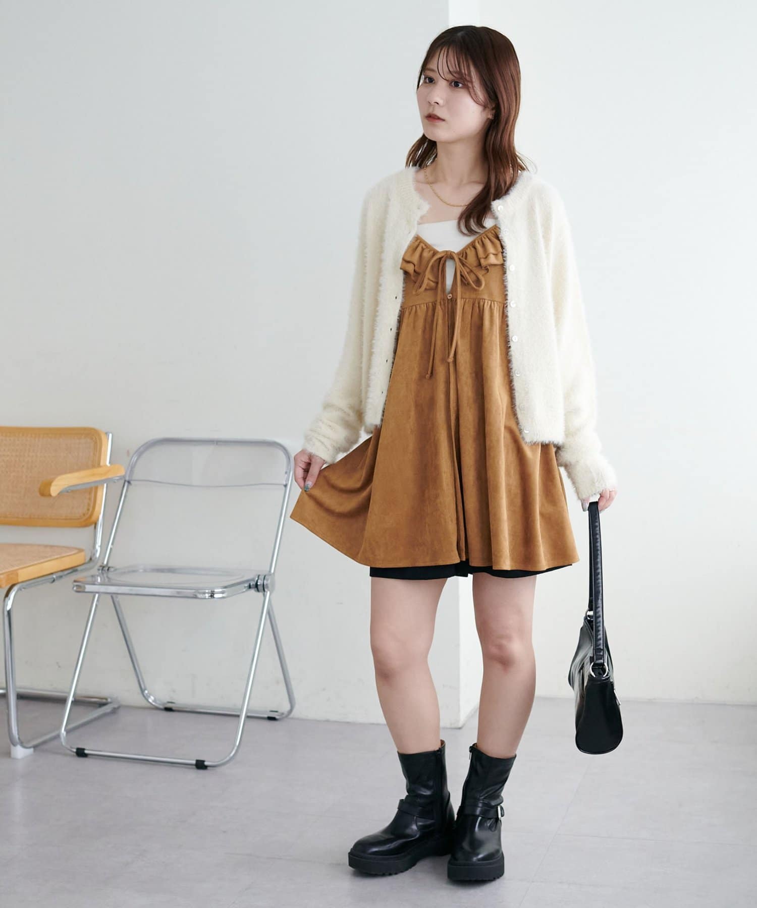 胸元にはフリルとリボンをあしらい、甘さを程よくプラスしました。前後2WAY仕様なので、気分に合わせて雰囲気を変えて楽しめるのも嬉しいポイント◎インナー次第でロングシーズン着回せる万能アイテムです。