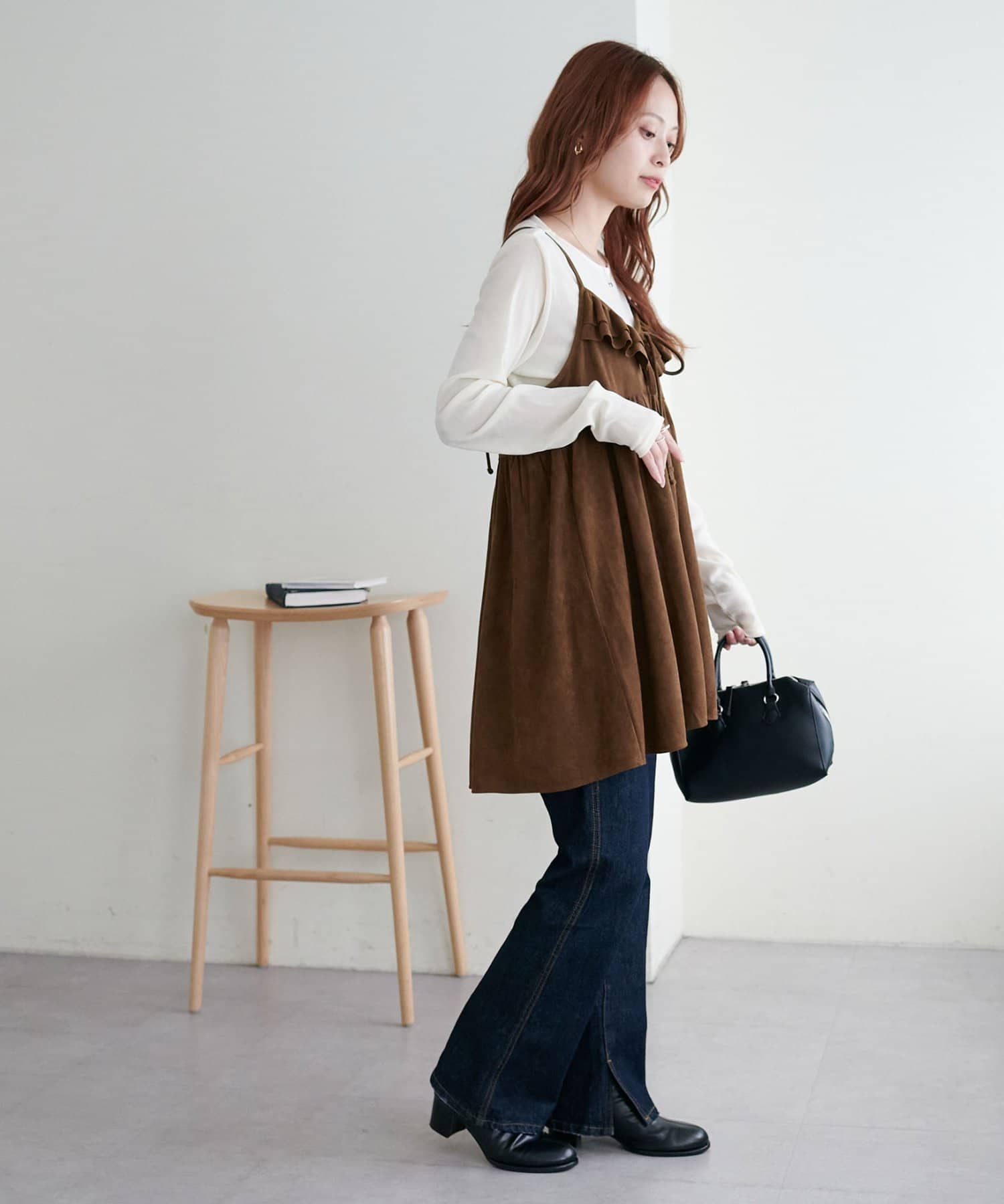 160cmスタッフ:ヒップがすっぽり隠れる丈感で安心して着られます。ゆとりのあるフレアシルエットなので体型カバー効果も抜群。カットソーや薄手ニットとのレイヤードも楽にでき、長いシーズン活躍してくれそうです。