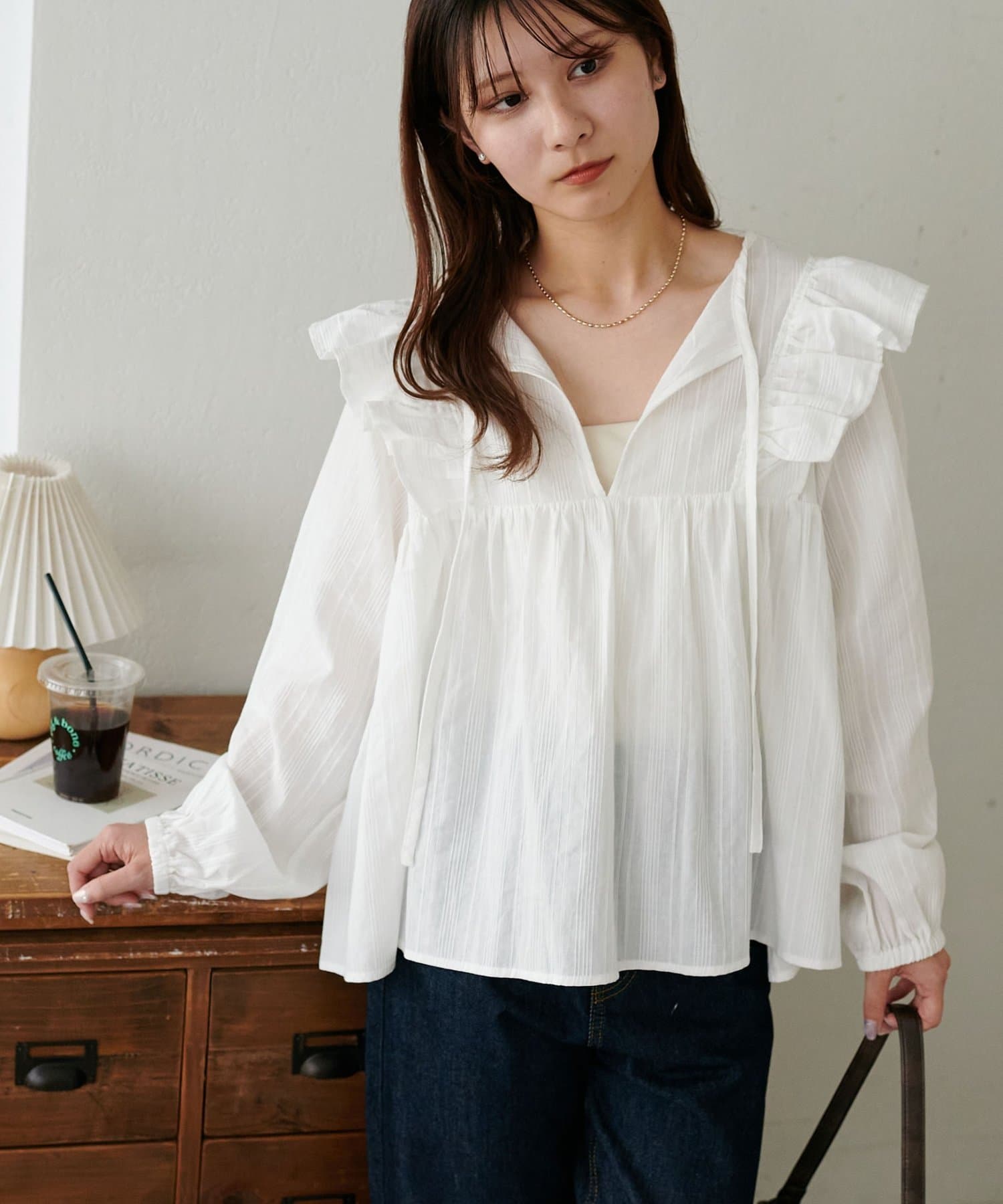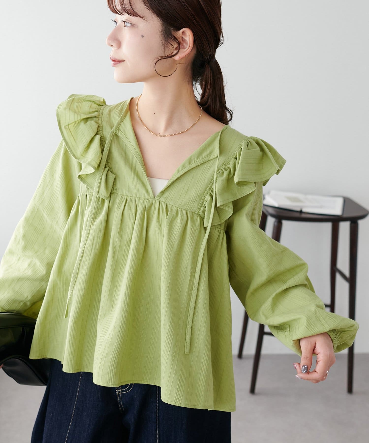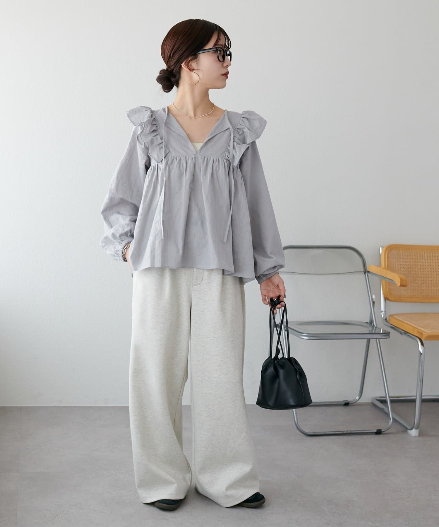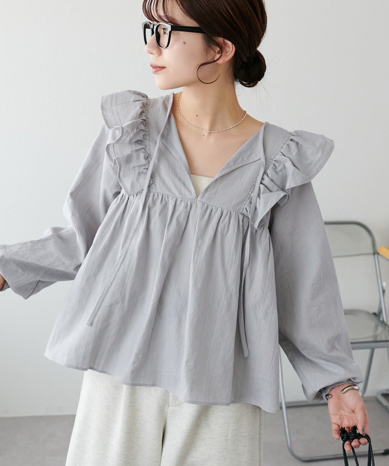 胸元のギャザーのおかげでふんわり見えしつつ、Vネックの抜け感で甘くなりすぎないバランスが◎