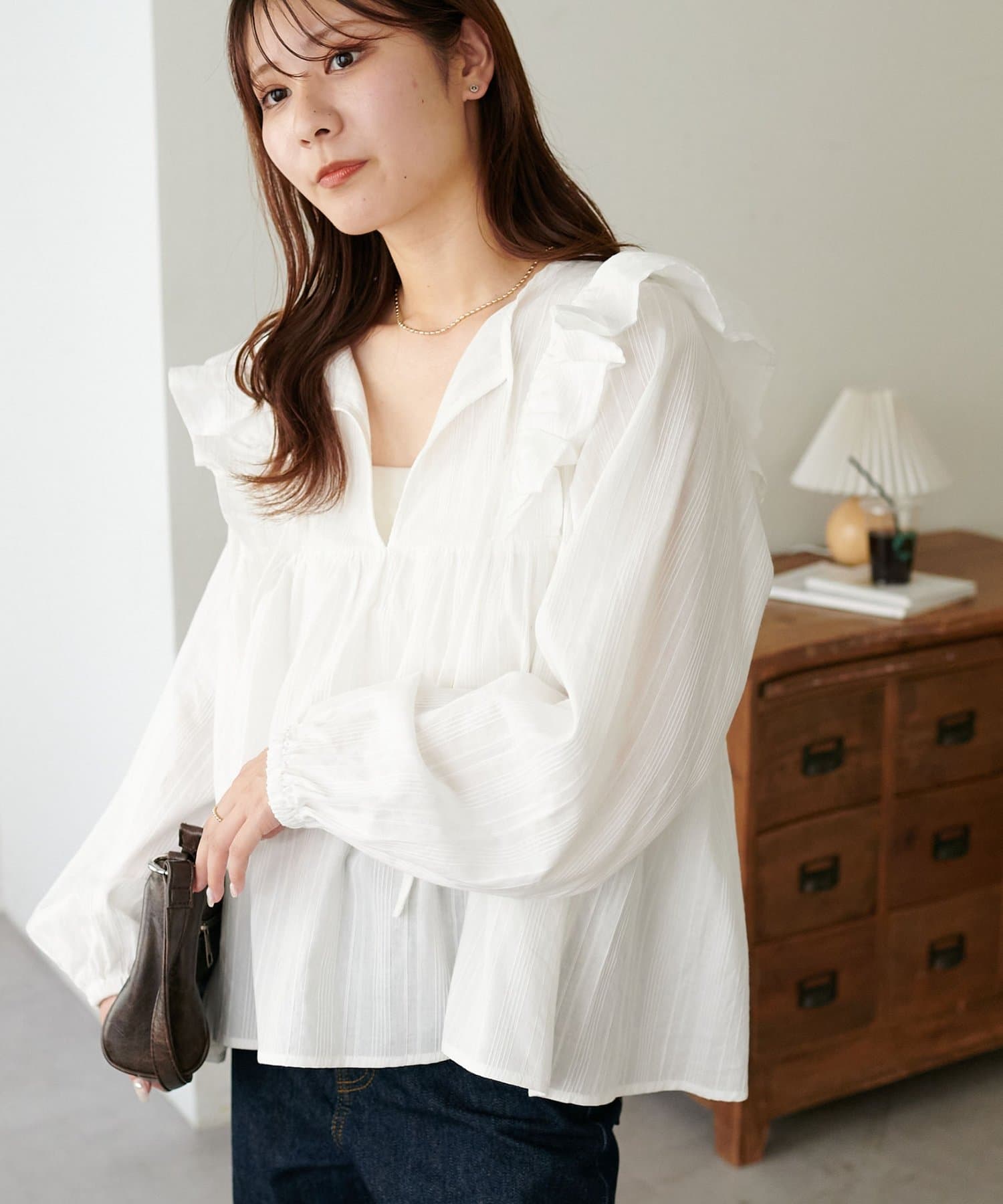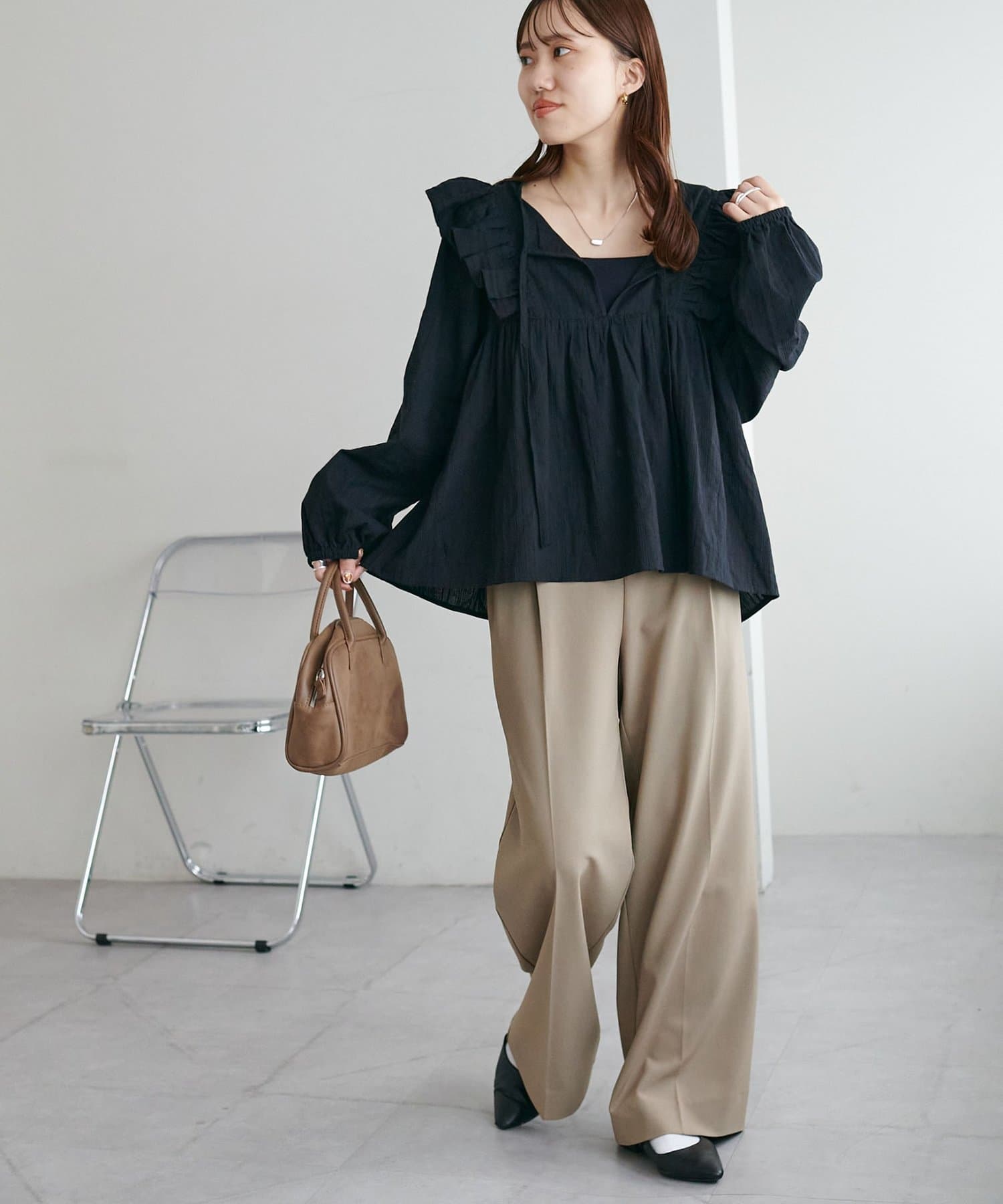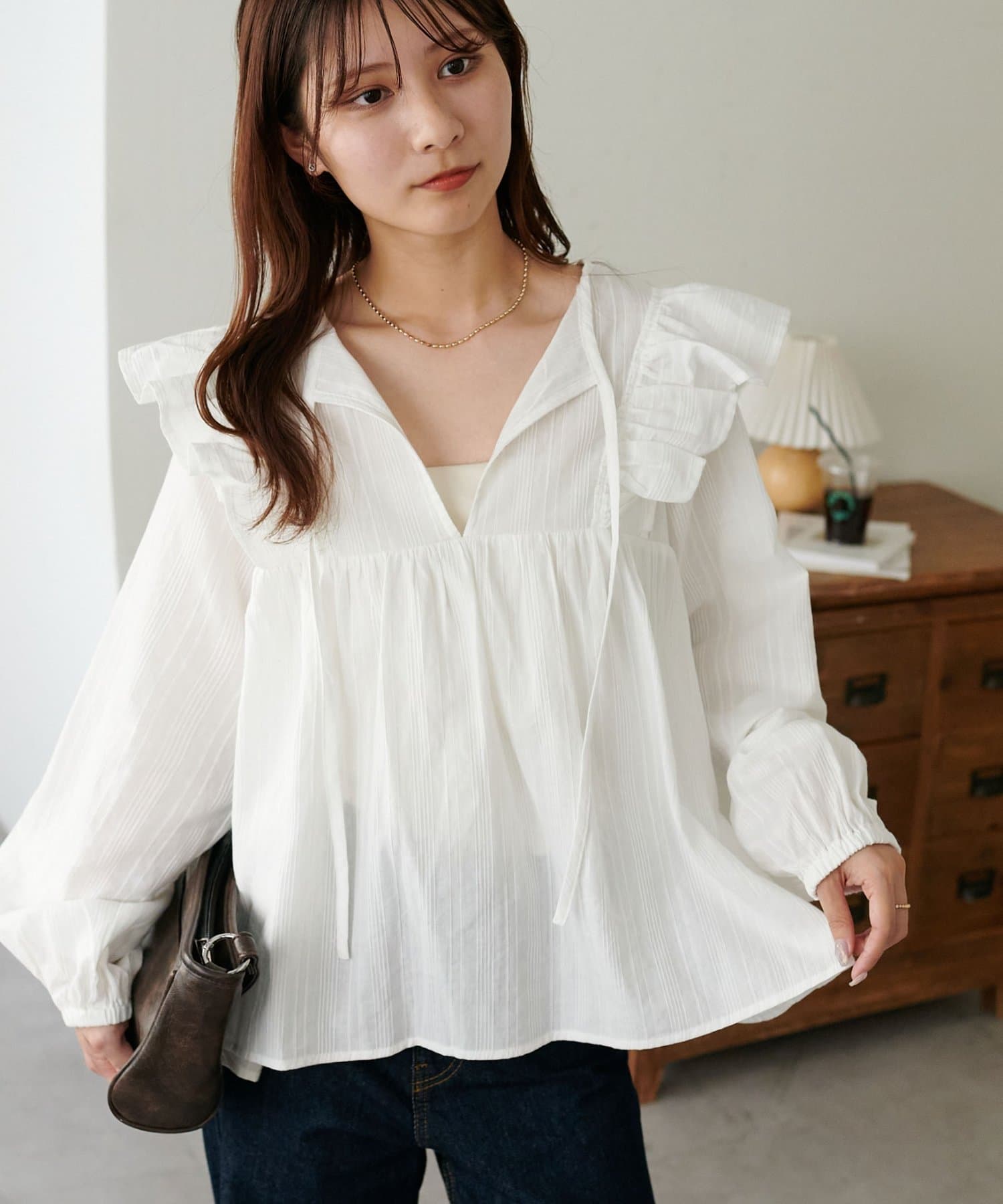 胸元のギャザーのおかげでふんわり見えしつつ、Vネックの抜け感で甘くなりすぎないバランスが◎