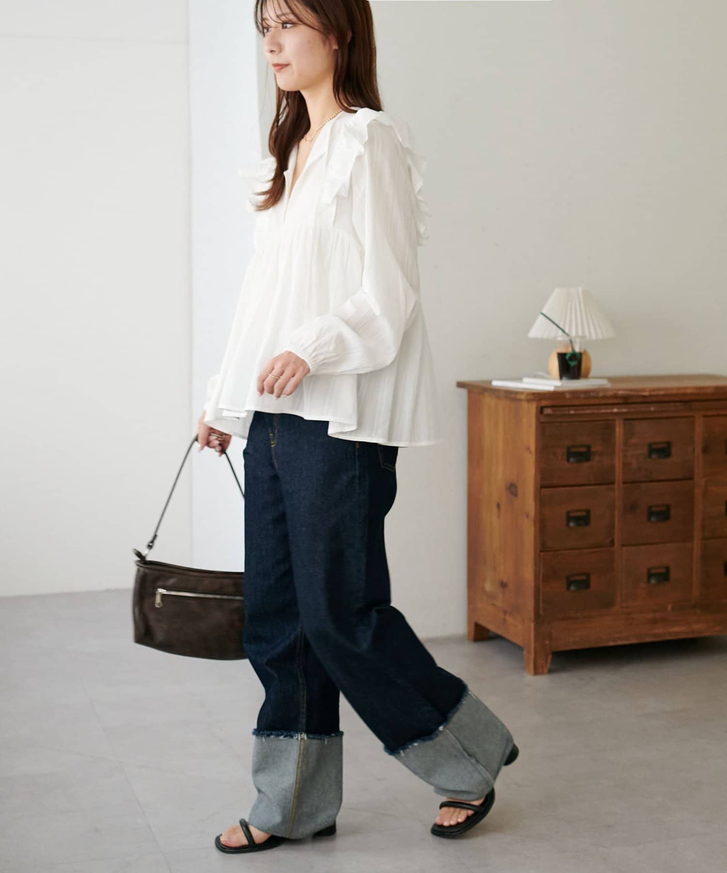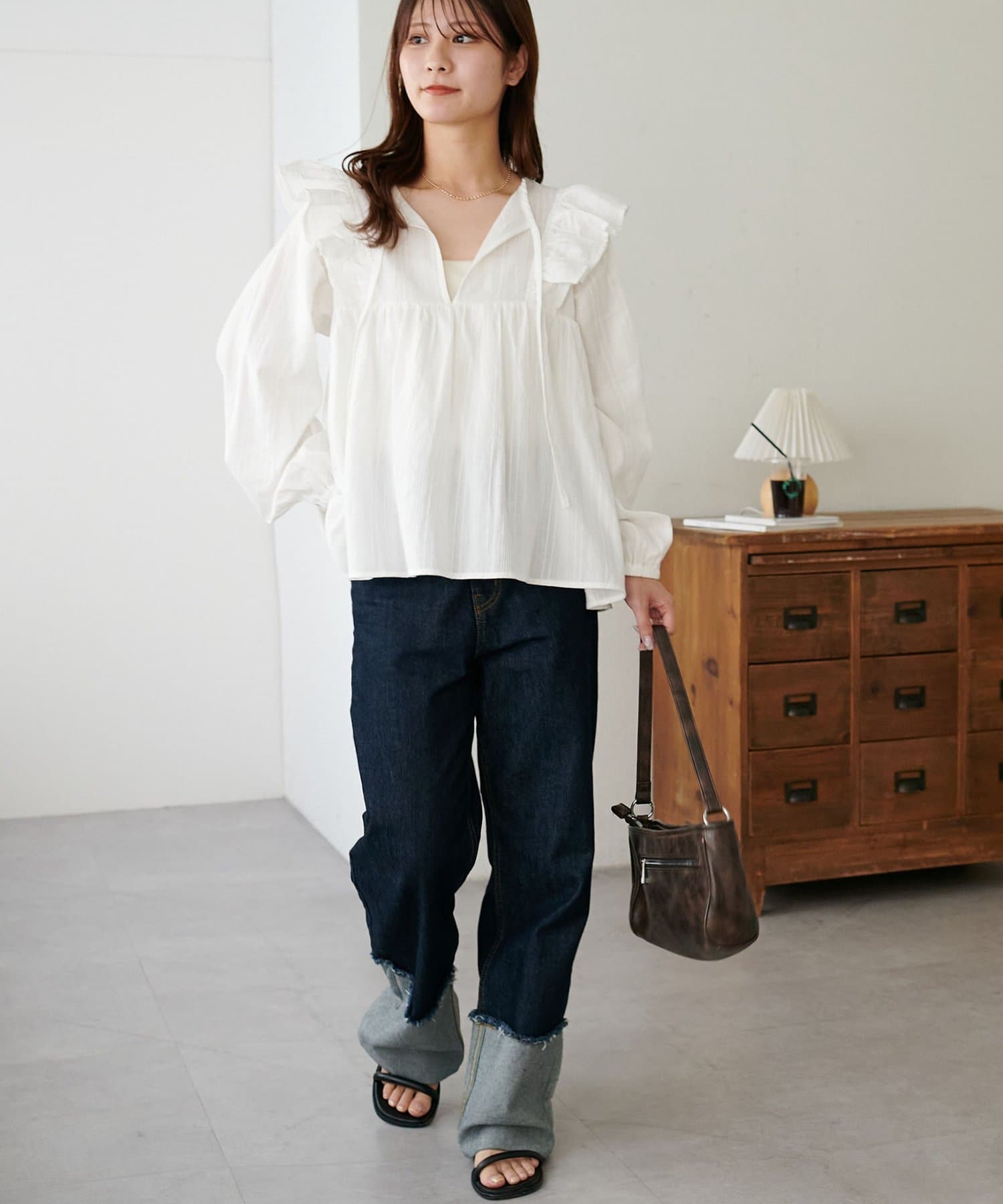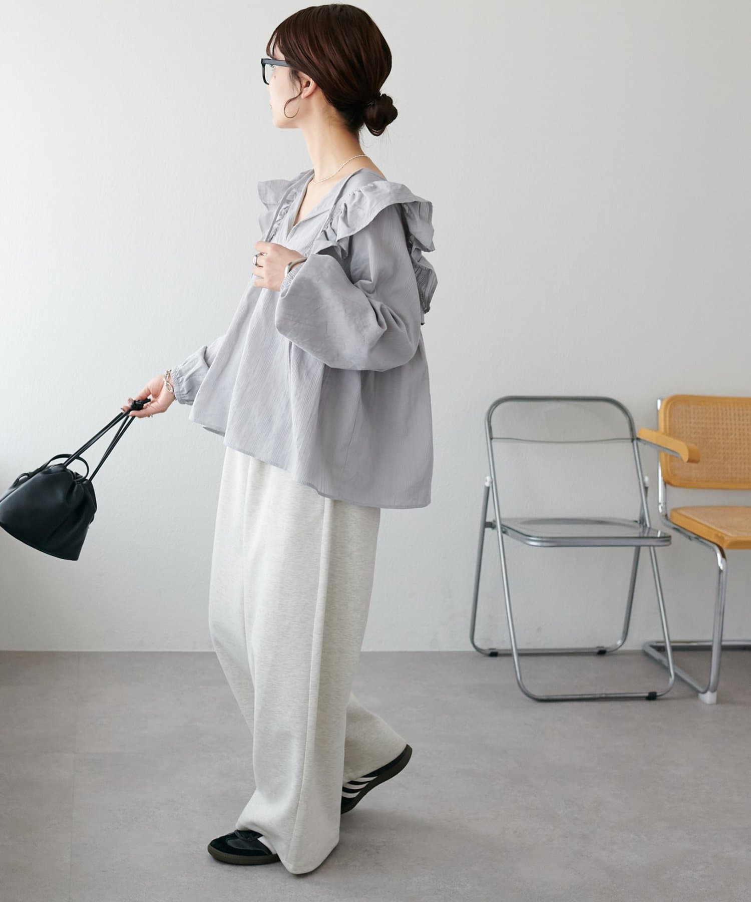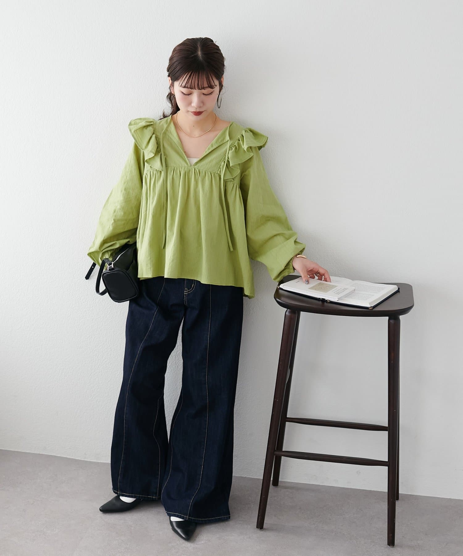 胸元のギャザーのおかげでふんわり見えしつつ、Vネックの抜け感で甘くなりすぎないバランスが◎