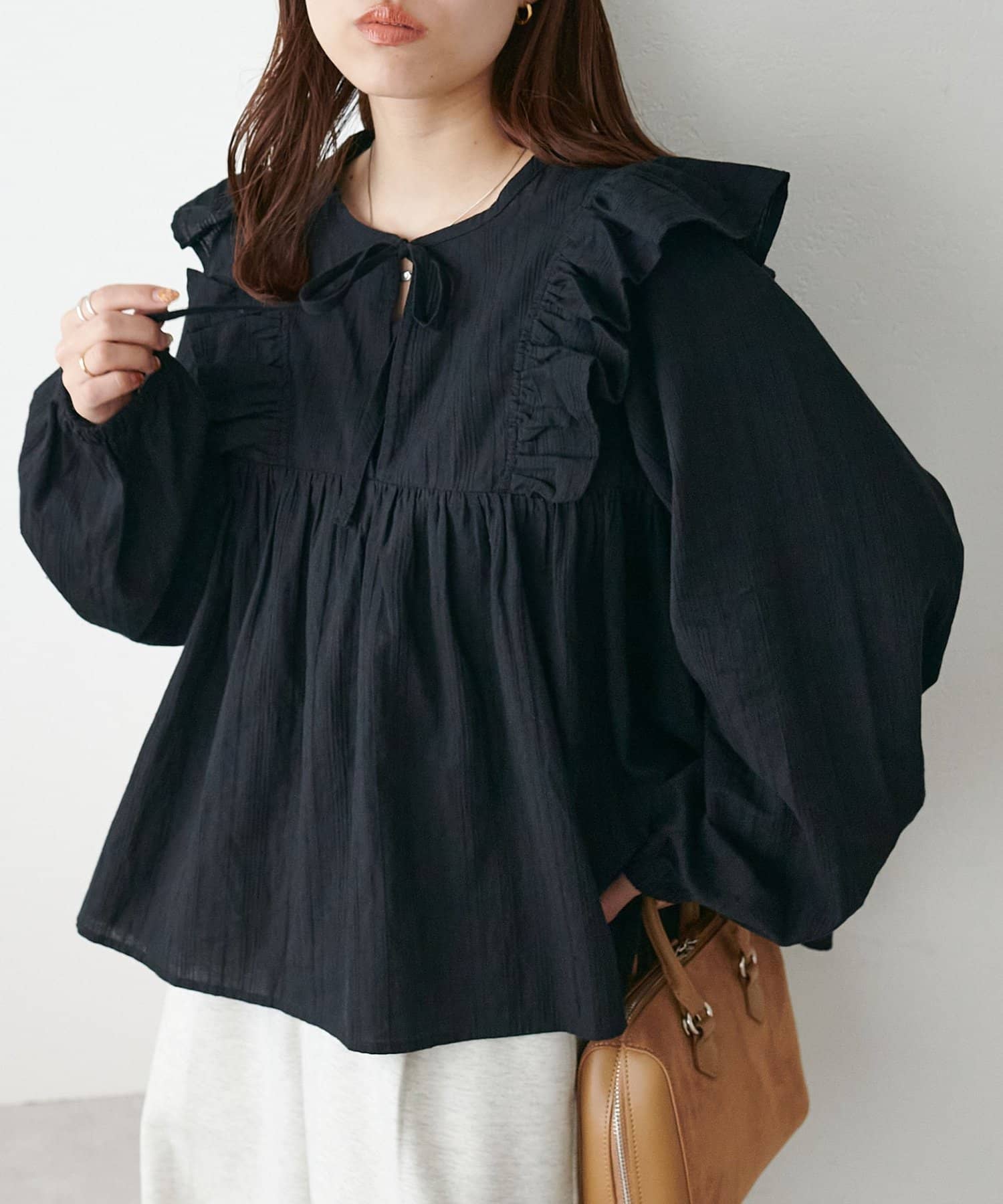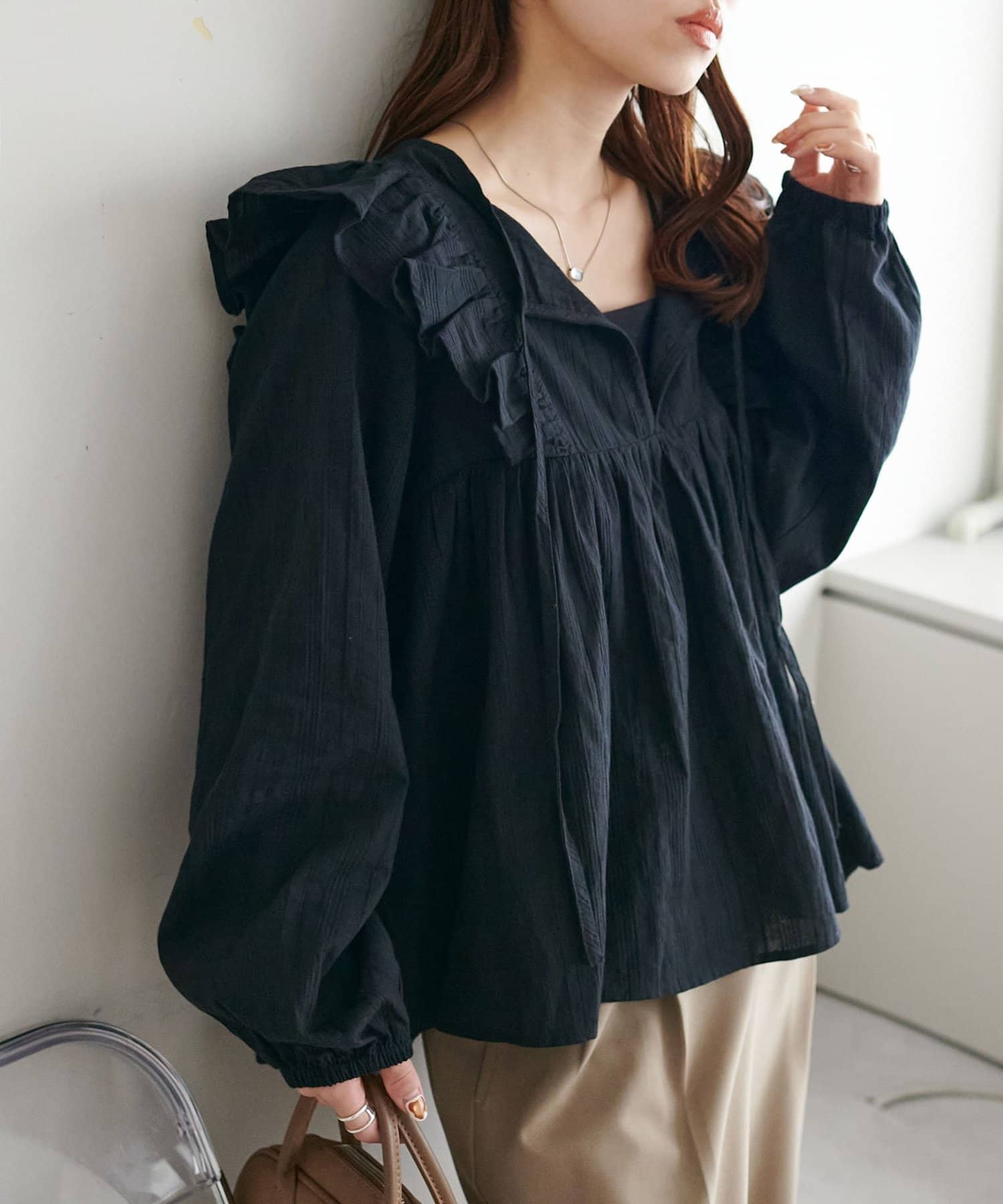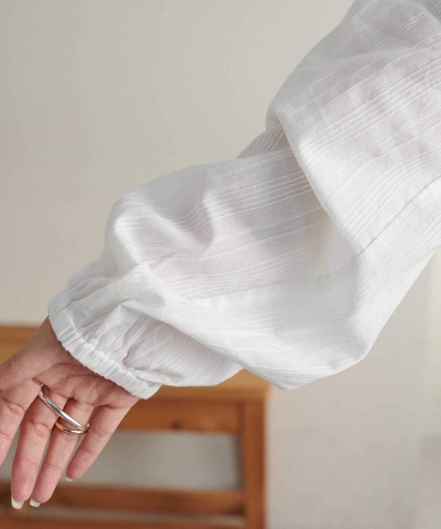・袖口は絞りデザインで、ボリュームのある袖が女性らしい印象に