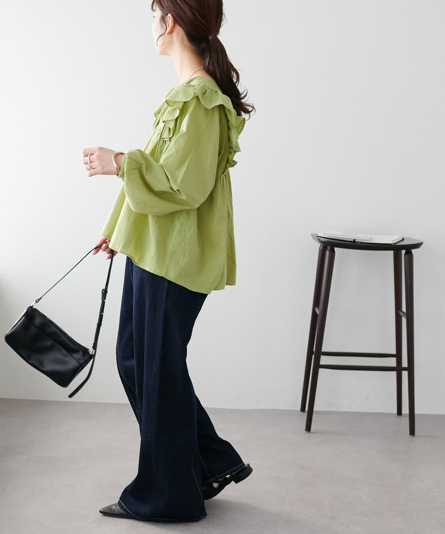 ・ブラウス自体が華やかなので、シンプルなデニムやスラックスを合わせるだけでコーデが完成