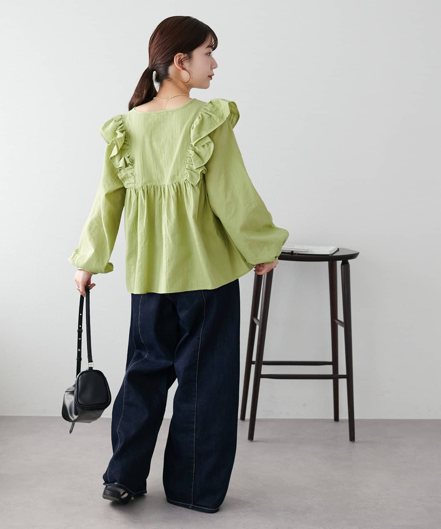 155cmスタッフ:軽い生地感でストレスなく着られ、動くたびにフリルが揺れてとても可愛い印象でした。