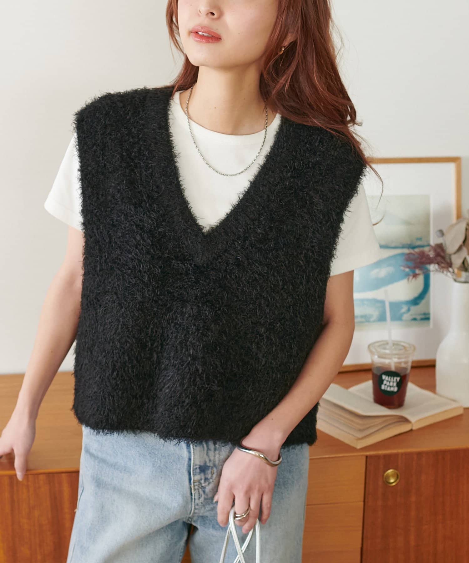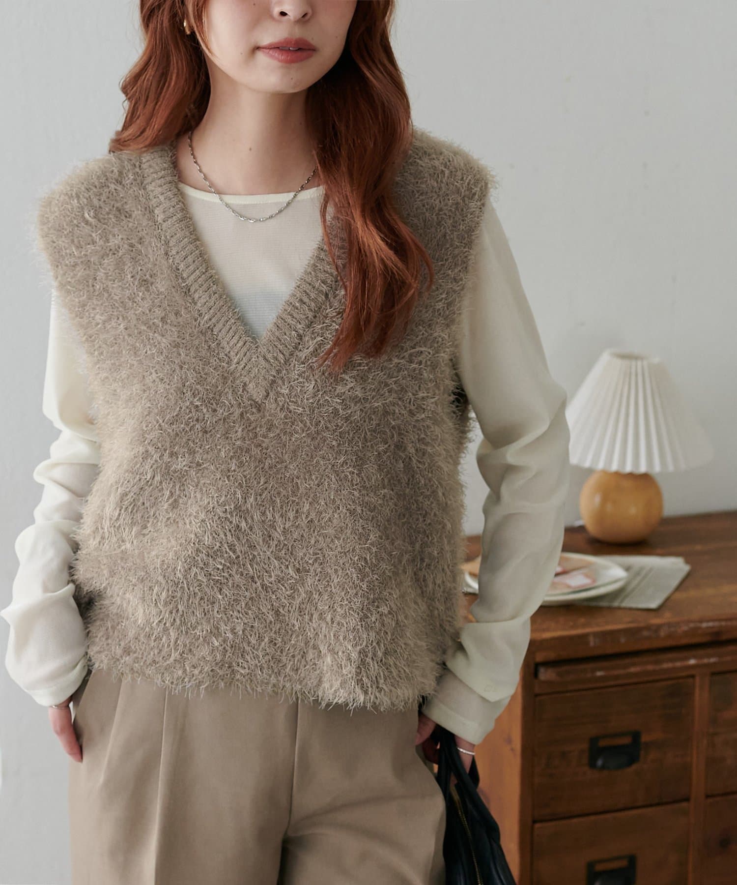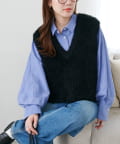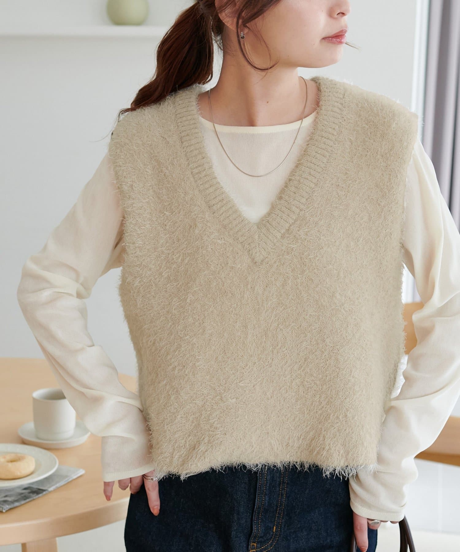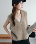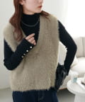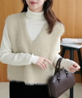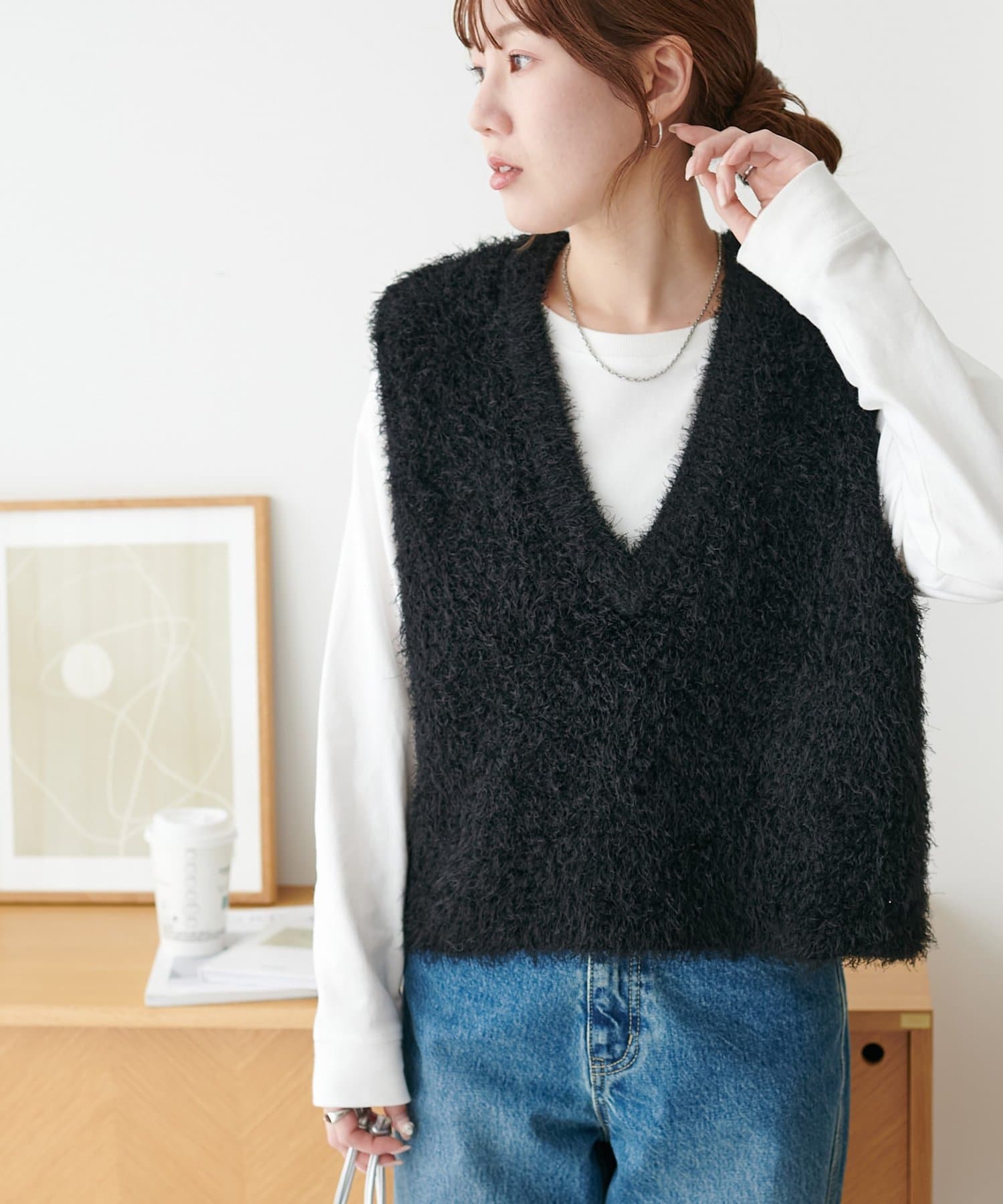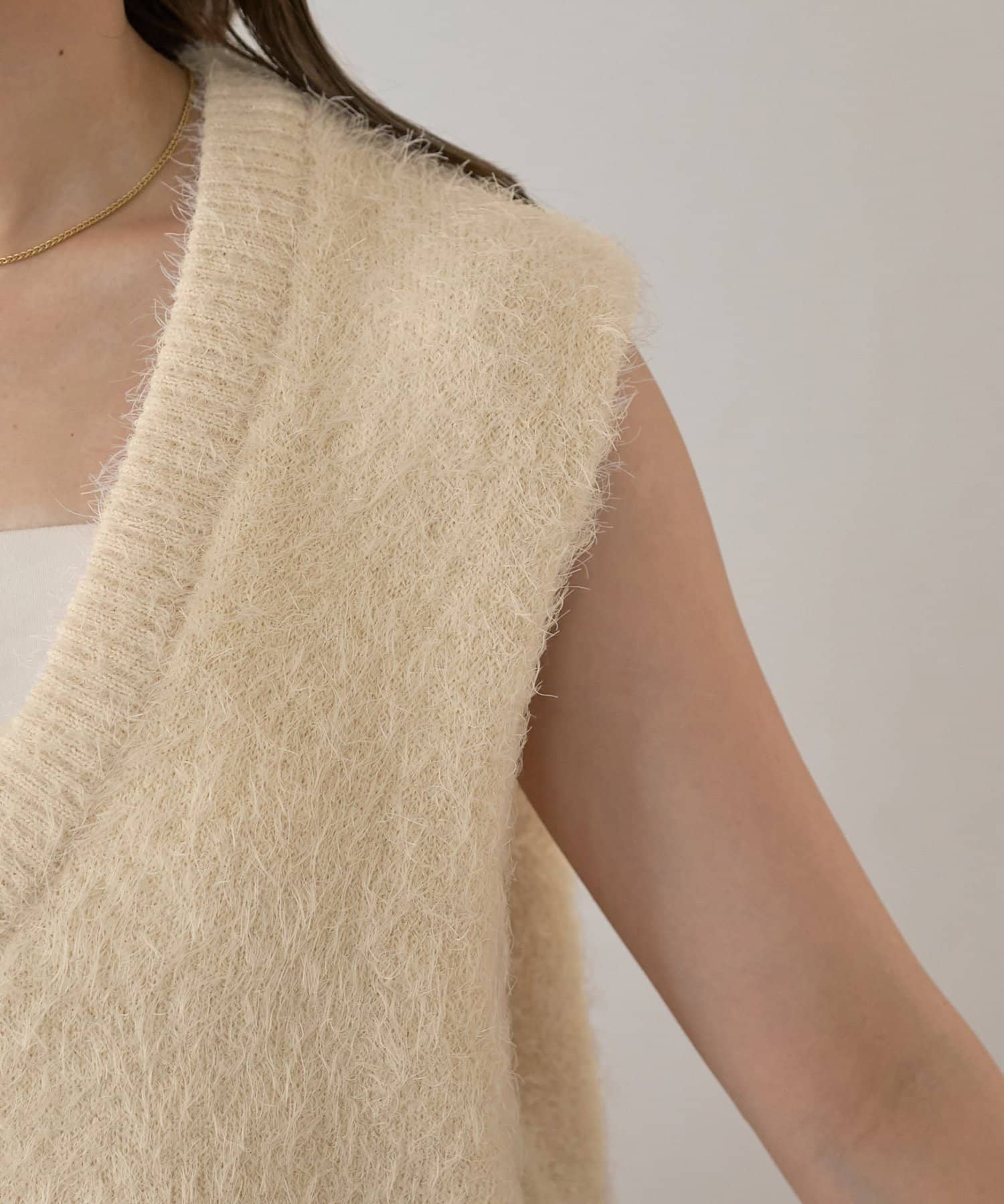 ふわふわとした毛足の長さが特徴のフェザー素材のショートベスト。