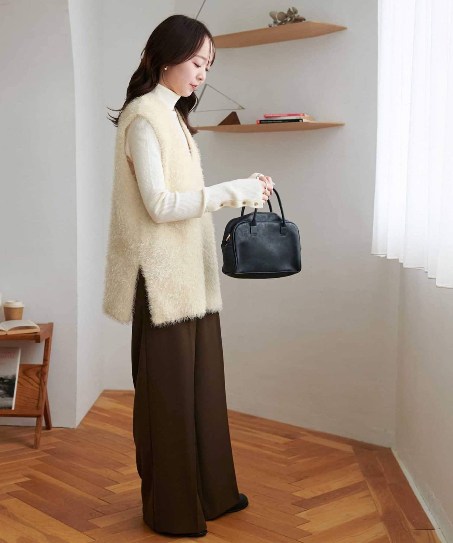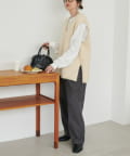 レイヤードコーデに重宝するベストをふわっとしたフェザーの生地で仕立てました。