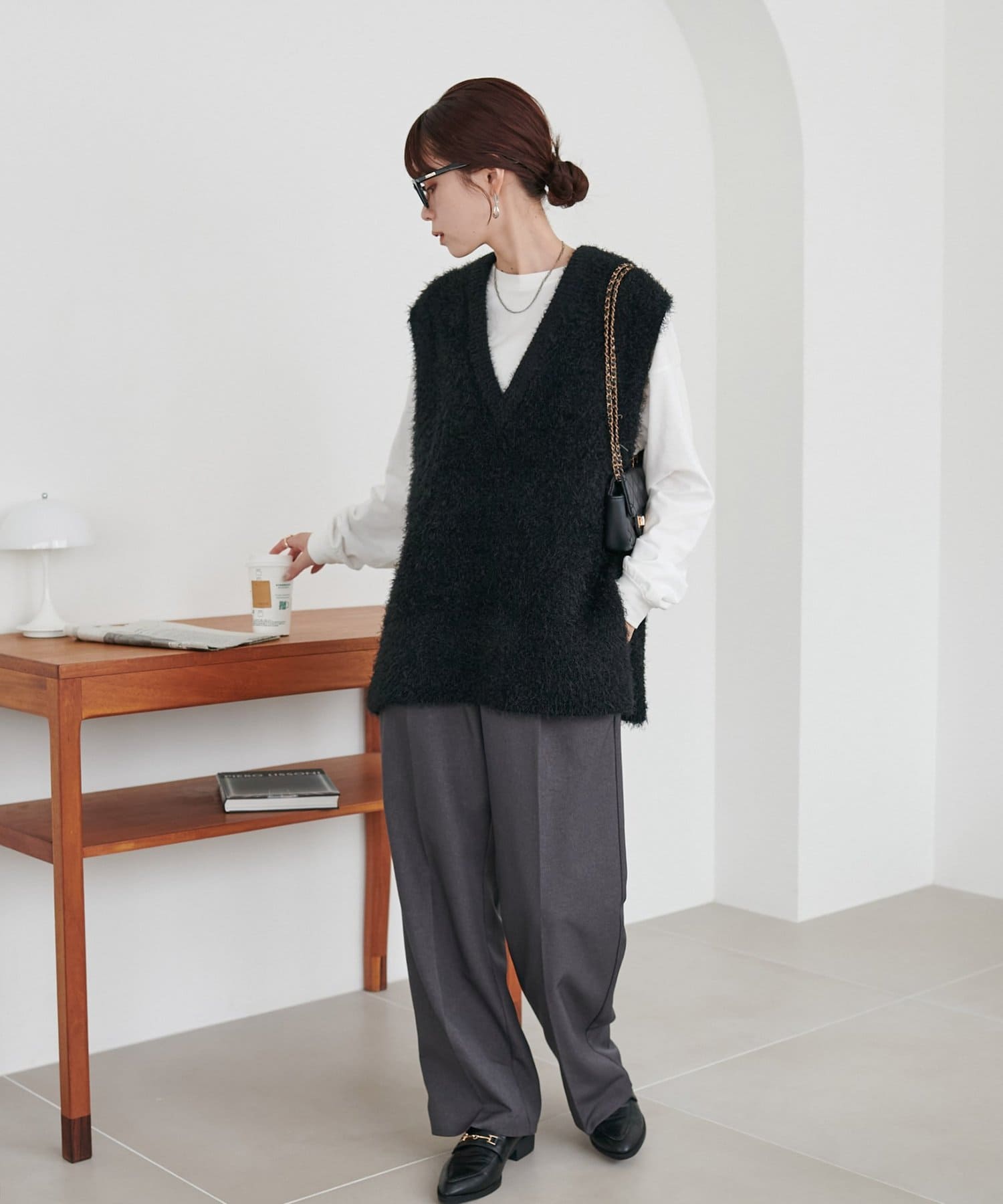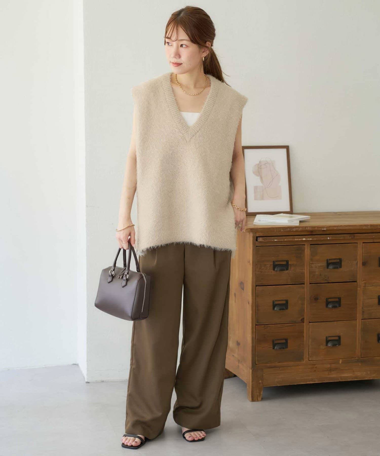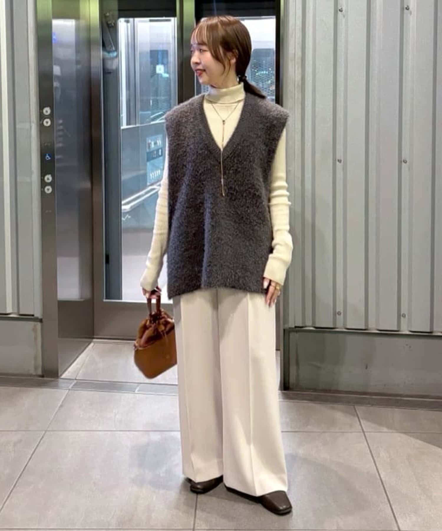 広めのvネックは顔回りがすっきりとした印象になるので、クルーネックからタートルネックまでレイヤード合わせが楽しめます♪