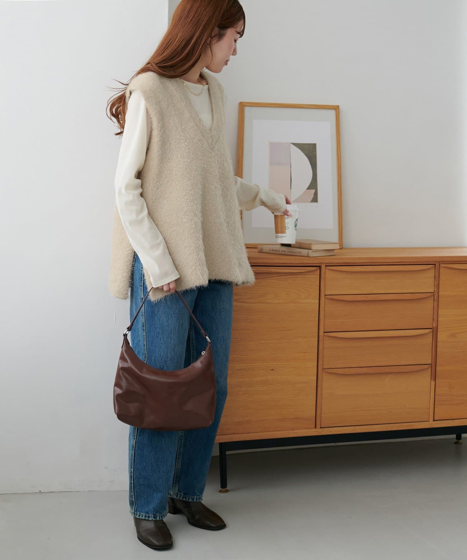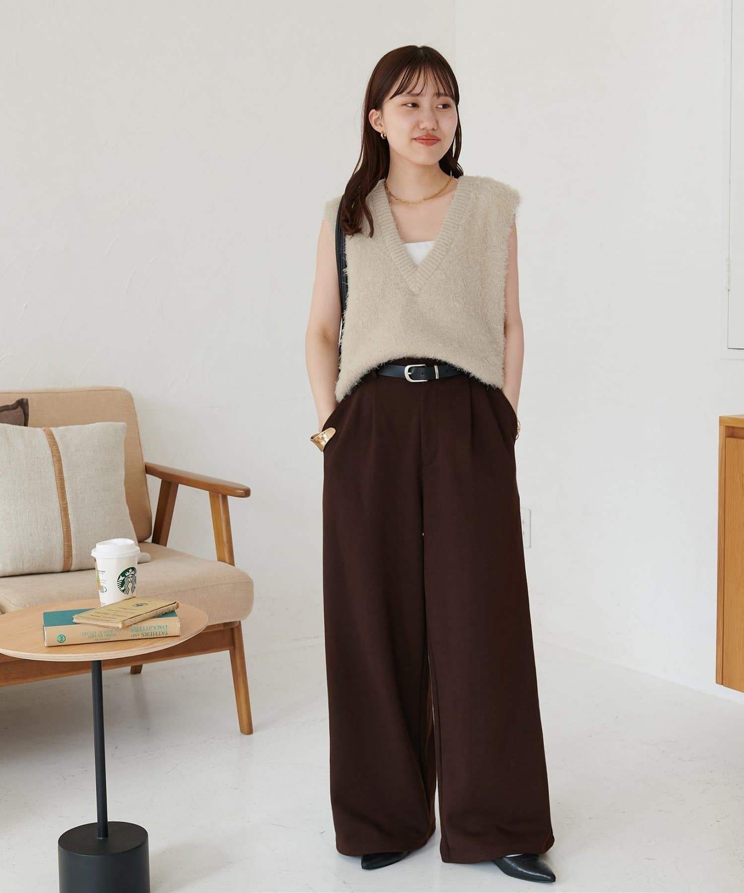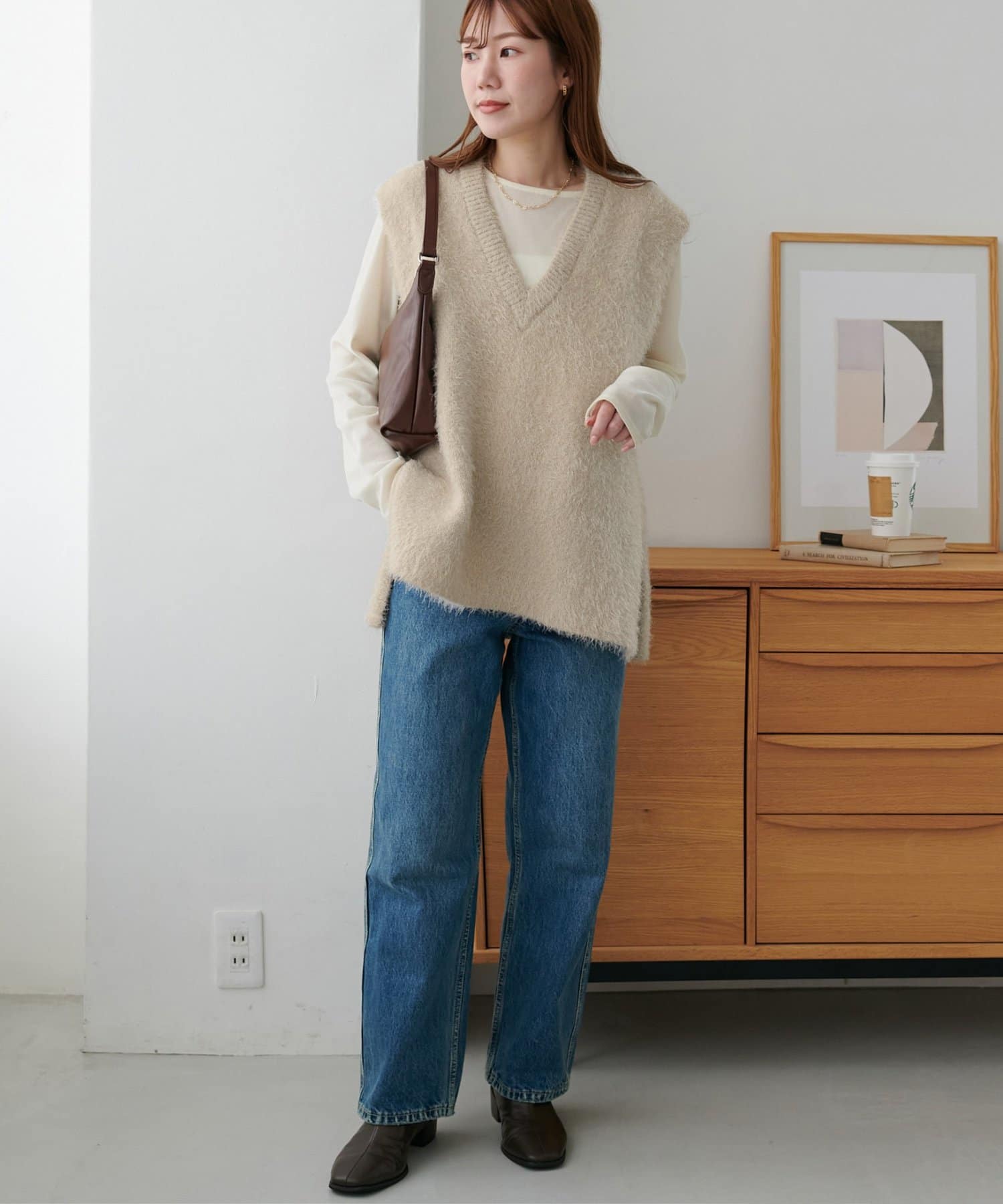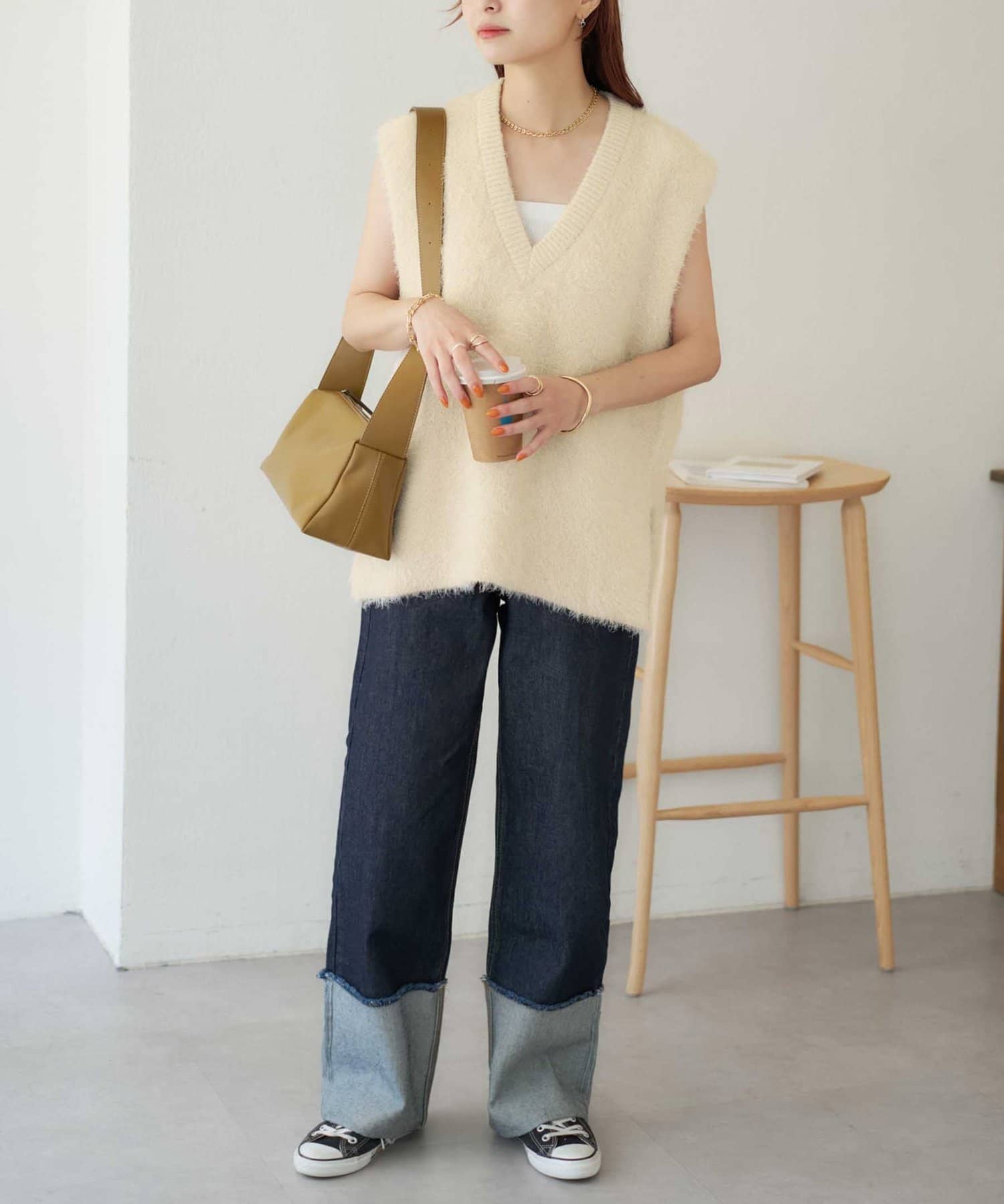 広めのvネックは顔回りがすっきりとした印象になるので、クルーネックからタートルネックまでレイヤード合わせが楽しめます♪