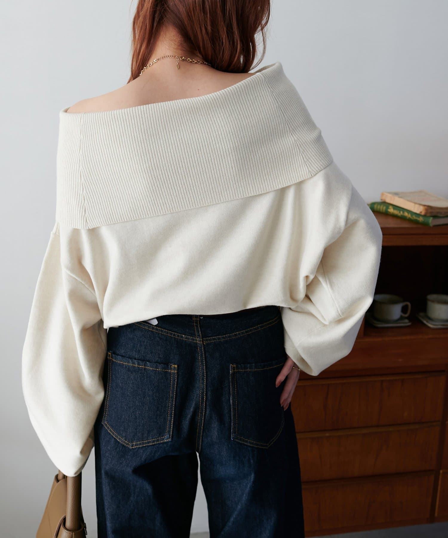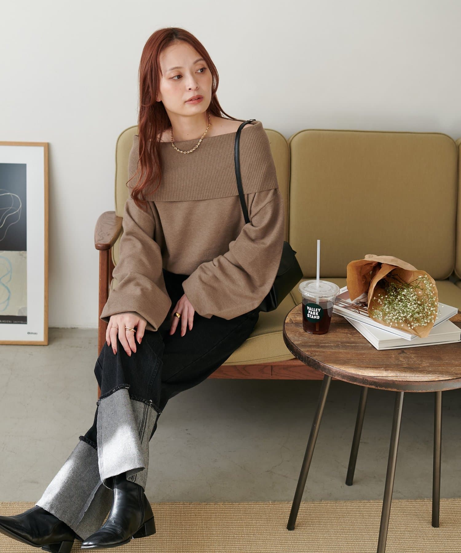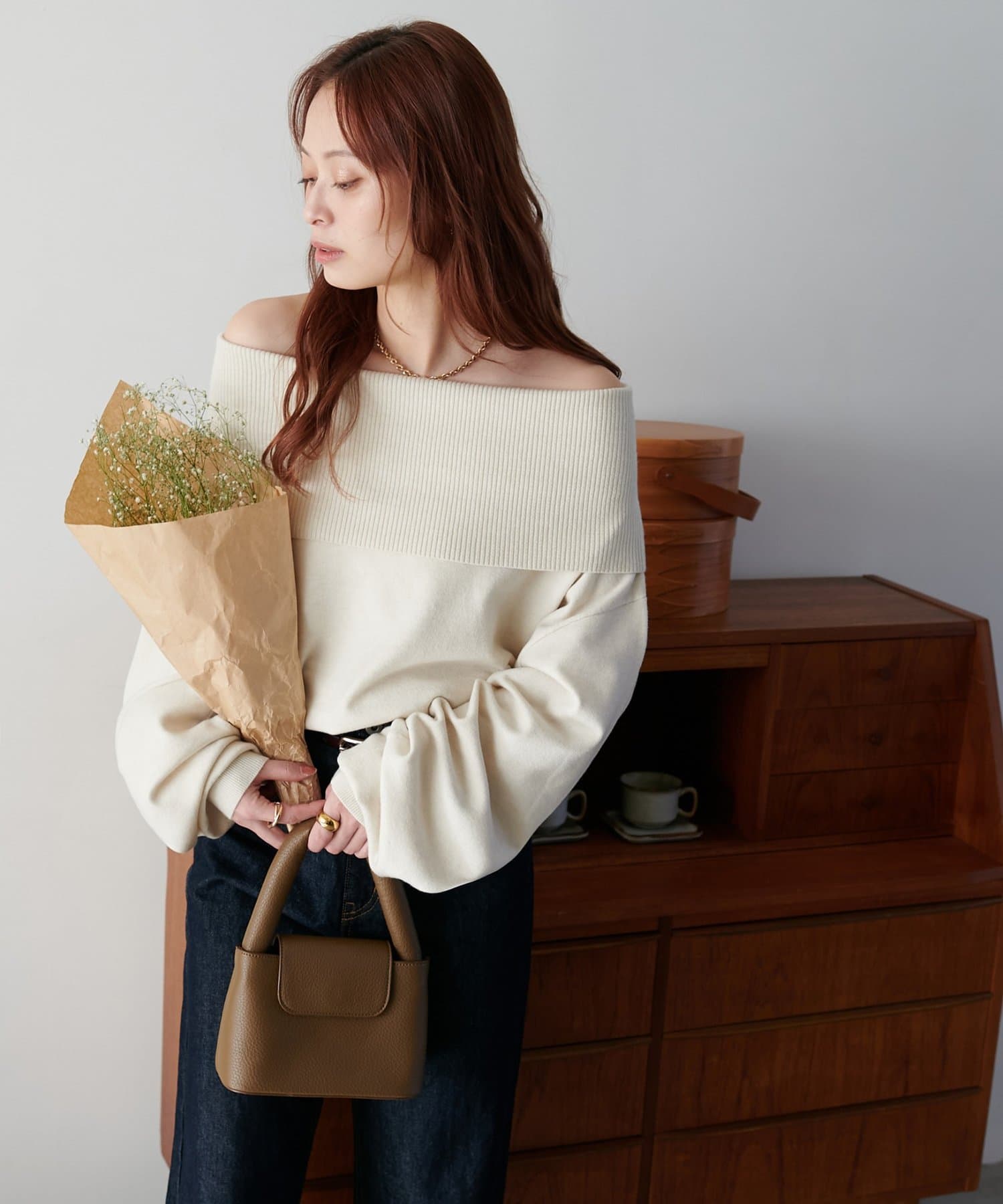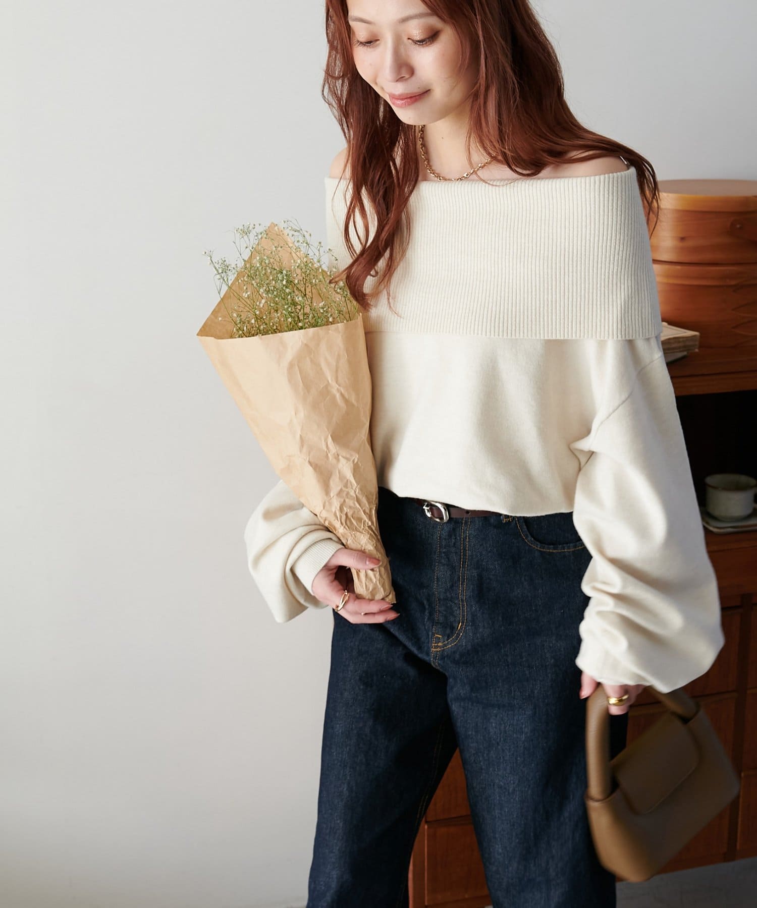 オフショル部分を大きめの折り返しデザインにしことで華奢に魅せ、リブ仕様にしたことで肩が落ちにくく安心感もあります。
