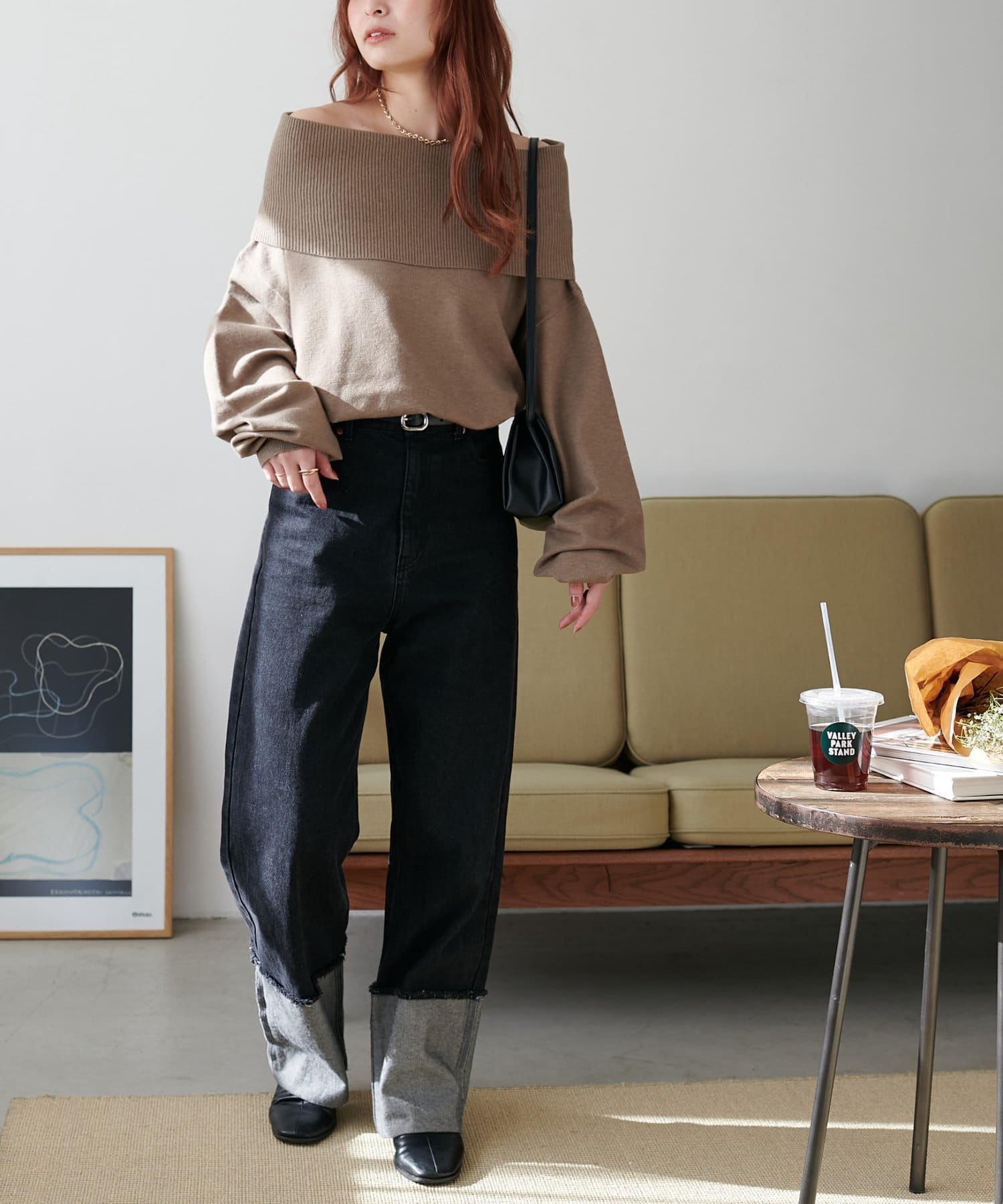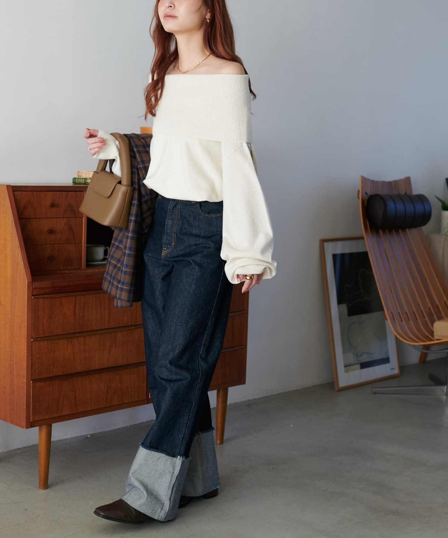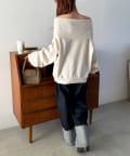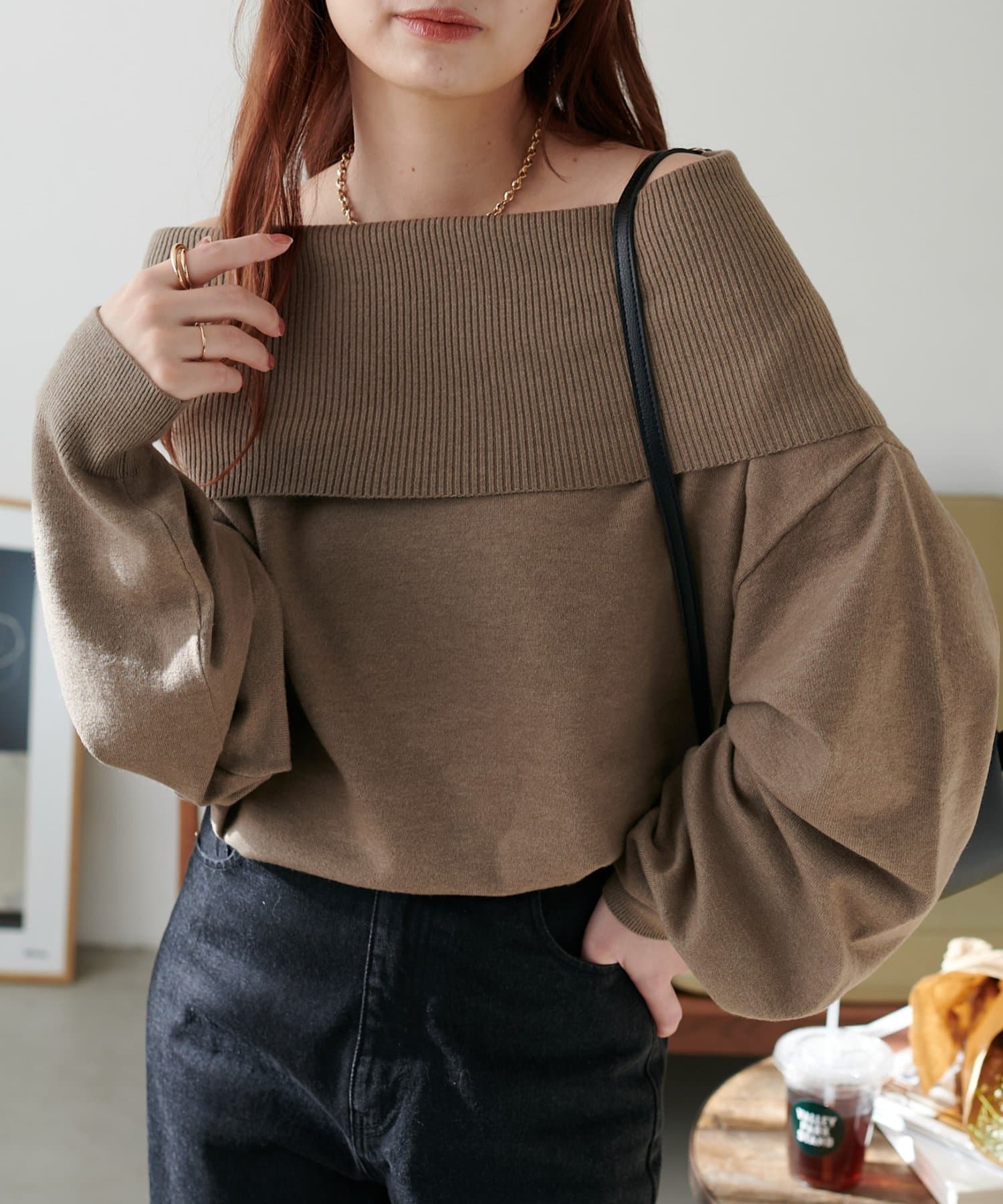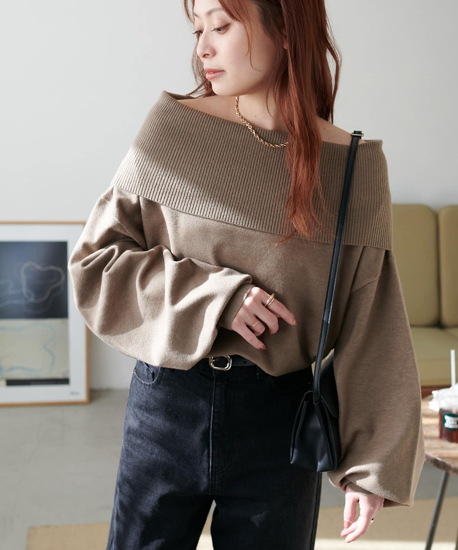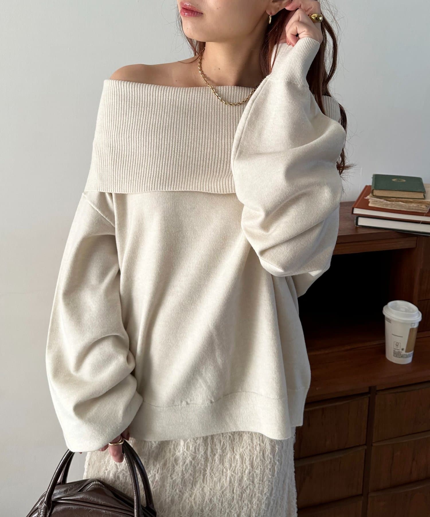 オフショル部分を大きめの折り返しデザインにしことで華奢に魅せ、リブ仕様にしたことで肩が落ちにくく安心感もあります。