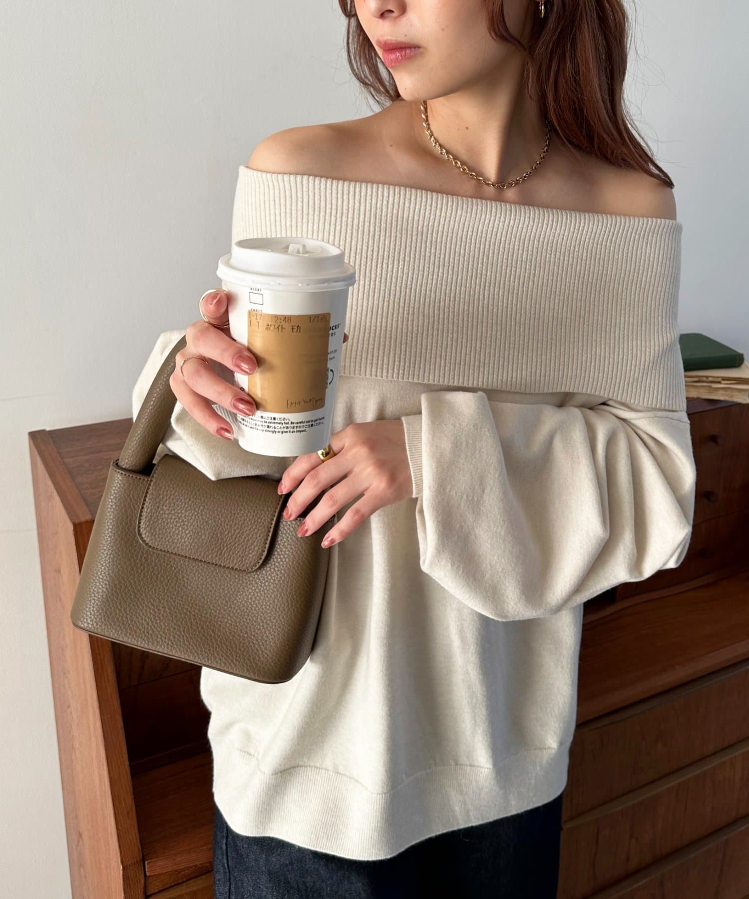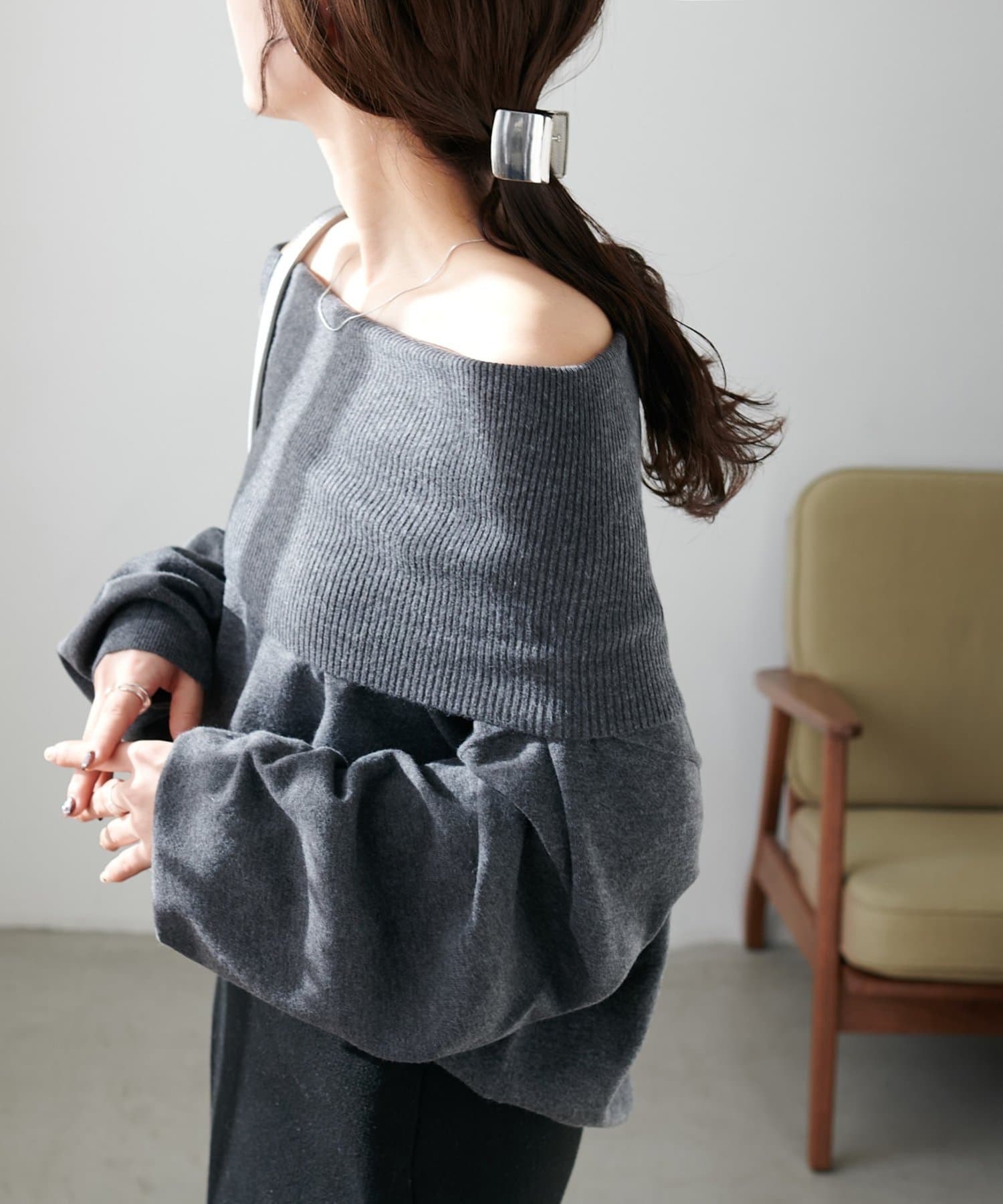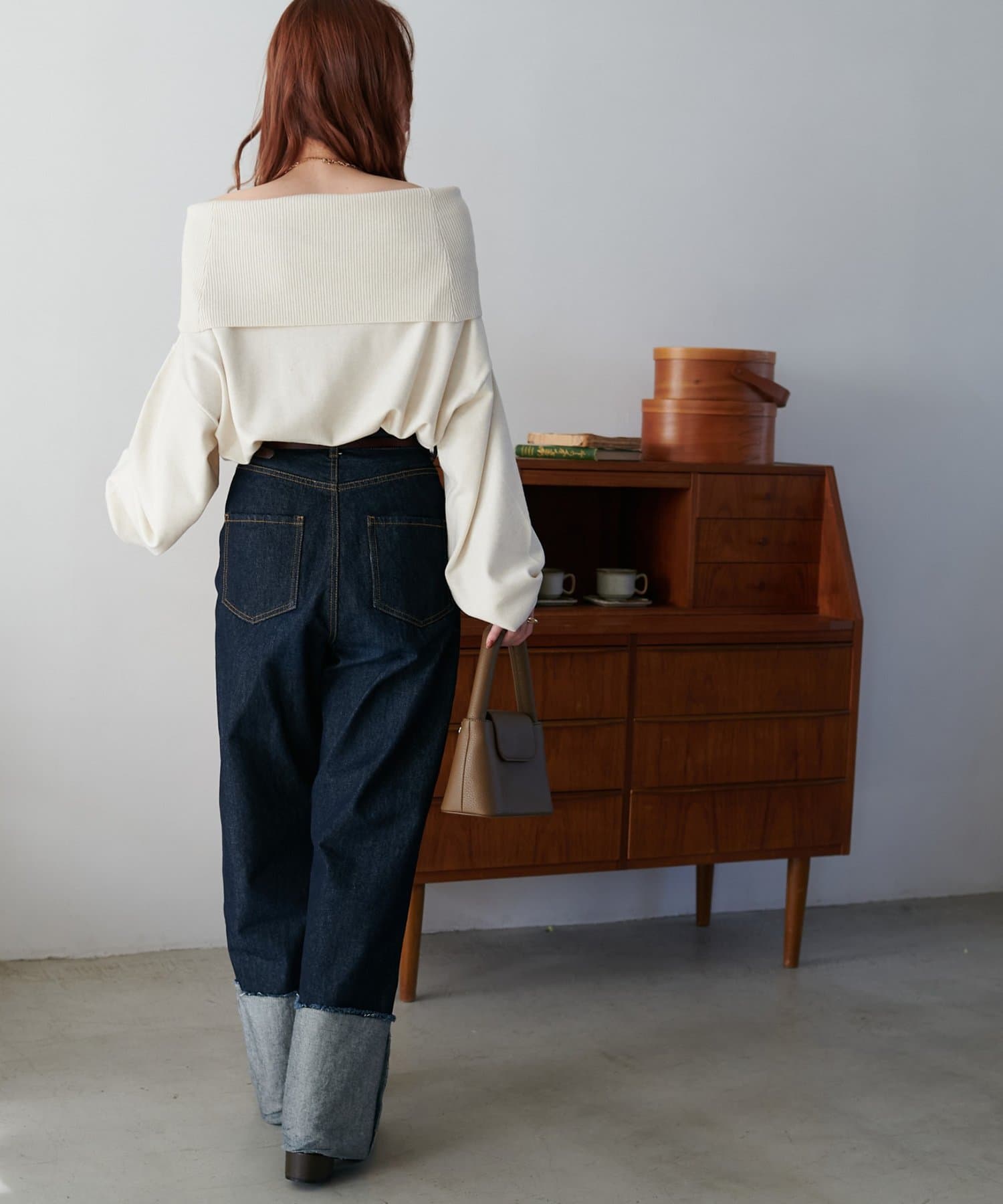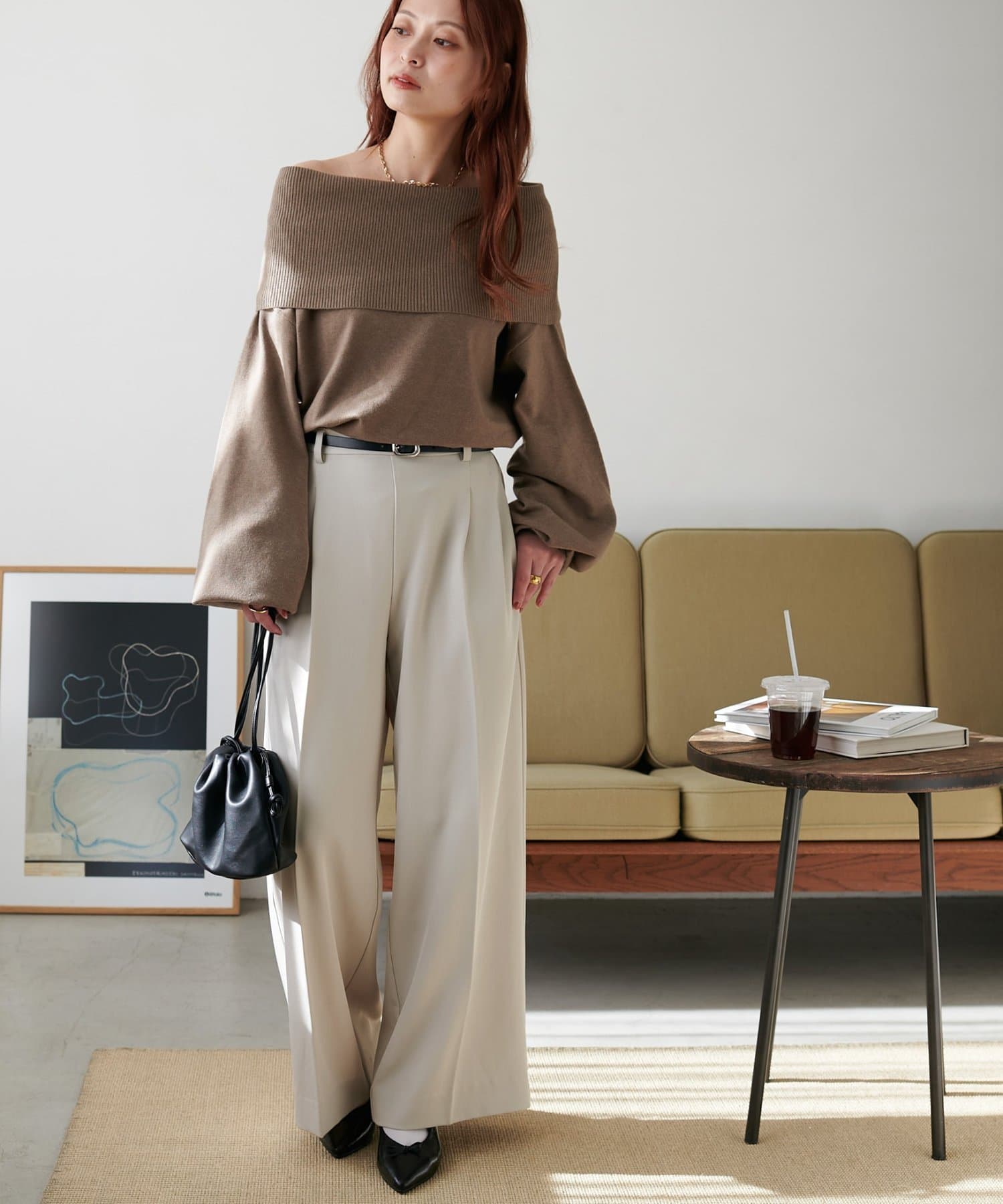 オフショル部分を大きめの折り返しデザインにしことで華奢に魅せ、リブ仕様にしたことで肩が落ちにくく安心感もあります。