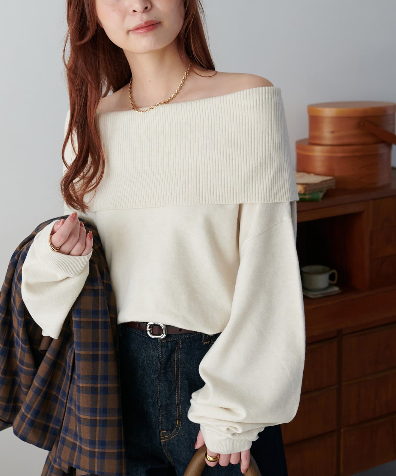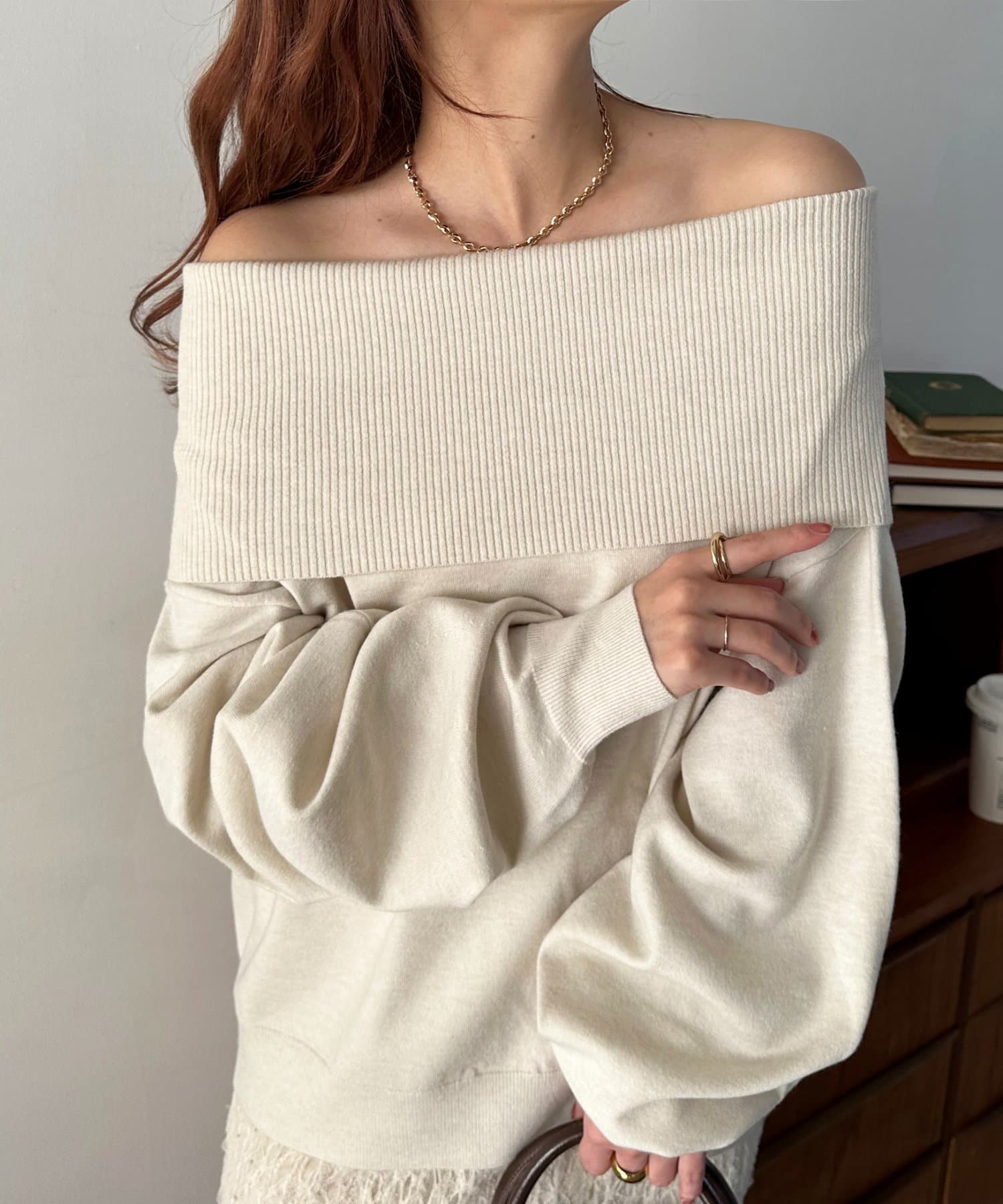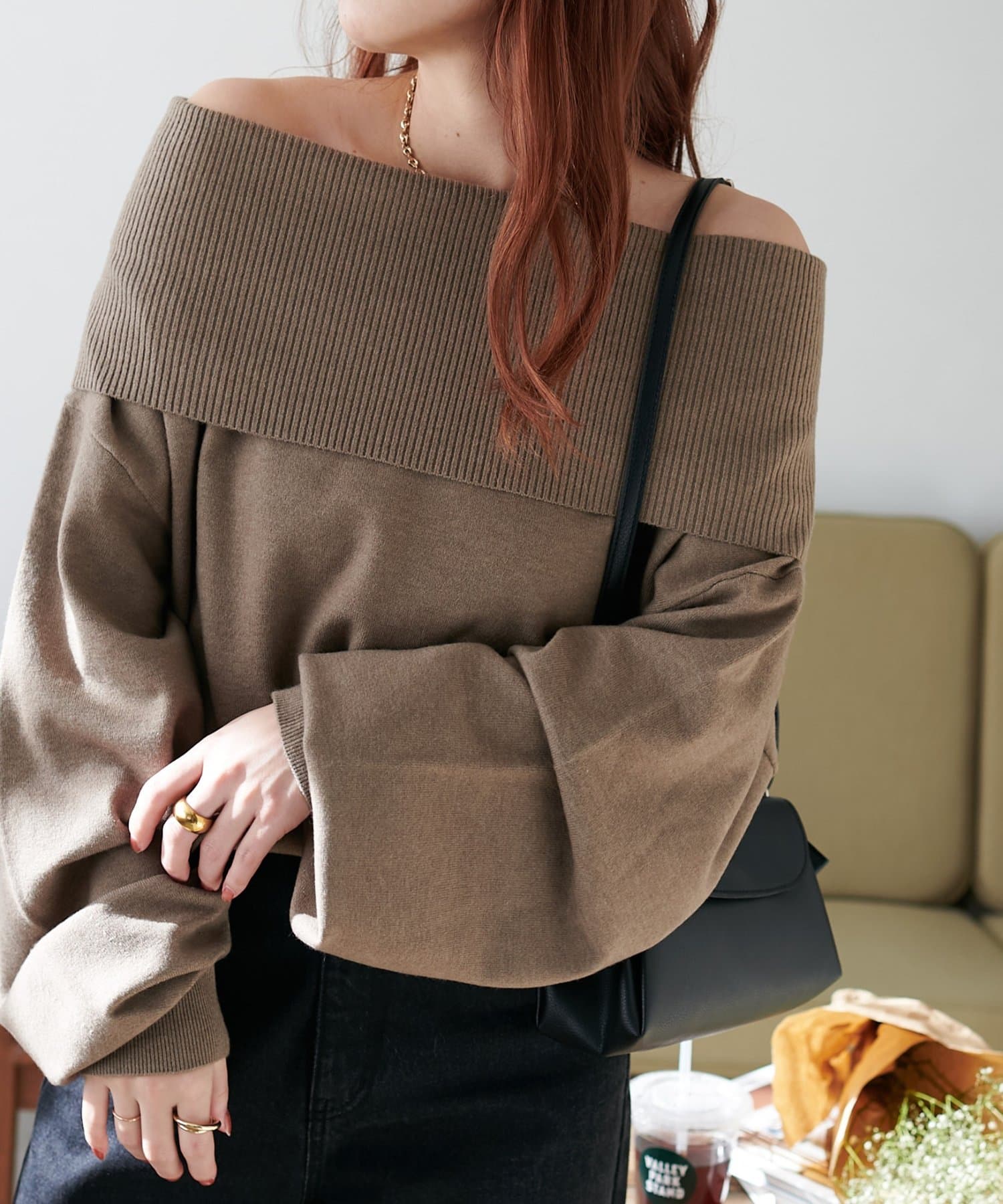 オフショルデザインでデコルテを美しく魅せ、女性らしさを引き出してくれるニット。