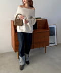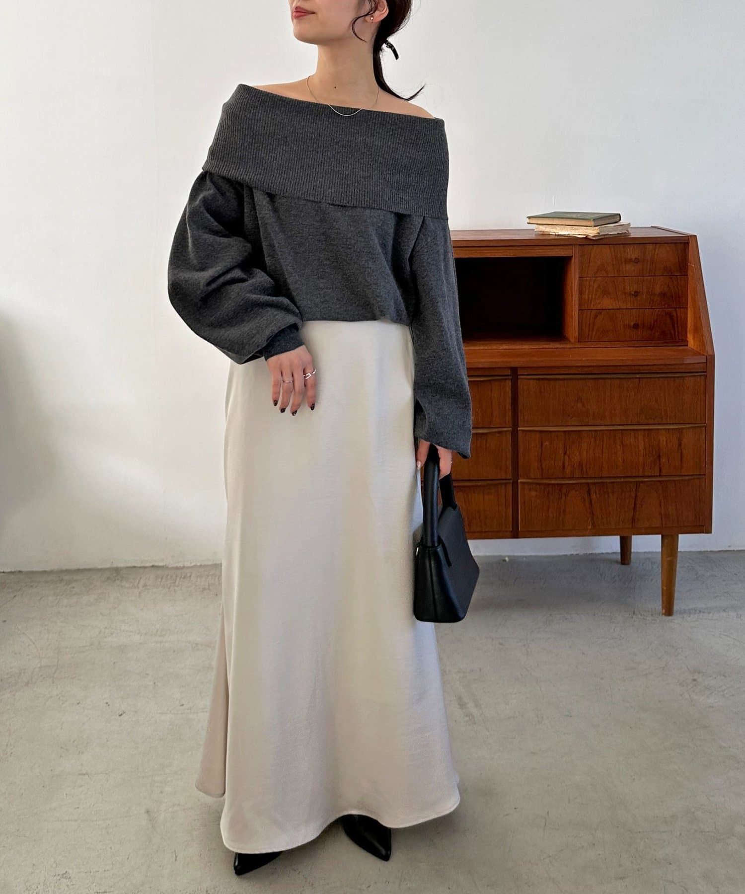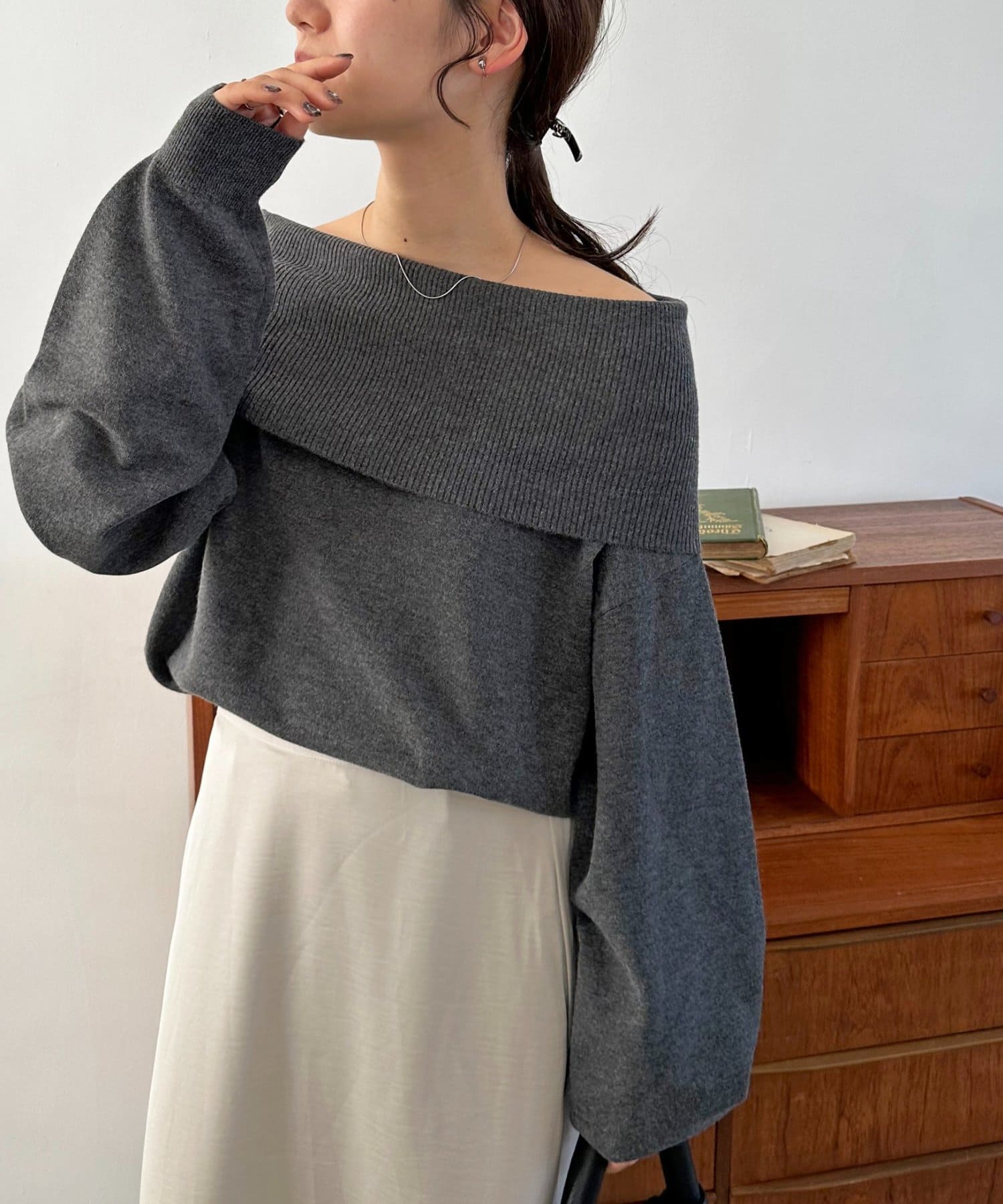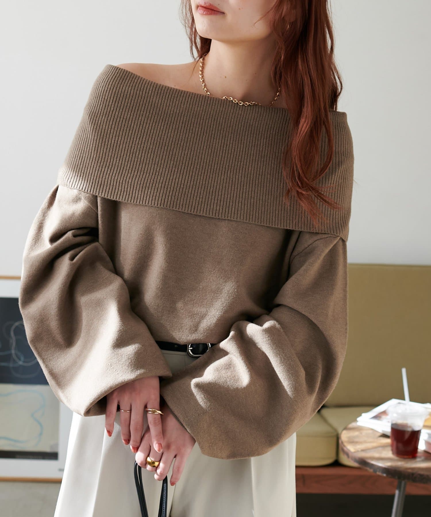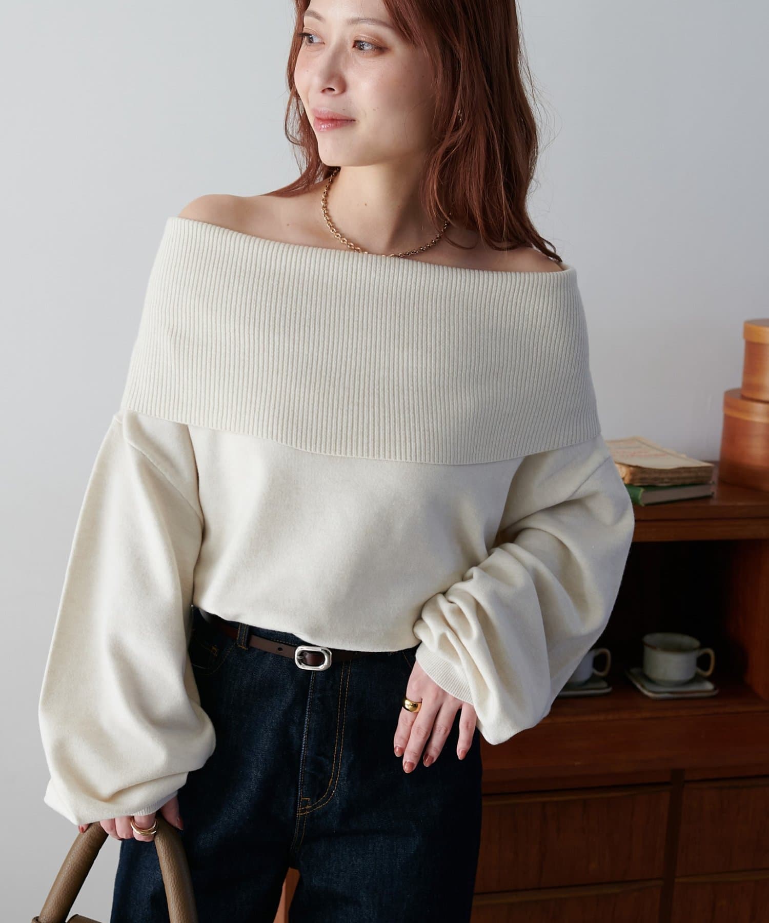 オフショルデザインでデコルテを美しく魅せ、女性らしさを引き出してくれるニット。