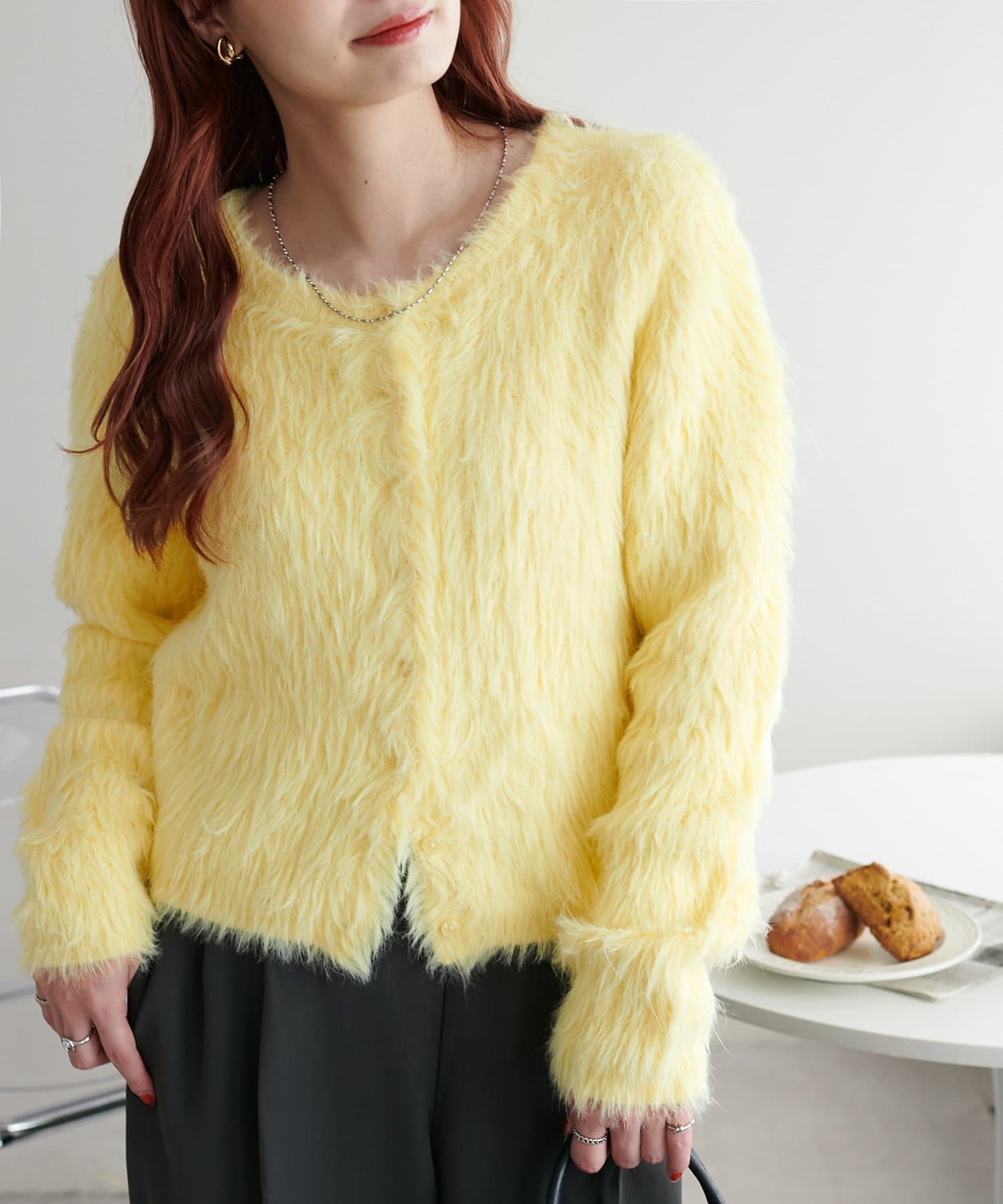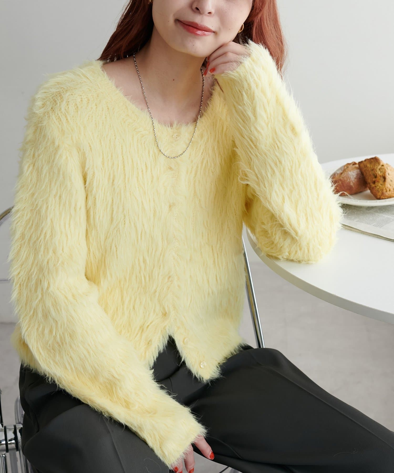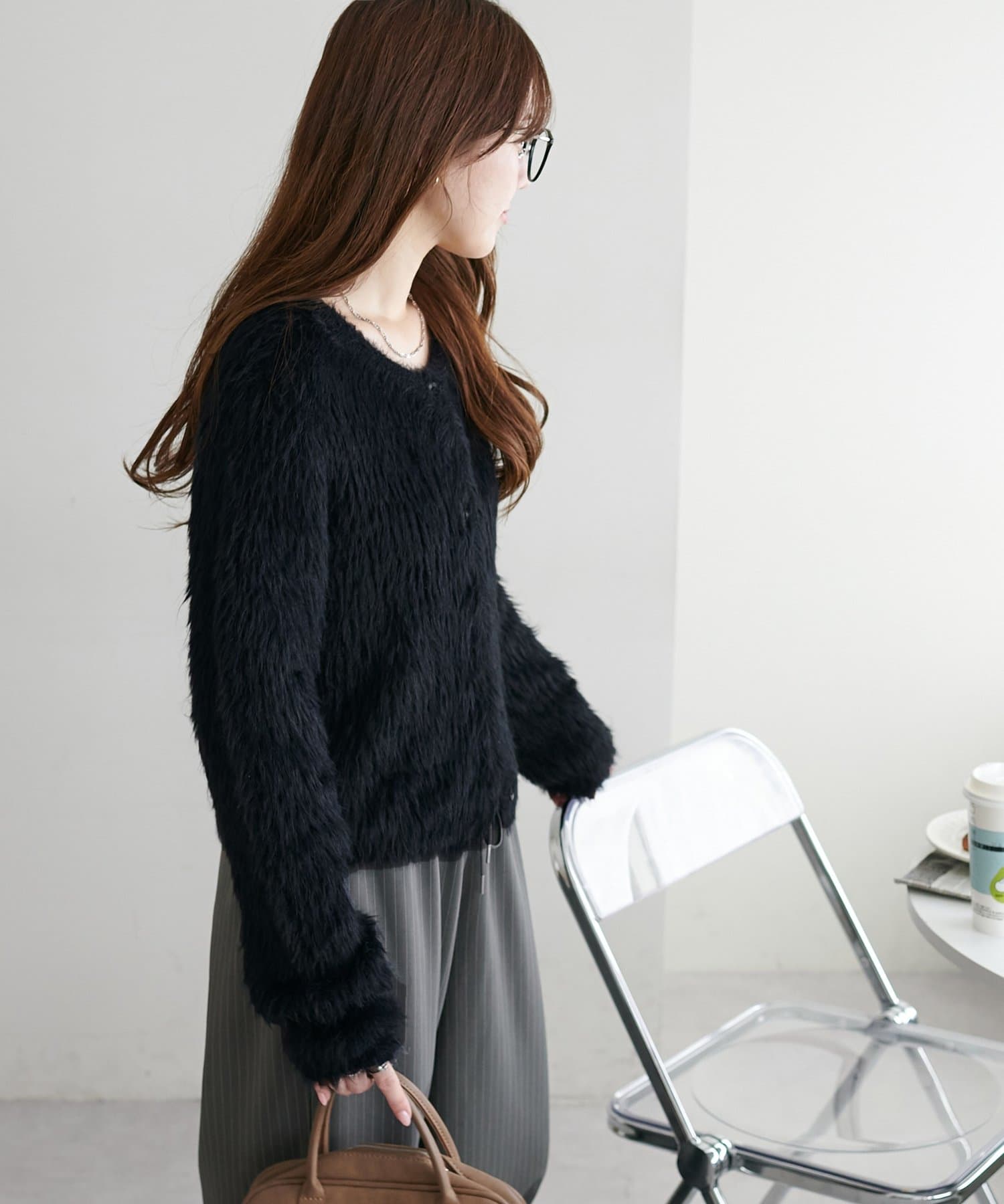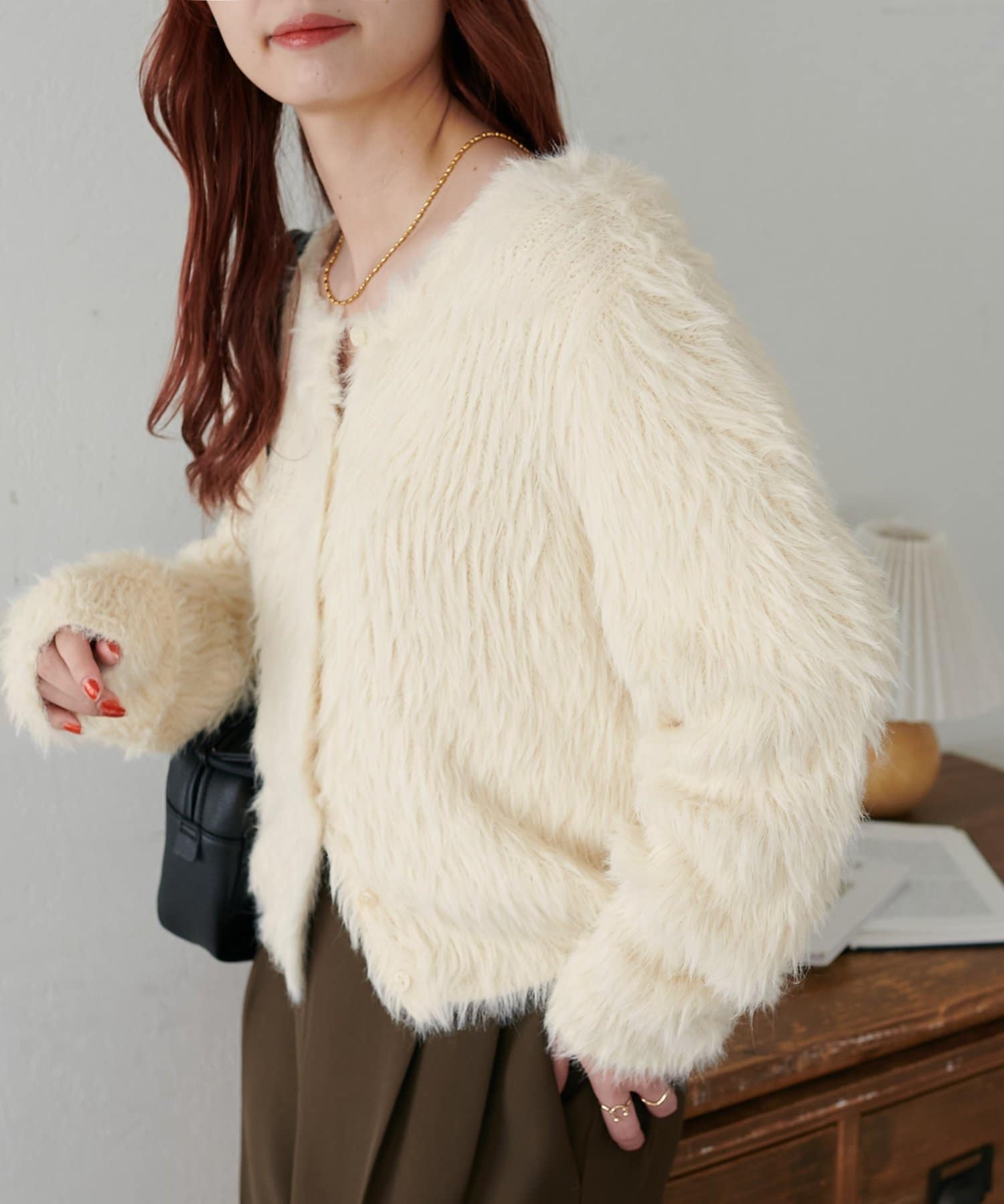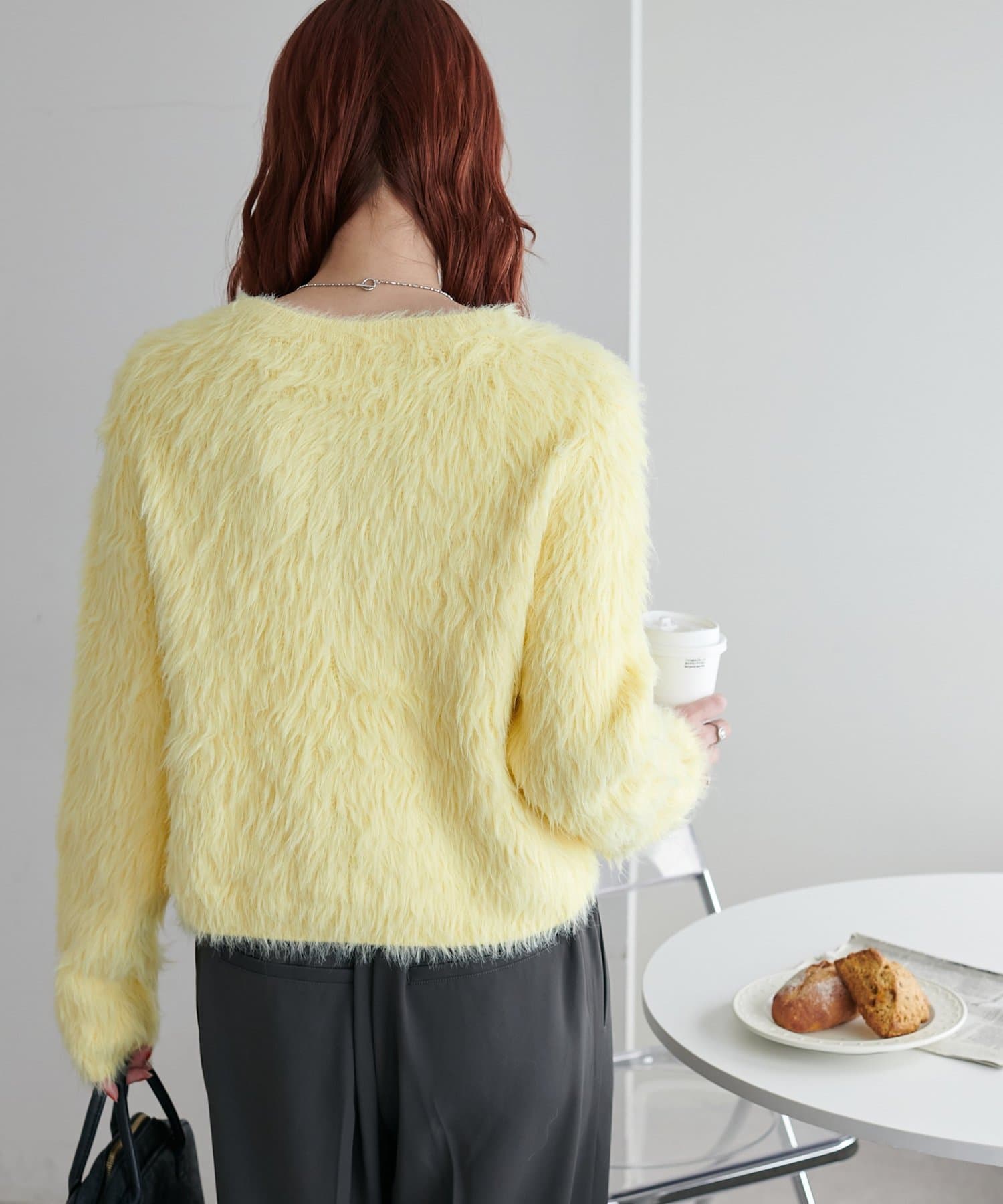 全体に毛足の長いロングフェザーヤーンを贅沢に使用した、ふんわりとした質感が魅力のカーディガン。