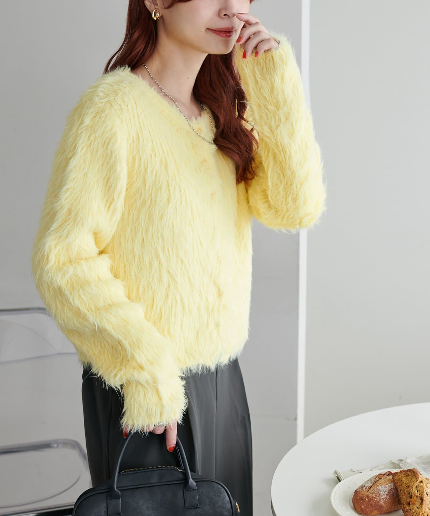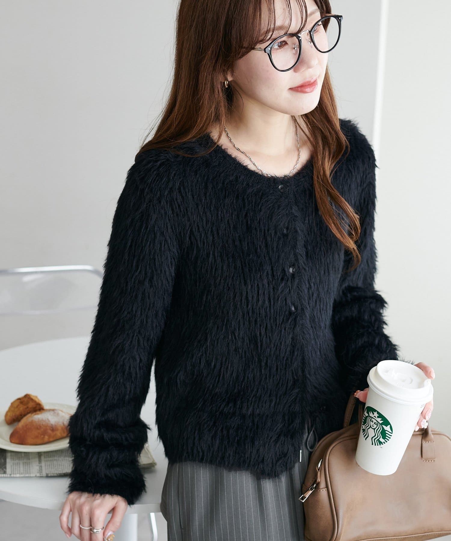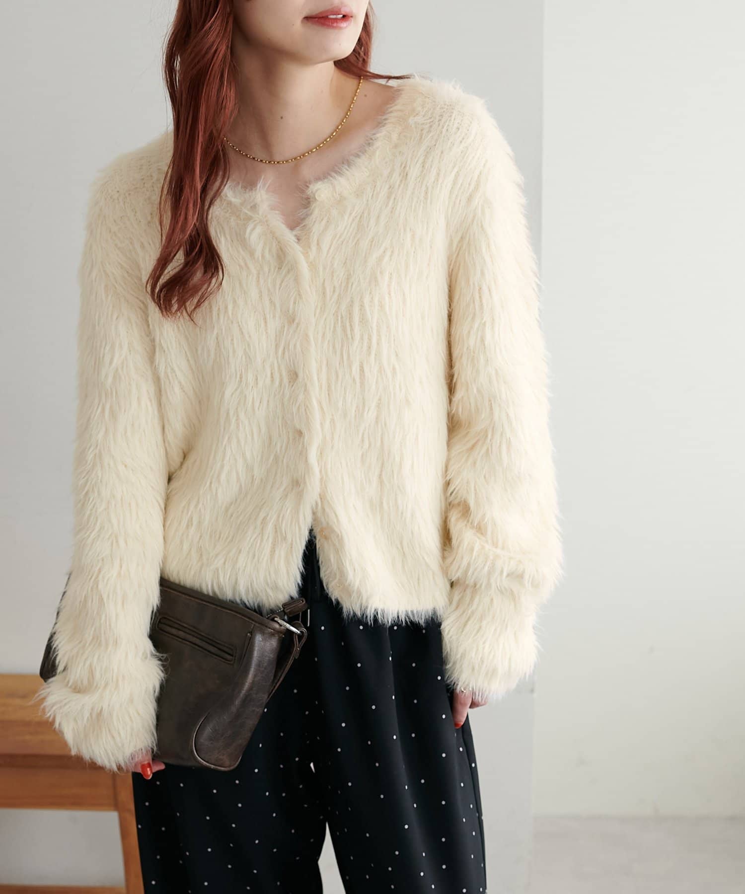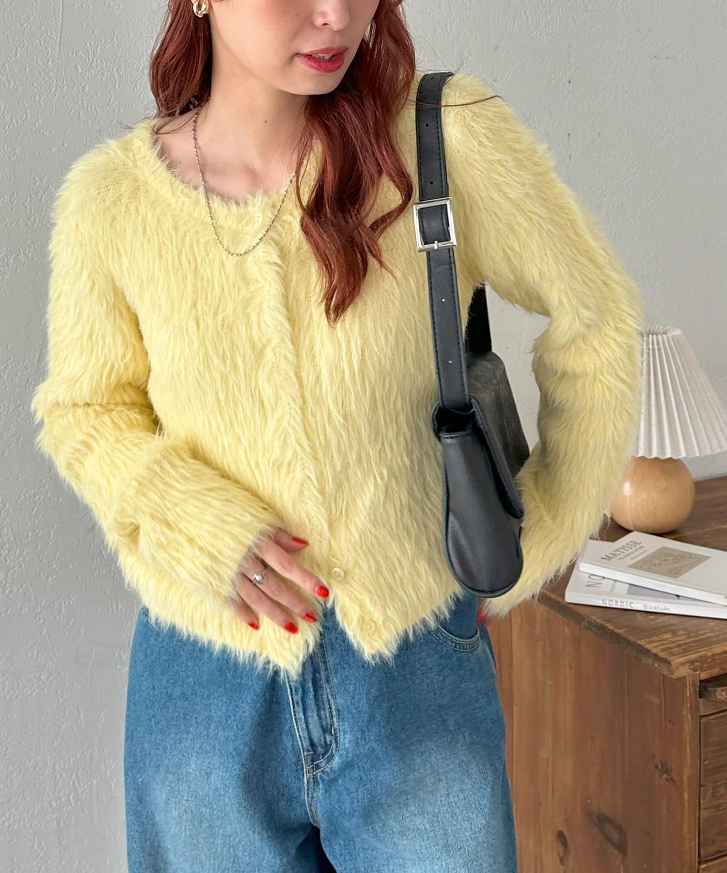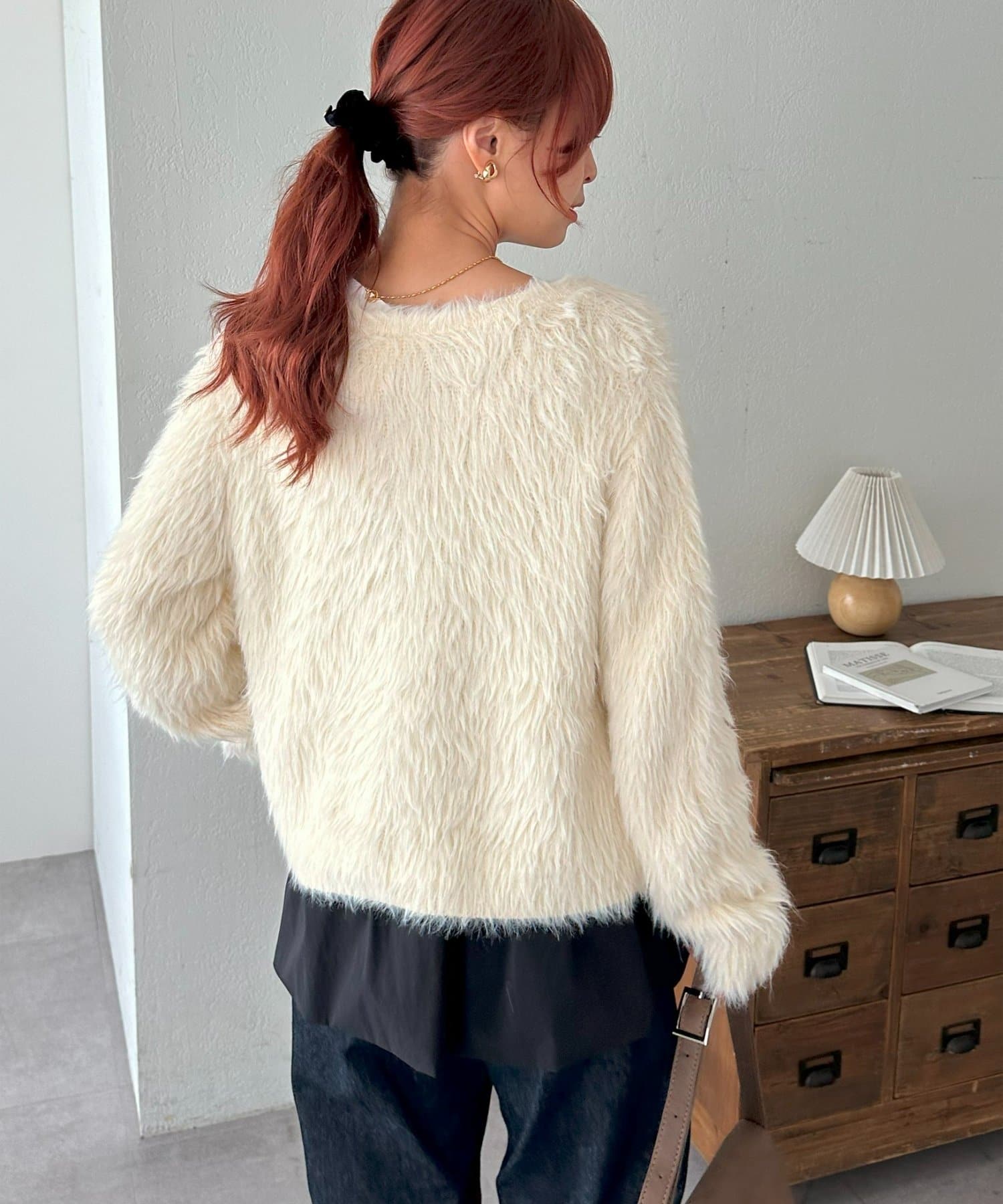全体に毛足の長いロングフェザーヤーンを贅沢に使用した、ふんわりとした質感が魅力のカーディガン。