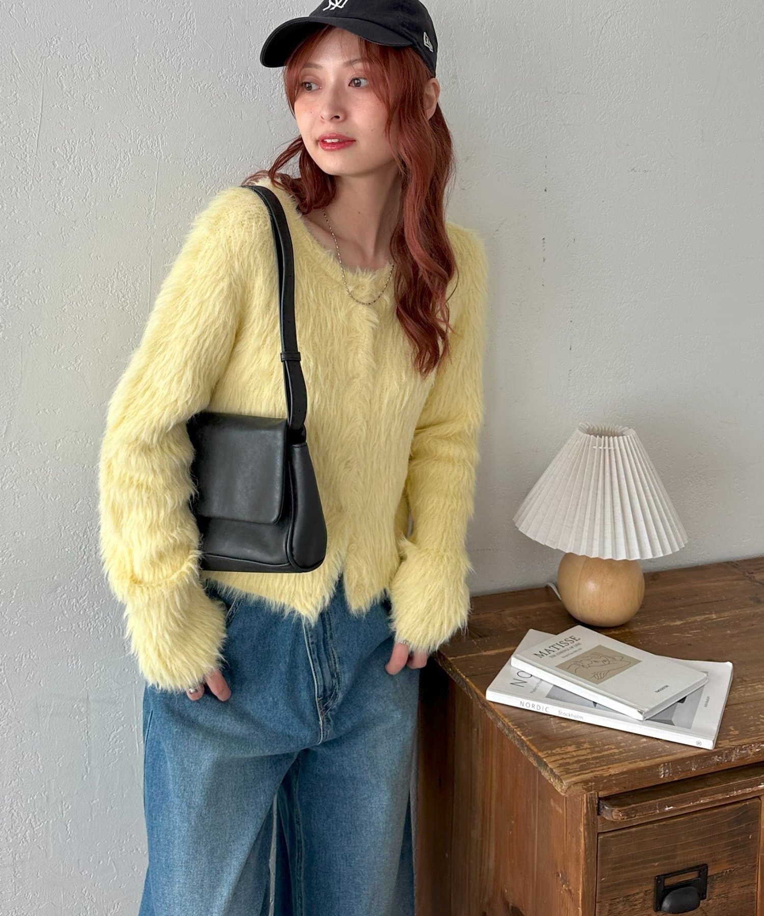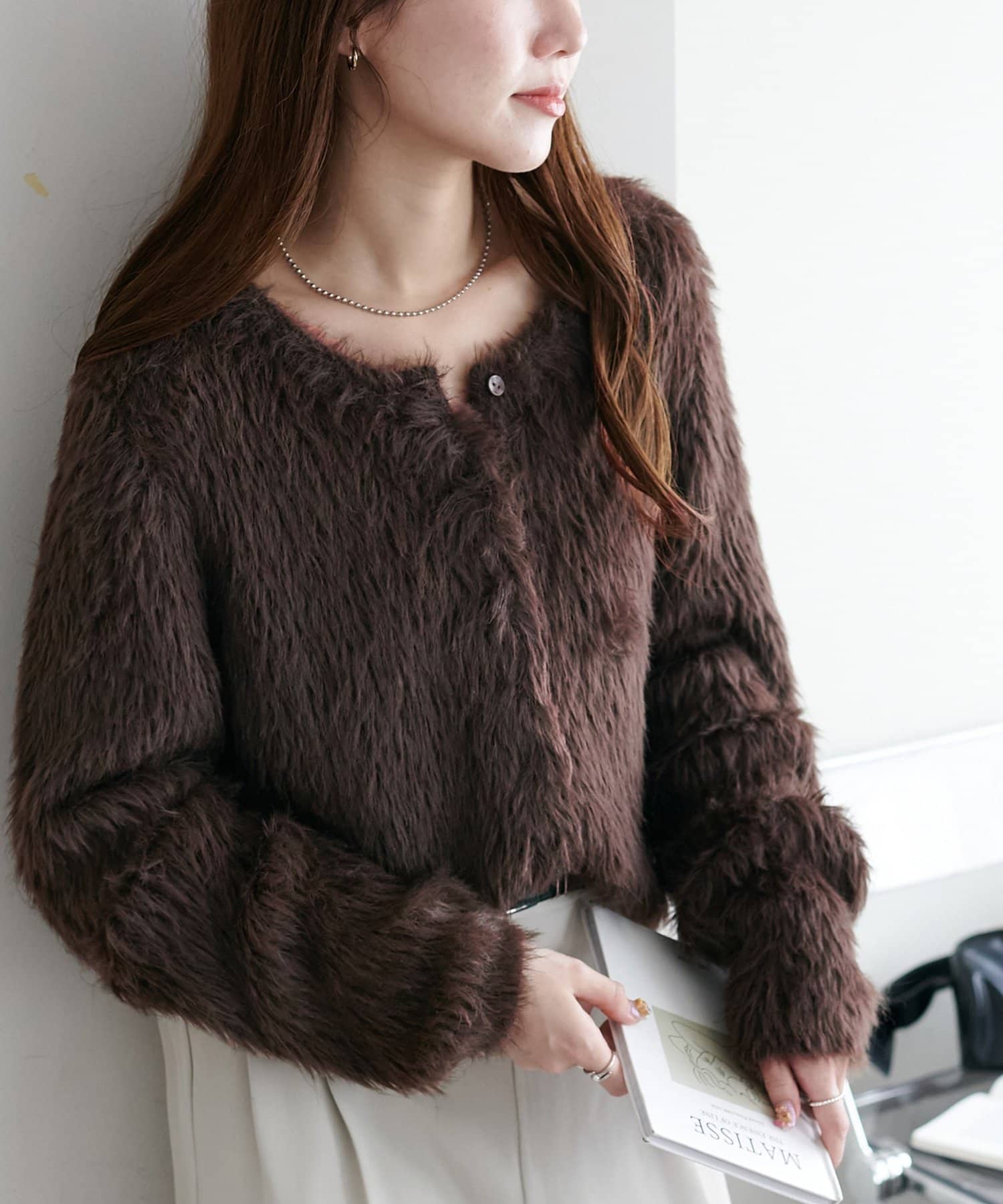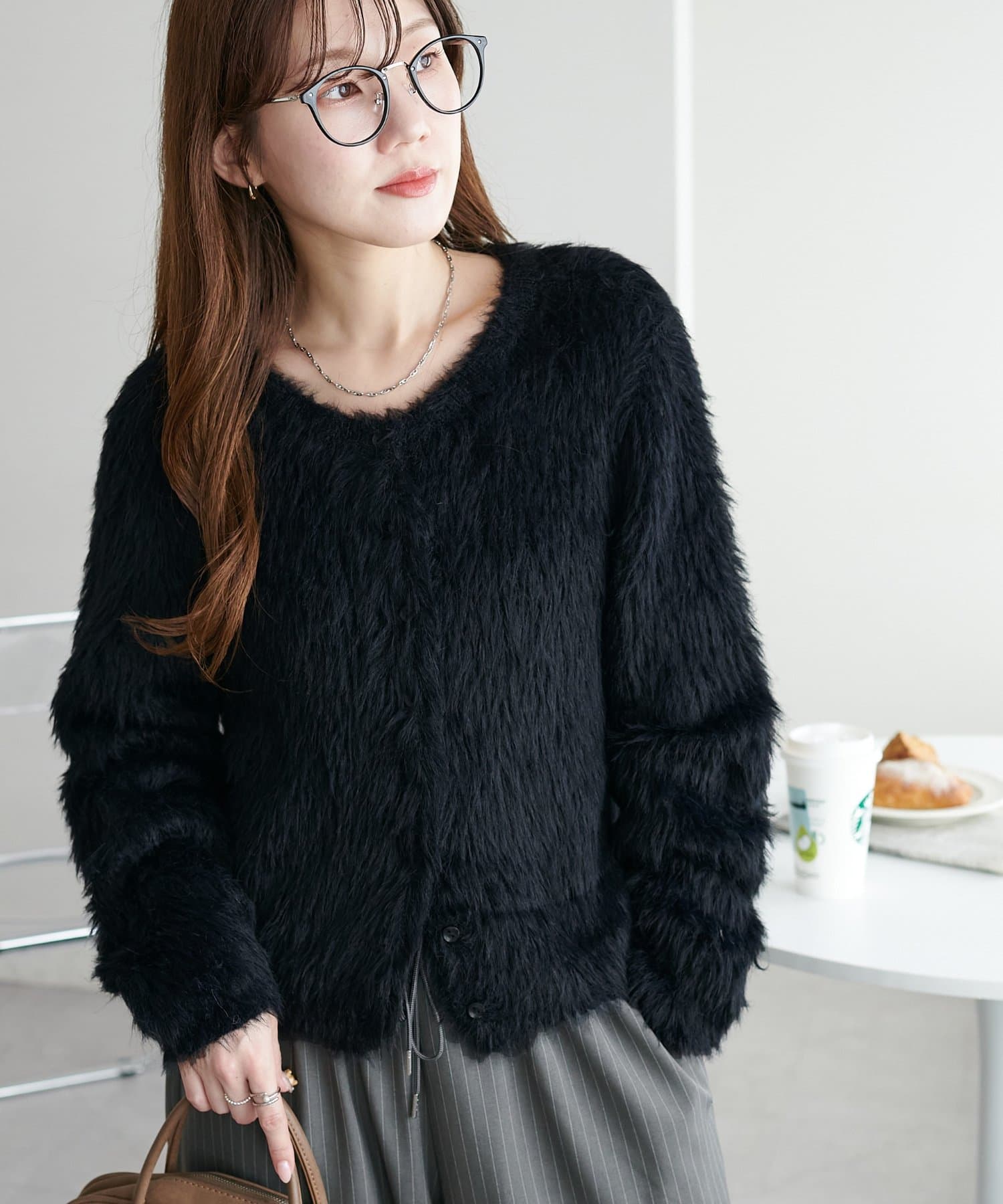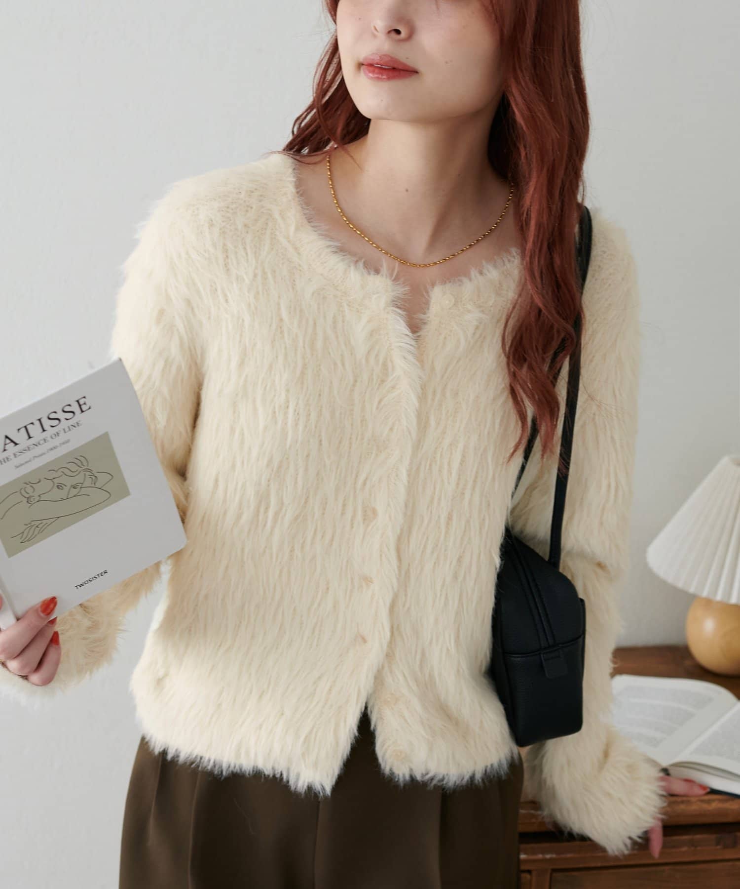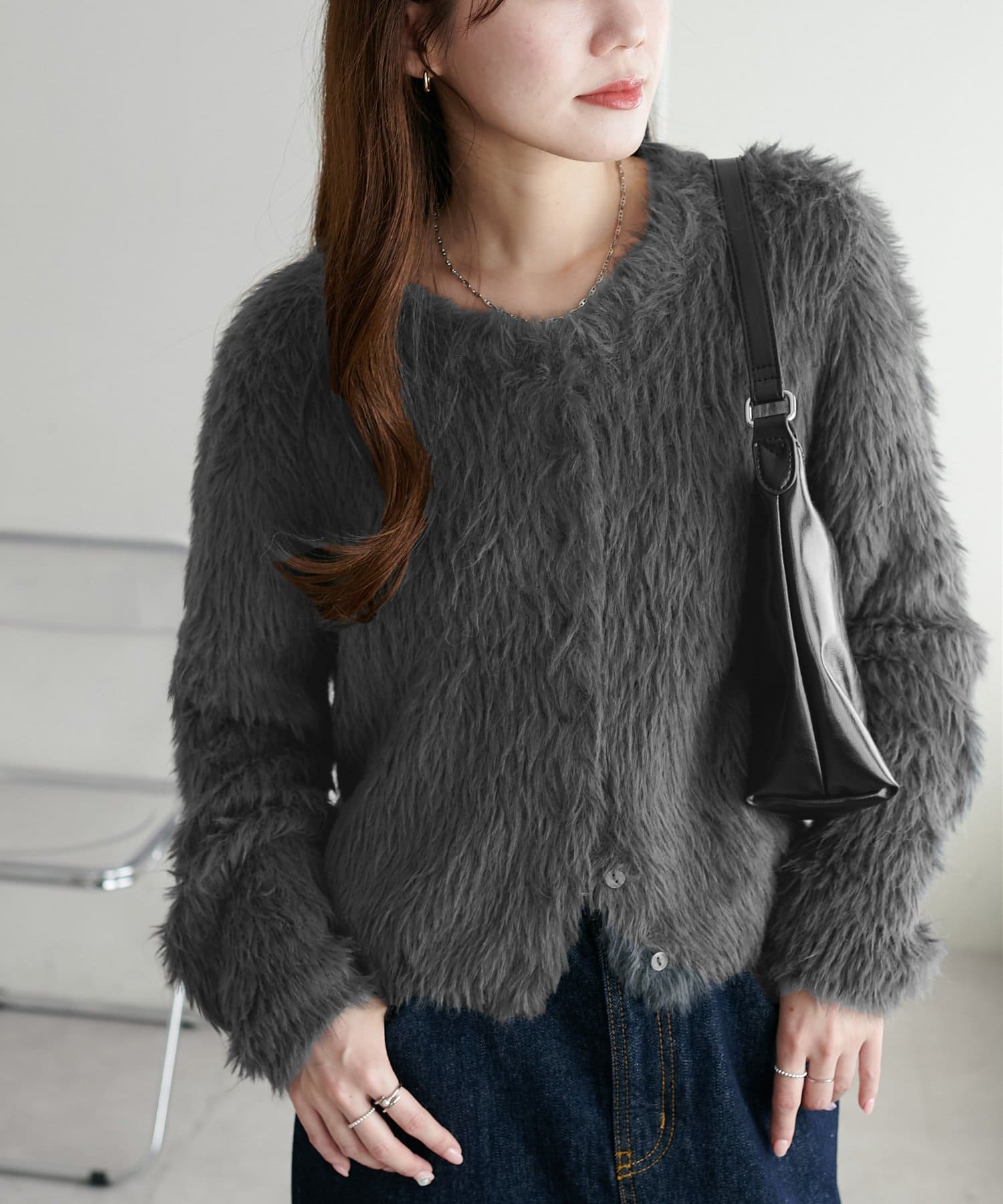 全体に毛足の長いロングフェザーヤーンを贅沢に使用した、ふんわりとした質感が魅力のカーディガン。
