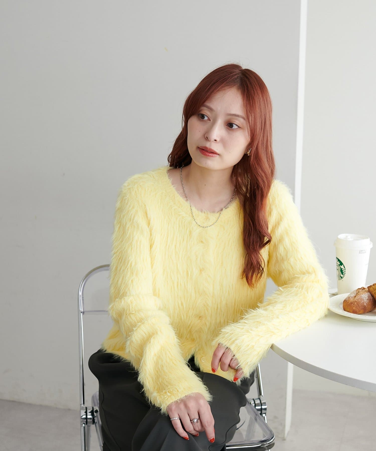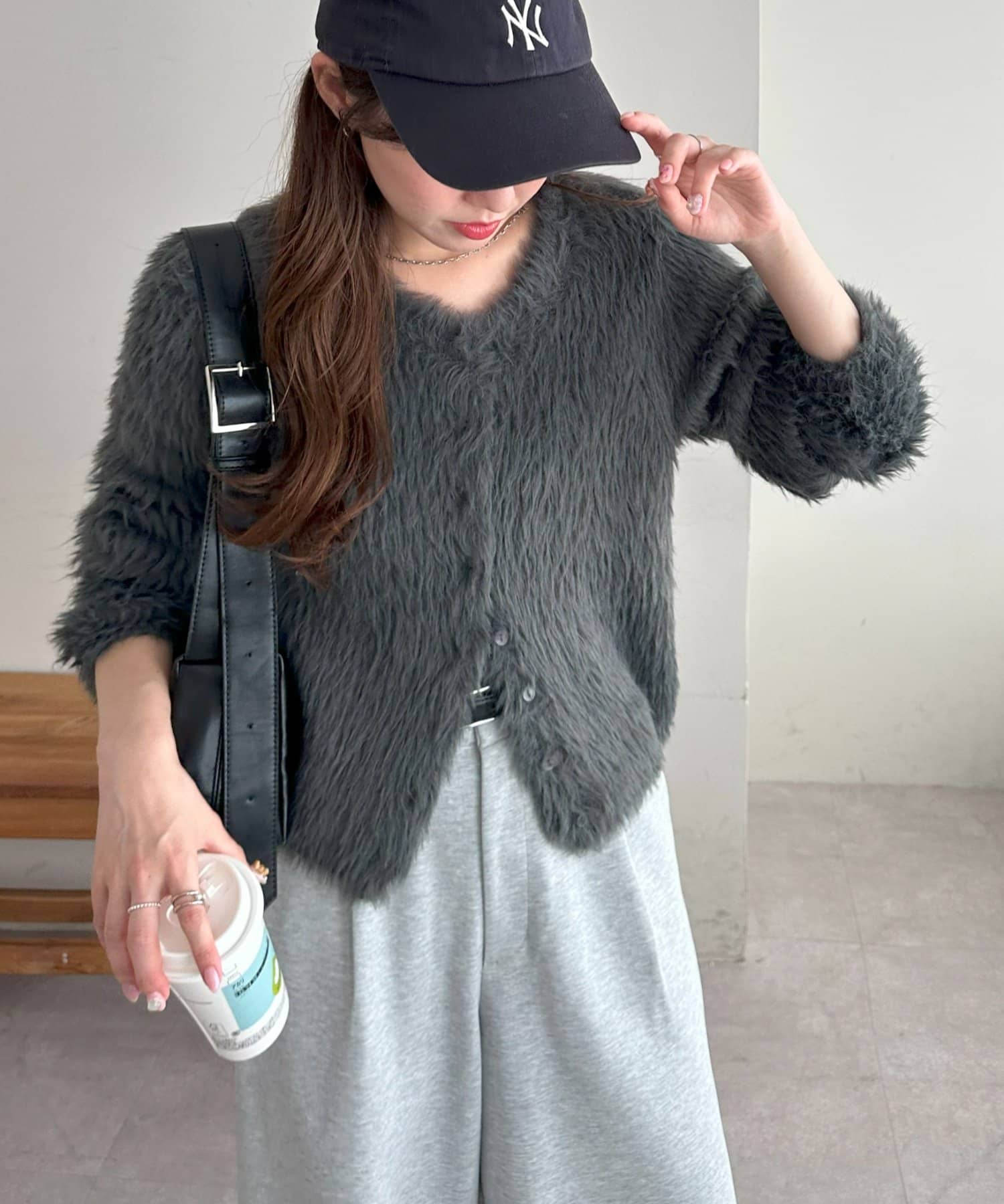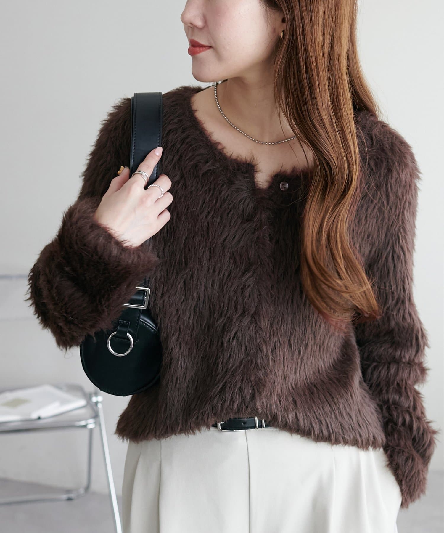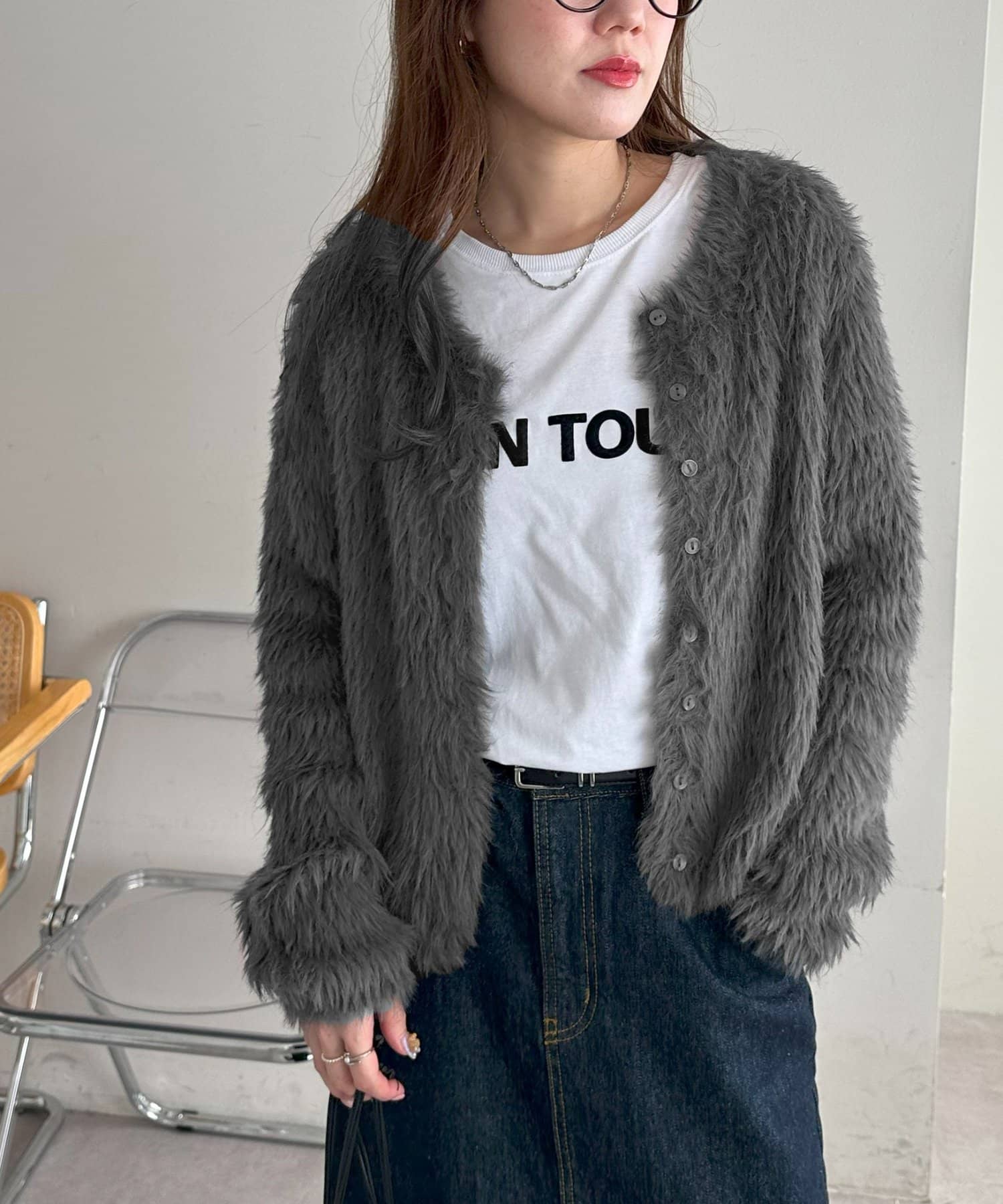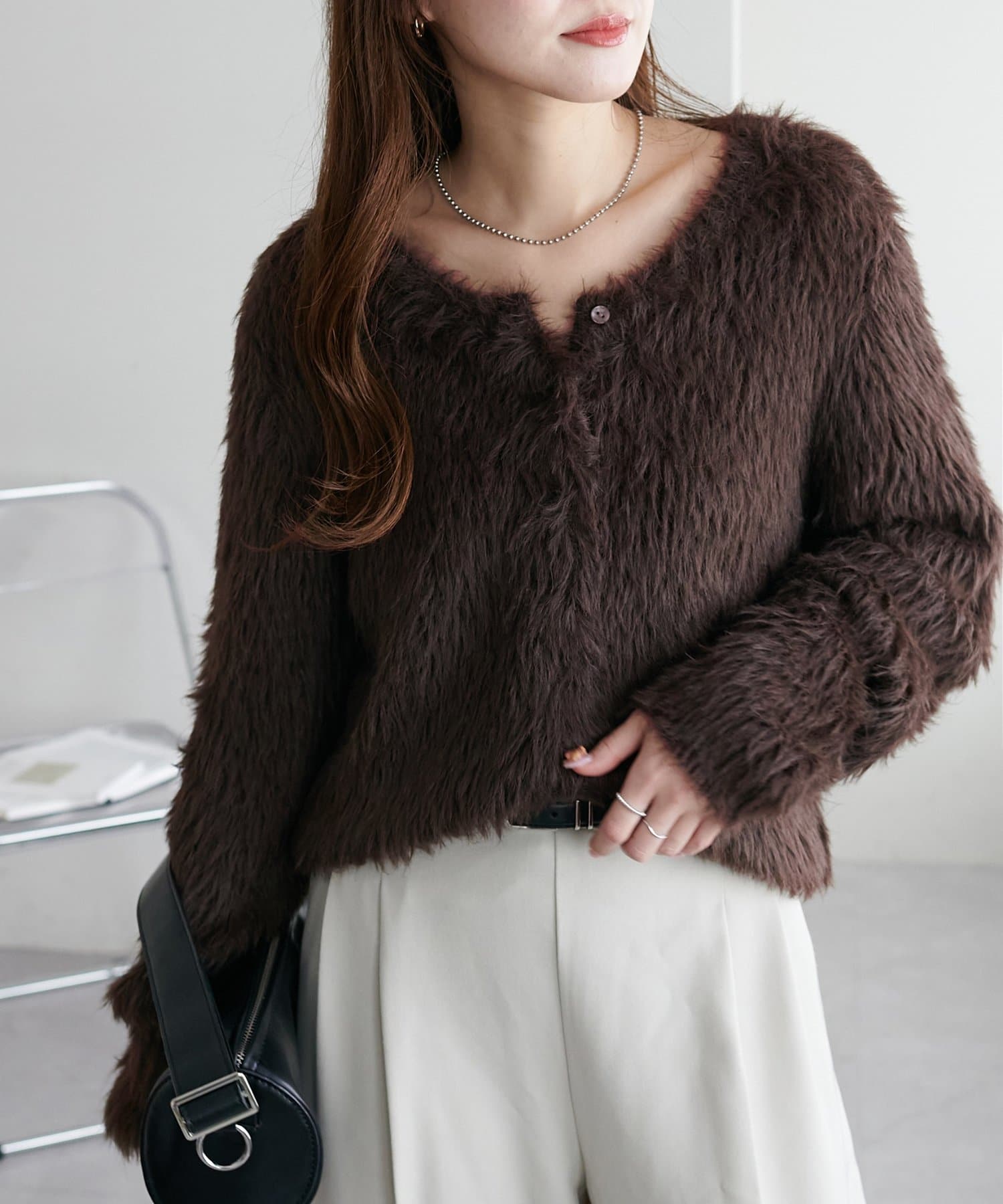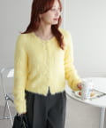 全体に毛足の長いロングフェザーヤーンを贅沢に使用した、ふんわりとした質感が魅力のカーディガン。