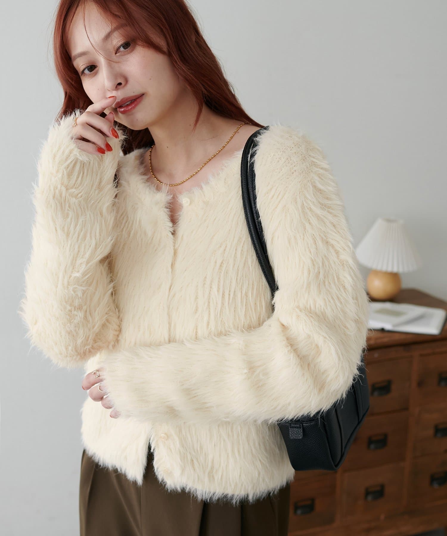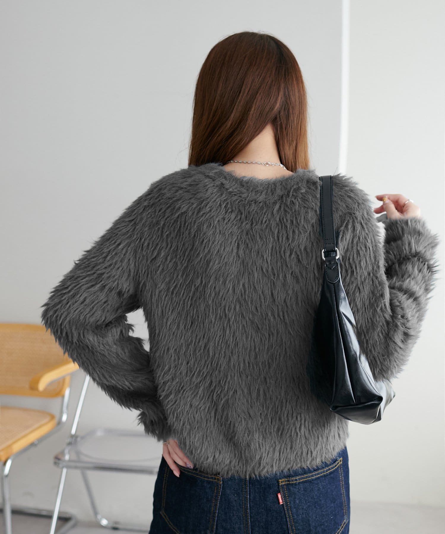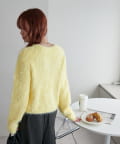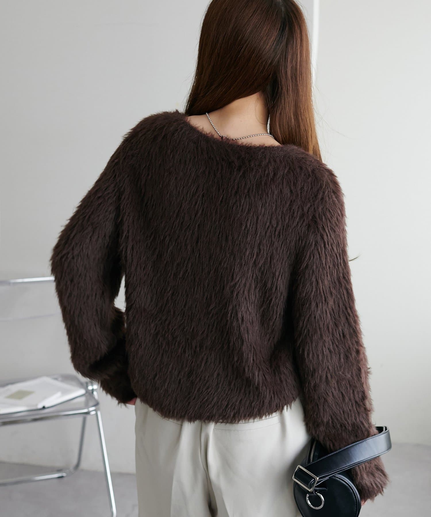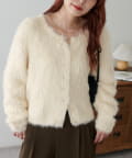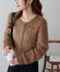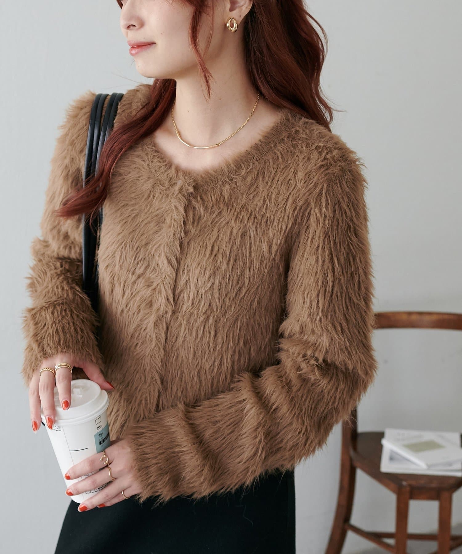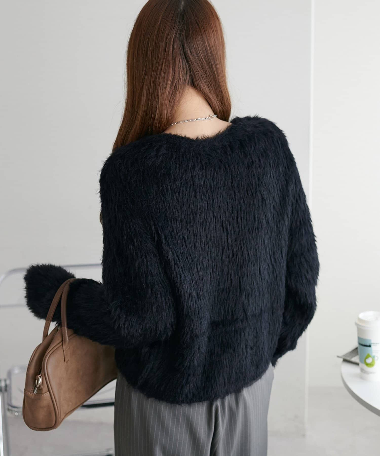 全体に毛足の長いロングフェザーヤーンを贅沢に使用した、ふんわりとした質感が魅力のカーディガン。