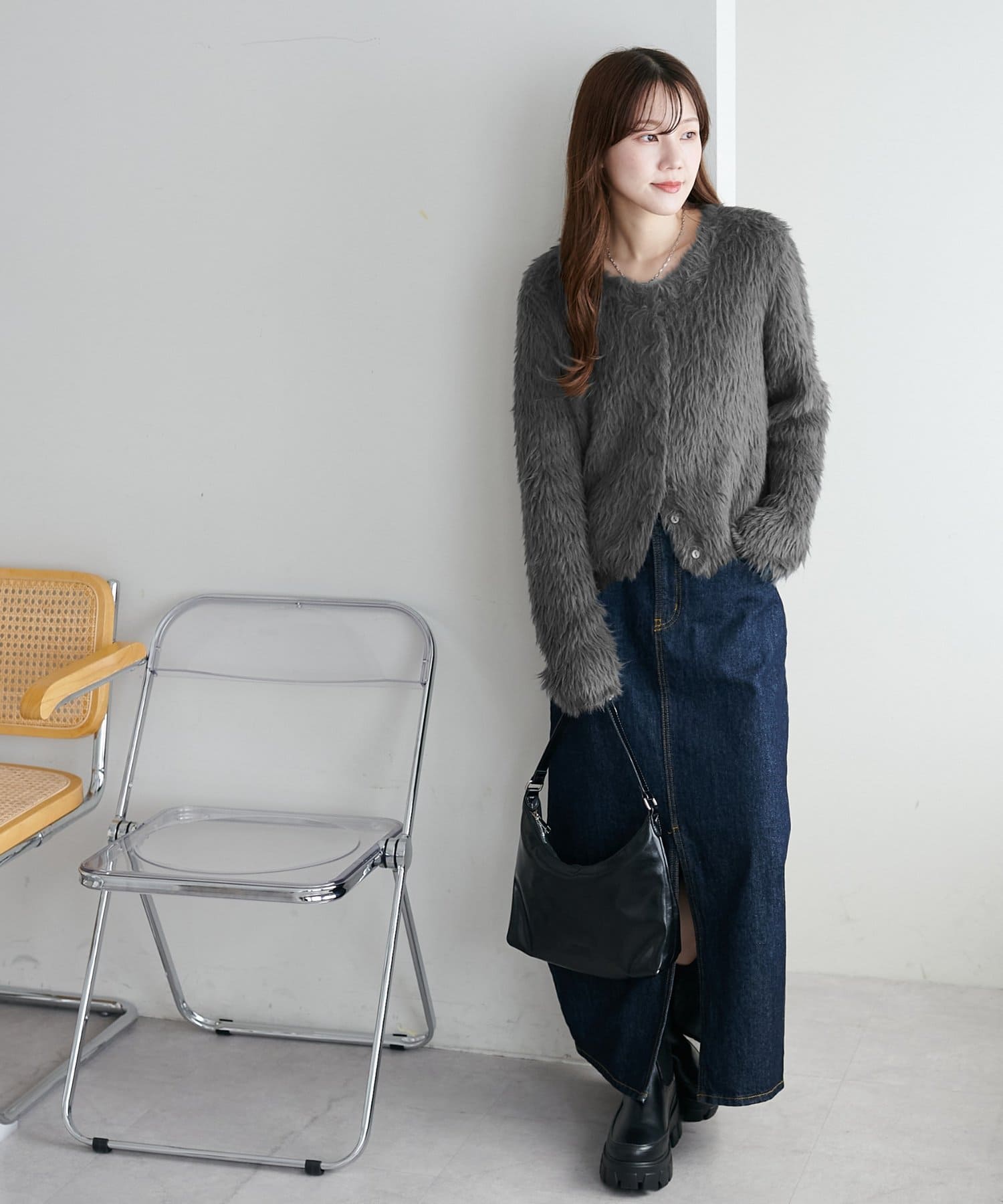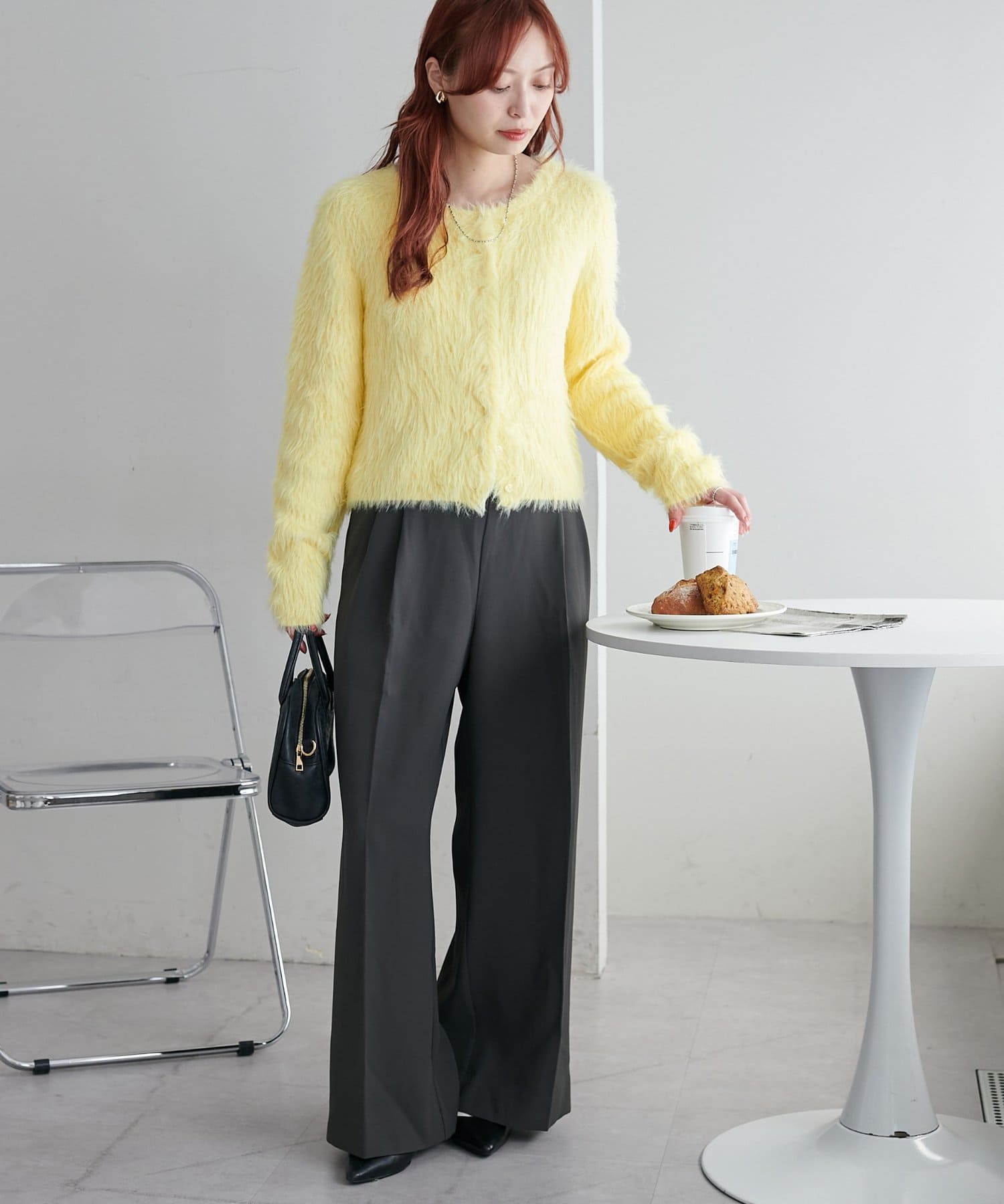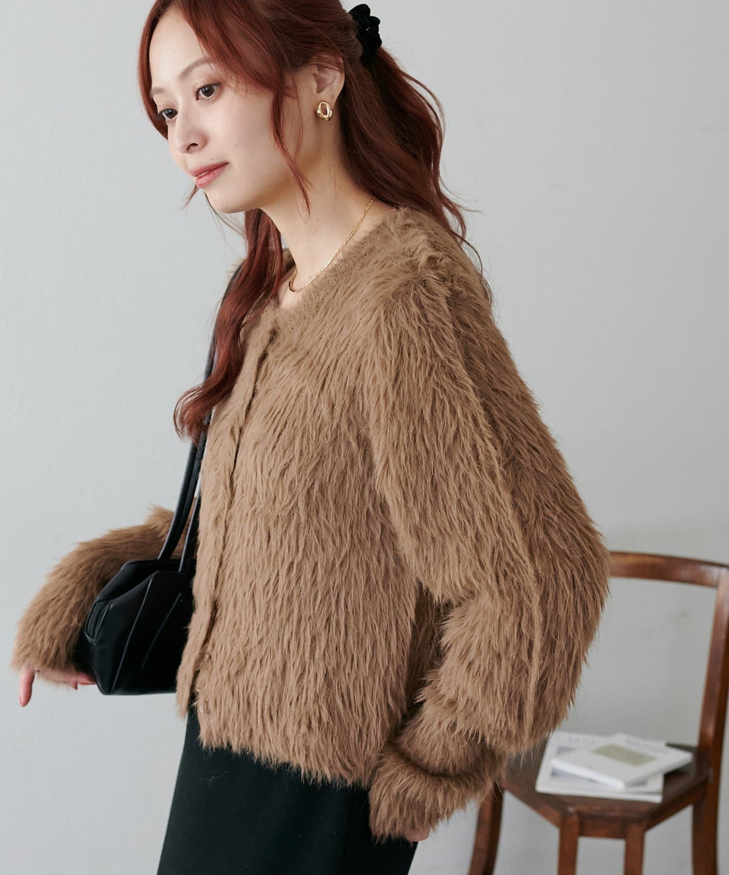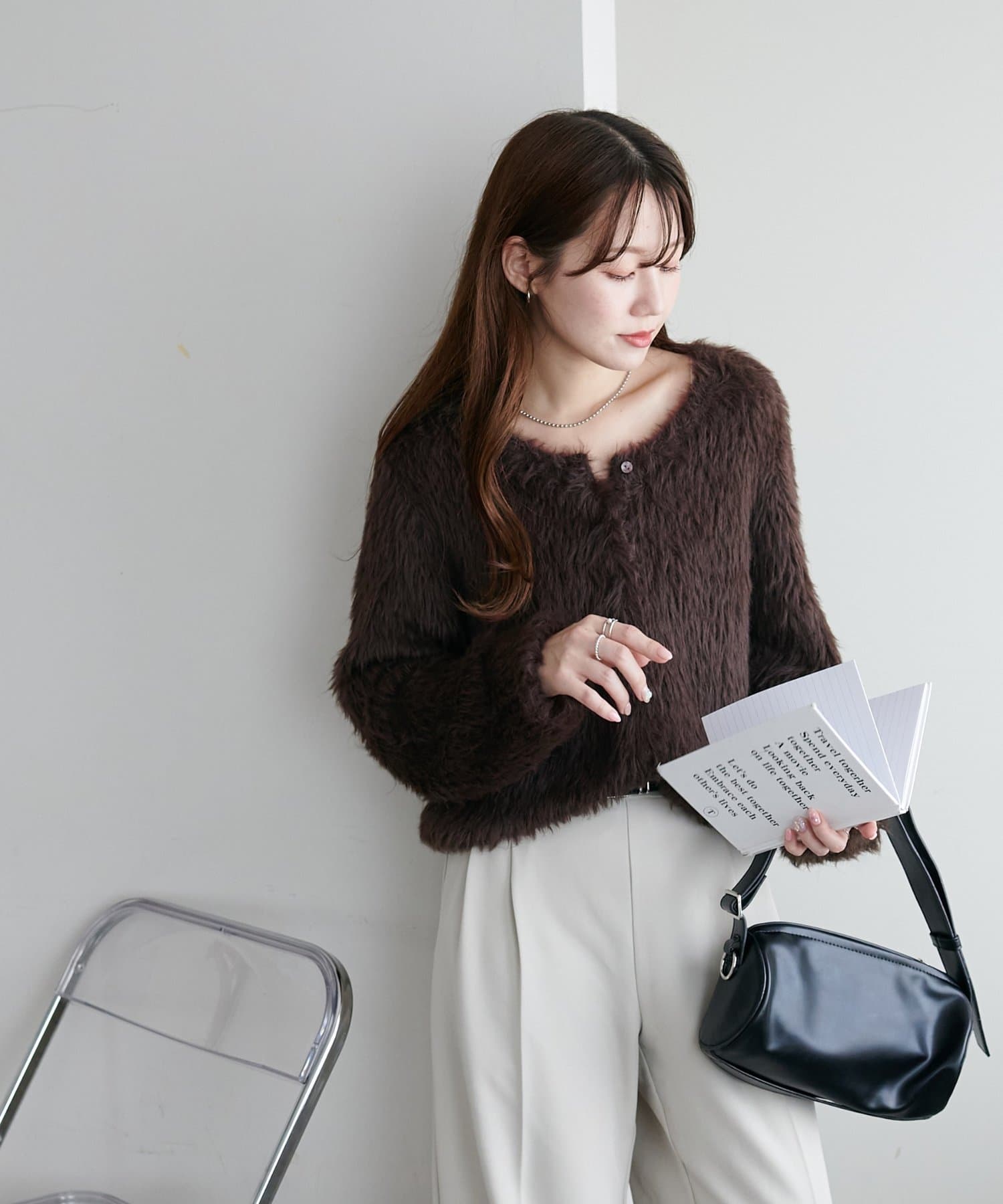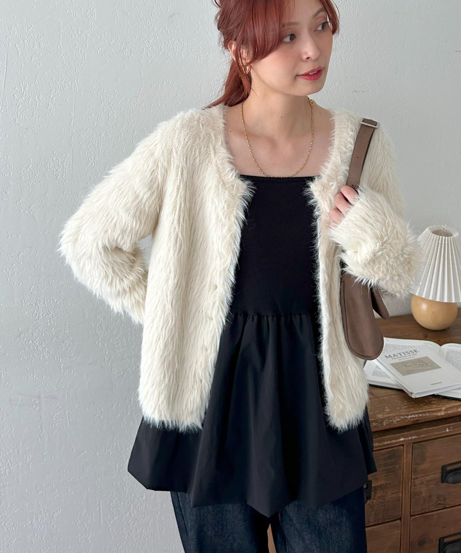 全体に毛足の長いロングフェザーヤーンを贅沢に使用した、ふんわりとした質感が魅力のカーディガン。