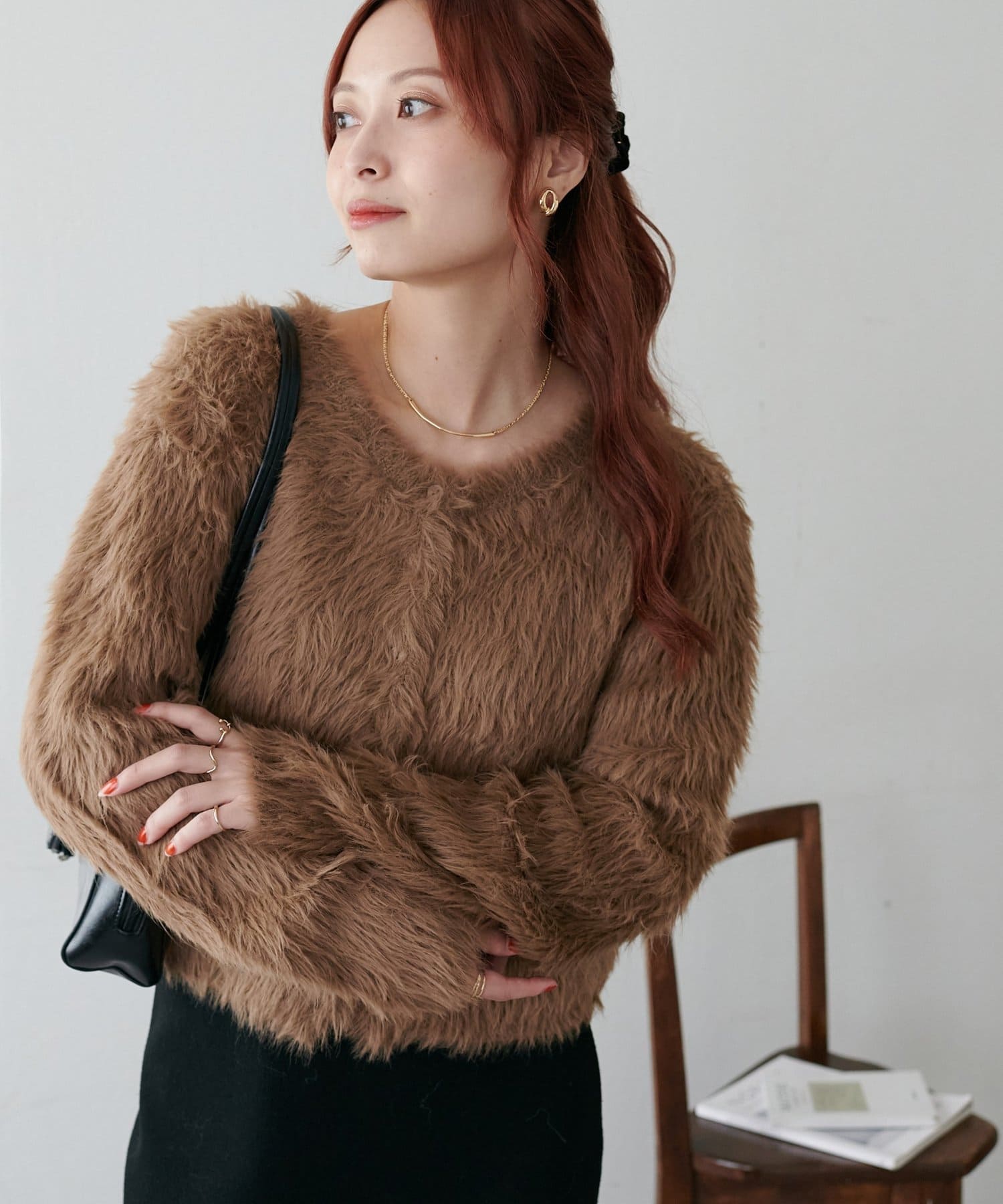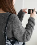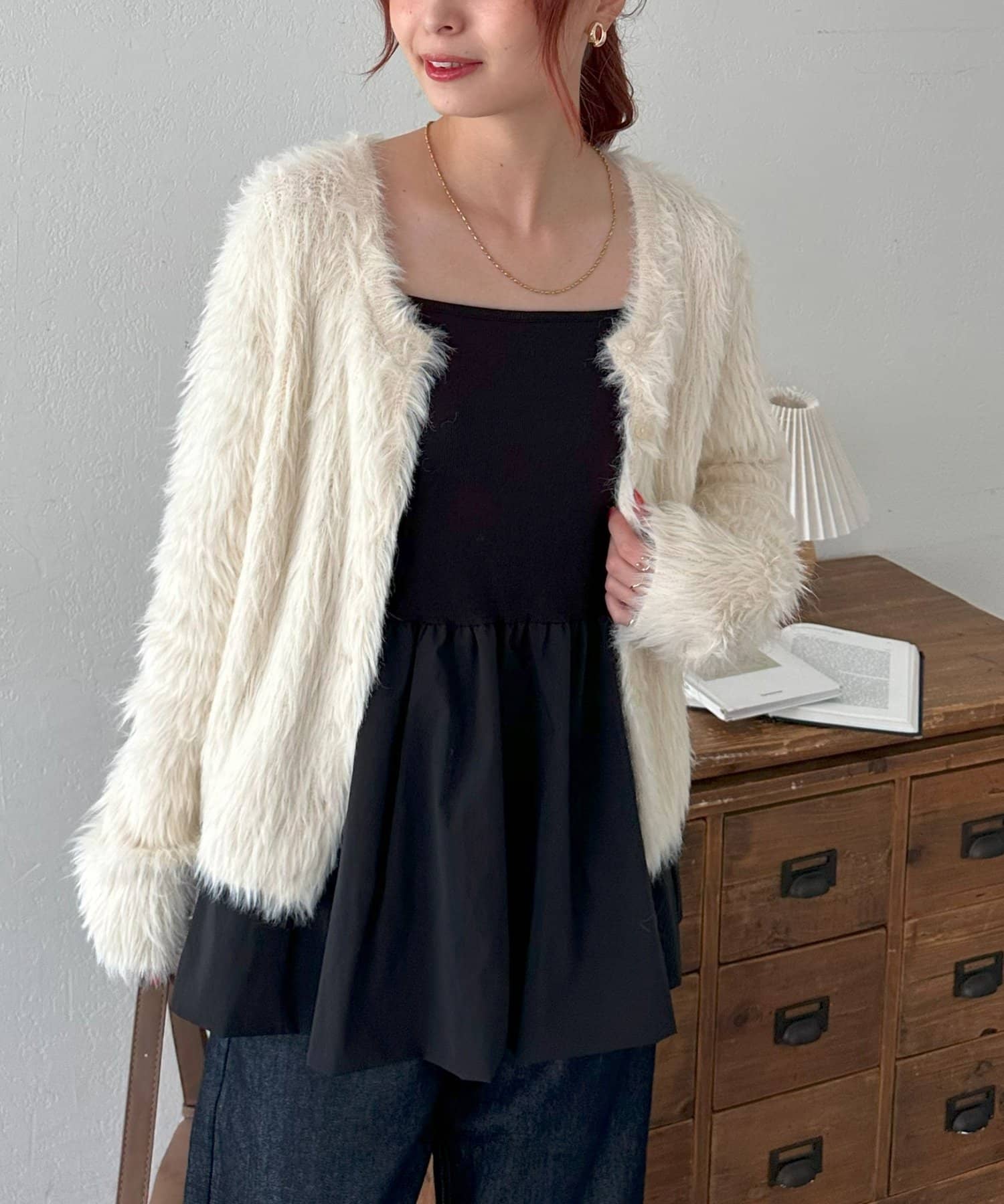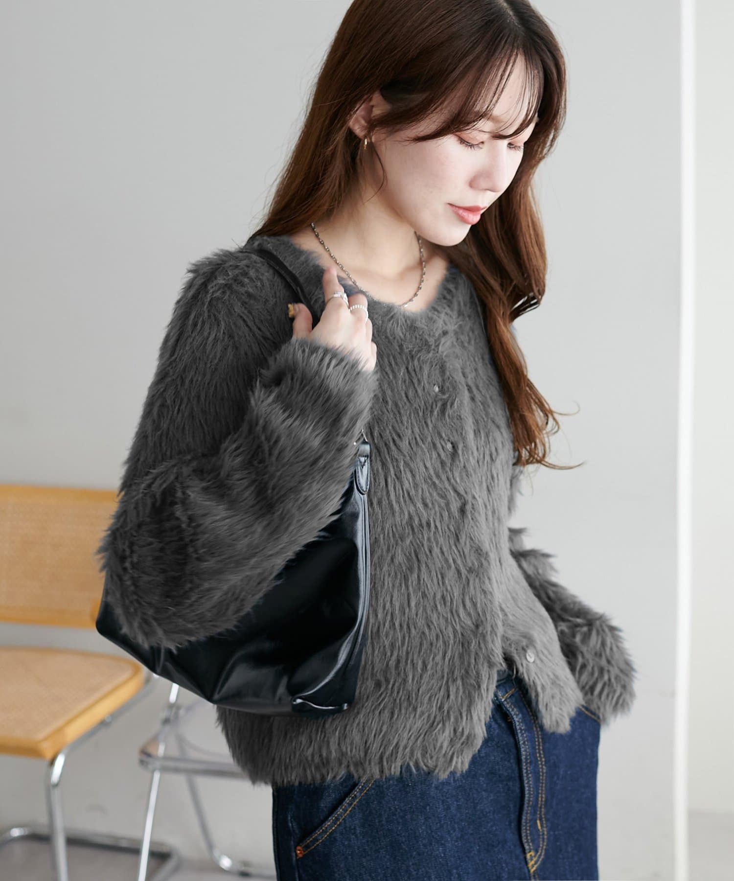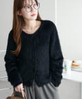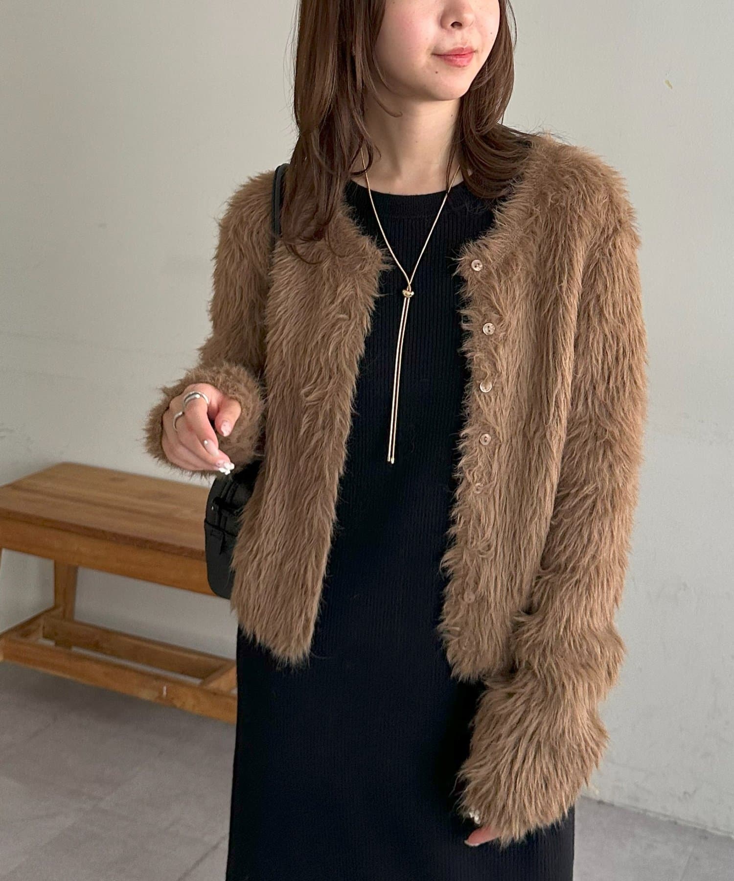 全体に毛足の長いロングフェザーヤーンを贅沢に使用した、ふんわりとした質感が魅力のカーディガン。