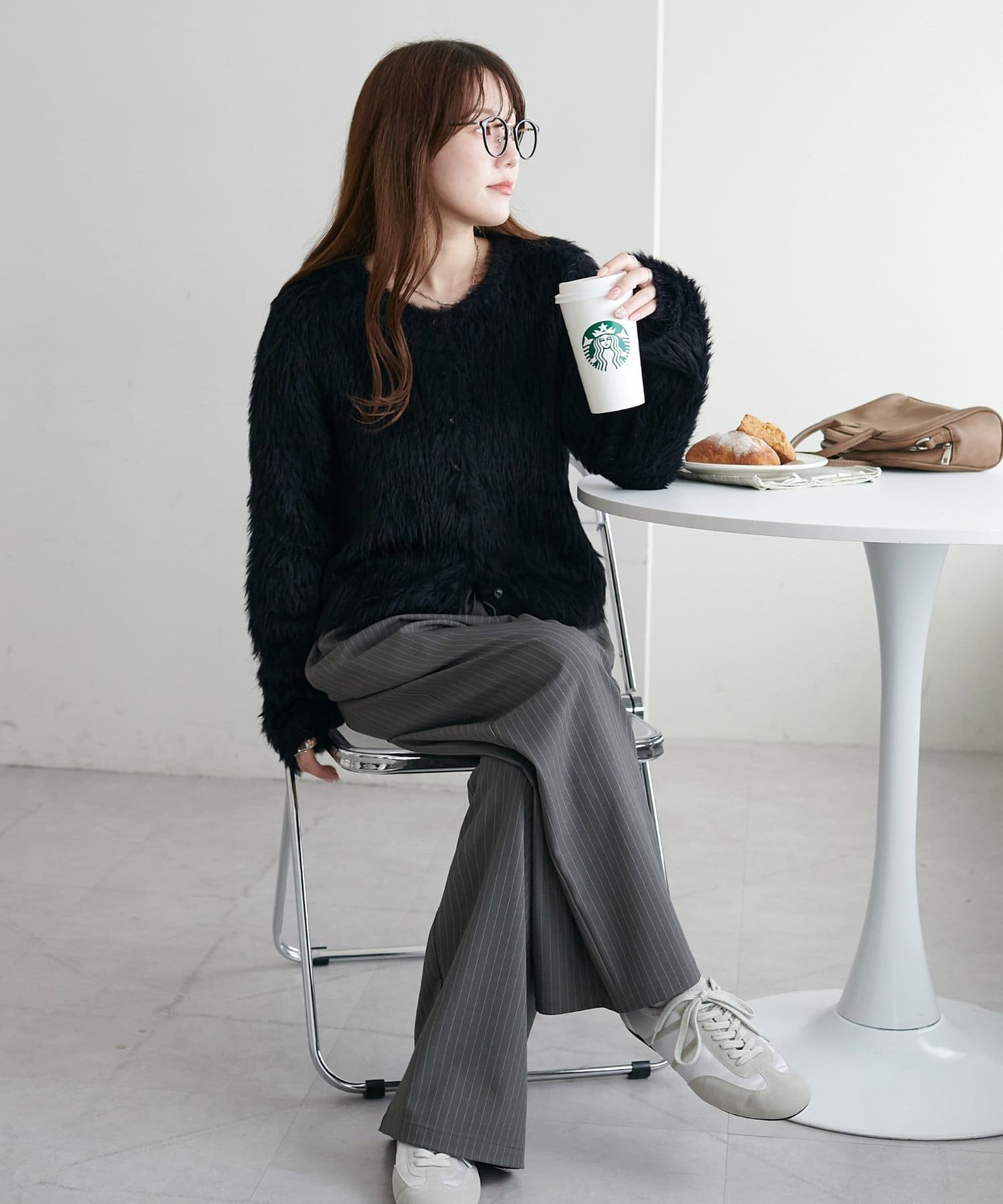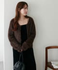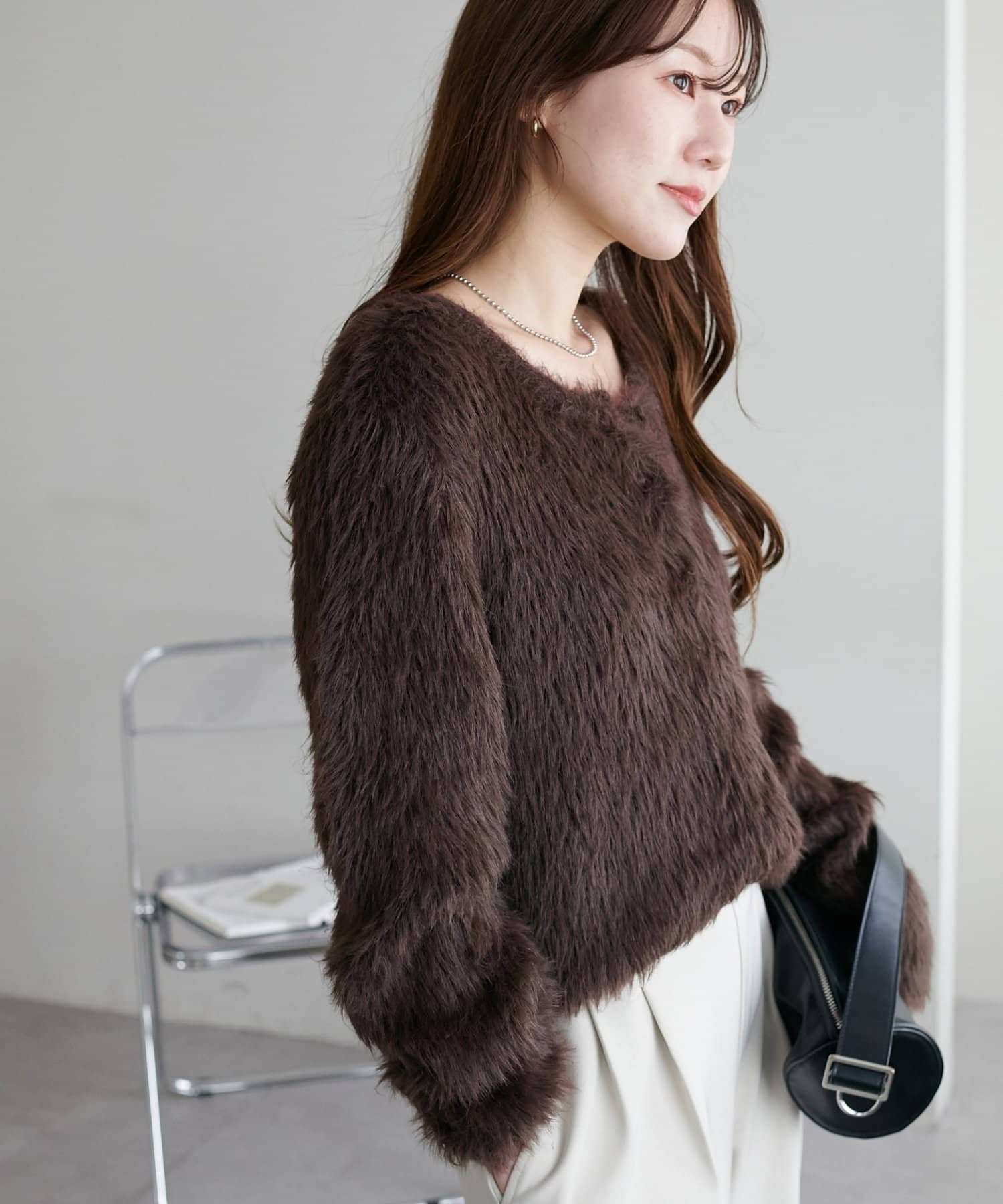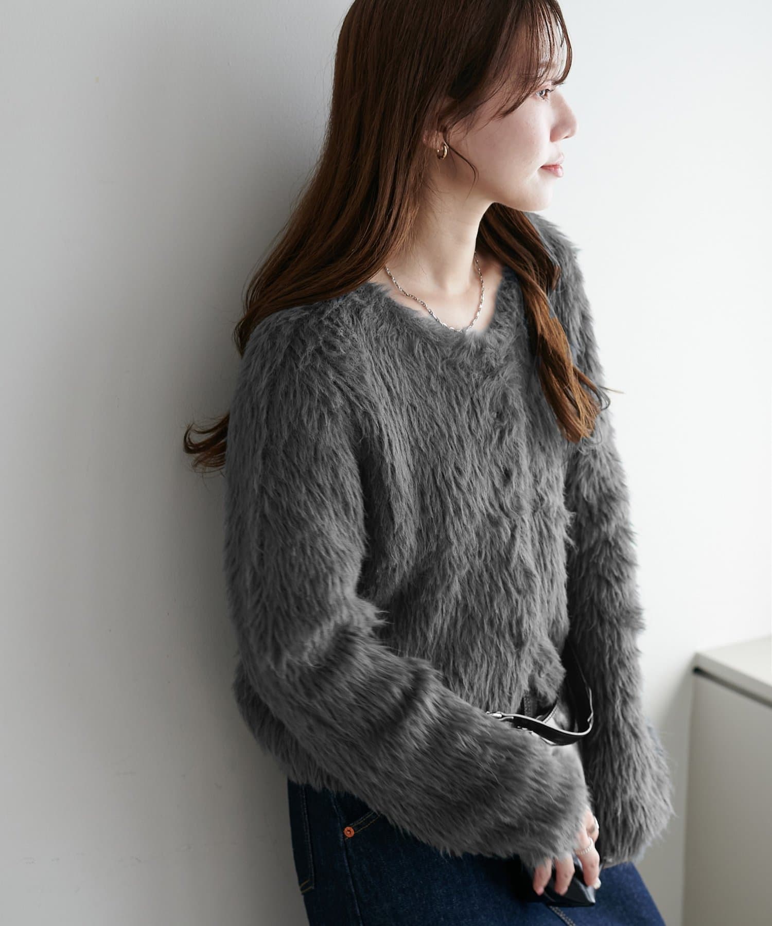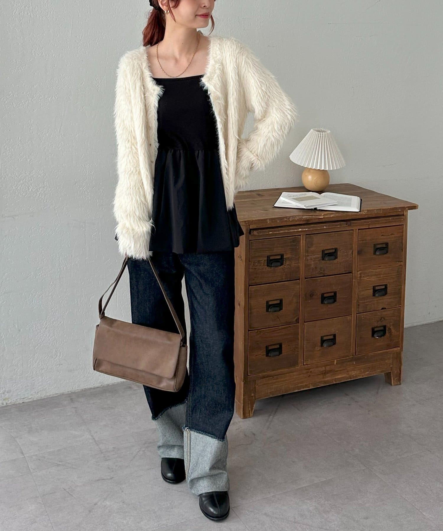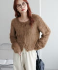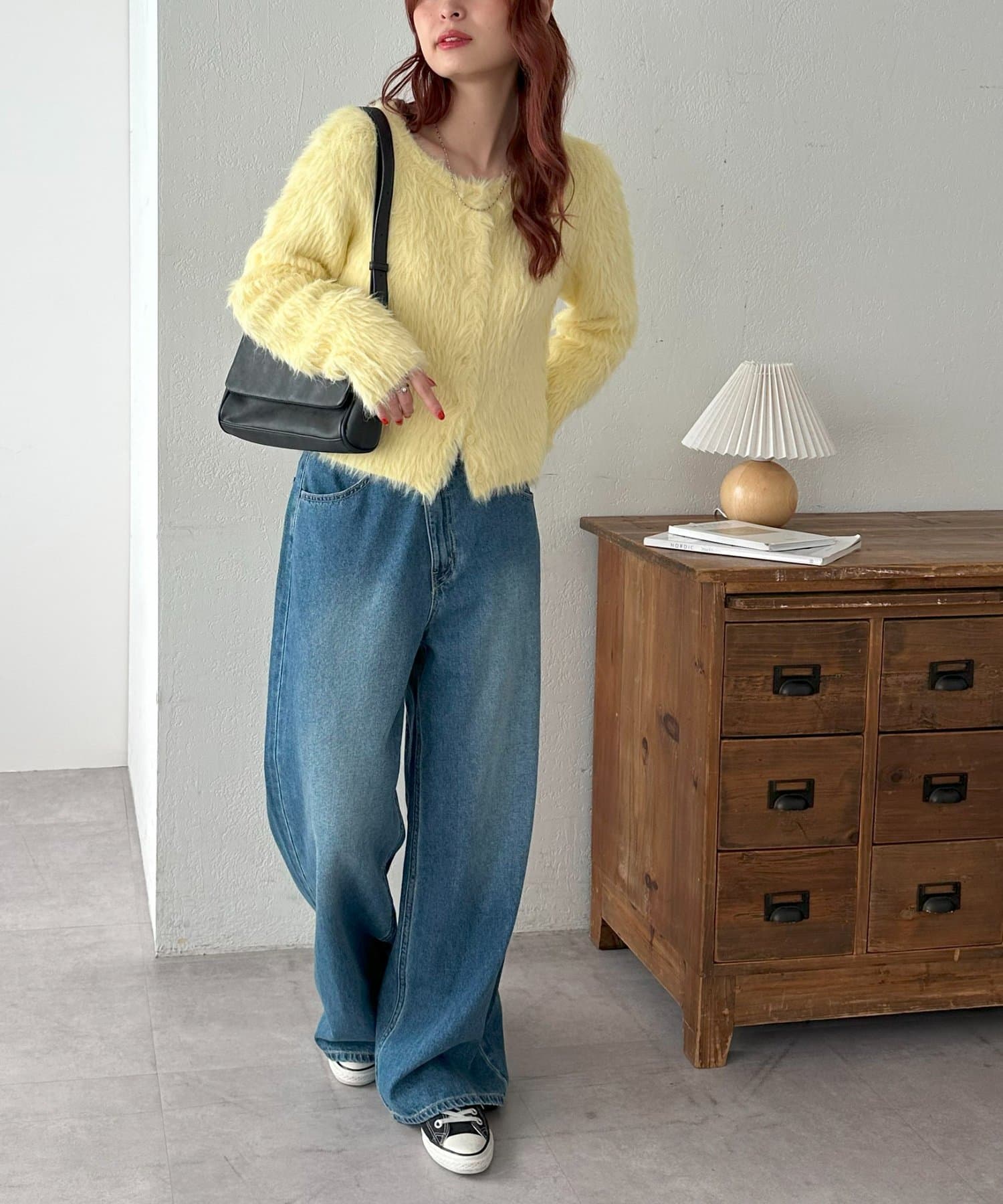 全体に毛足の長いロングフェザーヤーンを贅沢に使用した、ふんわりとした質感が魅力のカーディガン。