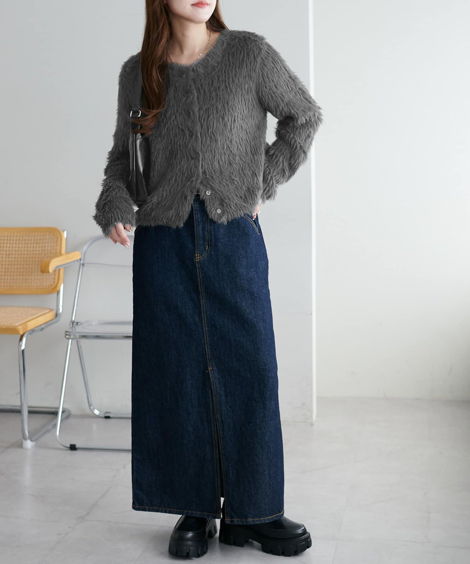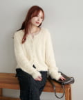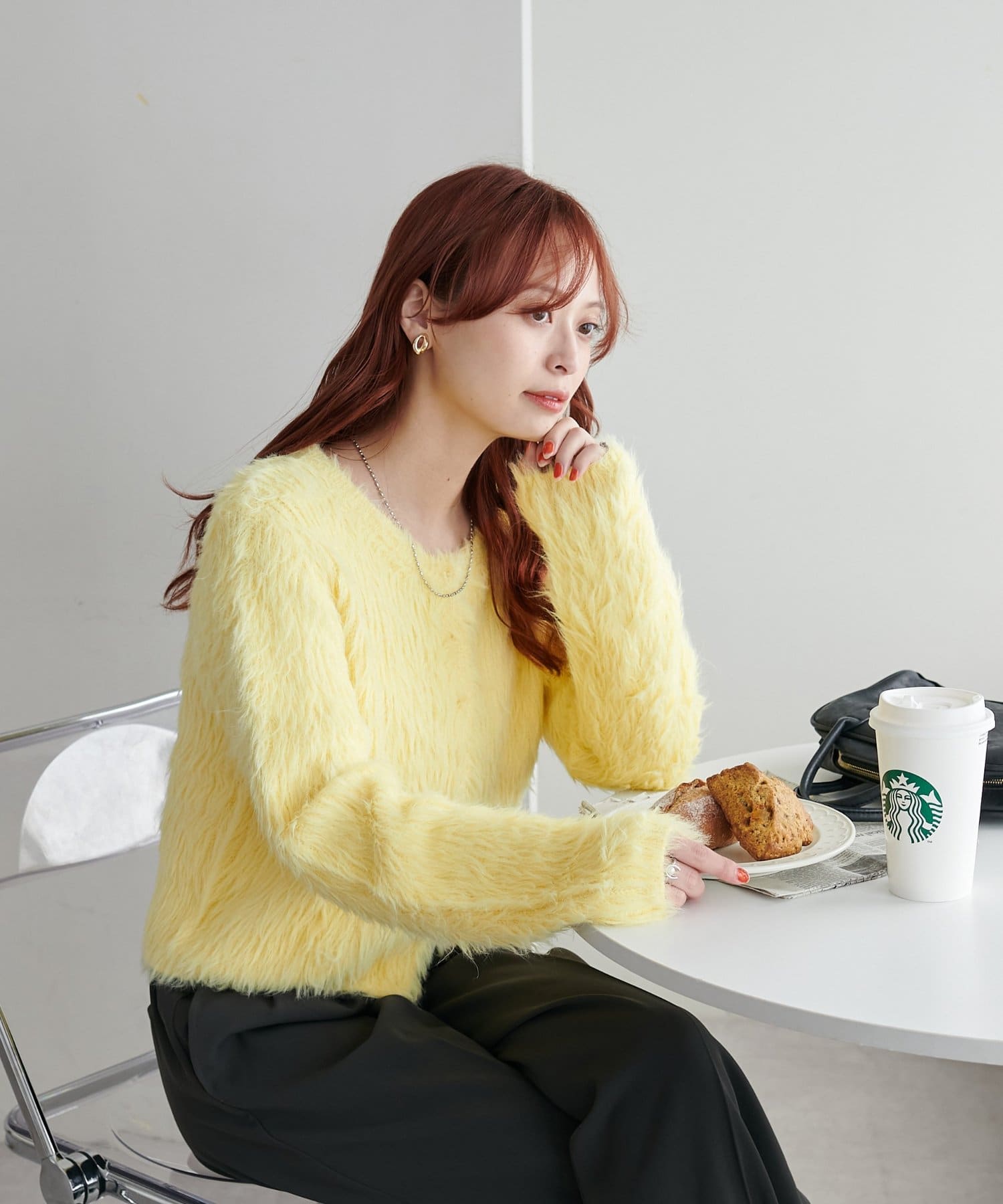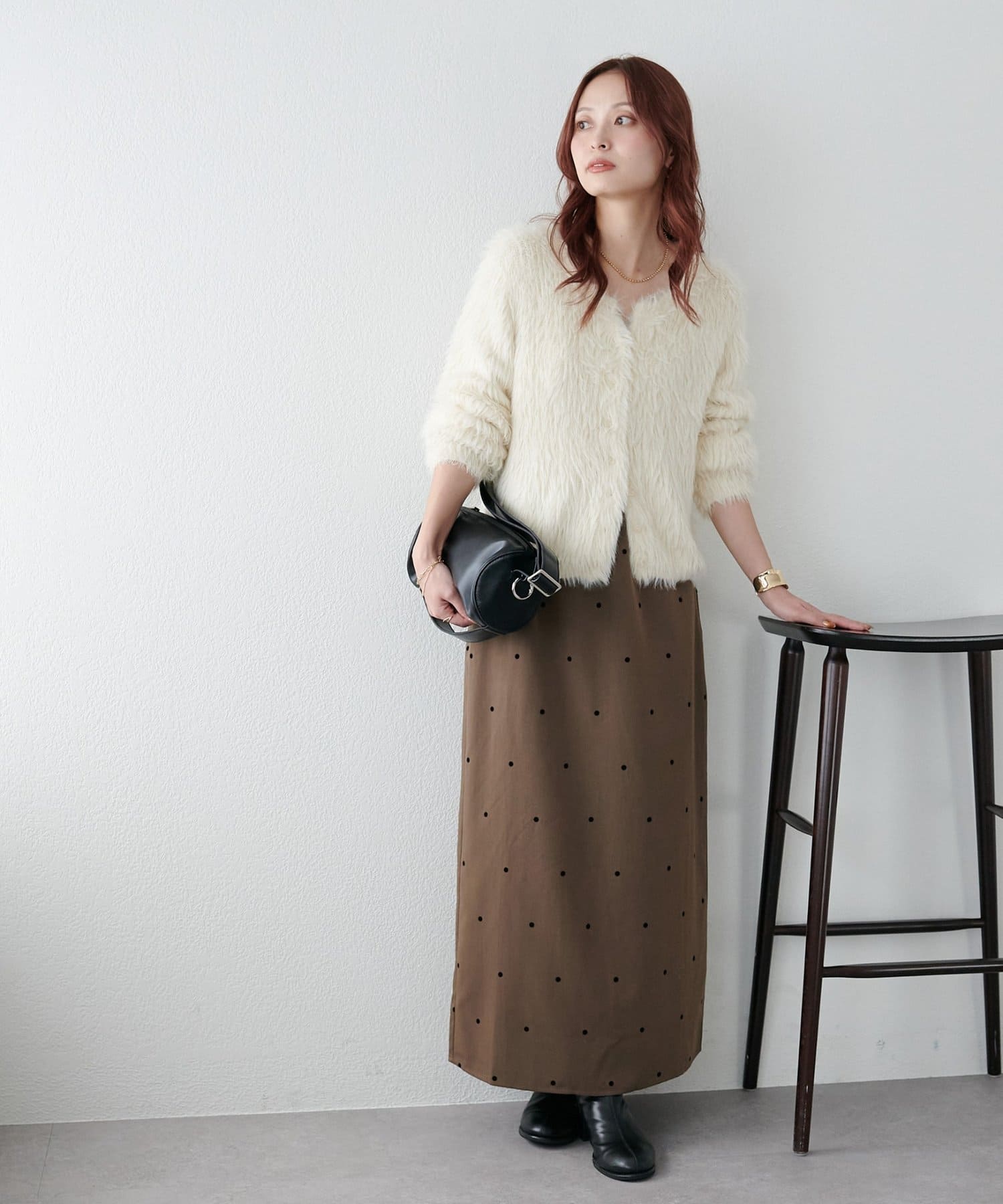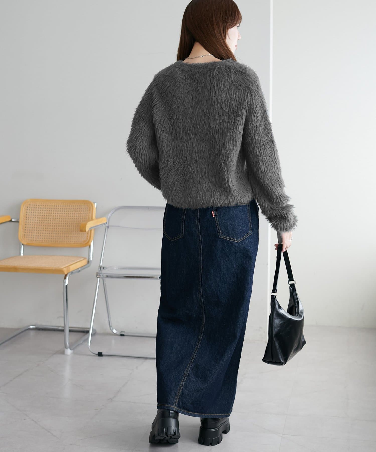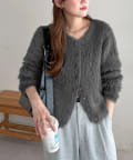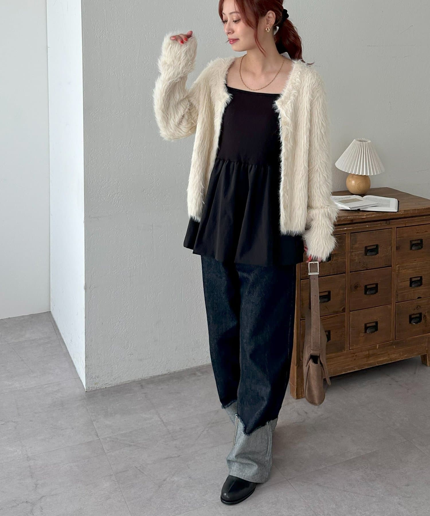 全体に毛足の長いロングフェザーヤーンを贅沢に使用した、ふんわりとした質感が魅力のカーディガン。