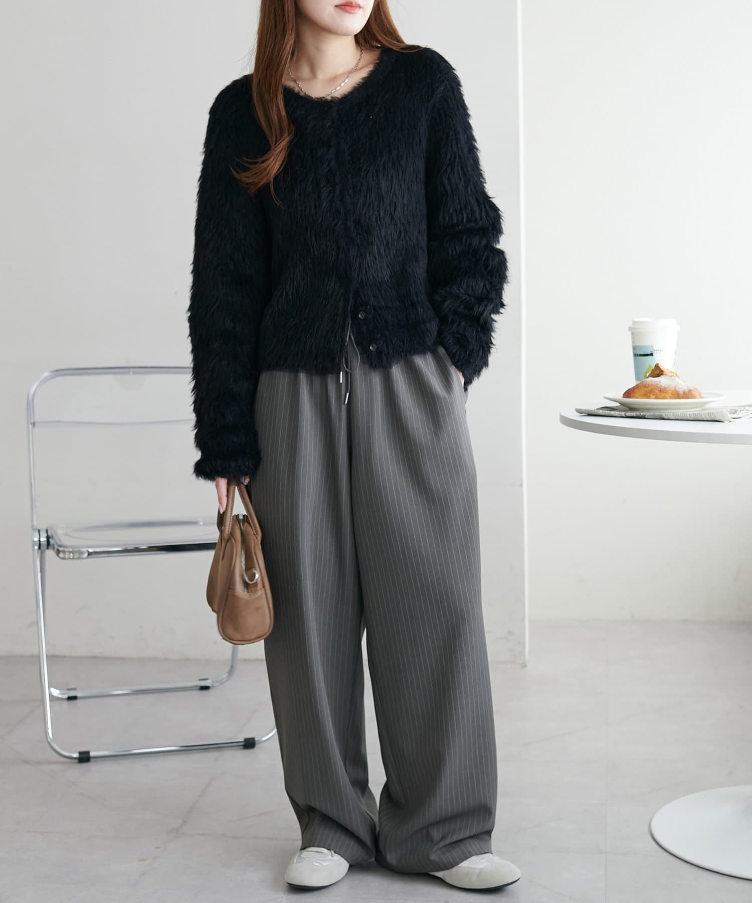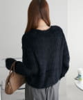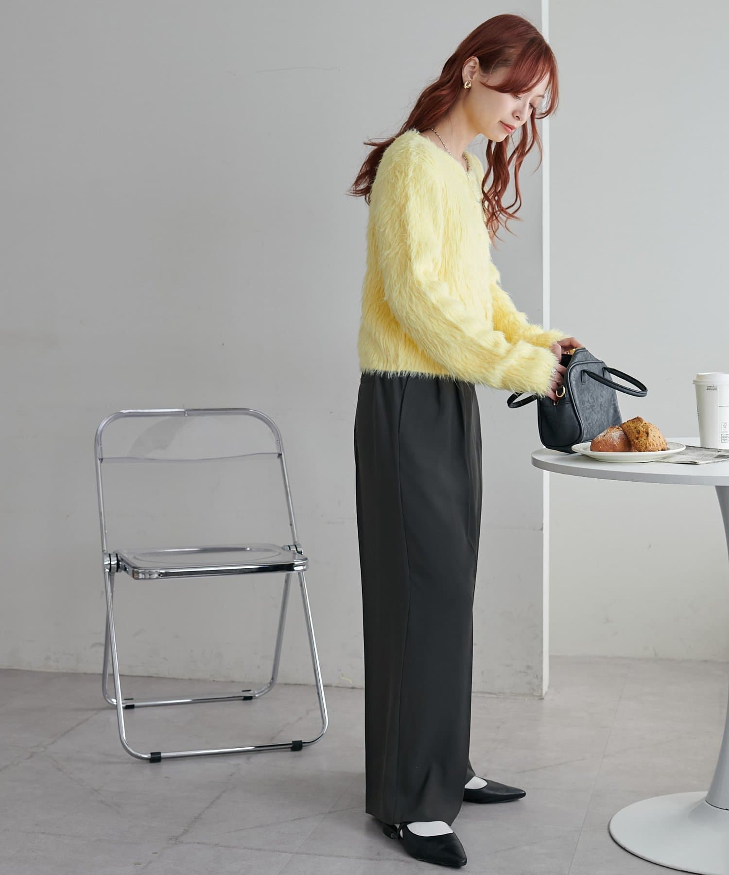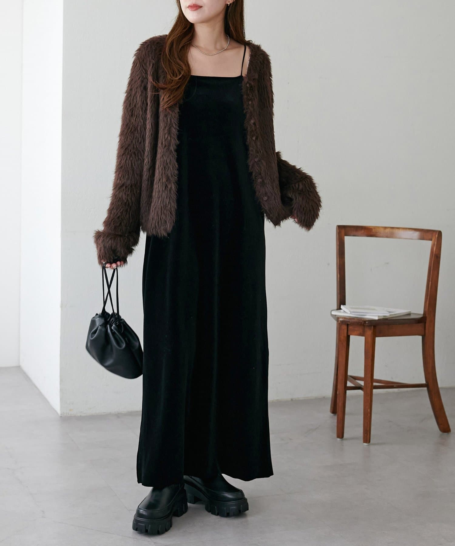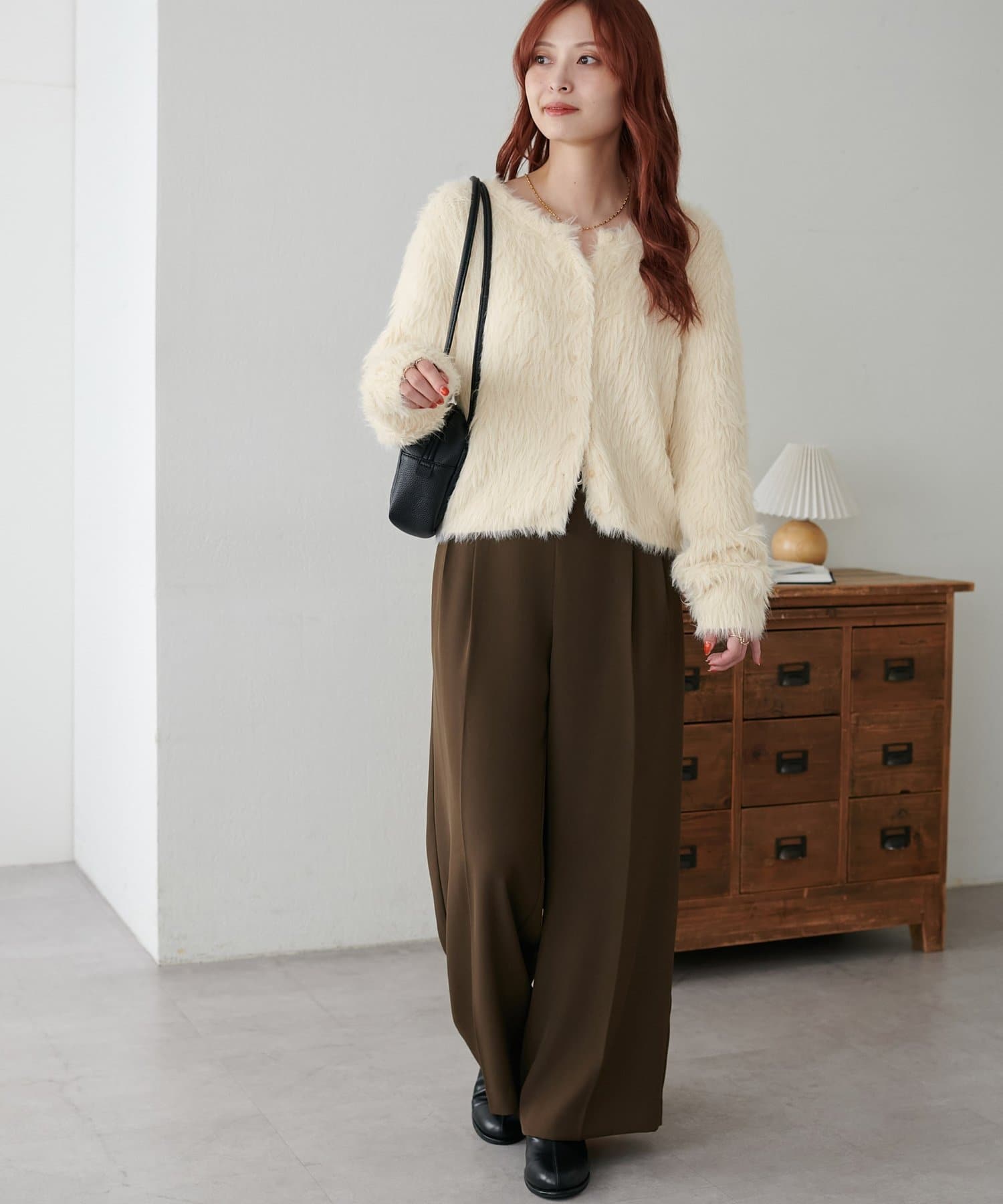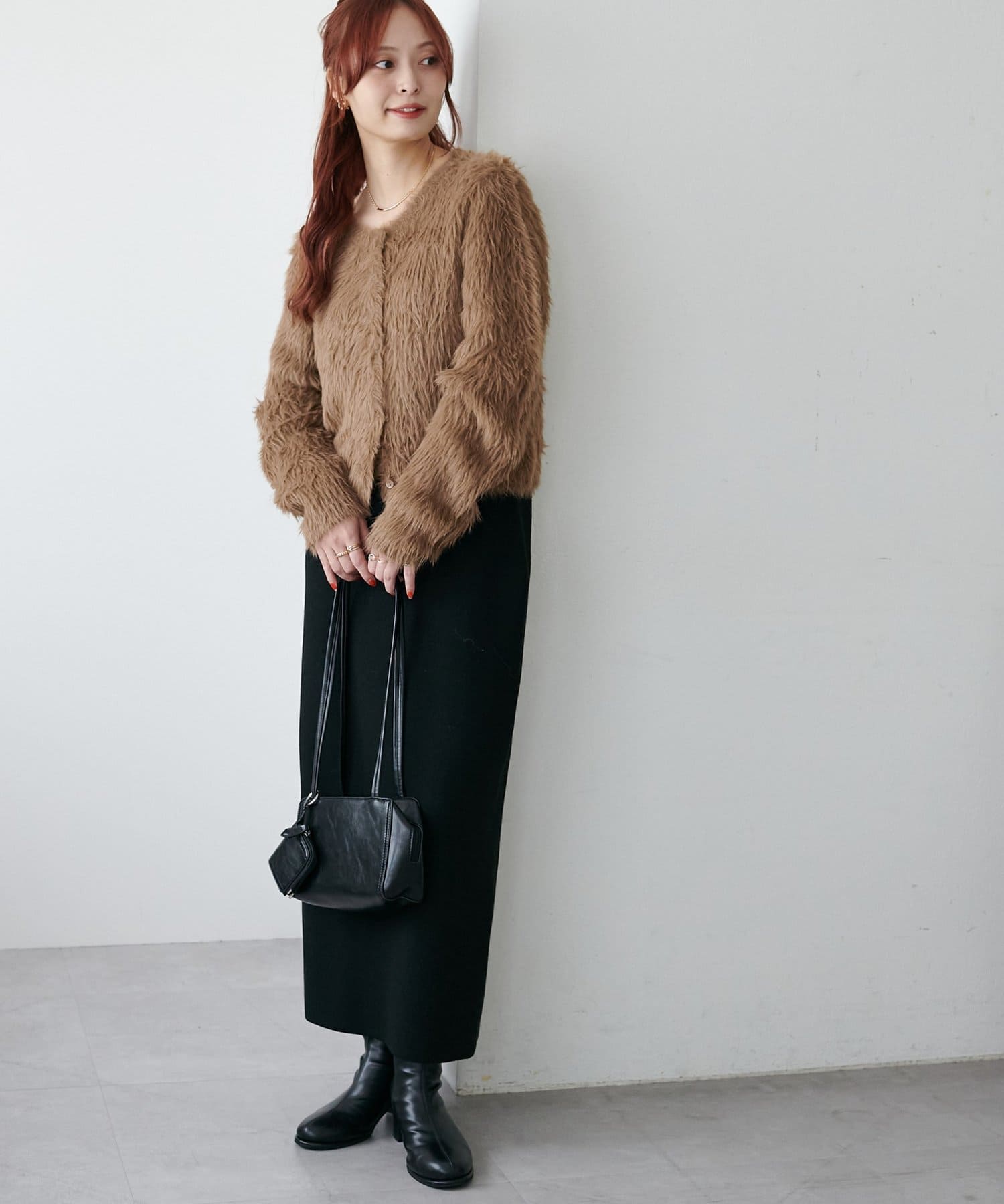 全体に毛足の長いロングフェザーヤーンを贅沢に使用した、ふんわりとした質感が魅力のカーディガン。