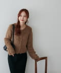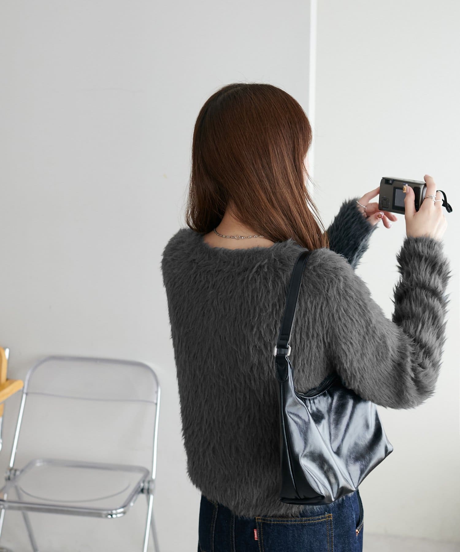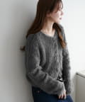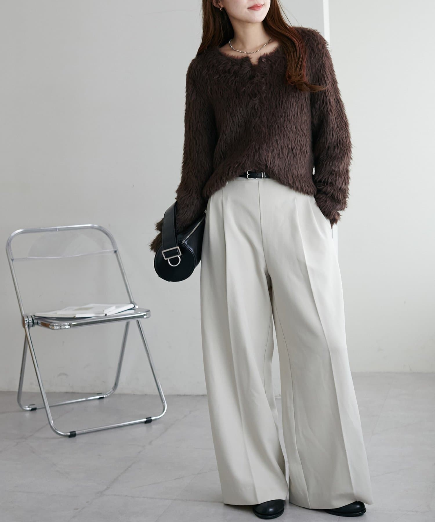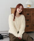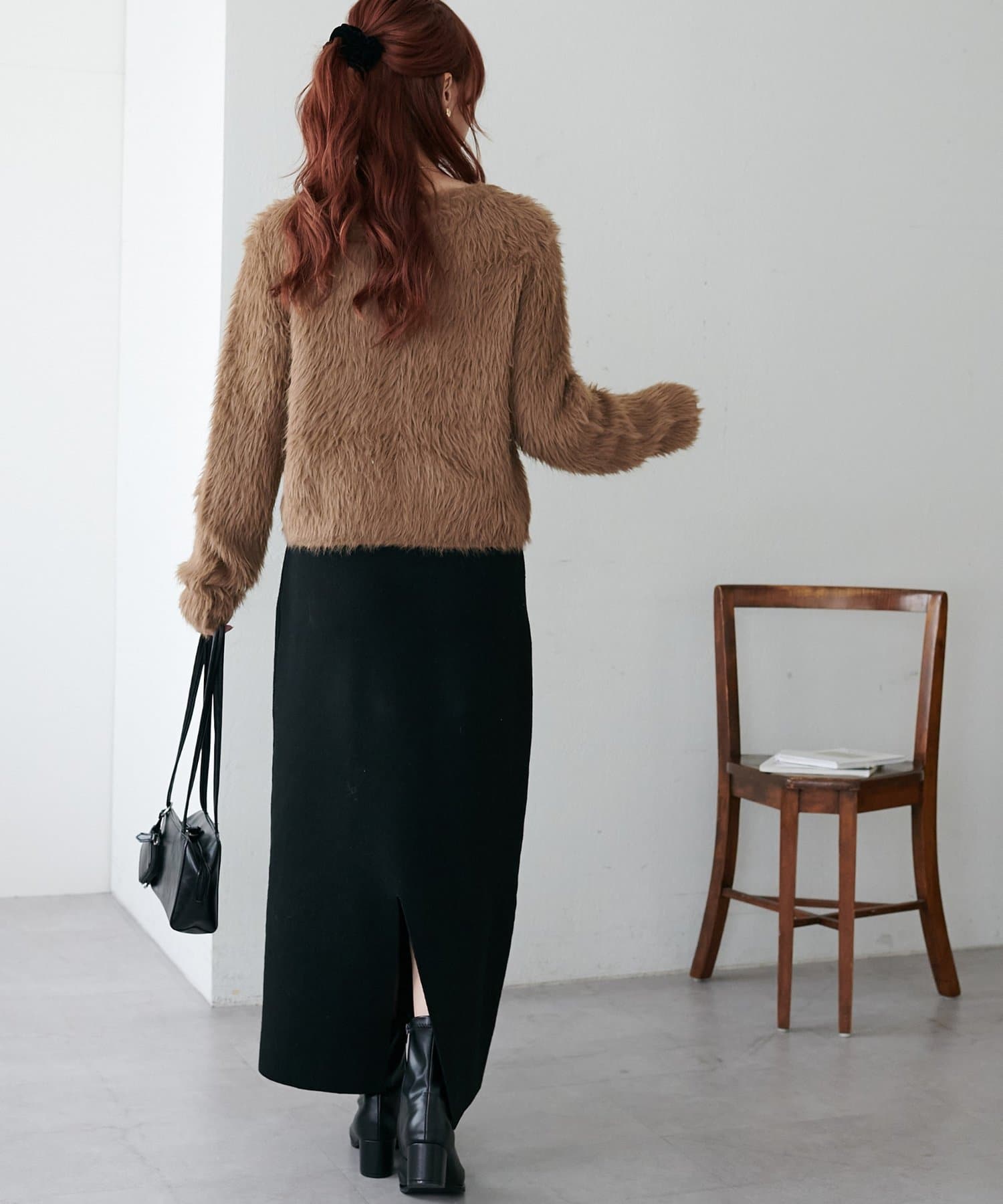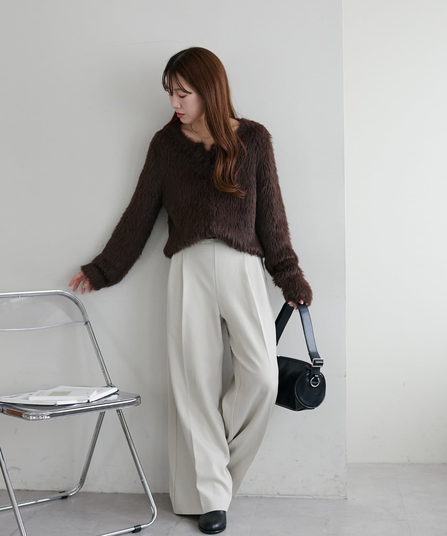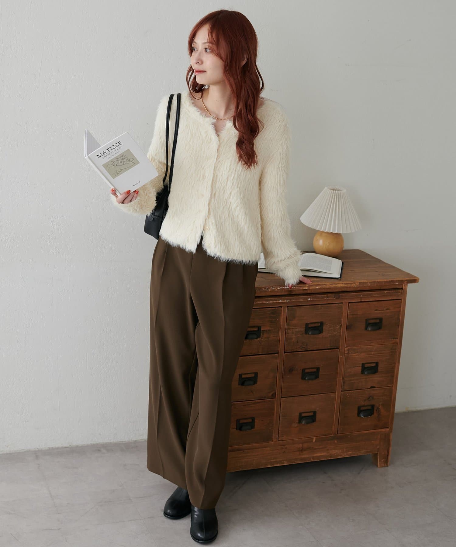 全体に毛足の長いロングフェザーヤーンを贅沢に使用した、ふんわりとした質感が魅力のカーディガン。
