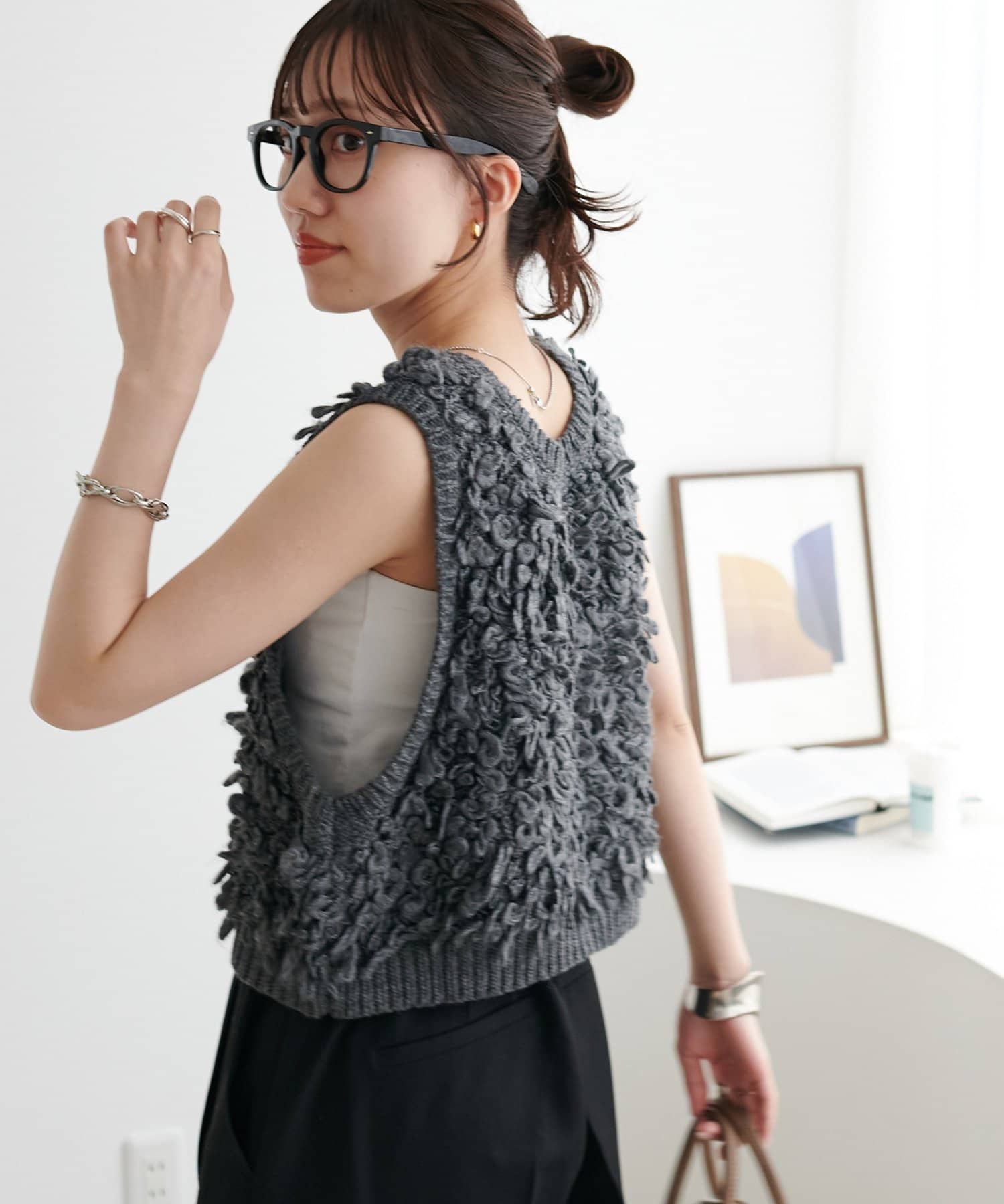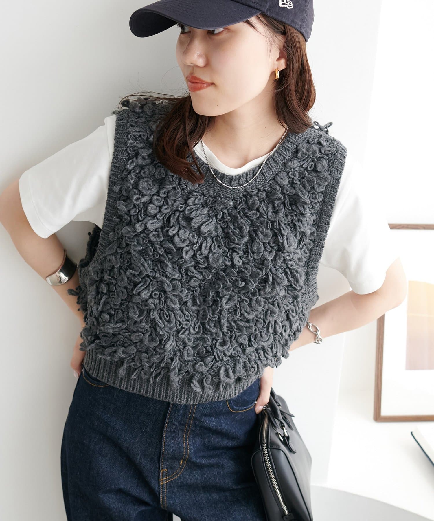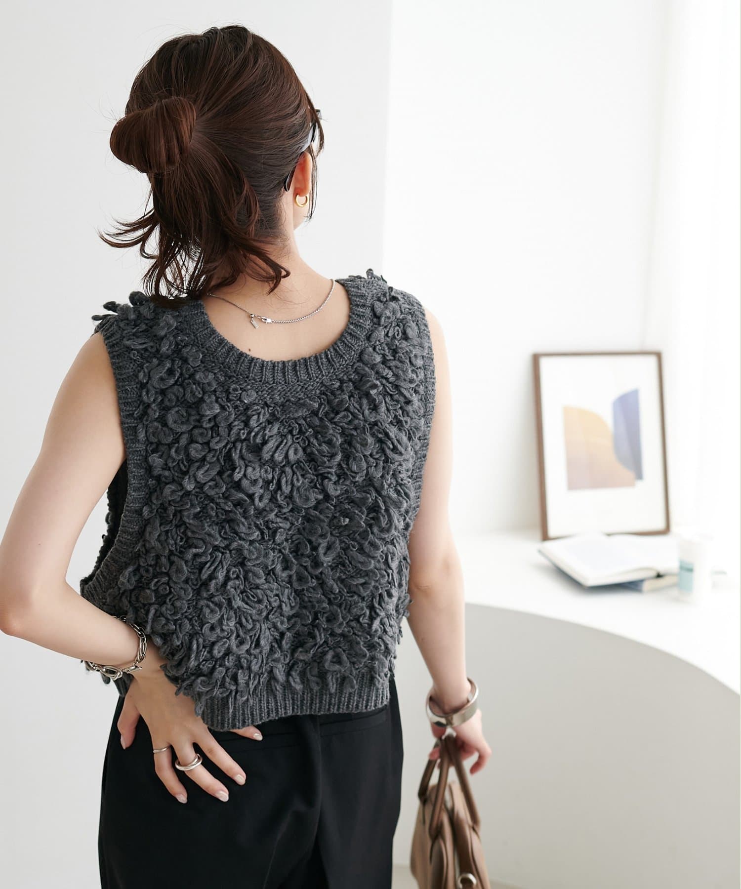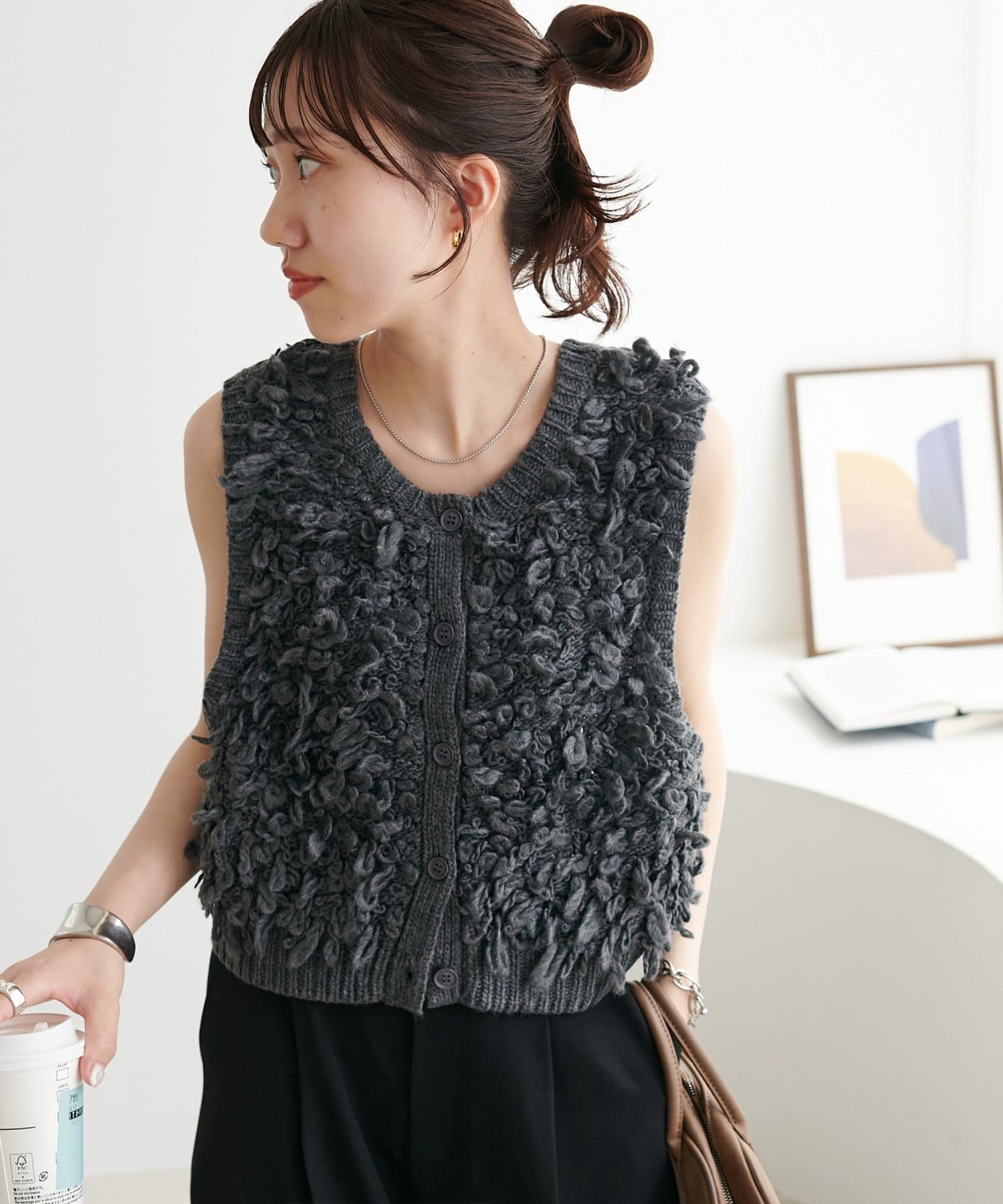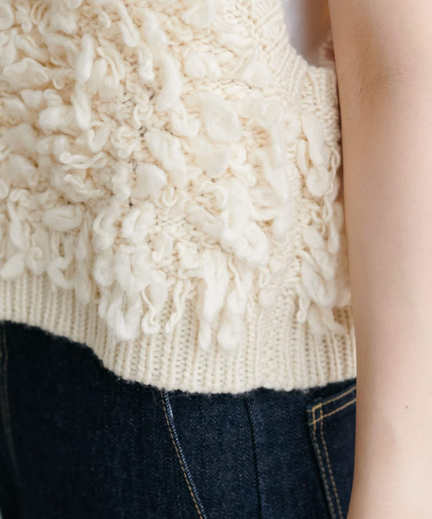 表情豊かなループヤーンを全体に施した、ふんわり立体感のあるニットベスト。