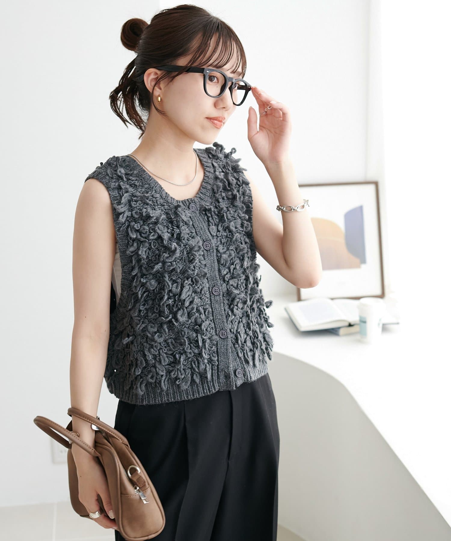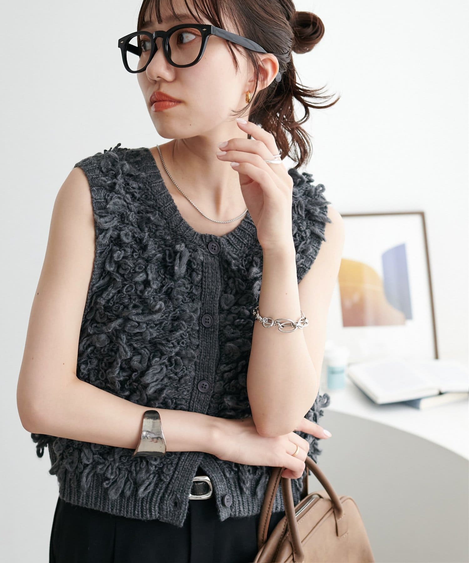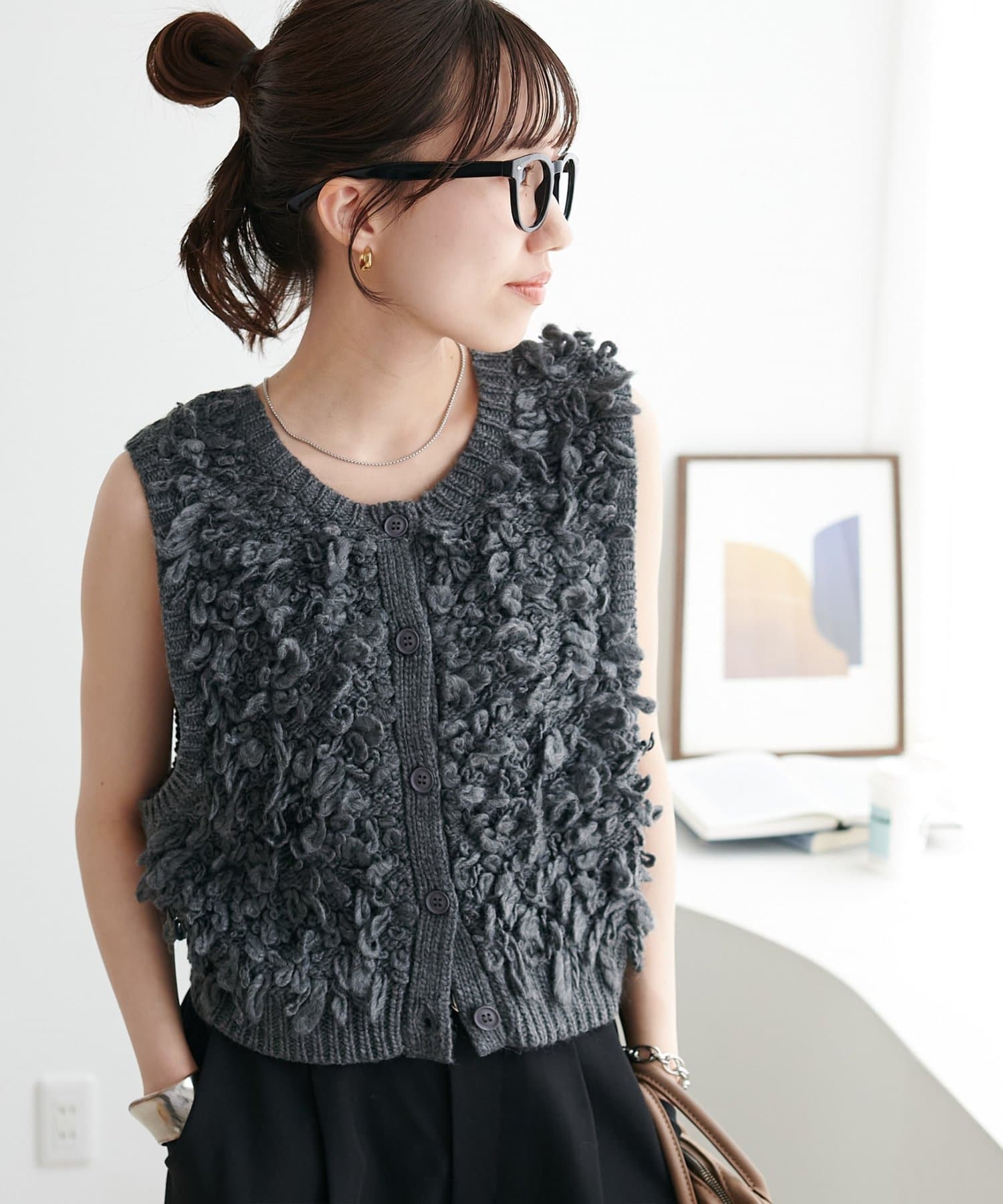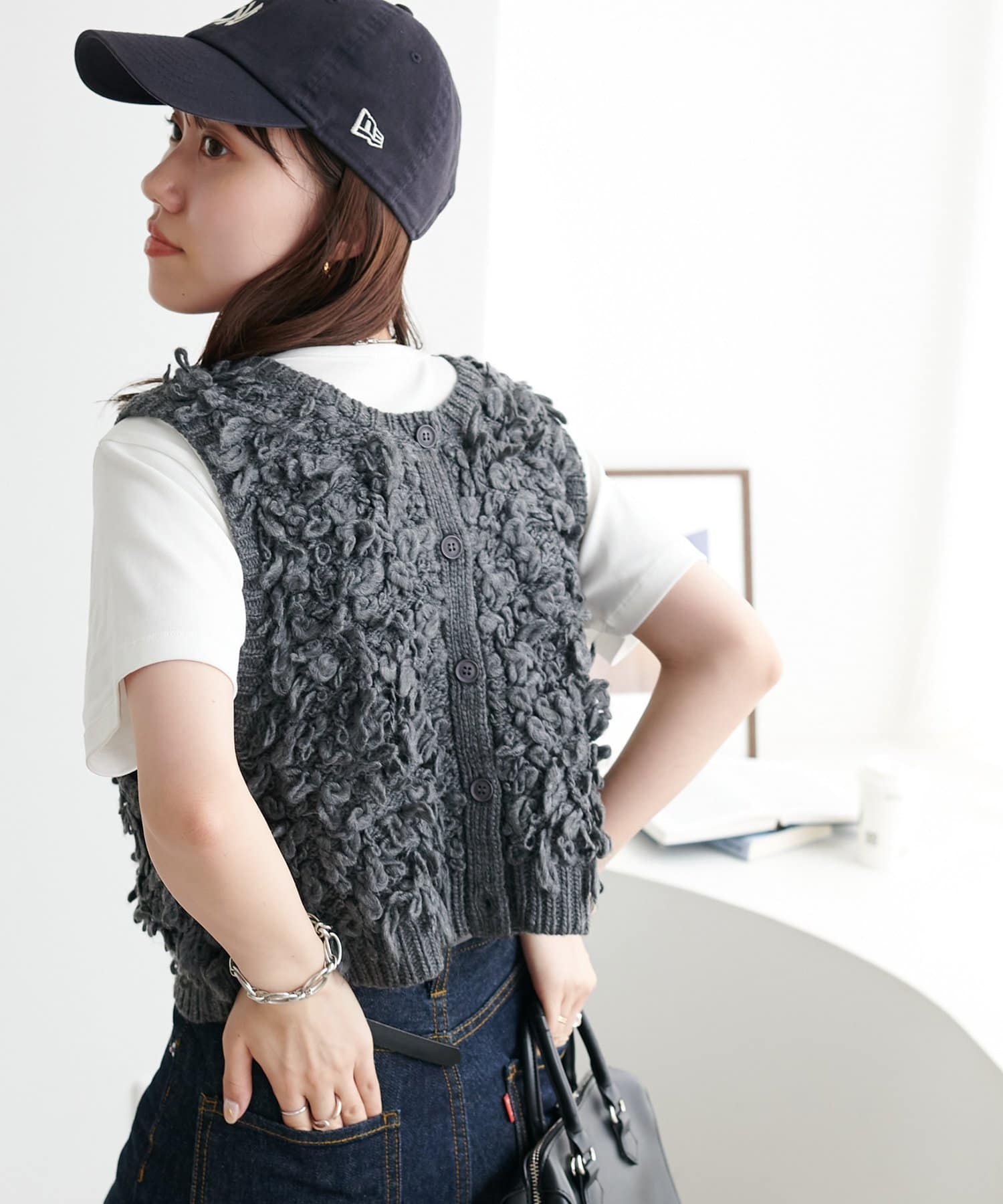 表情豊かなループヤーンを全体に施した、ふんわり立体感のあるニットベスト。