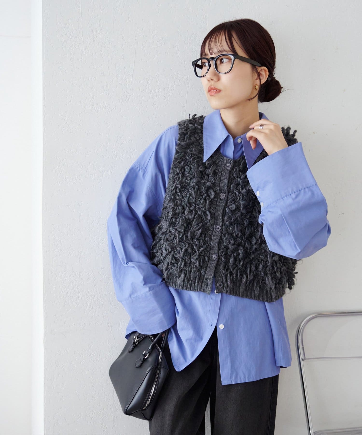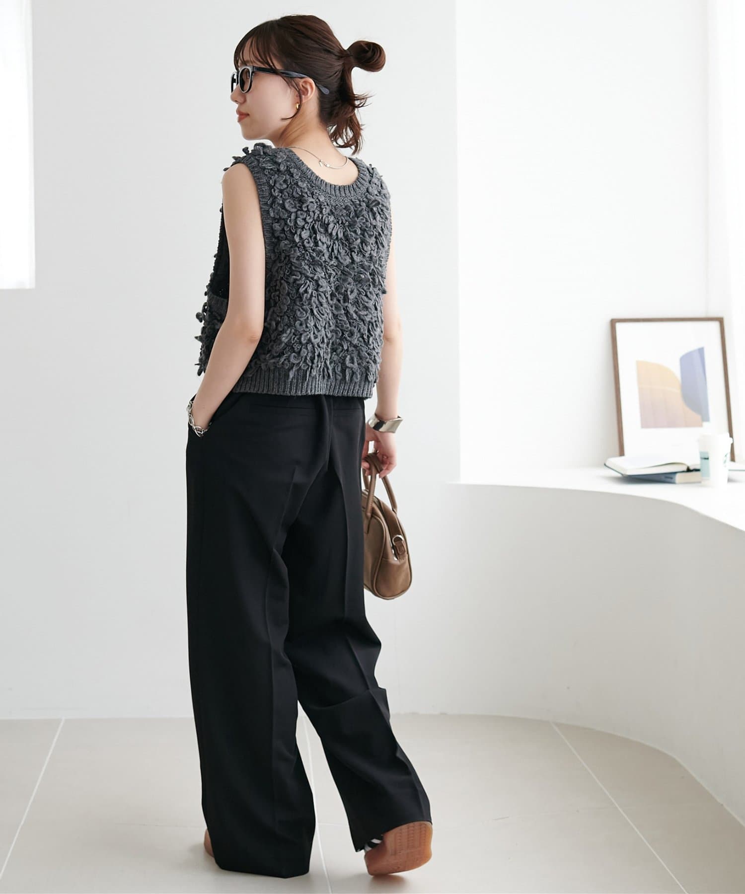 162cmスタッフ:アームホールが広めなので、Tシャツやシャツを中に重ねてももたつかず着られました。立体的なループヤーンがコーデの主役になります◎