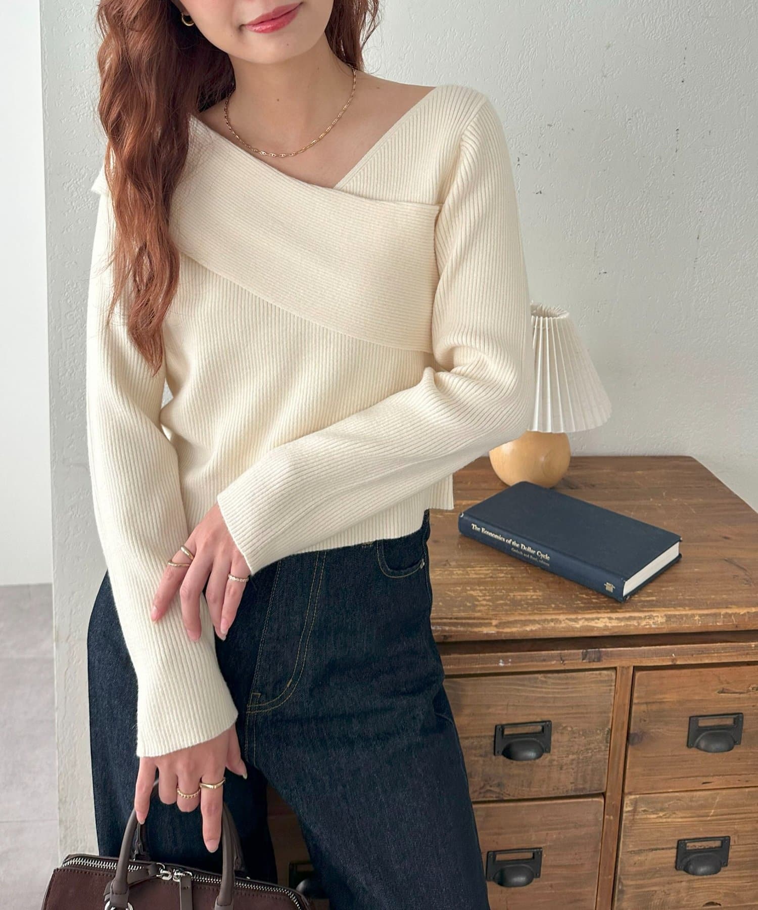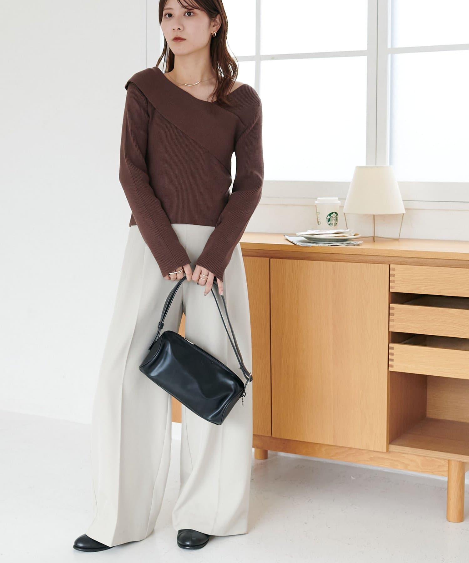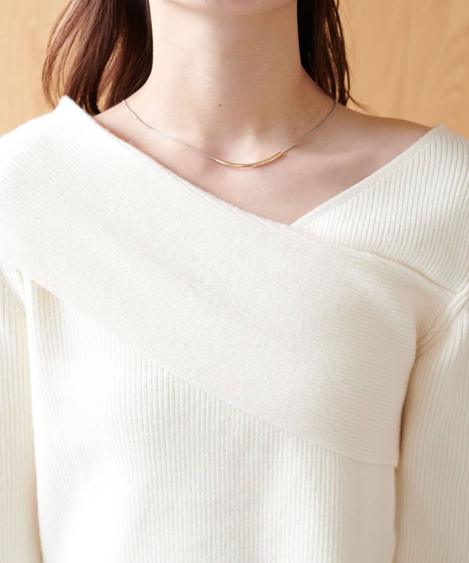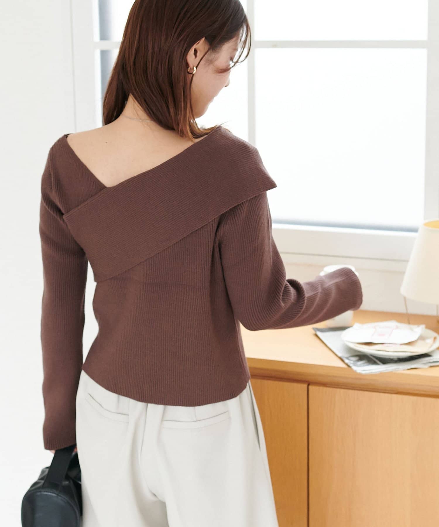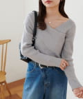 アシンメトリーになった首元のデザインがヘルシーで程よい肌見せに!