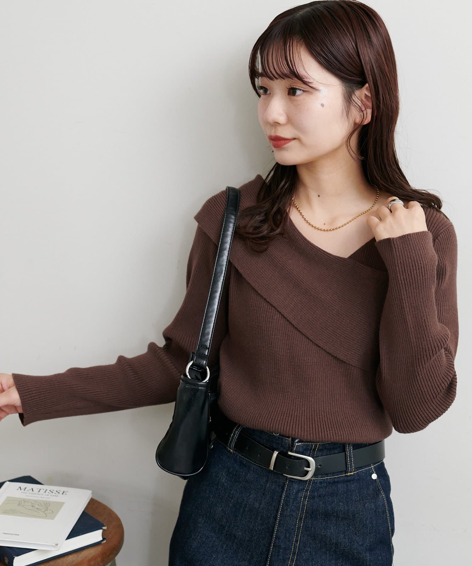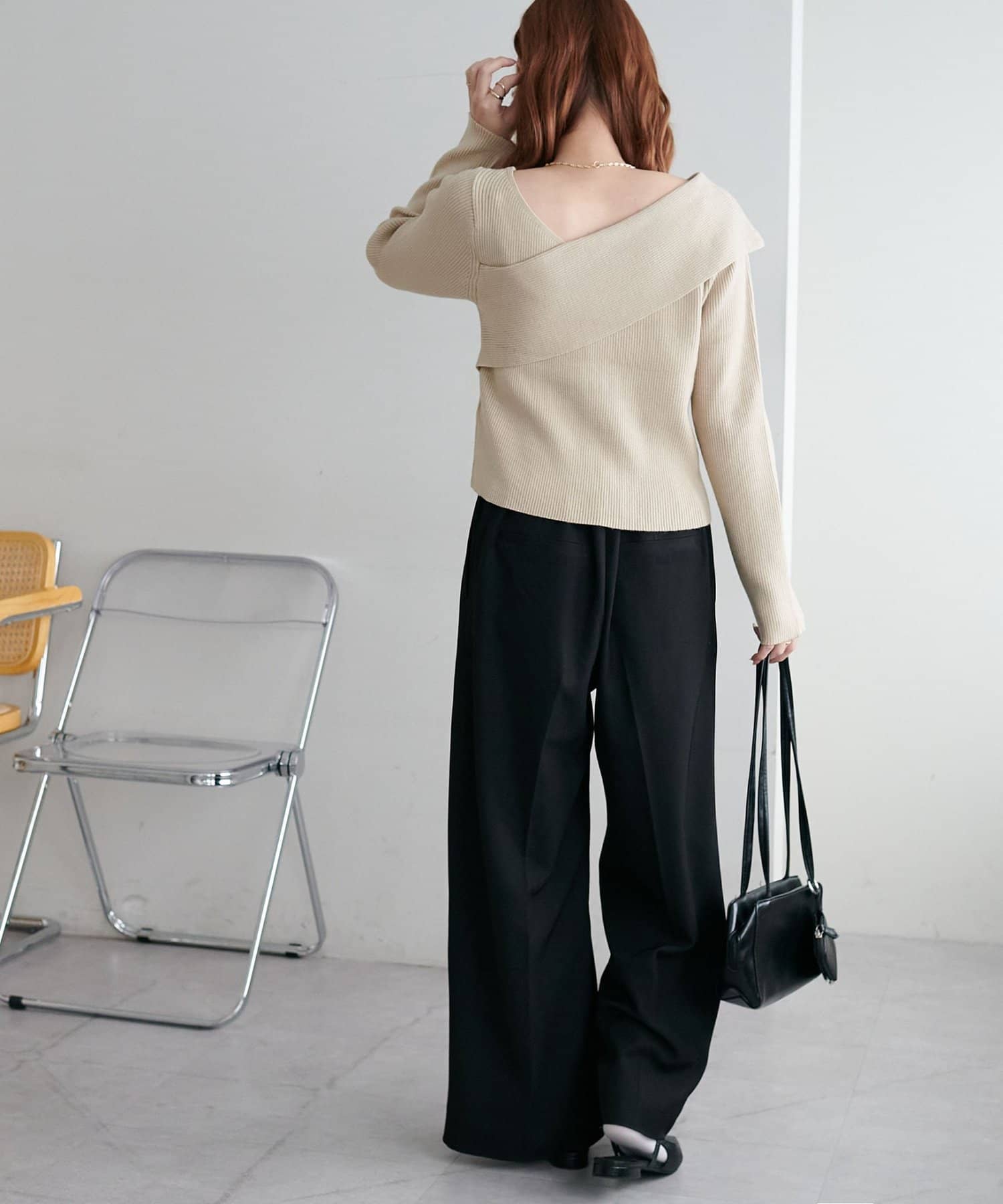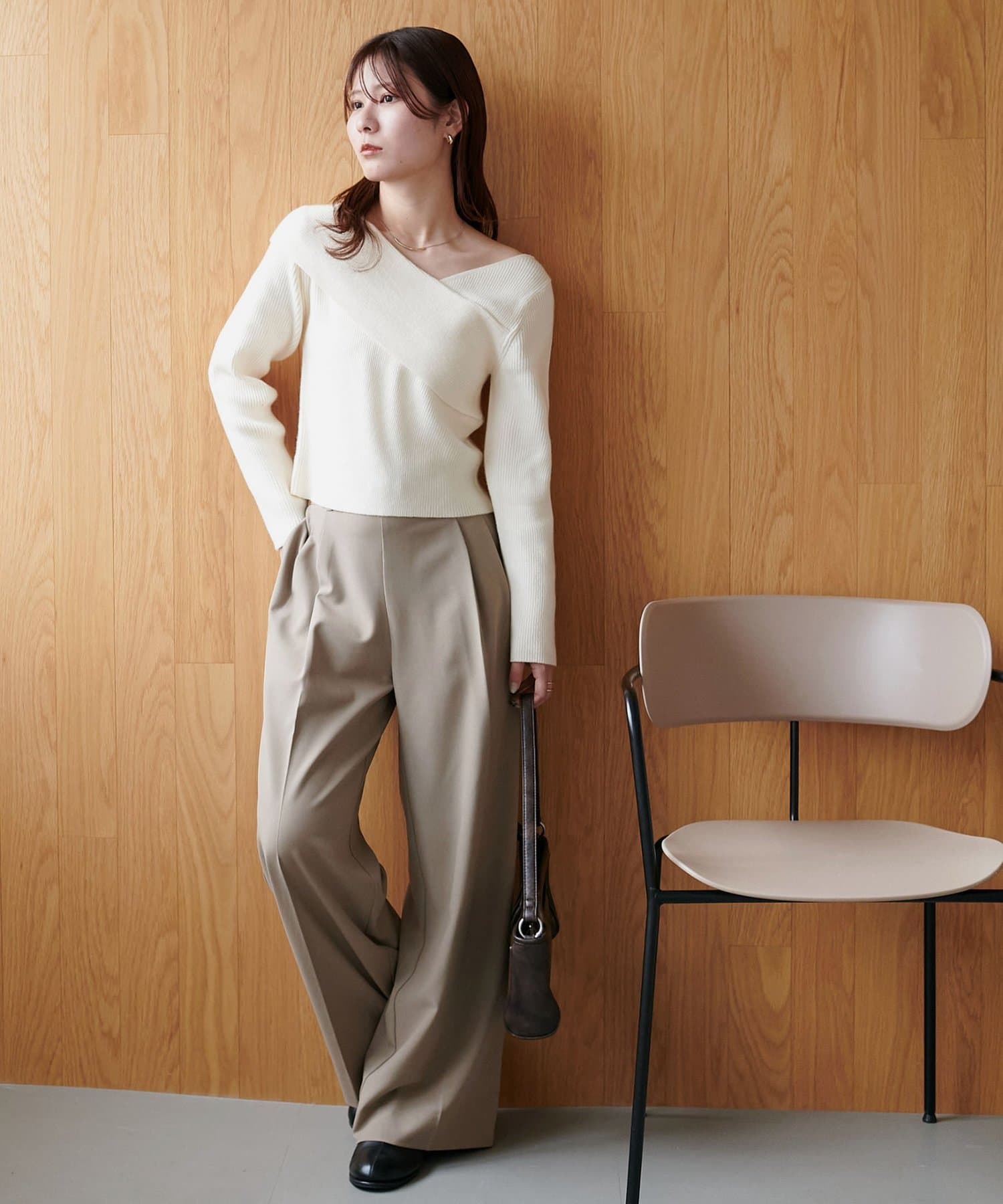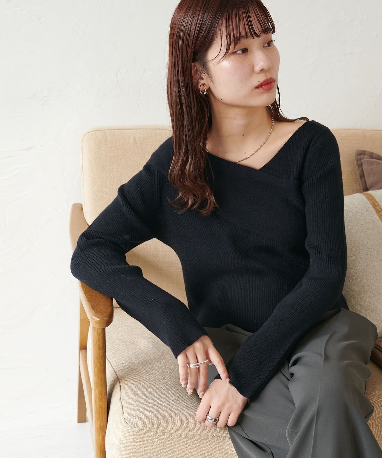 アシンメトリーになった首元のデザインがヘルシーで程よい肌見せに!