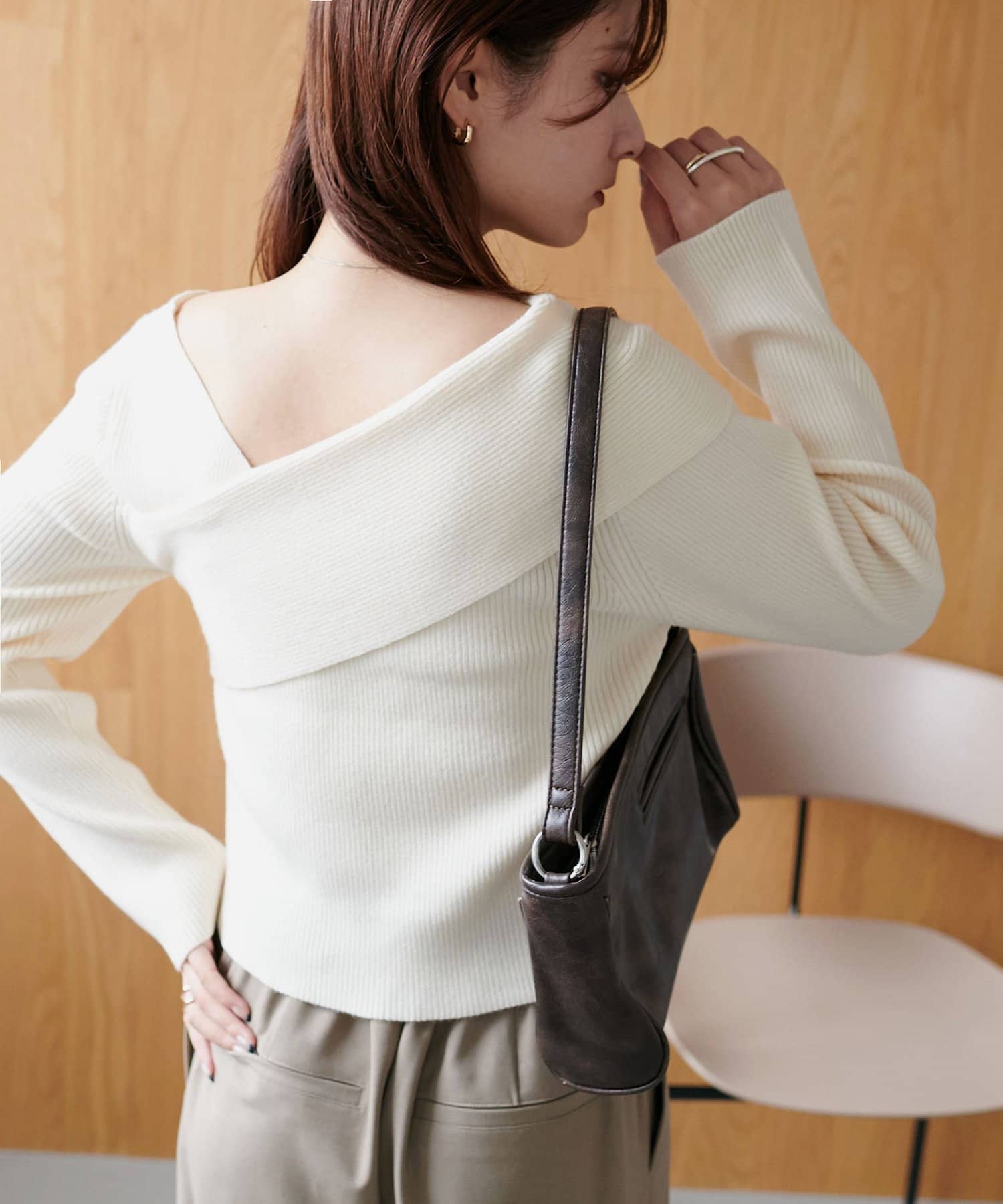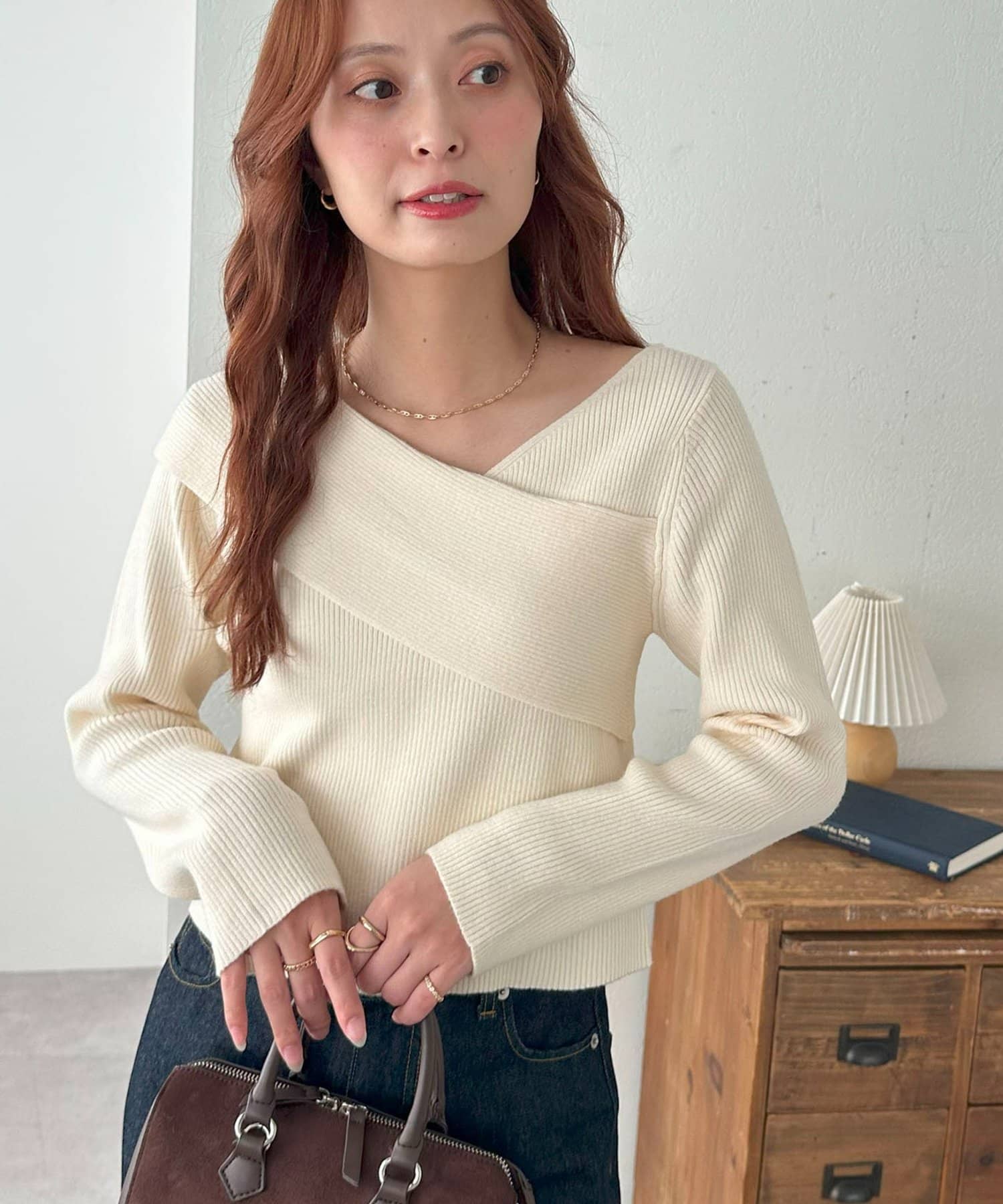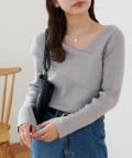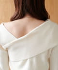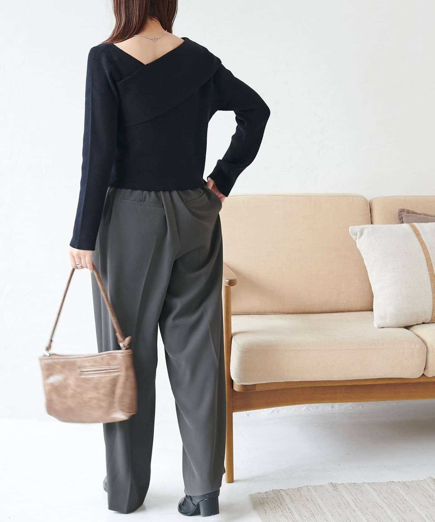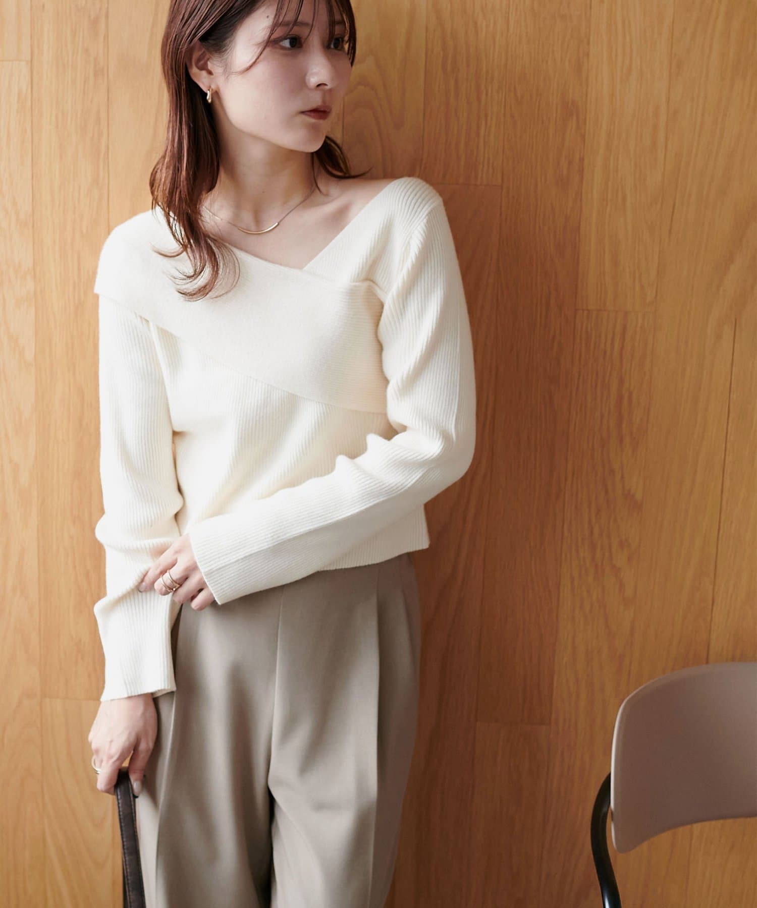 アシンメトリーになった首元のデザインがヘルシーで程よい肌見せに!