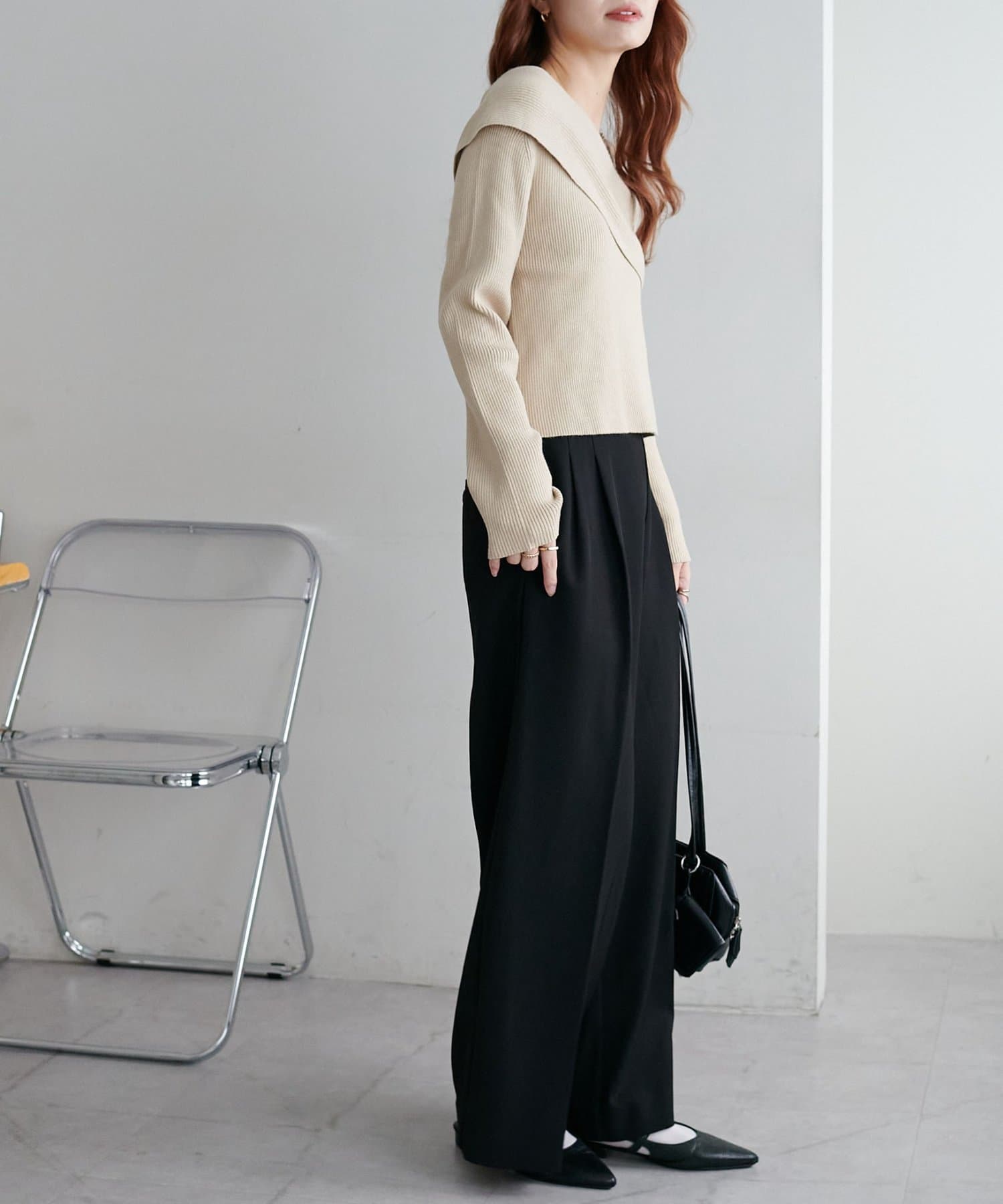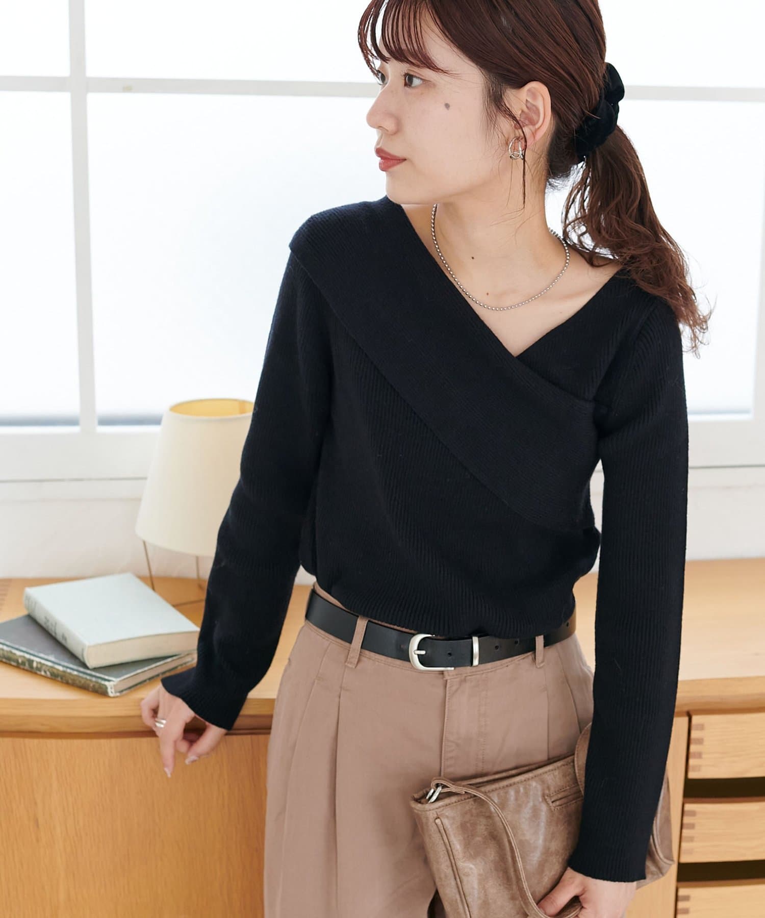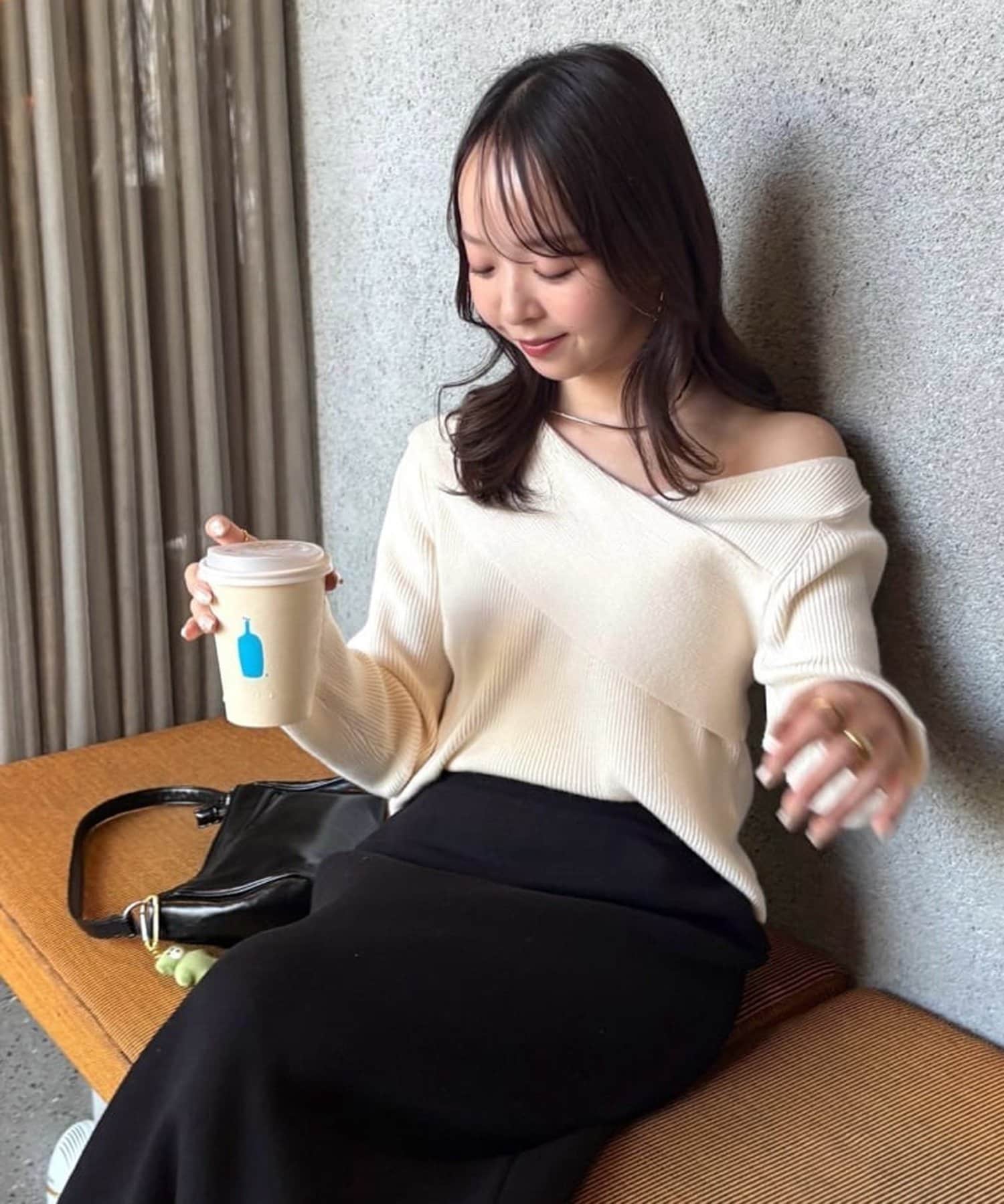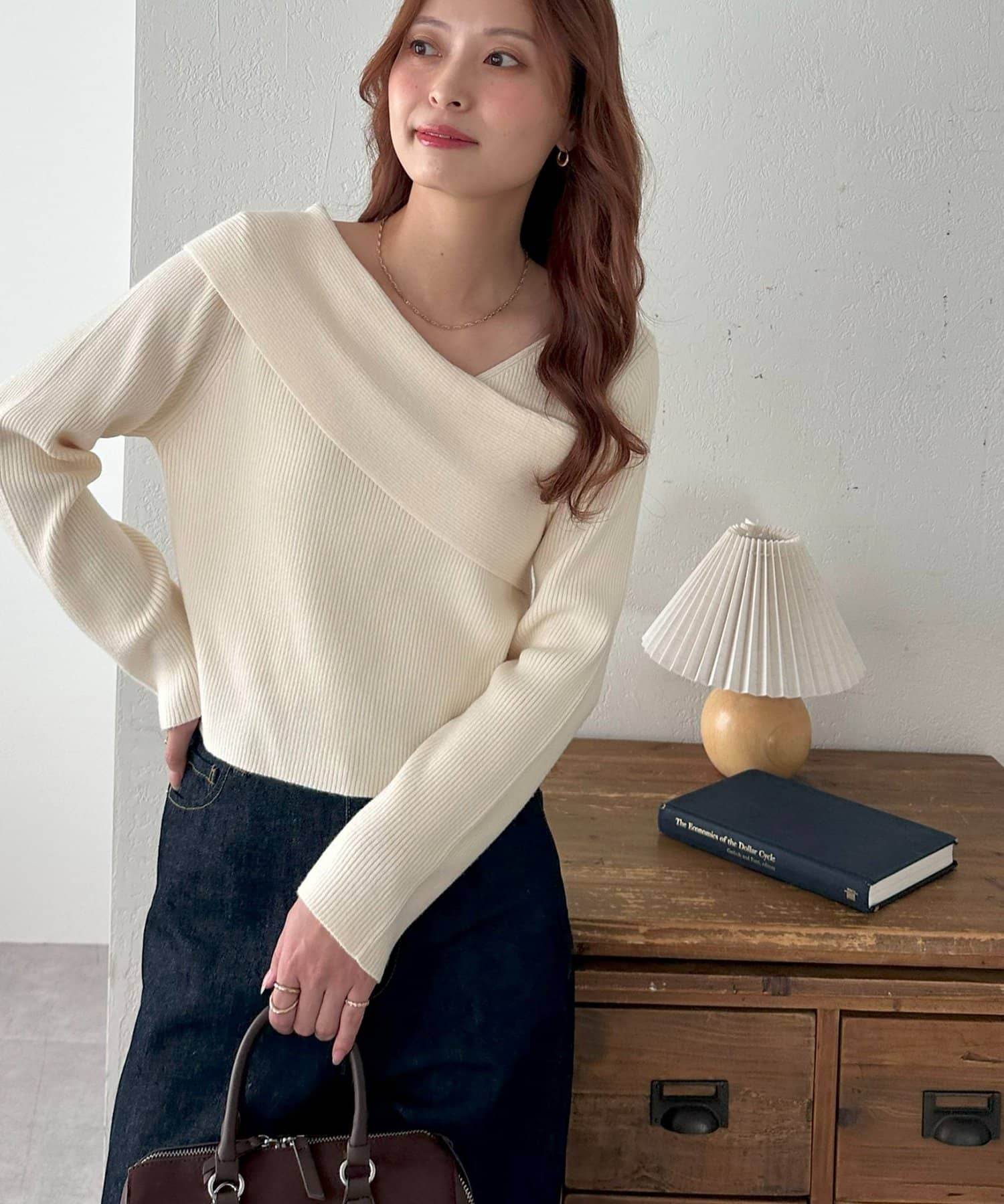 アシンメトリーになった首元のデザインがヘルシーで程よい肌見せに!