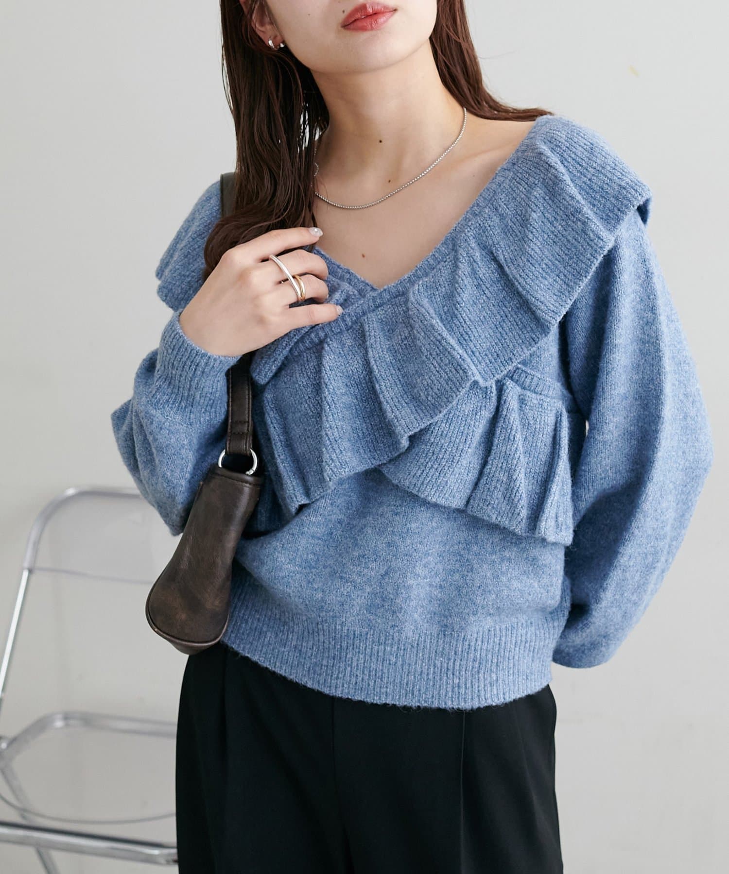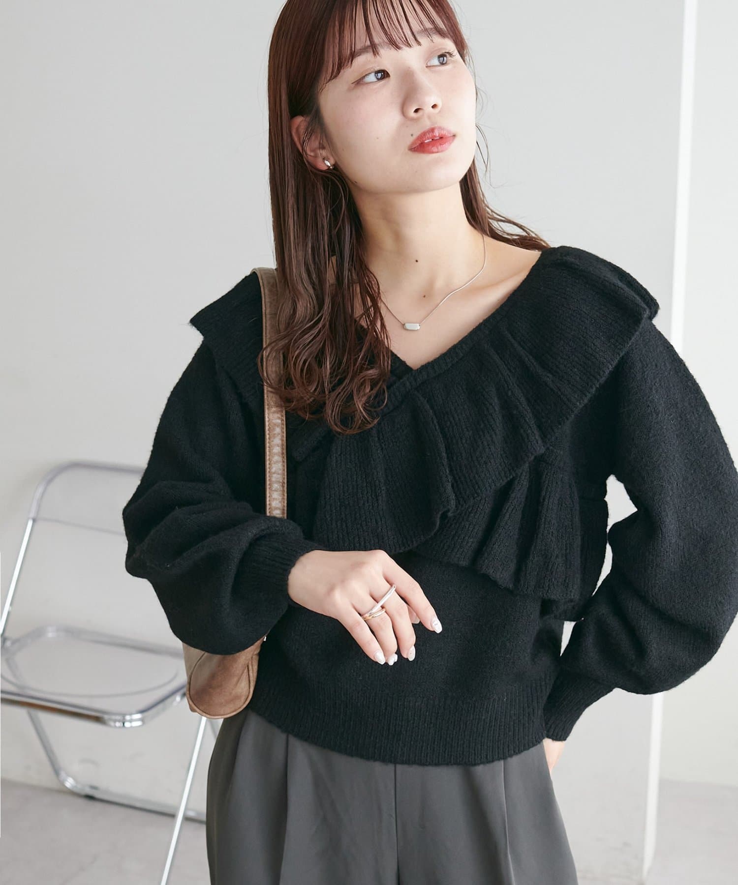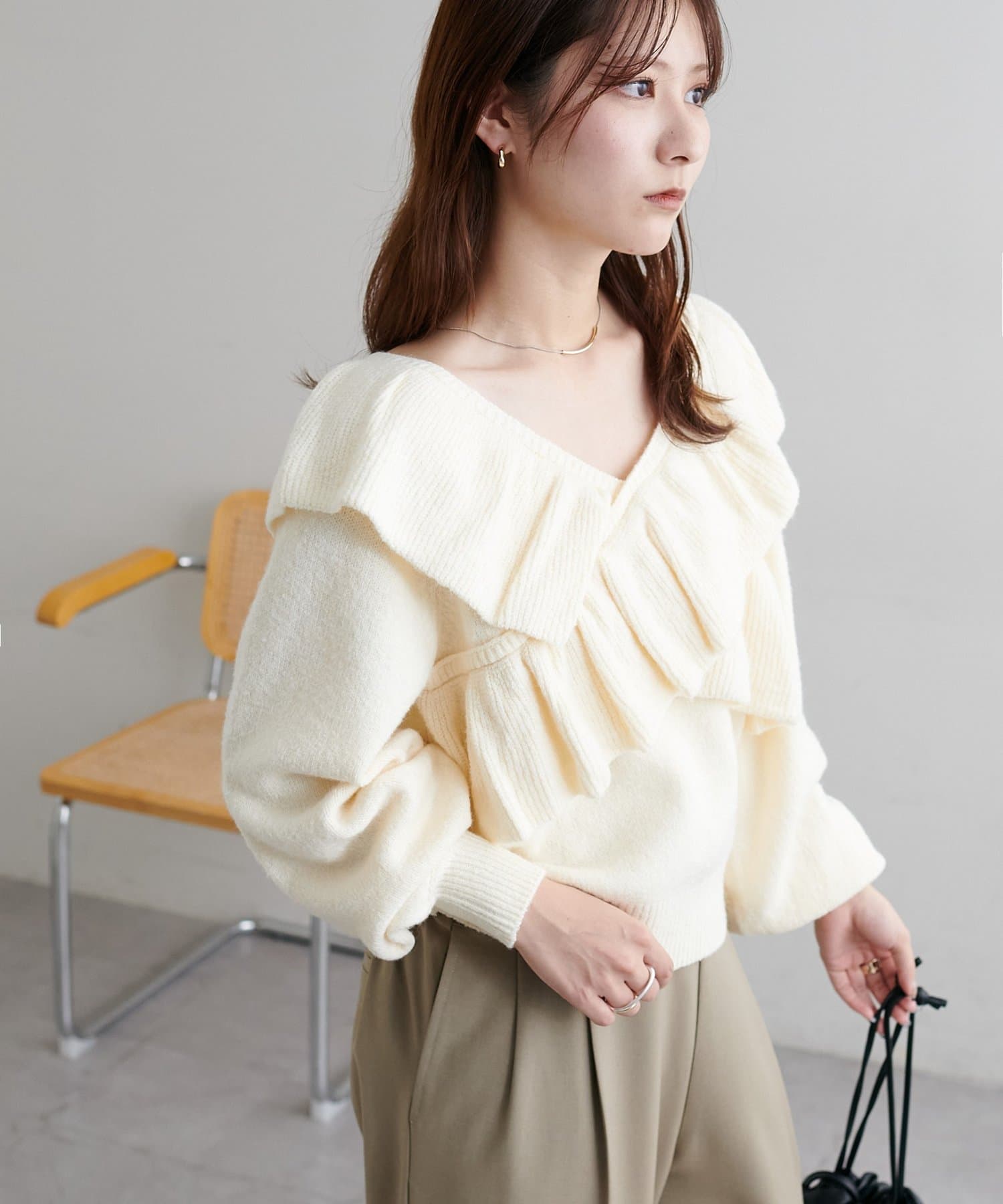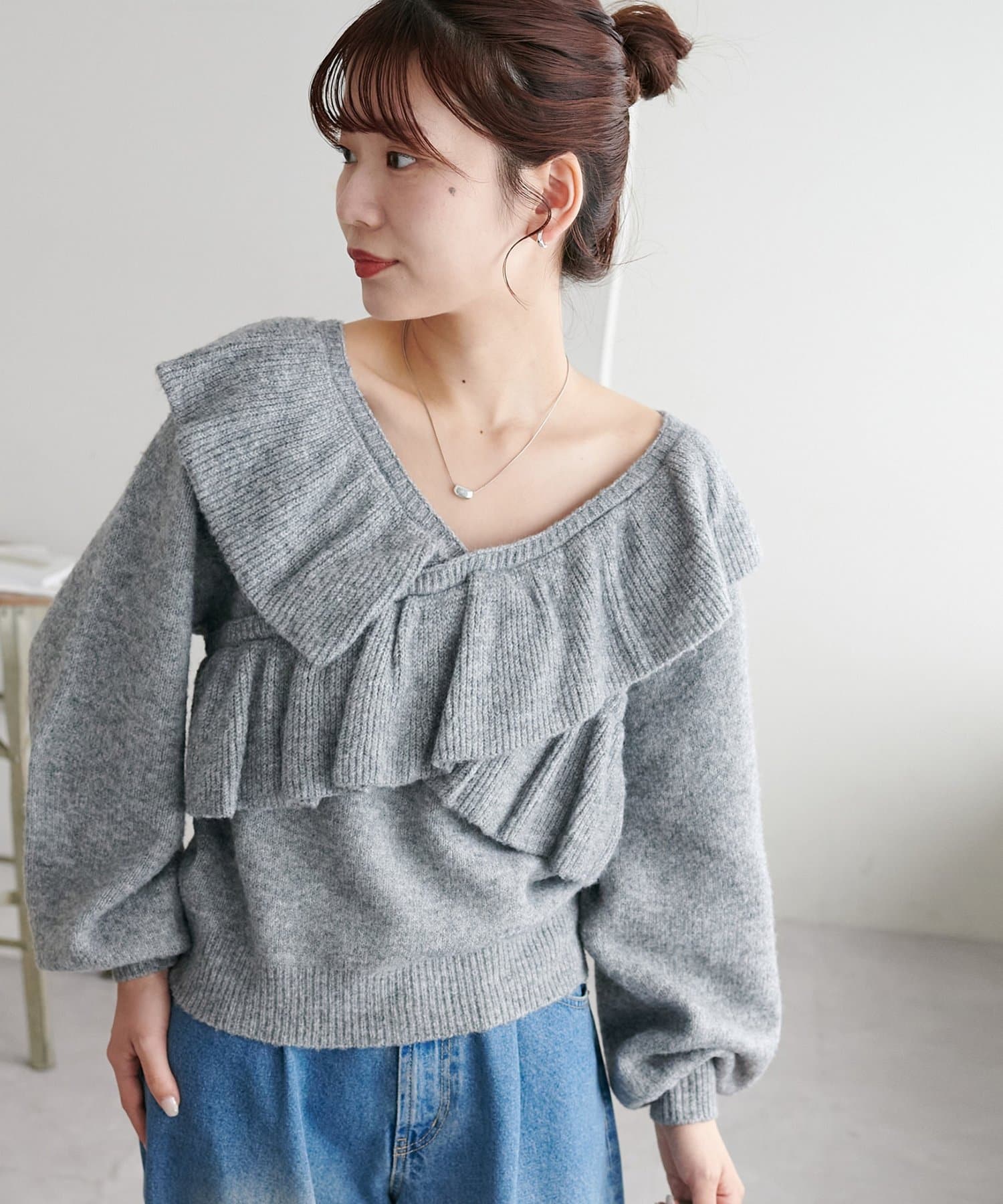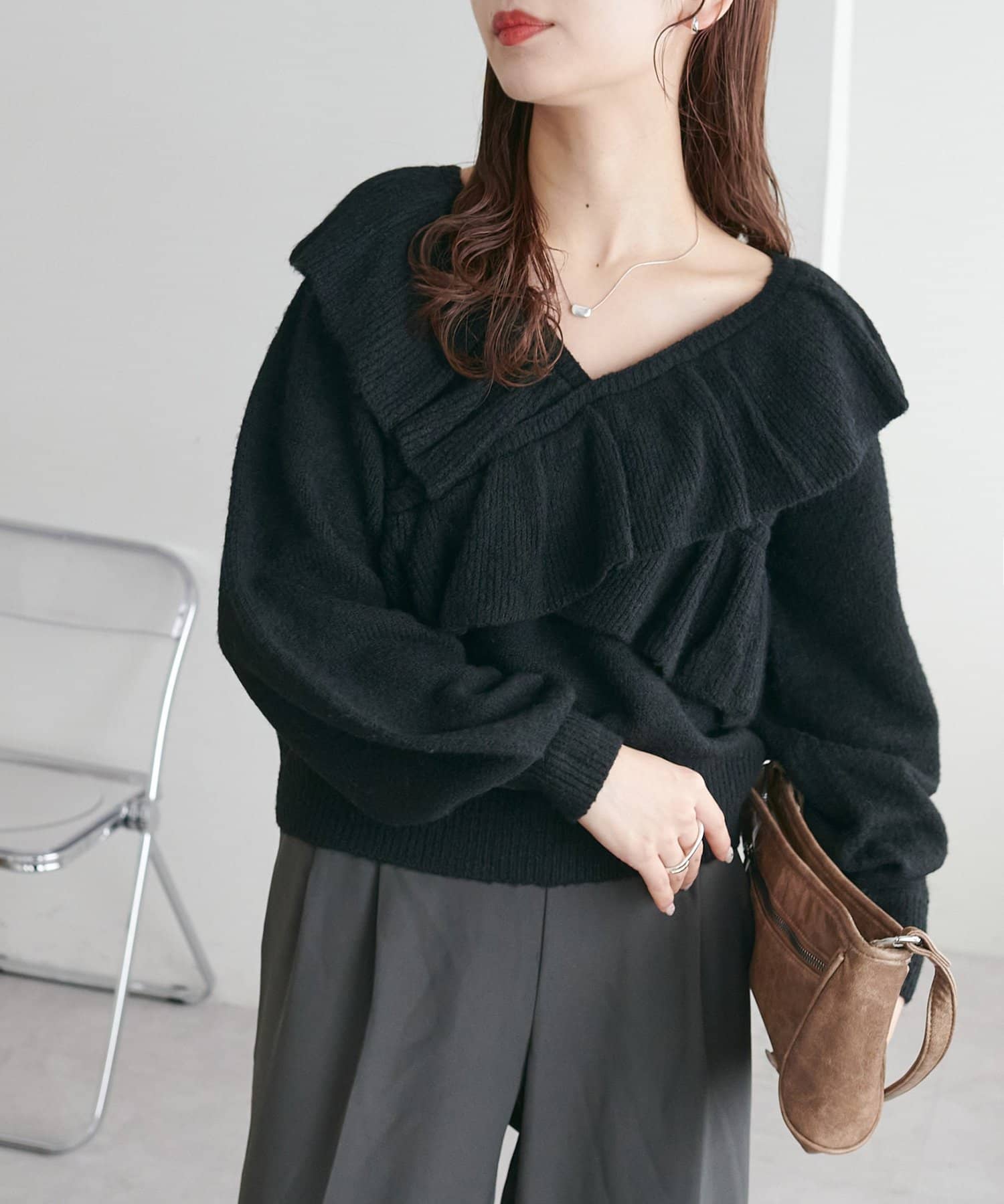 【上品な肌見せ/5色展開】フリルクロスニット《WEB限定》