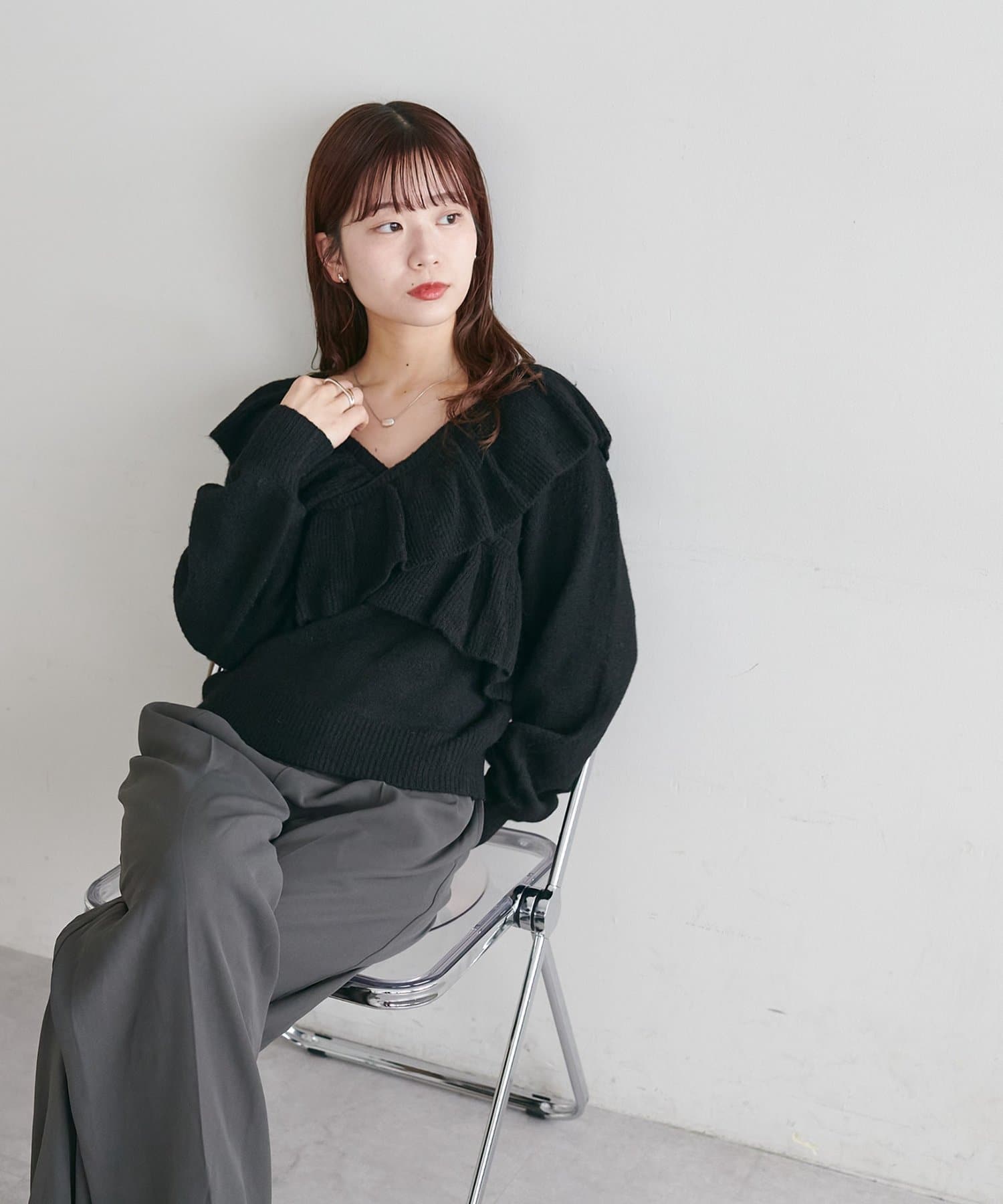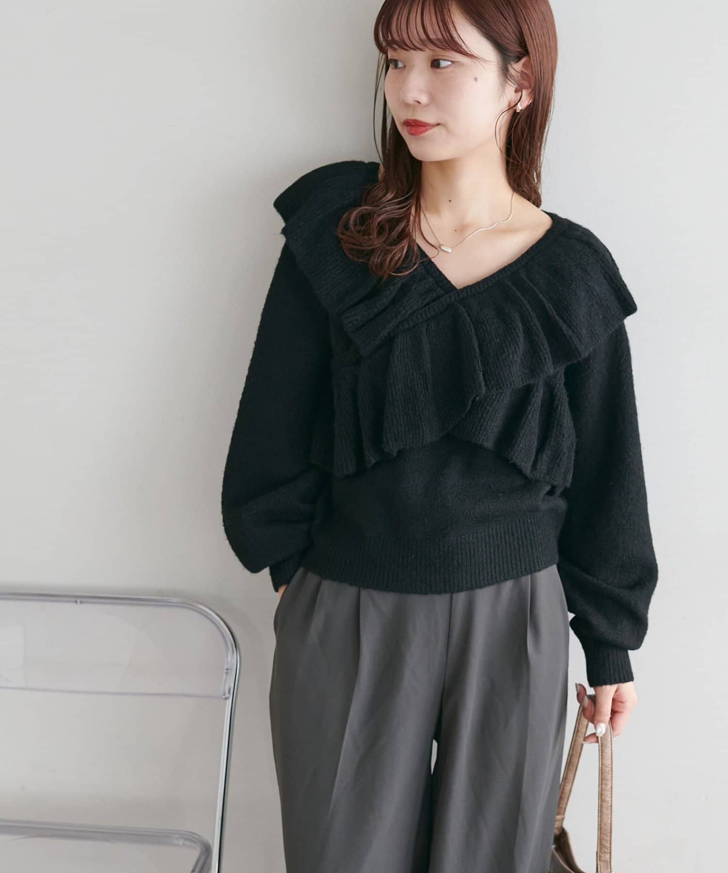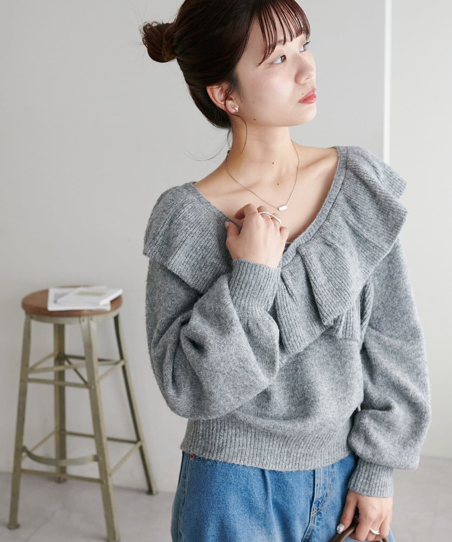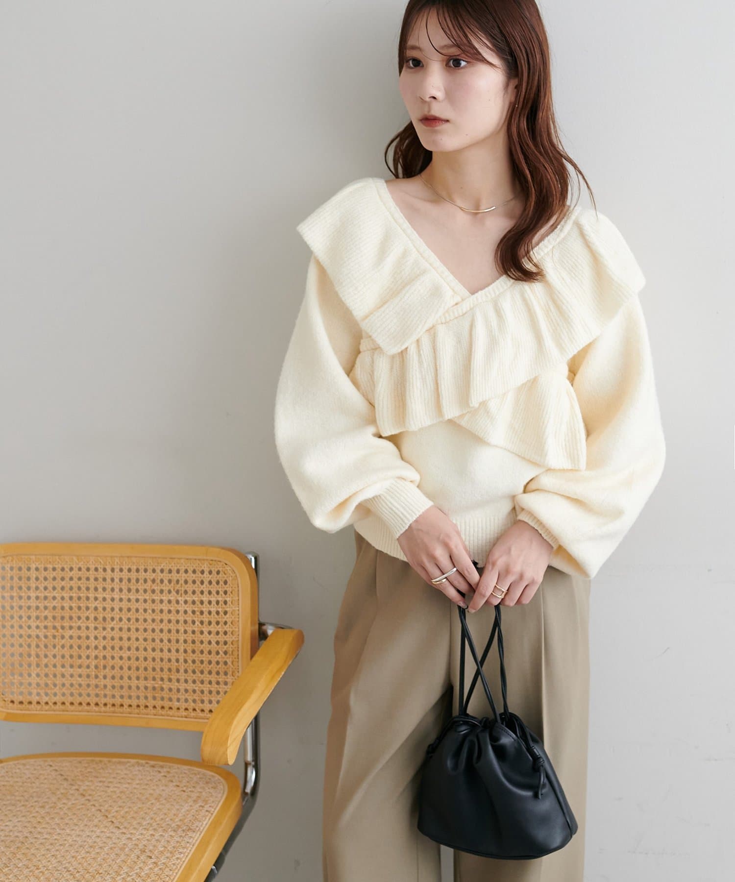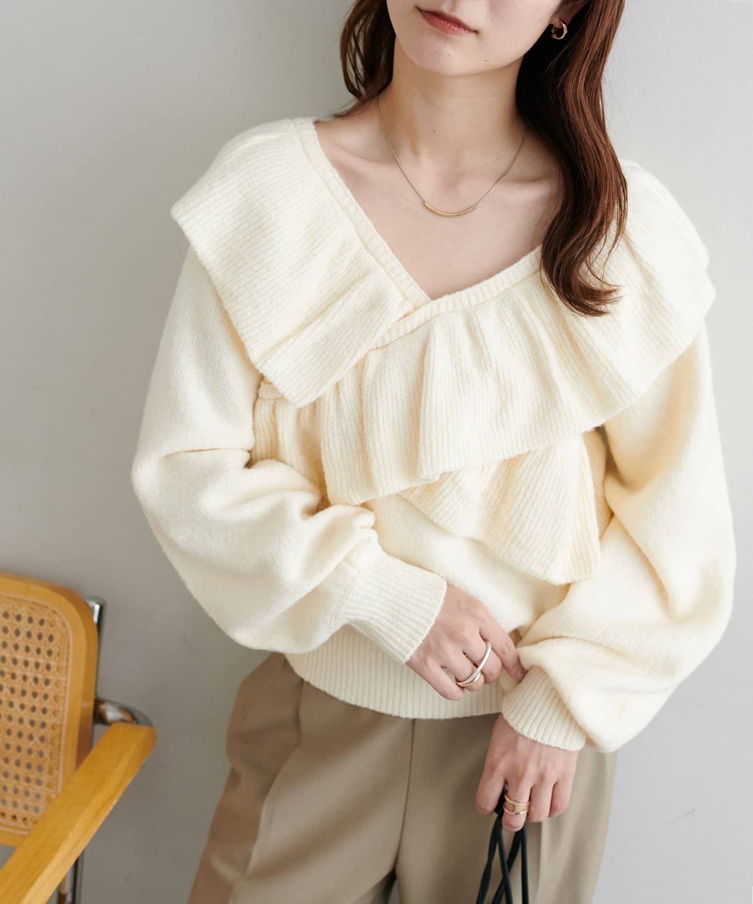【上品な肌見せ/5色展開】フリルクロスニット《WEB限定》