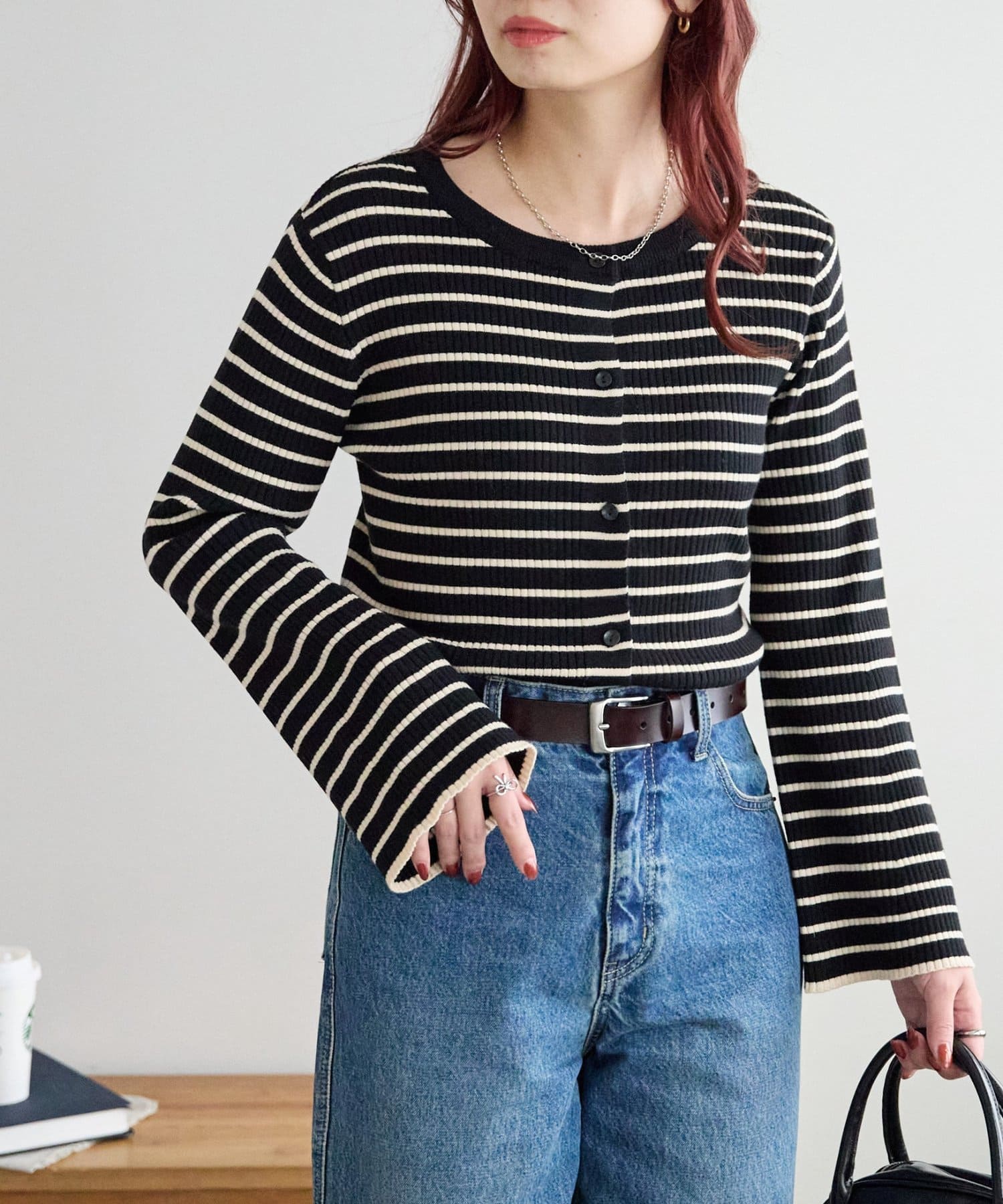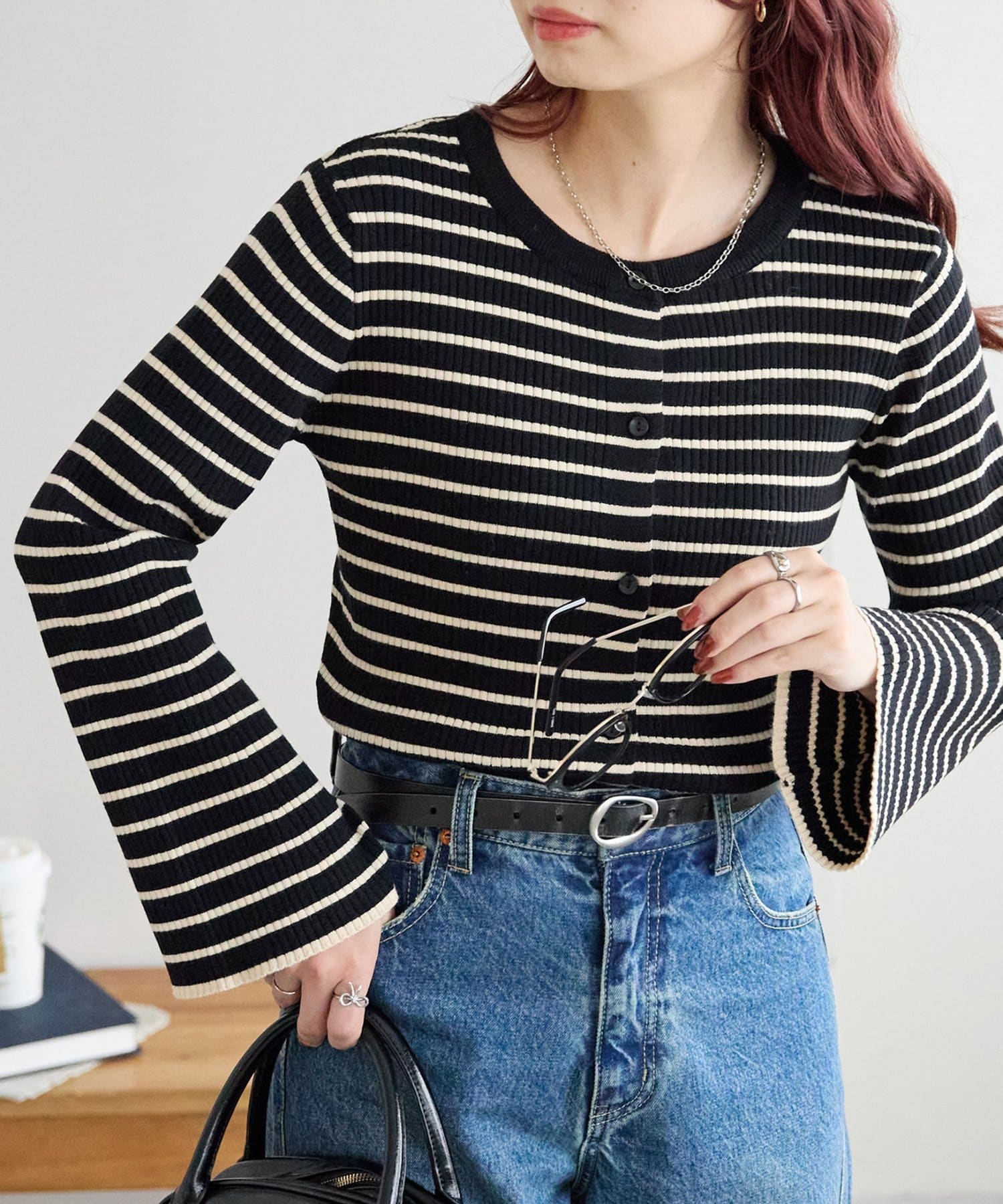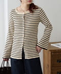 カジュアルに見えがちなボーダートップスでも、リブ素材と袖口のフレアデザインが女性らしさを演出してくれるアイテム。伸縮性があるので程よくフィットしてくれます。