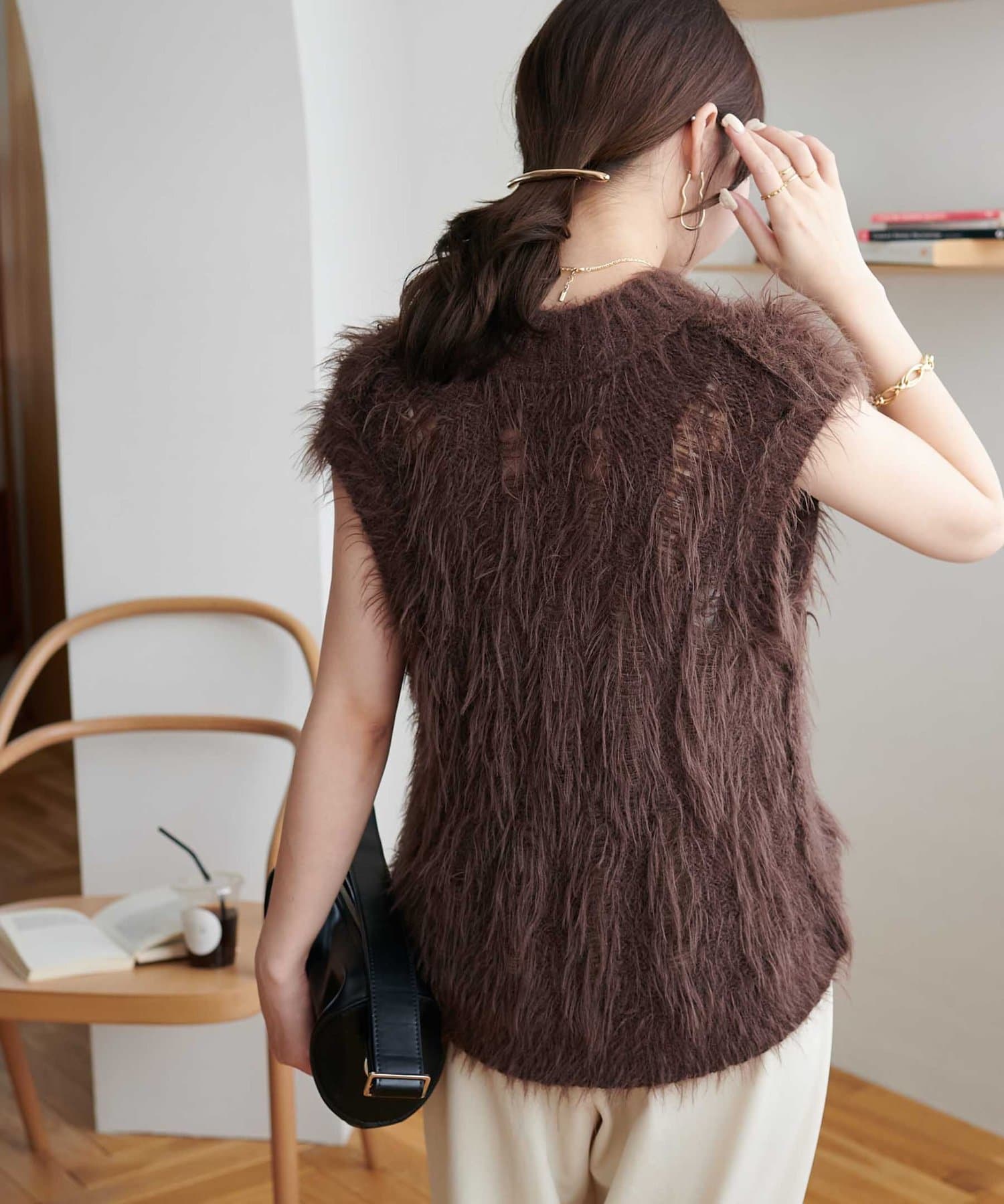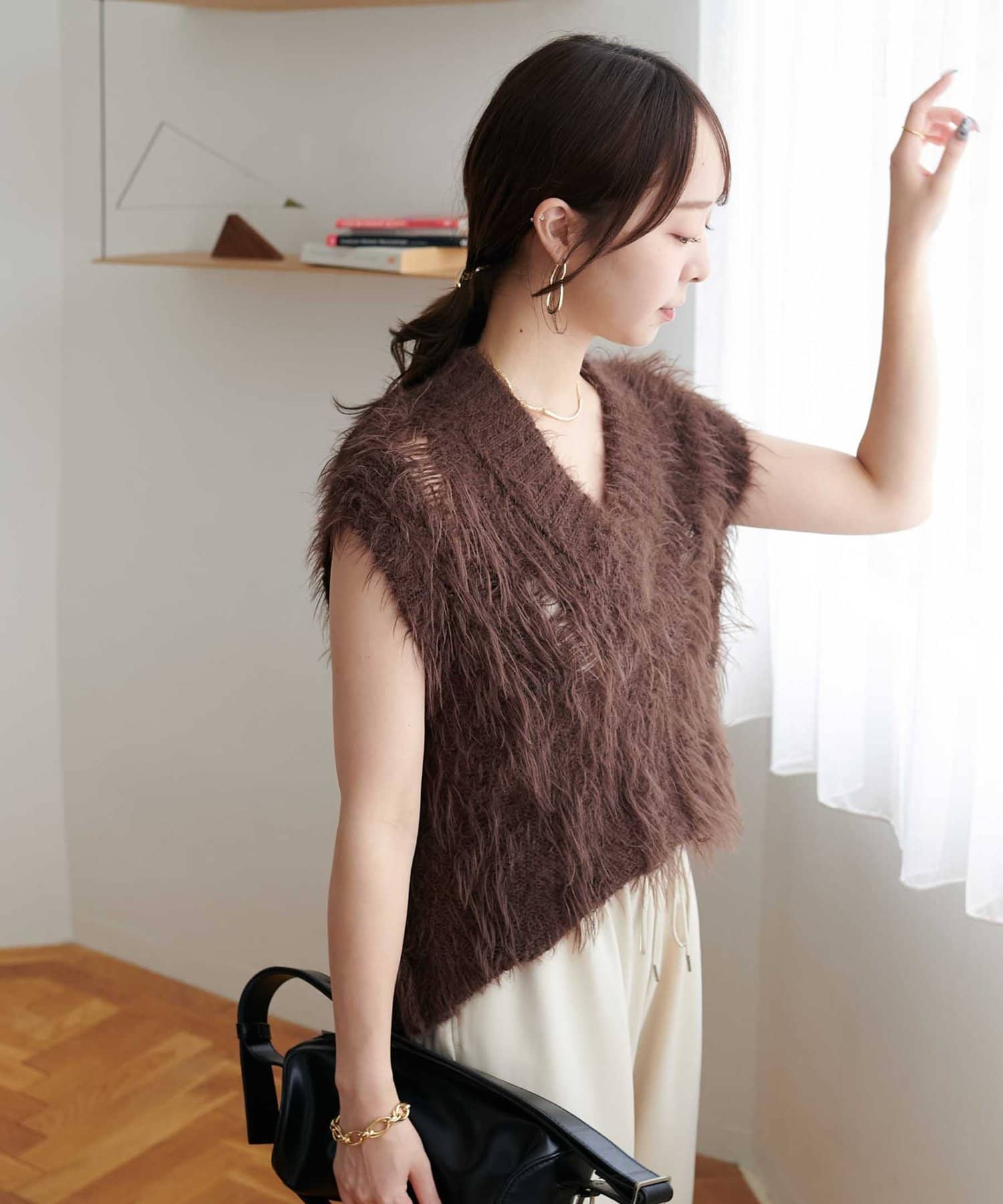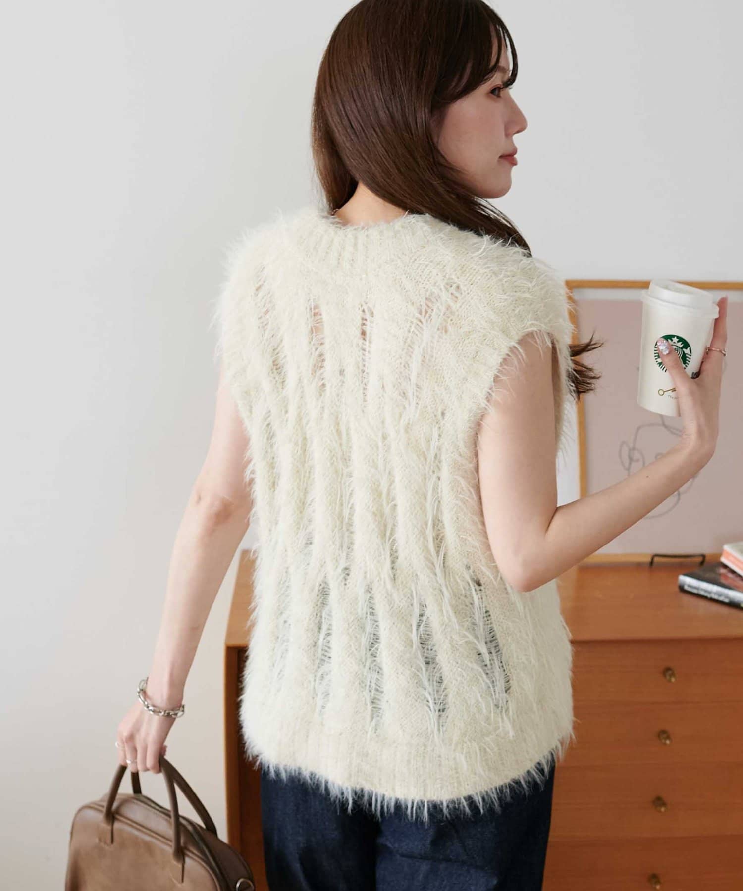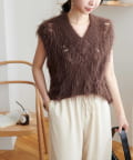 フェザーヤーンの立体感と透かし編みでシンプルながらも華やかな印象をプラス!