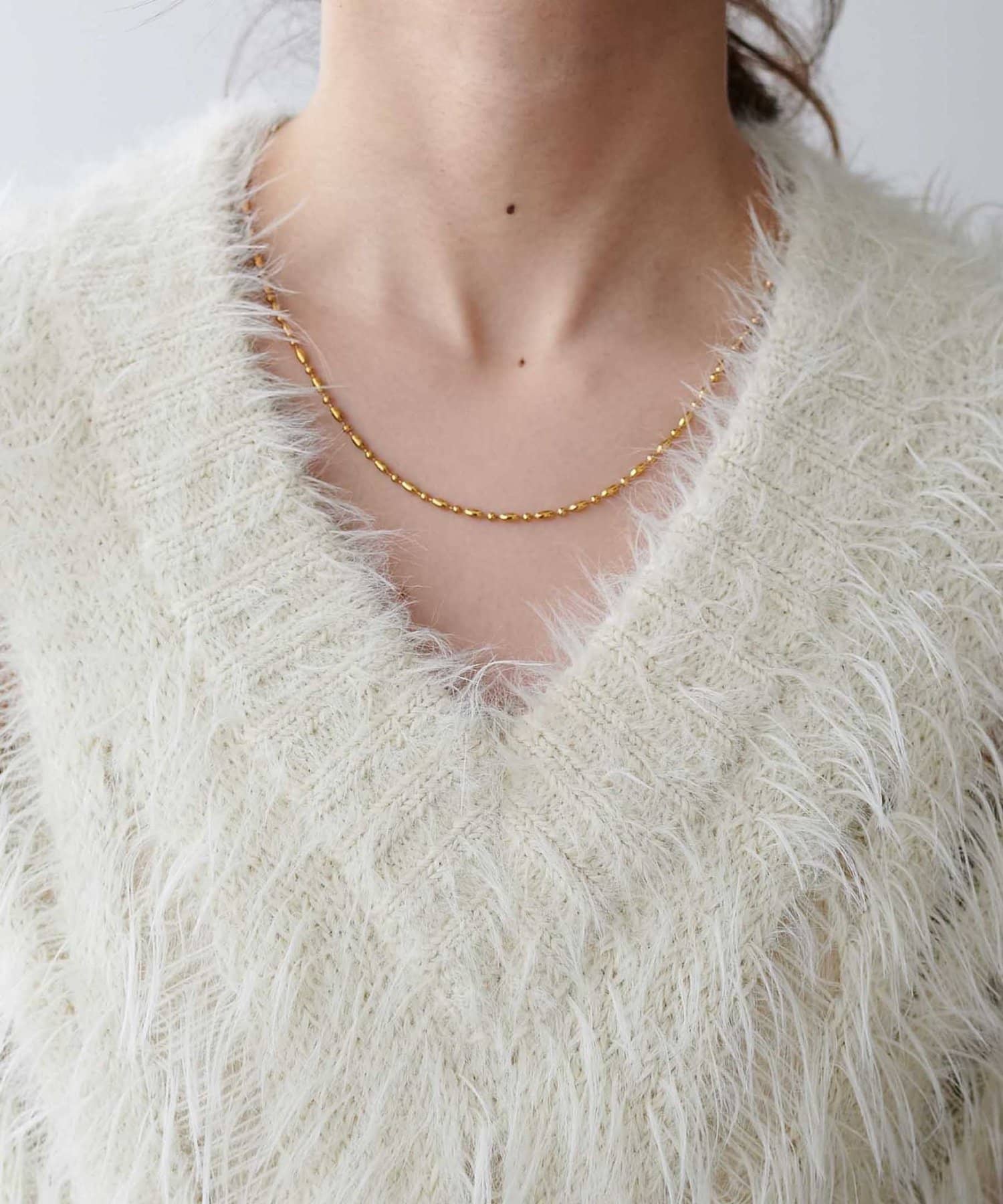 大きく開いたVネックはデコルテをきれいに見せるとともに、シルエット全体もすっきり見せてくれます。