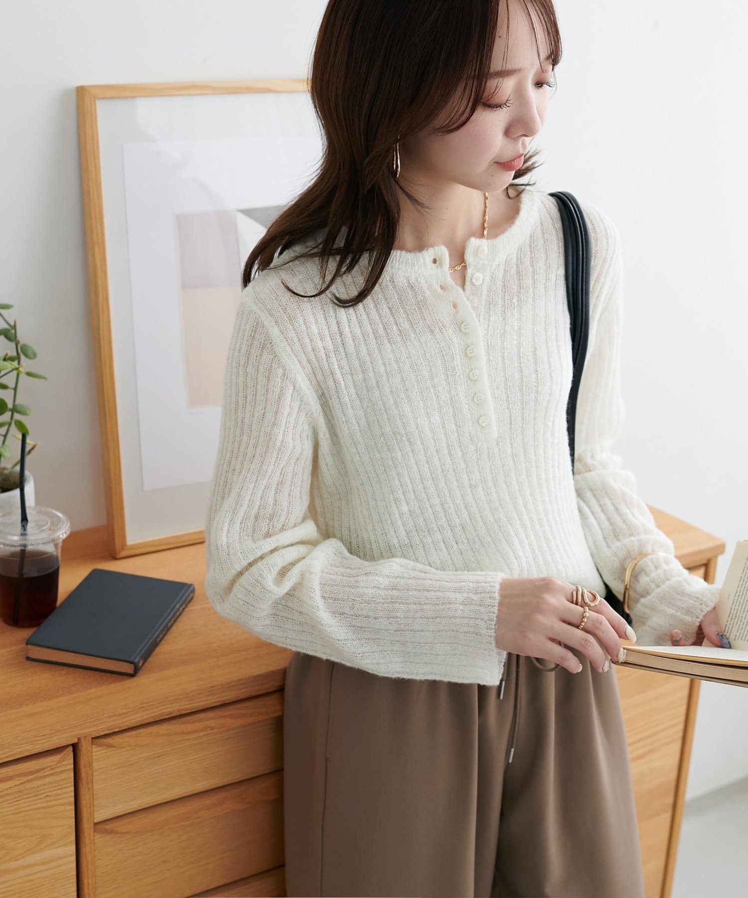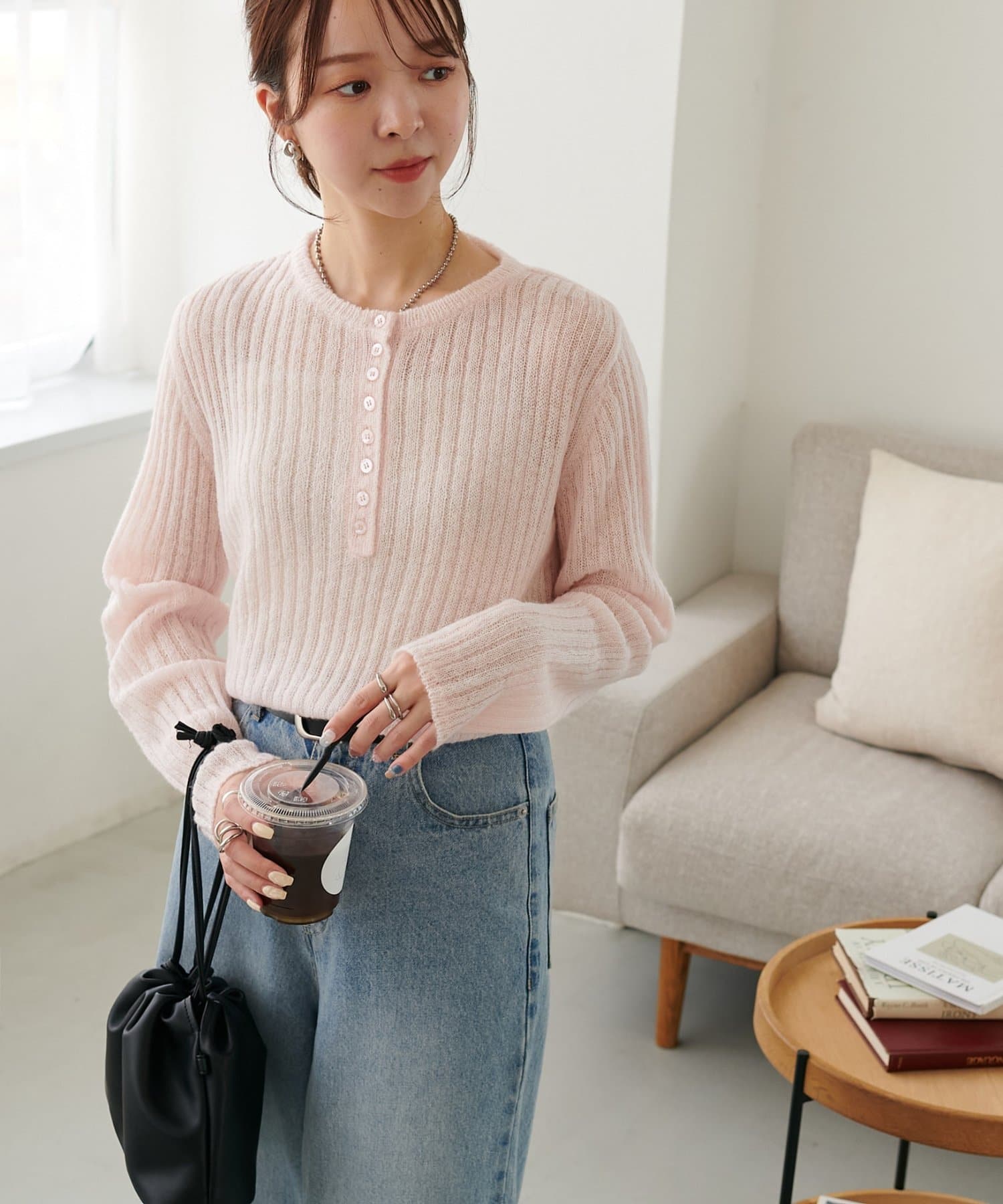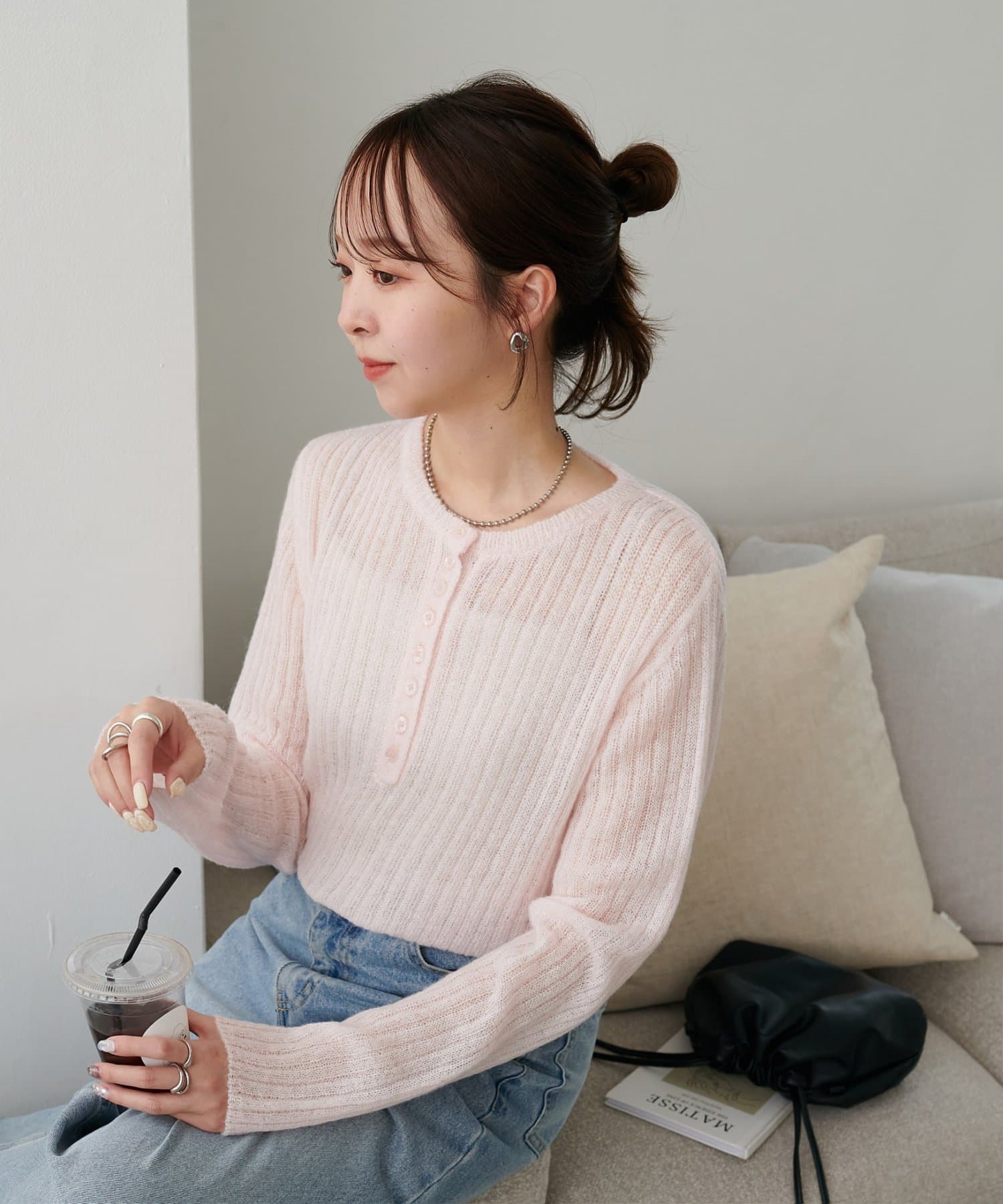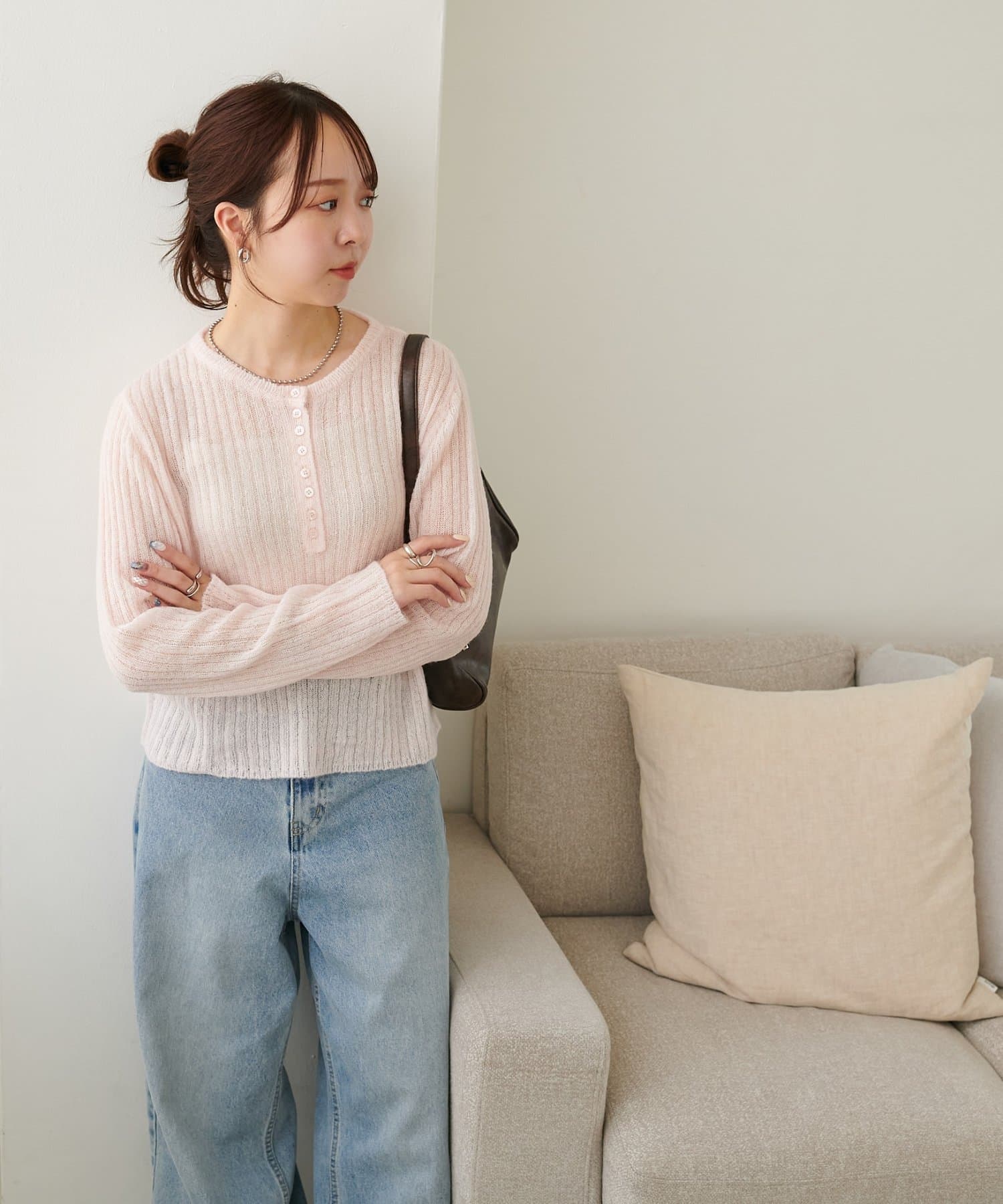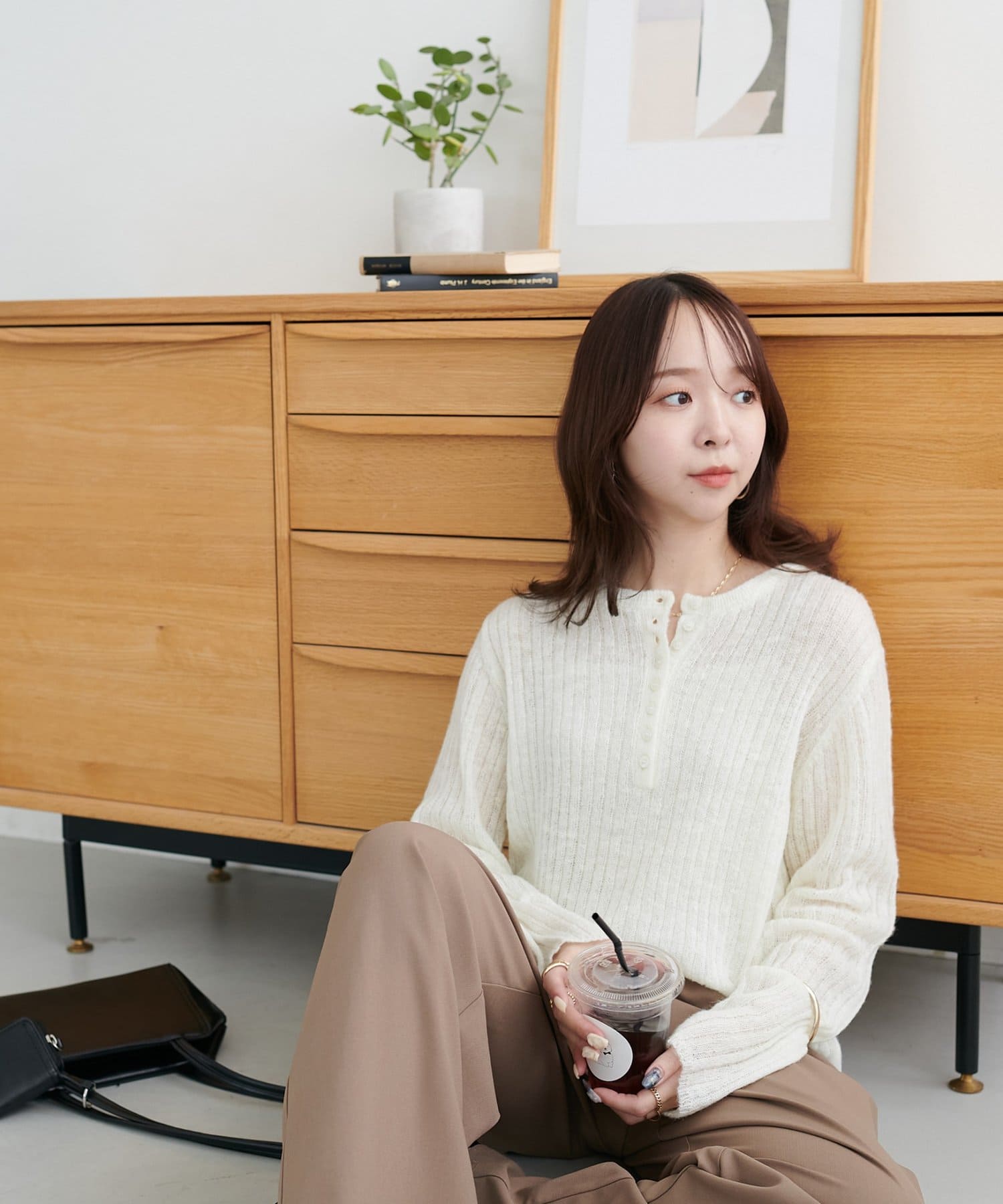 153cmスタッフ:首元のボタンを少し開けて抜け感を出すと、顔まわりがすっきりするのでおすすめ◎ モヘアタッチのふわっとした肌触りがとても気持ちよく、軽い着心地でストレスなく着られました。